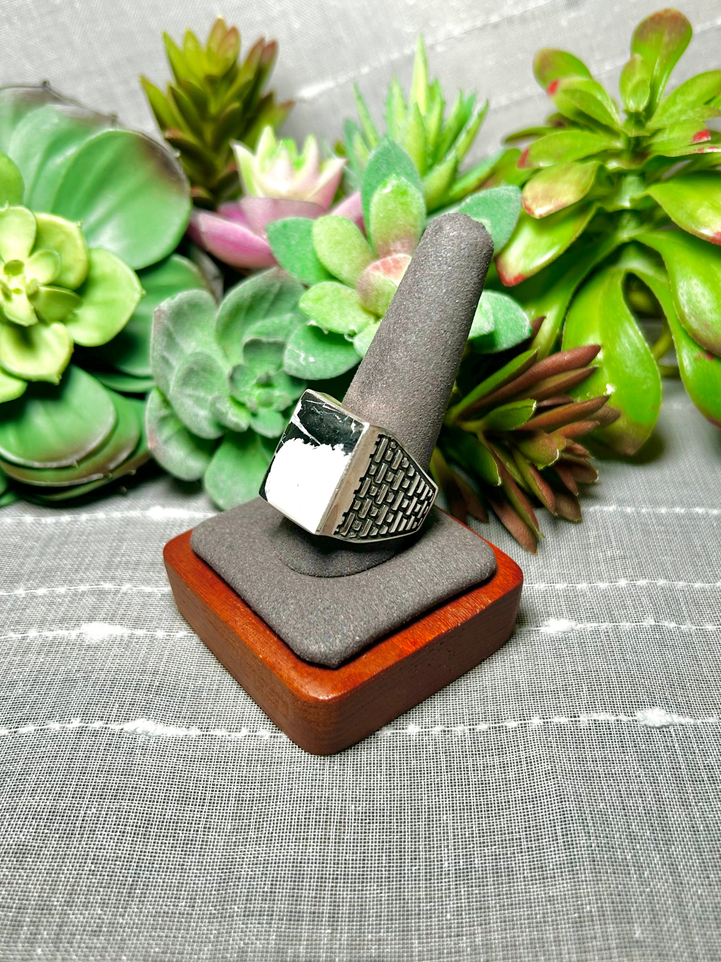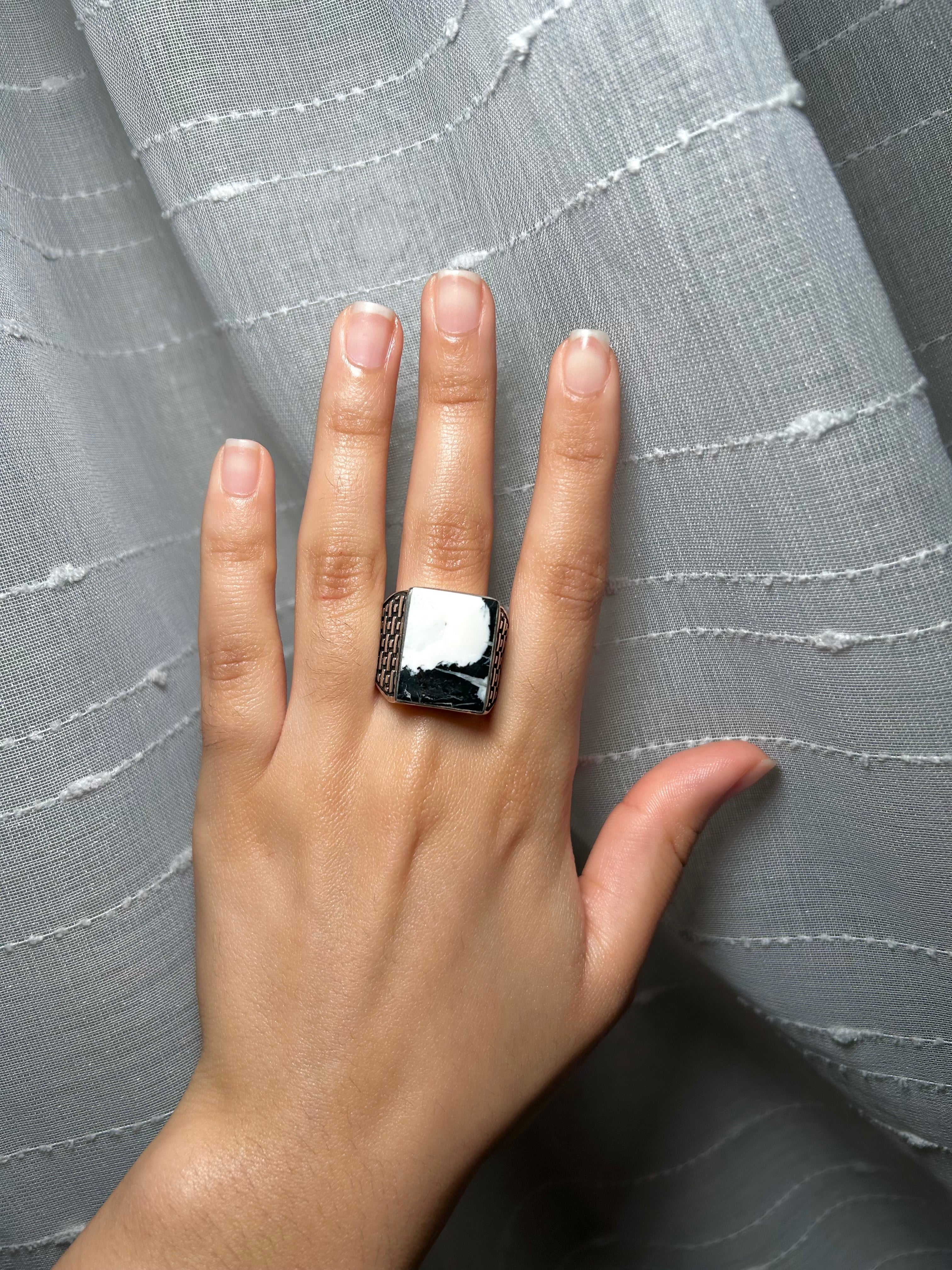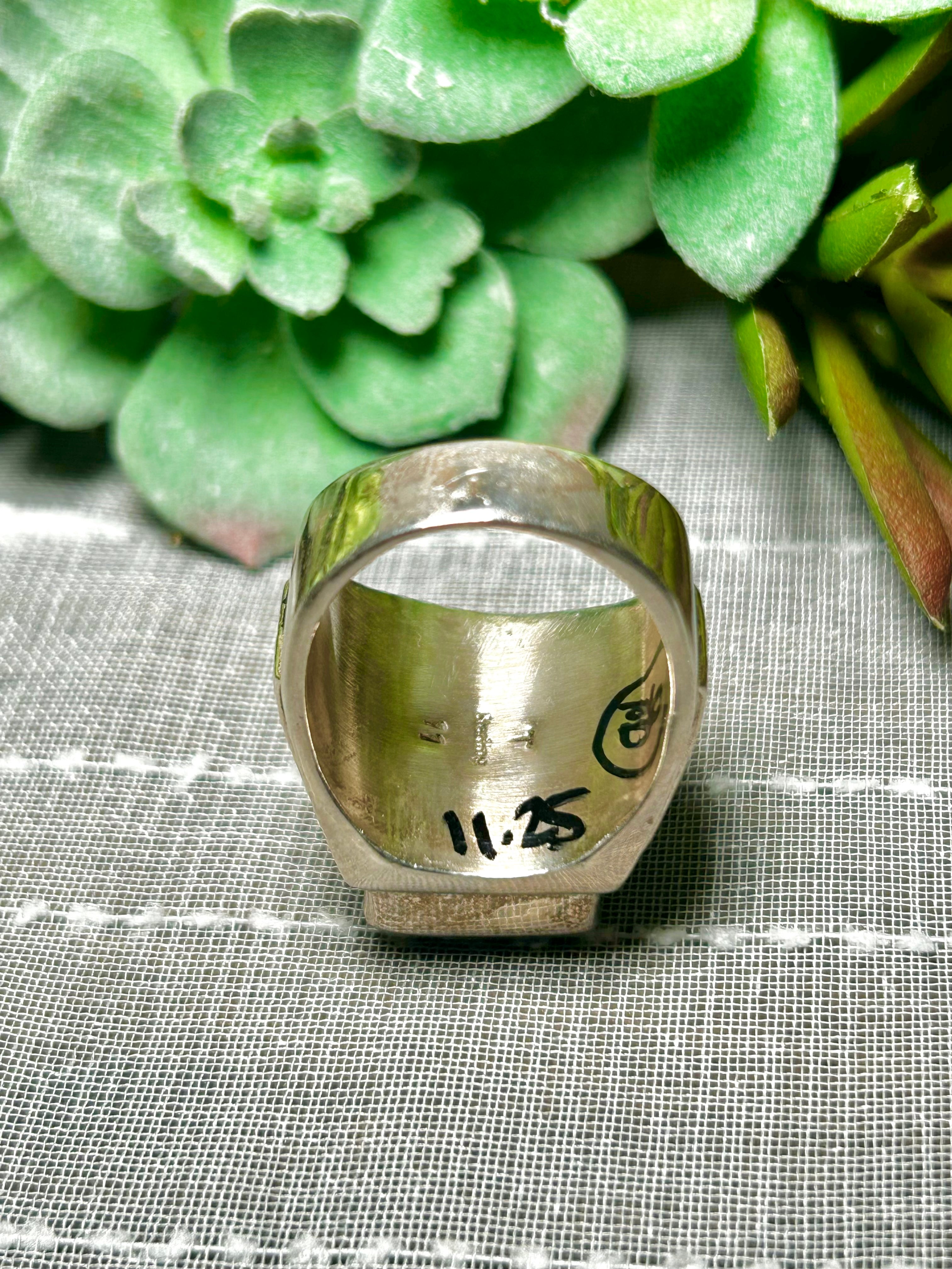 Alex Begay White Buffalo & Sterling Silver Ring Size 11.25. It measures 7/8 of an inch long and 5/8 of an inch wide. Signed by the artist and stamped sterling silver.