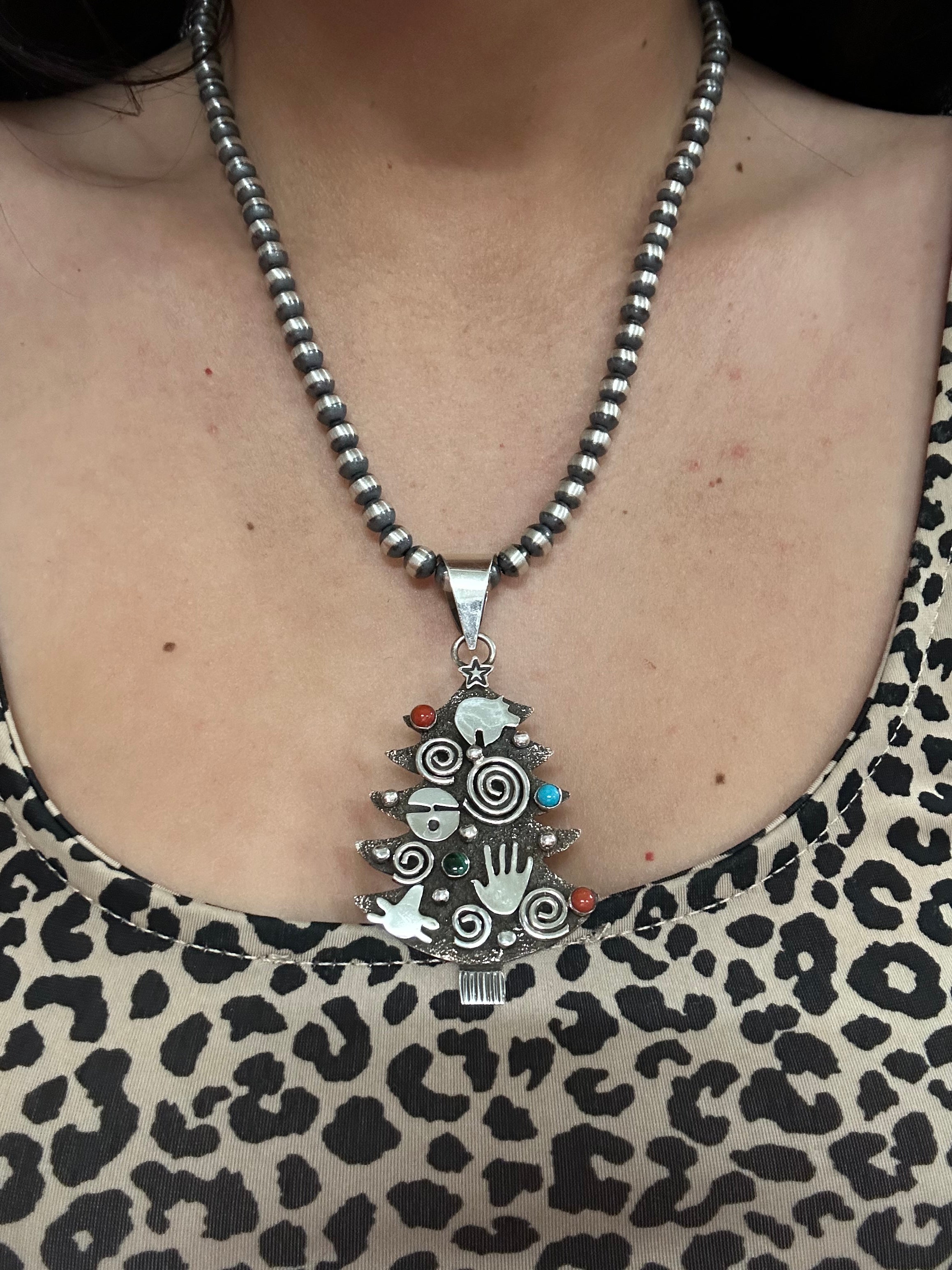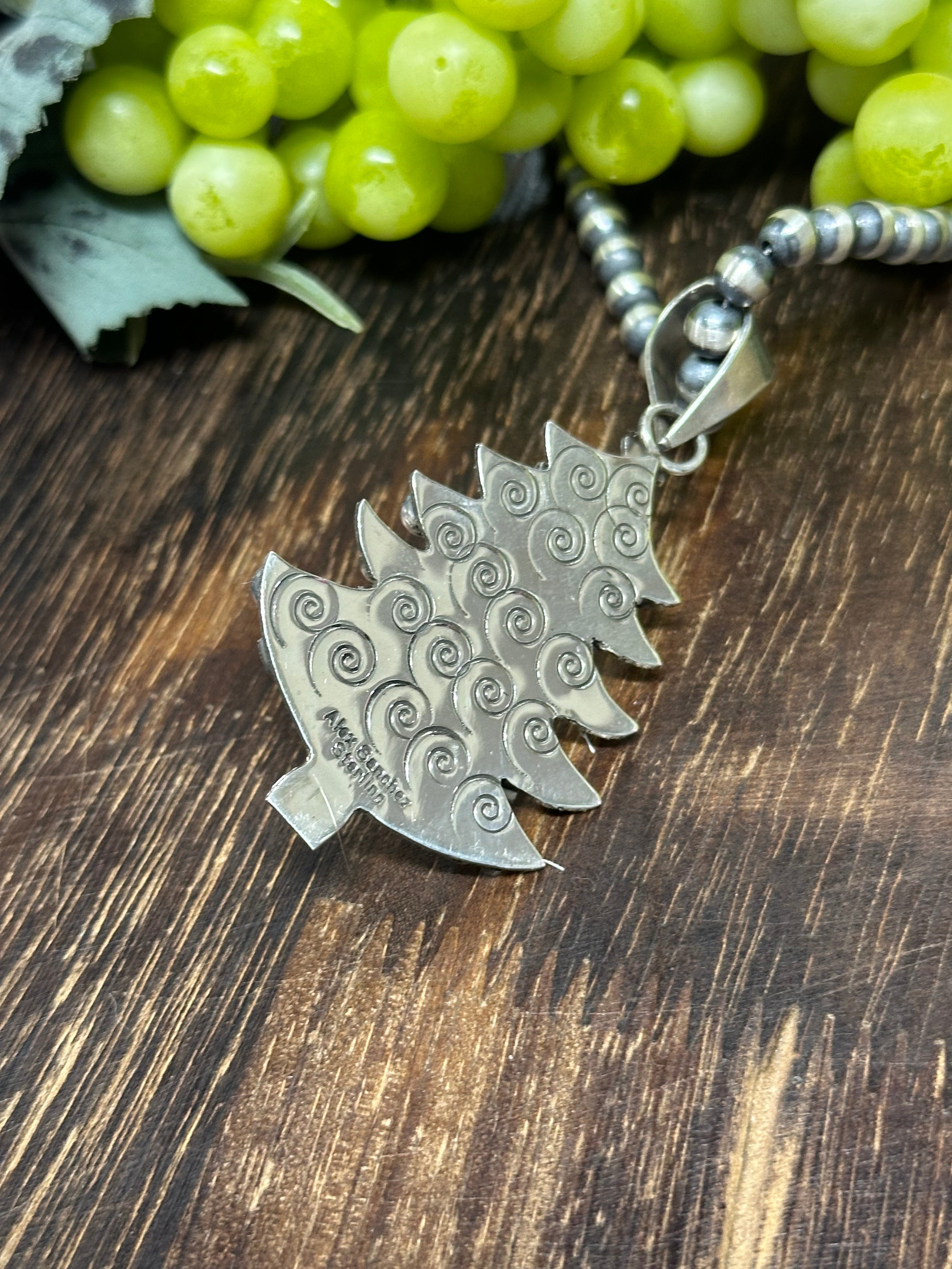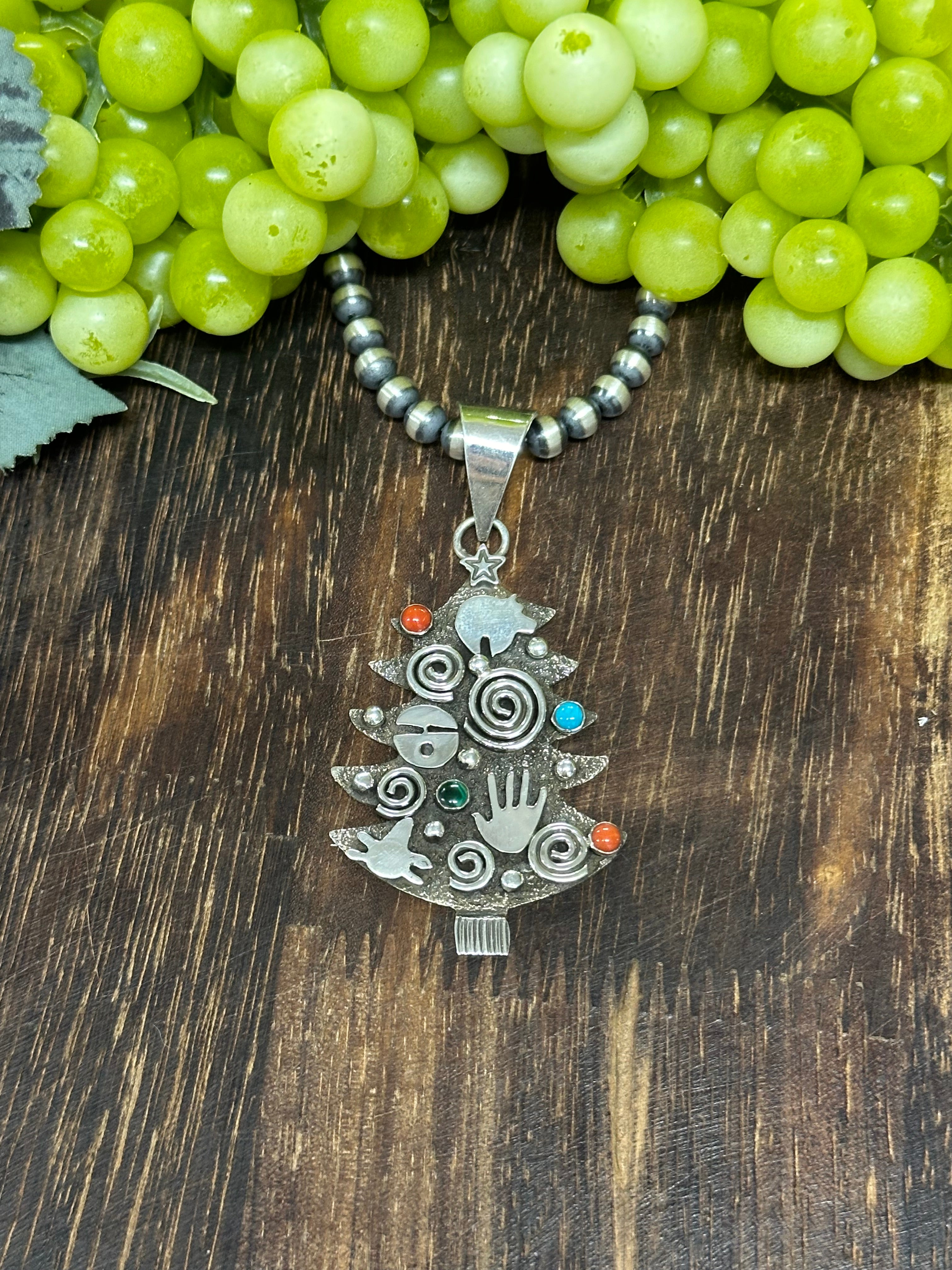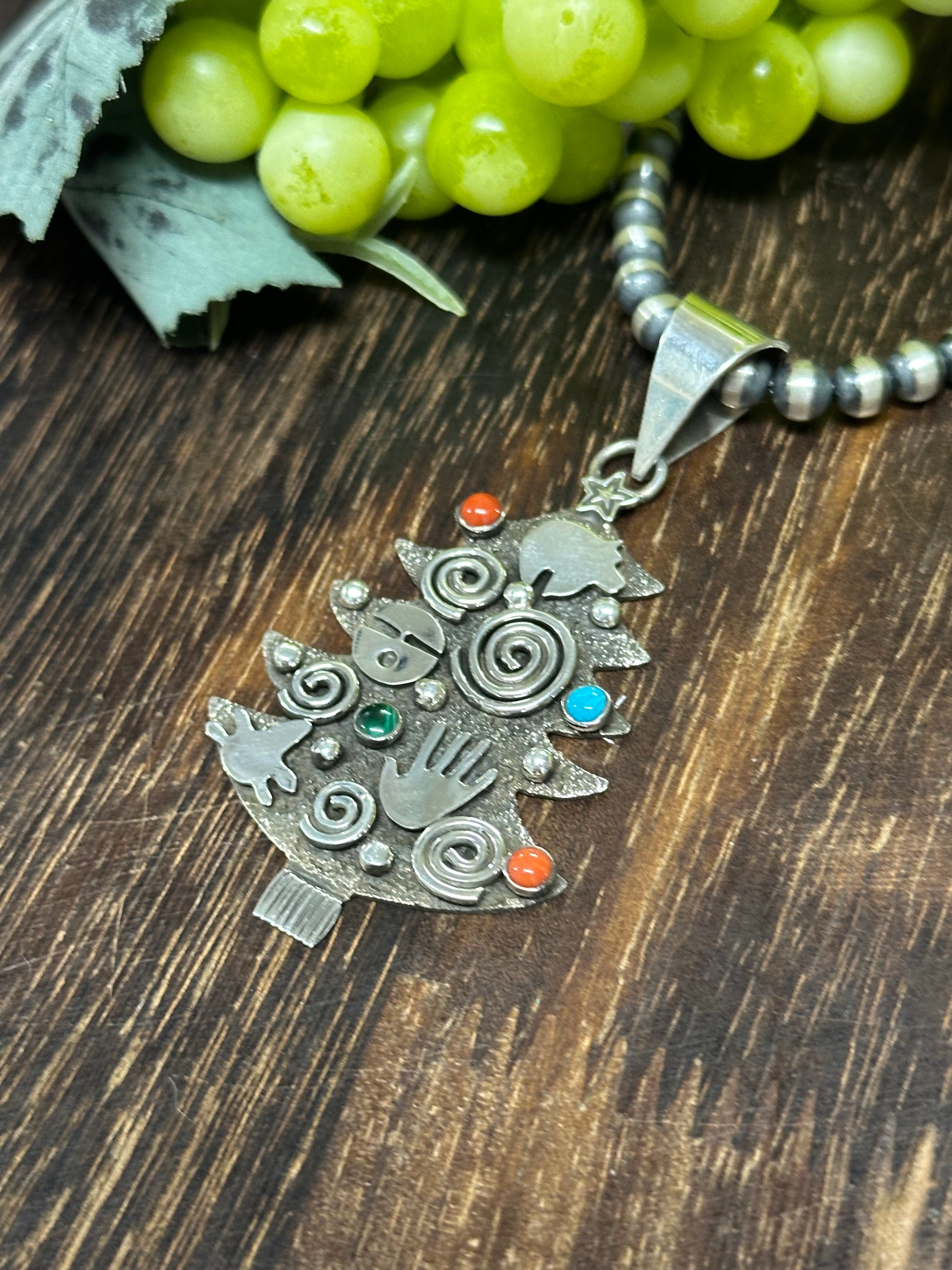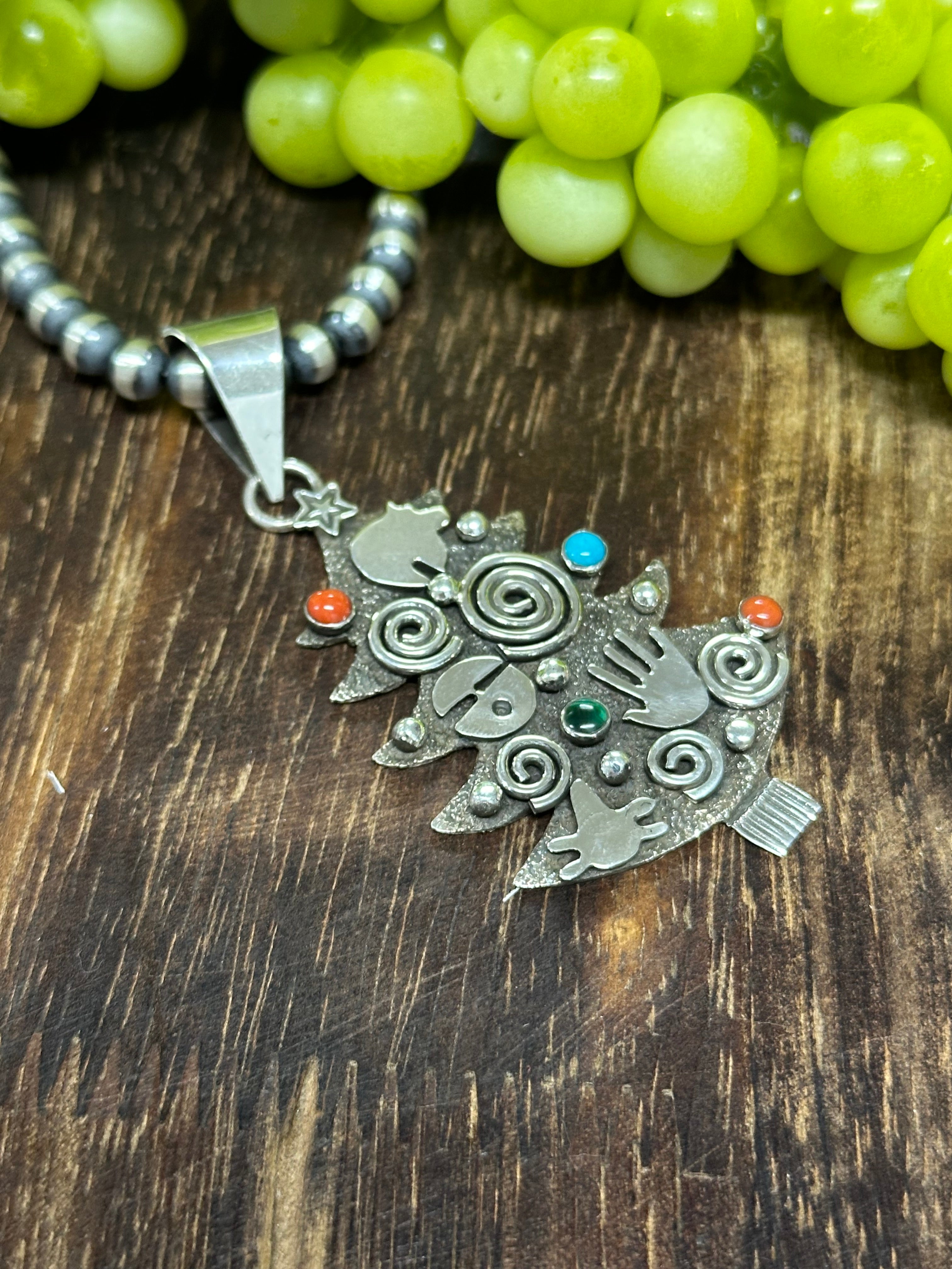 Alex Sanchez Multi Stone & Sterling Silver Christmas Tree Pendant. It measures 3 inches long and 1 1/2 inches wide. Signed by the artist and stamped sterling silver.