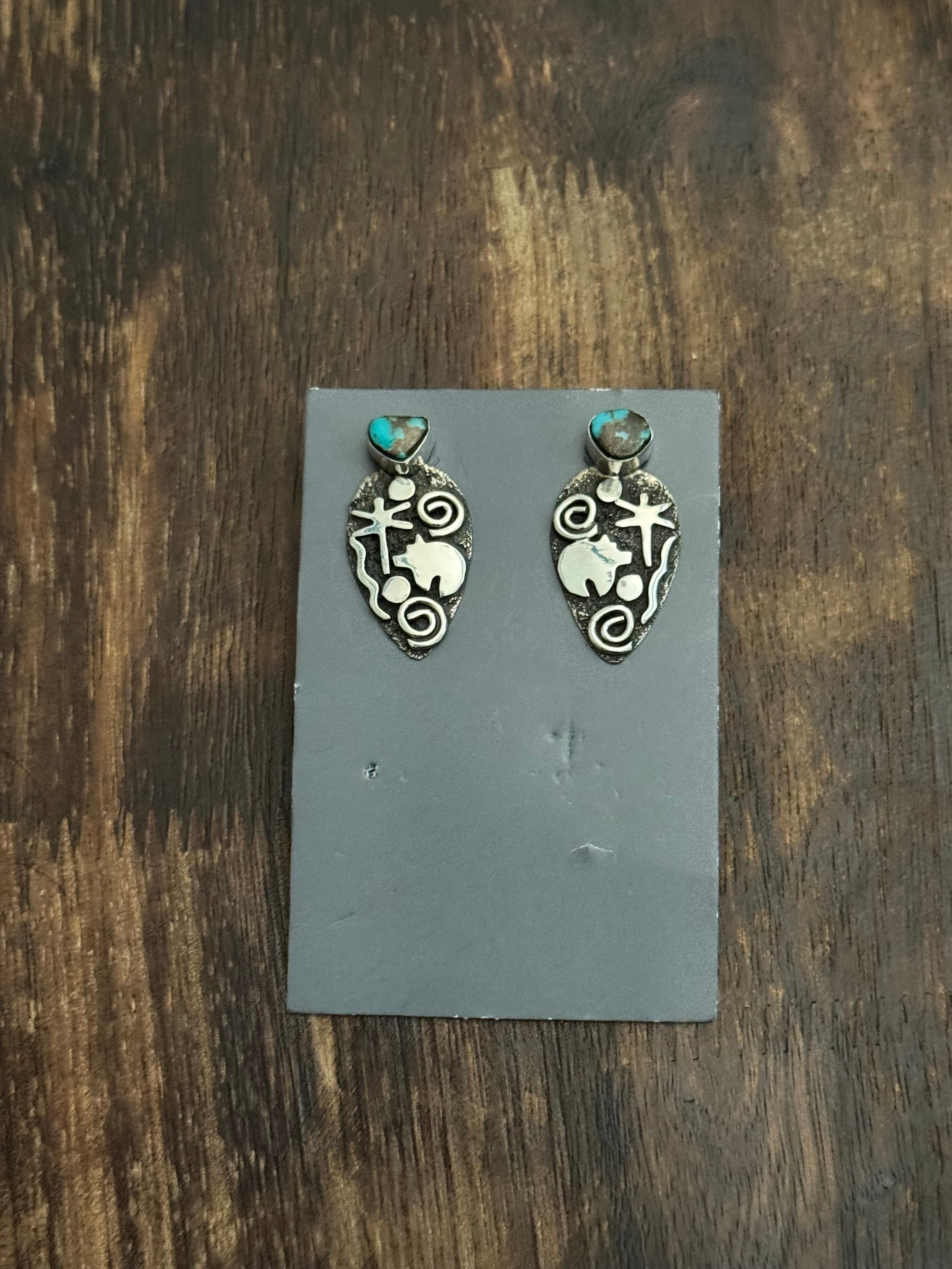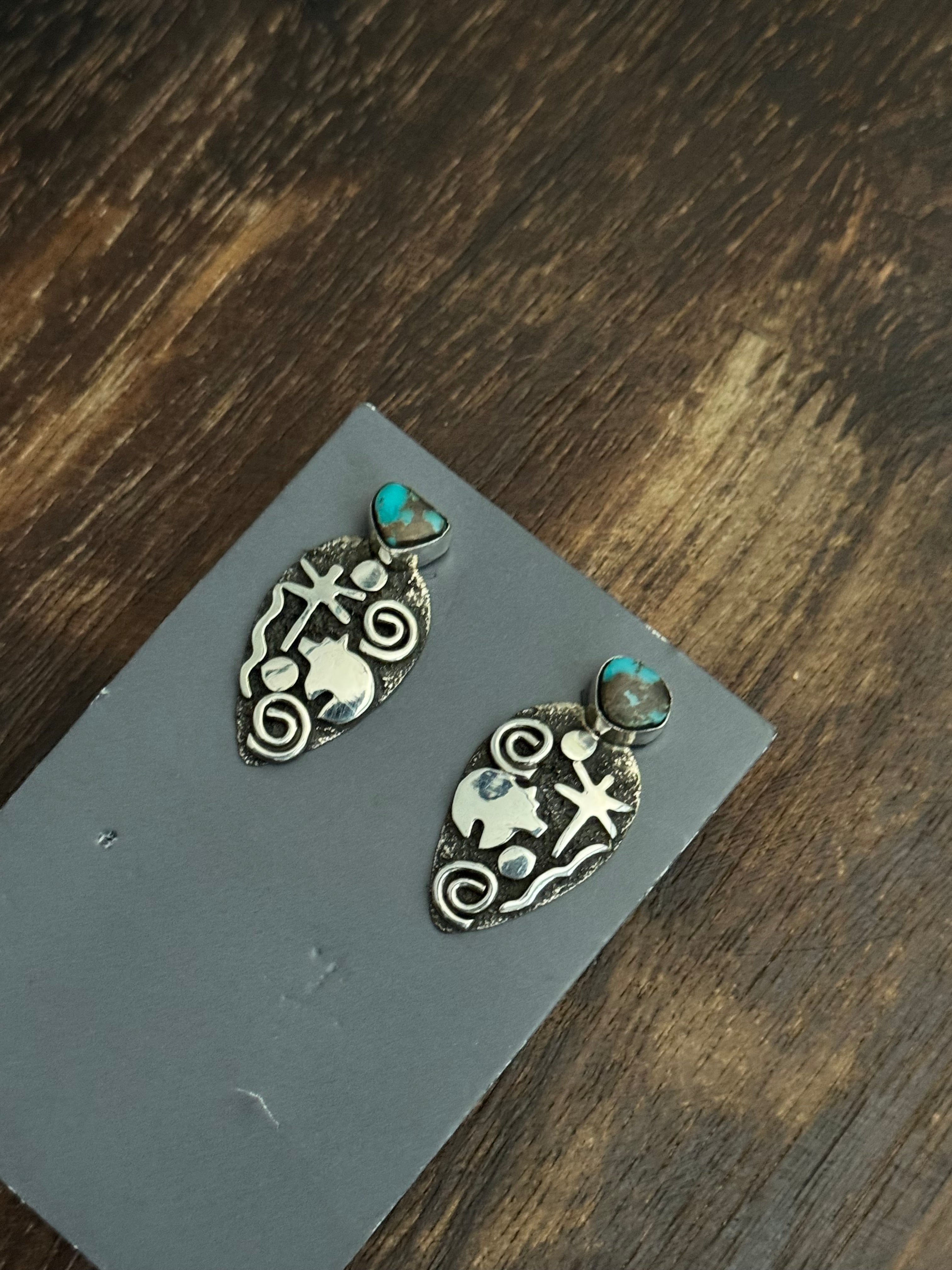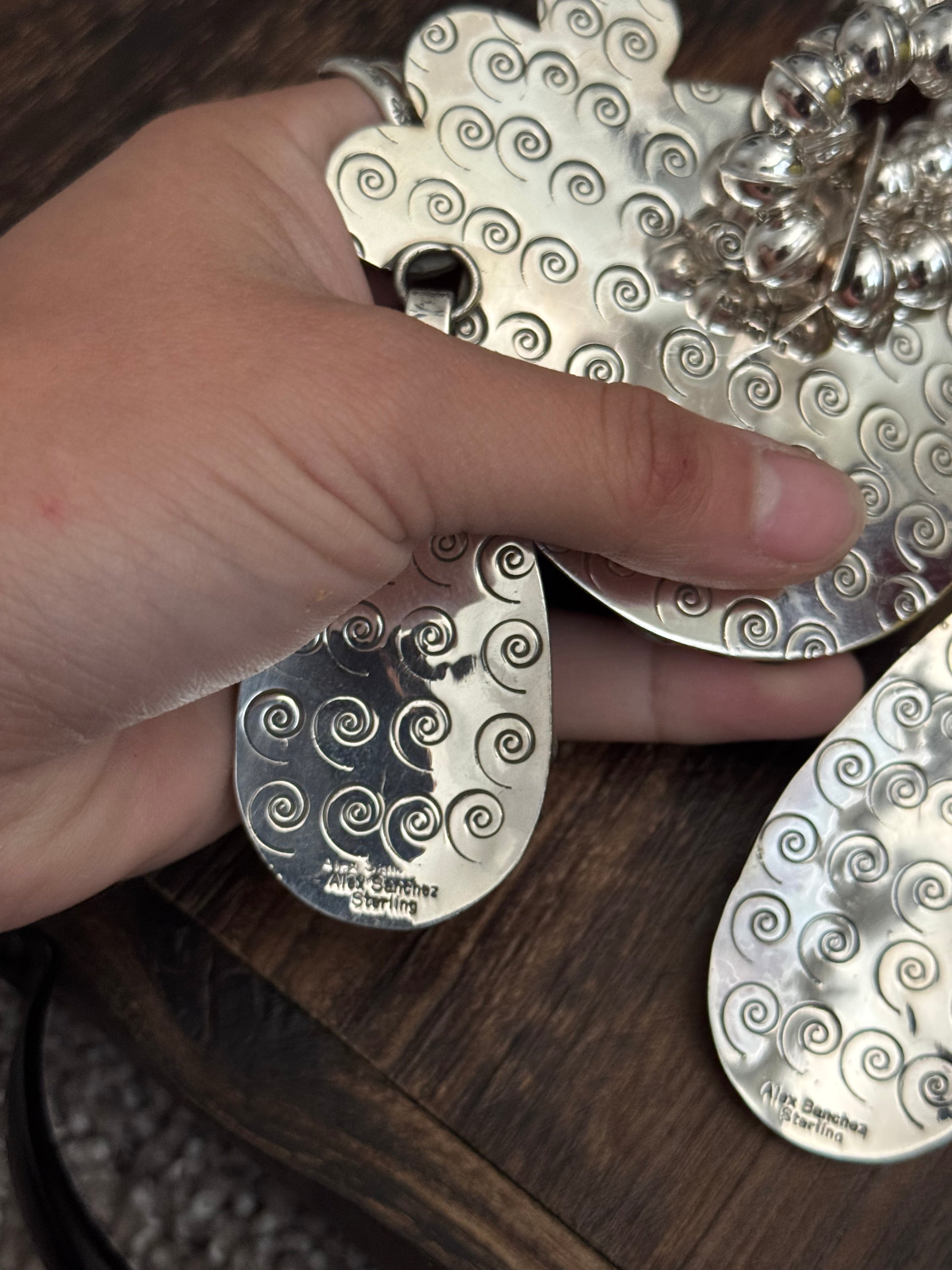 Beautiful Squash Blossom Necklace and Earring set. Alex Sanchez Pilot Mountain Turquoise & Sterling Silver Squash Blossom Necklace Set. It measures 37 1/2 inches long with hang while the chain measures 30 inches long. Signed by the artist and stamped sterling silver.