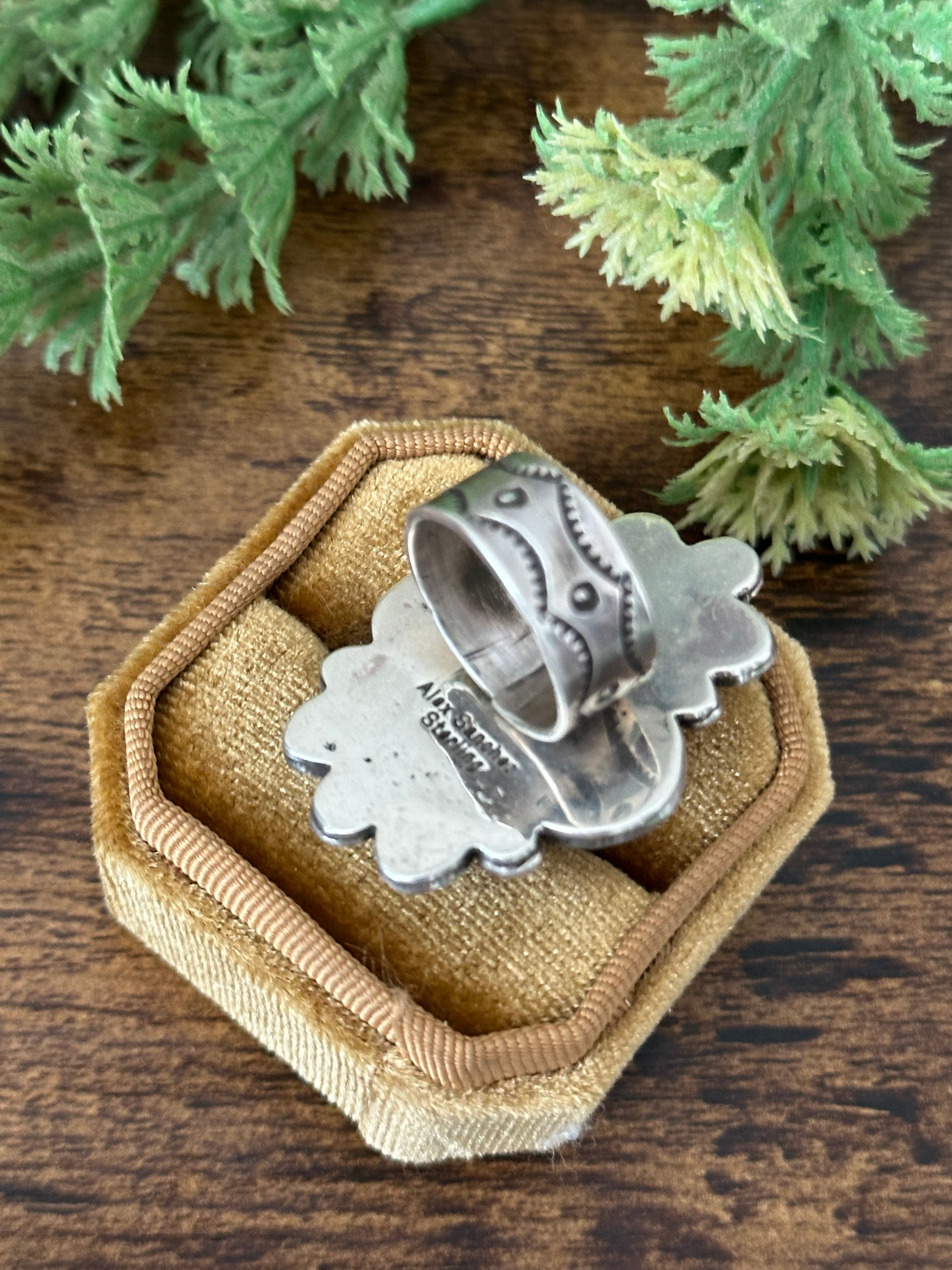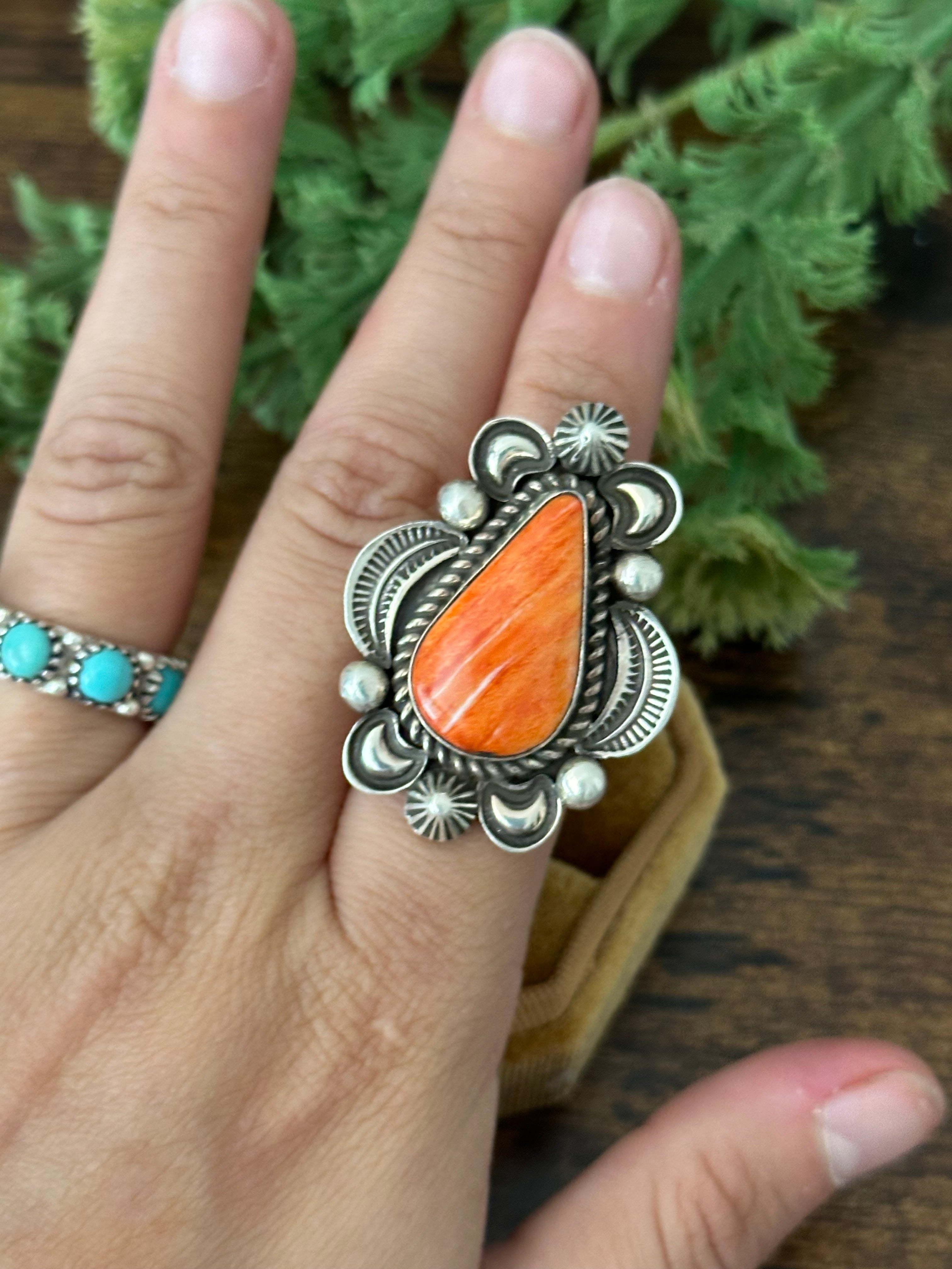 Beautiful stone/ ring. Alex Sanchez Spiny Oyster Sterling Silver Ring Size 6.25. It measures 1 5/8 inches long and 1 1/4 inches wide. Signed by the artist and stamped sterling silver.
