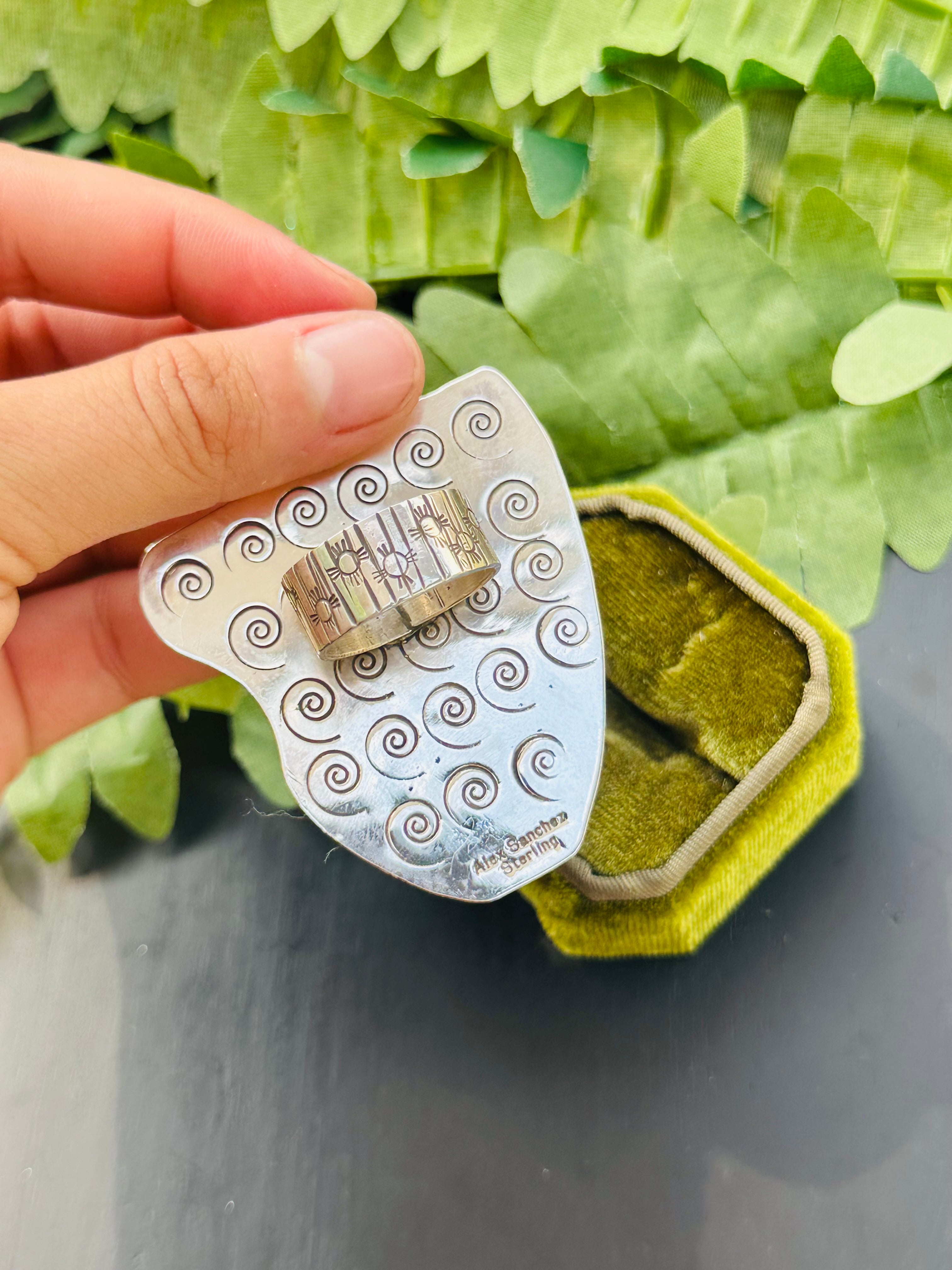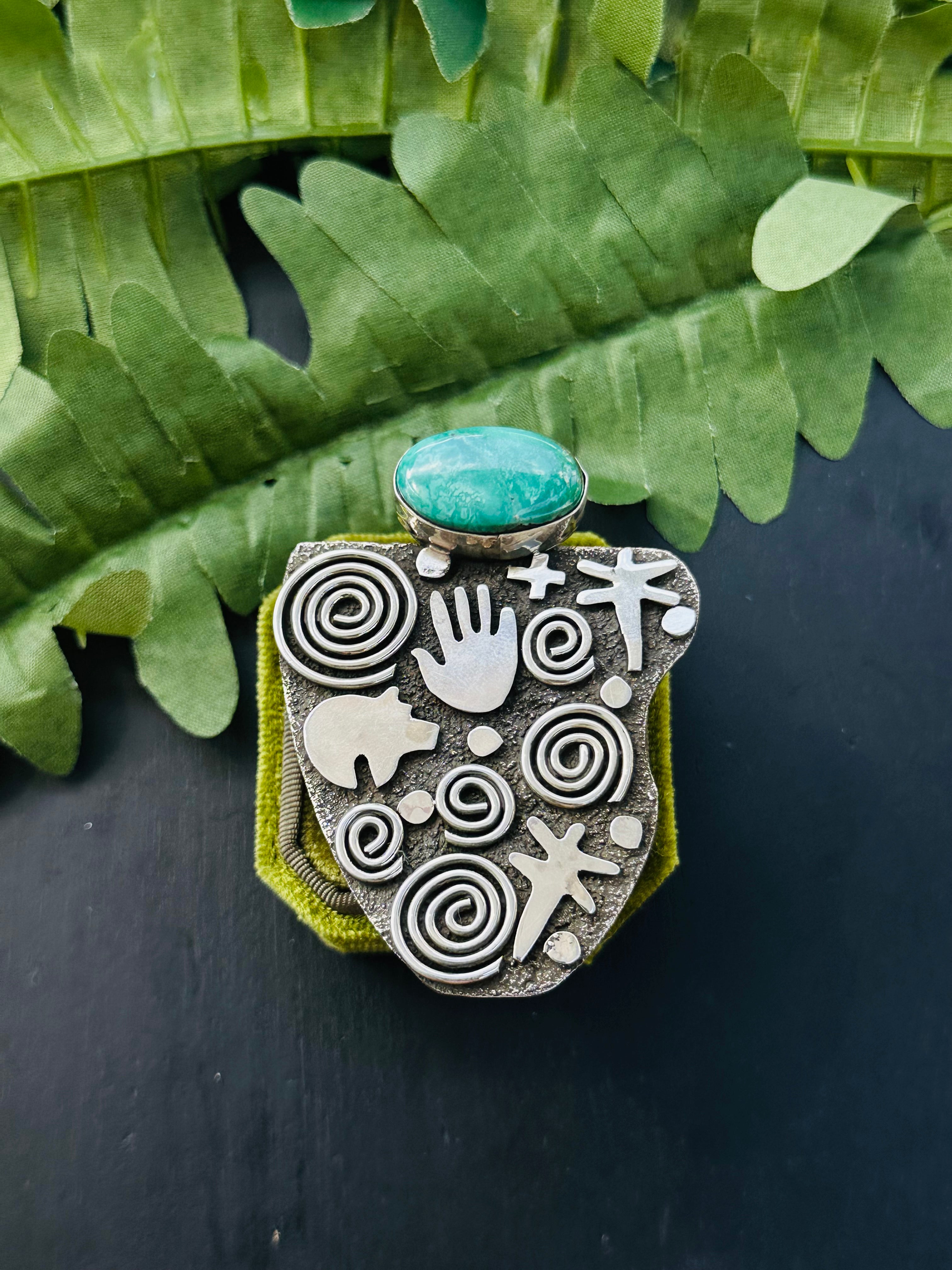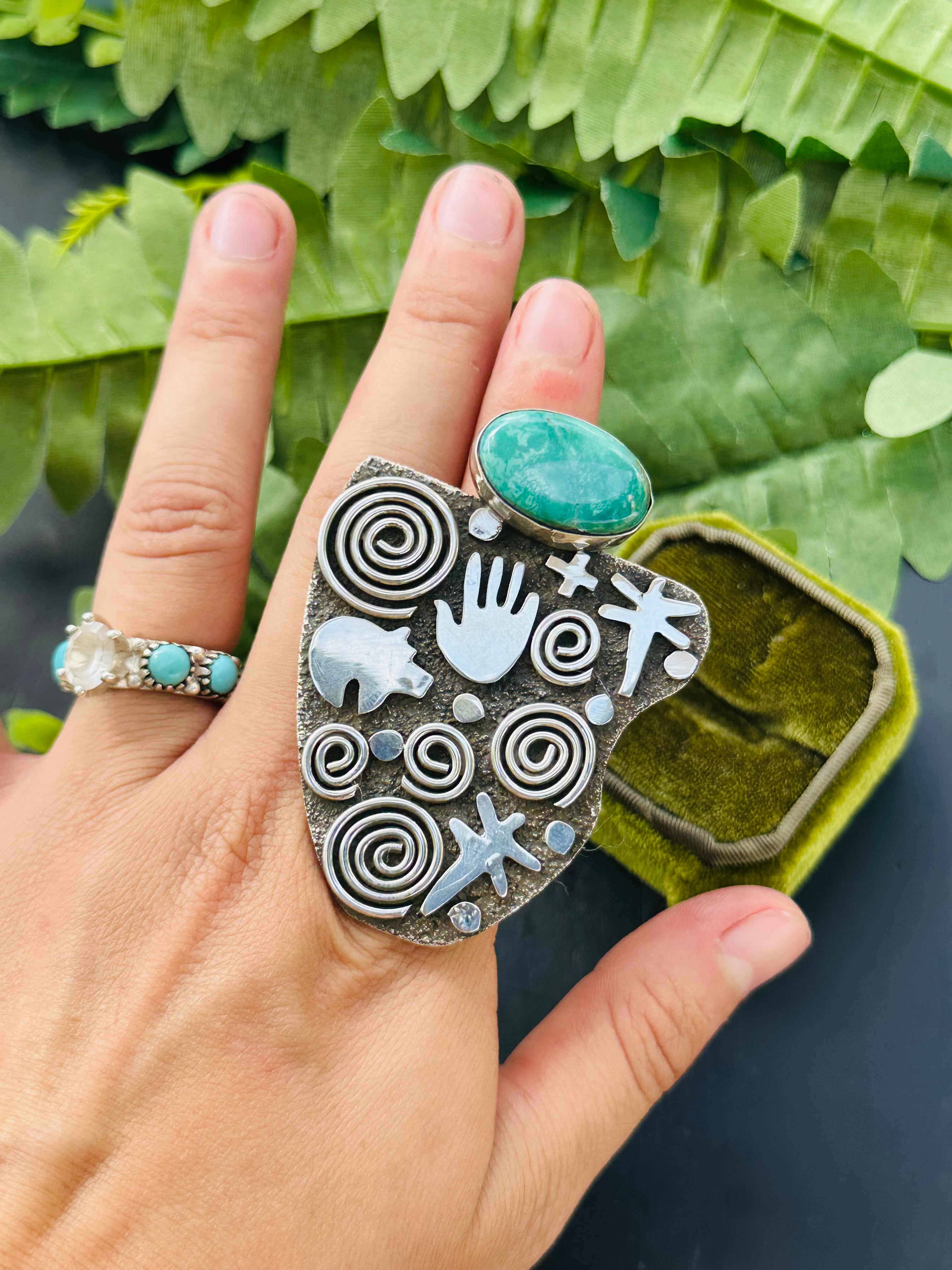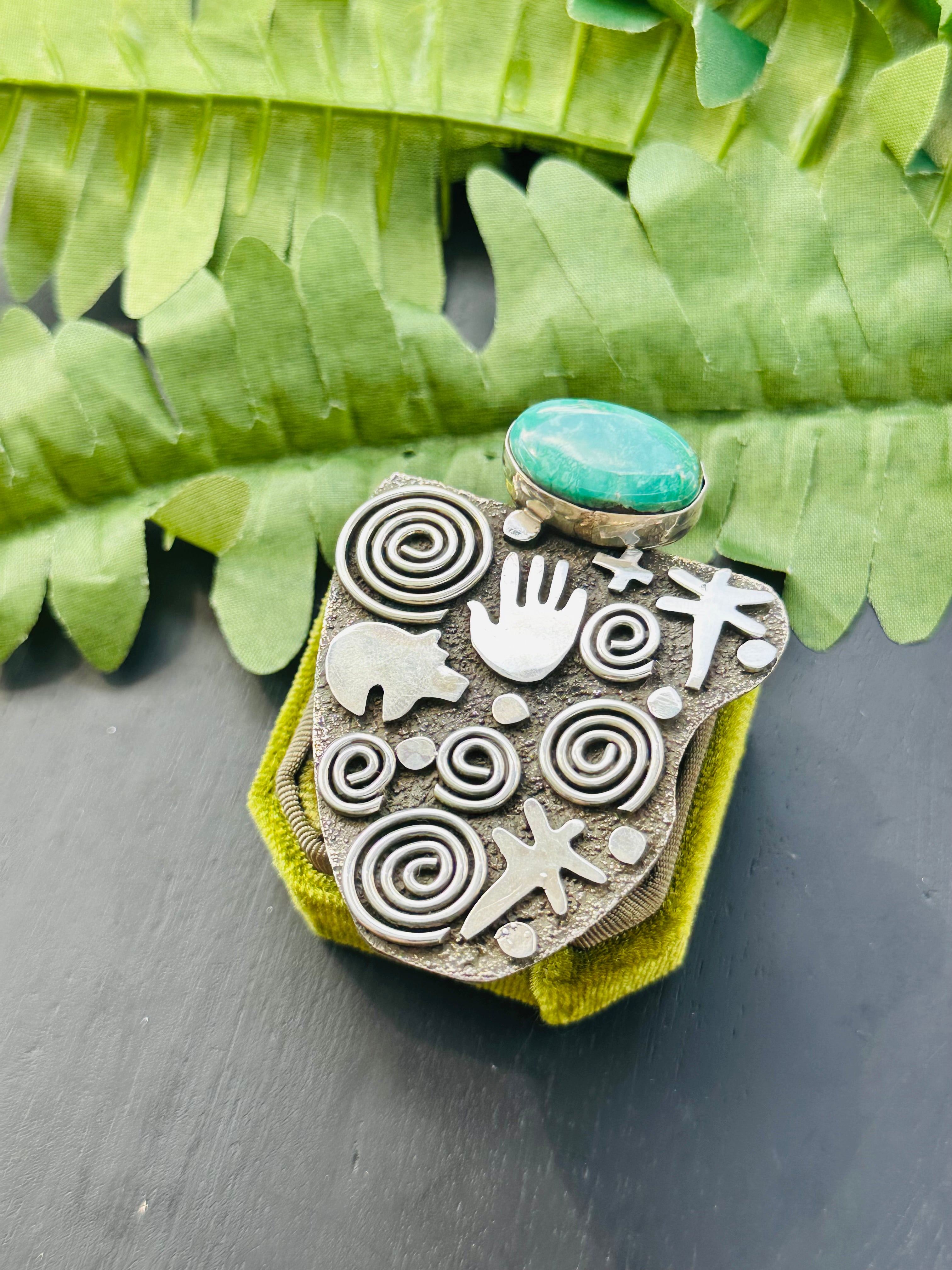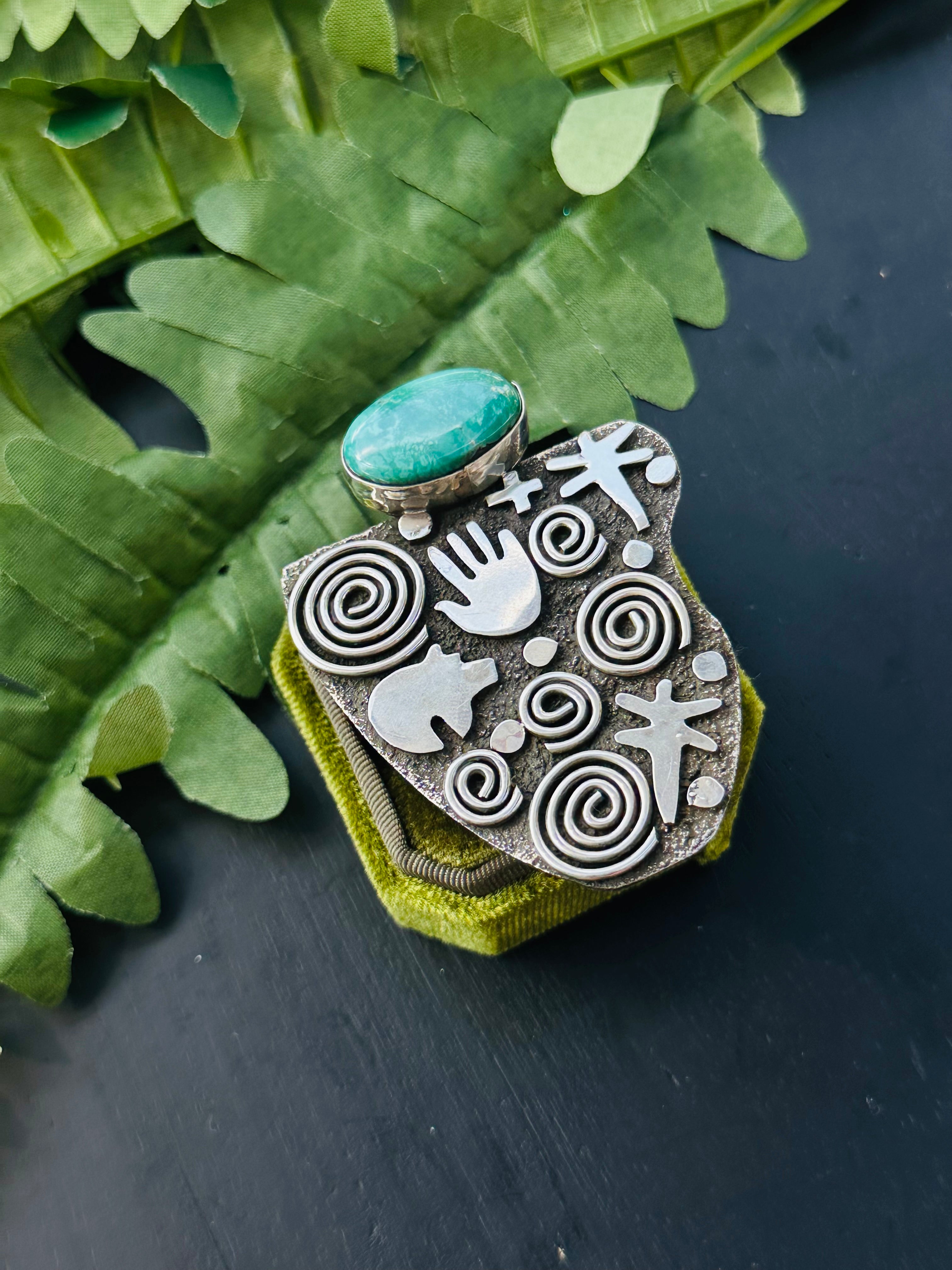 Beautiful stone/ ring. Alex Sanchez Broken Arrow Variscite & Sterling Silver Ring Size 8.5. It measures 2 5/8 inches long and 1 7/8 inches wide. Signed by the artist and stamped sterling silver.
