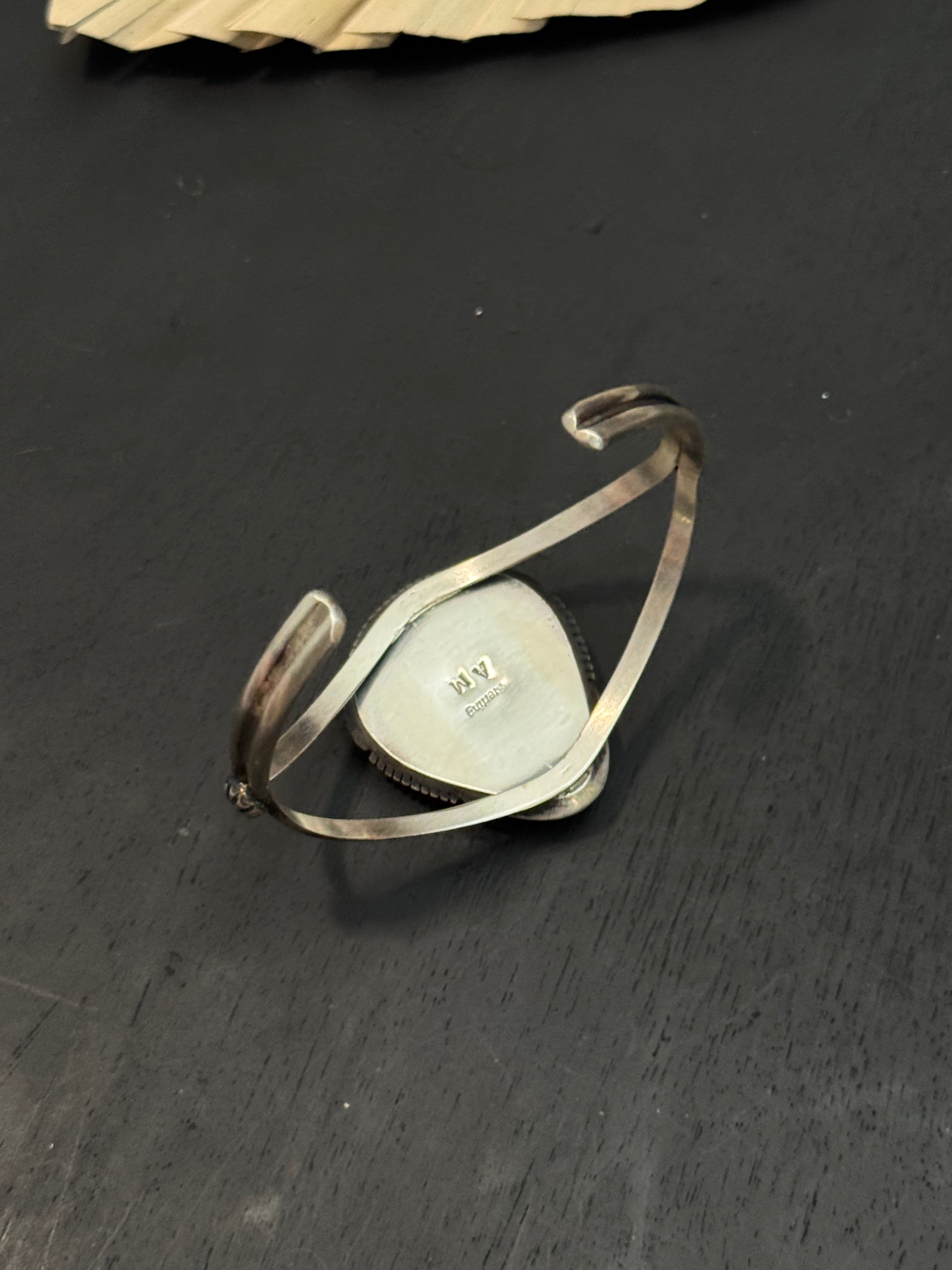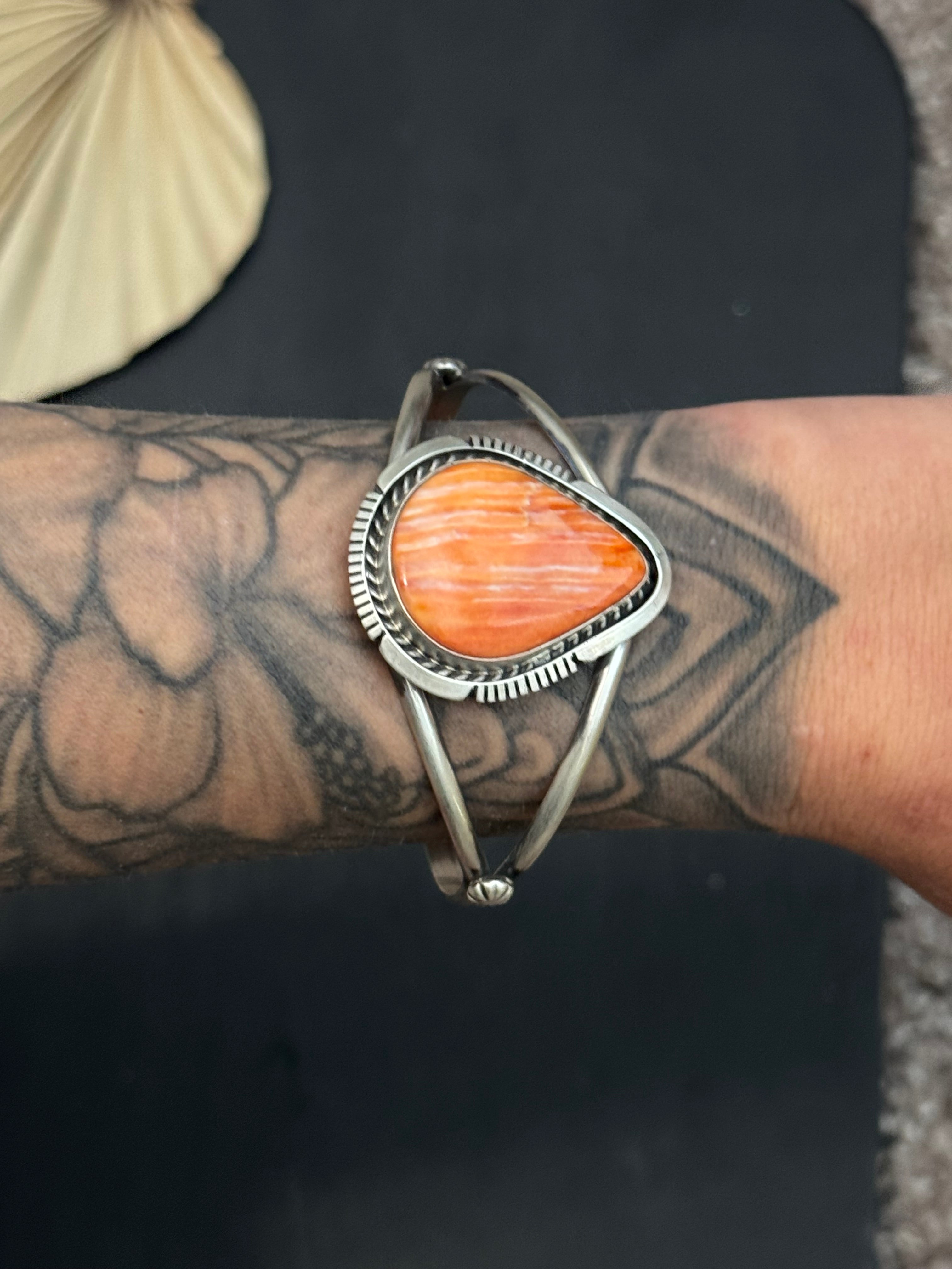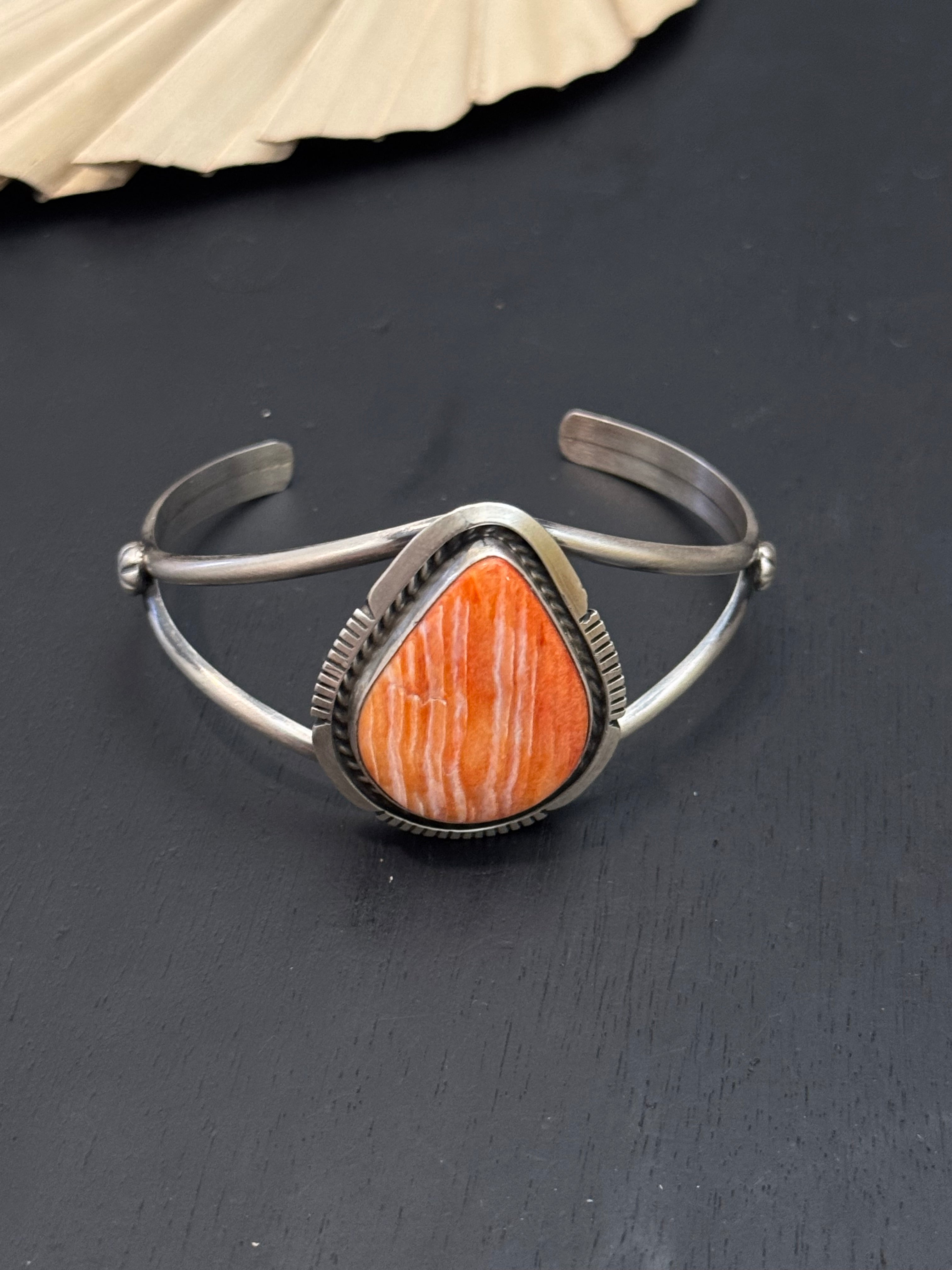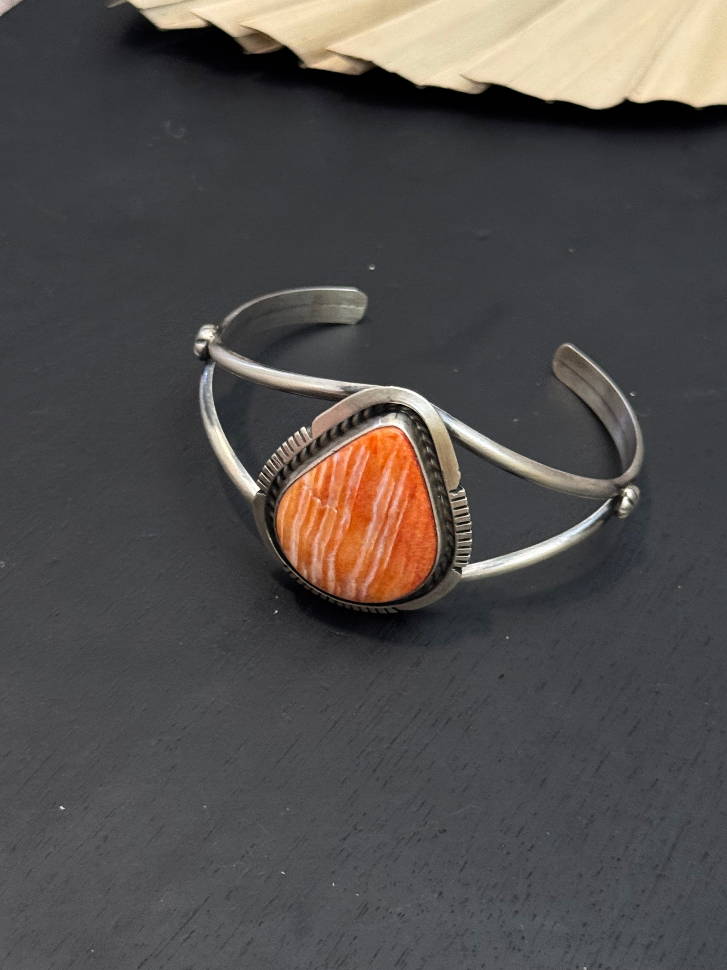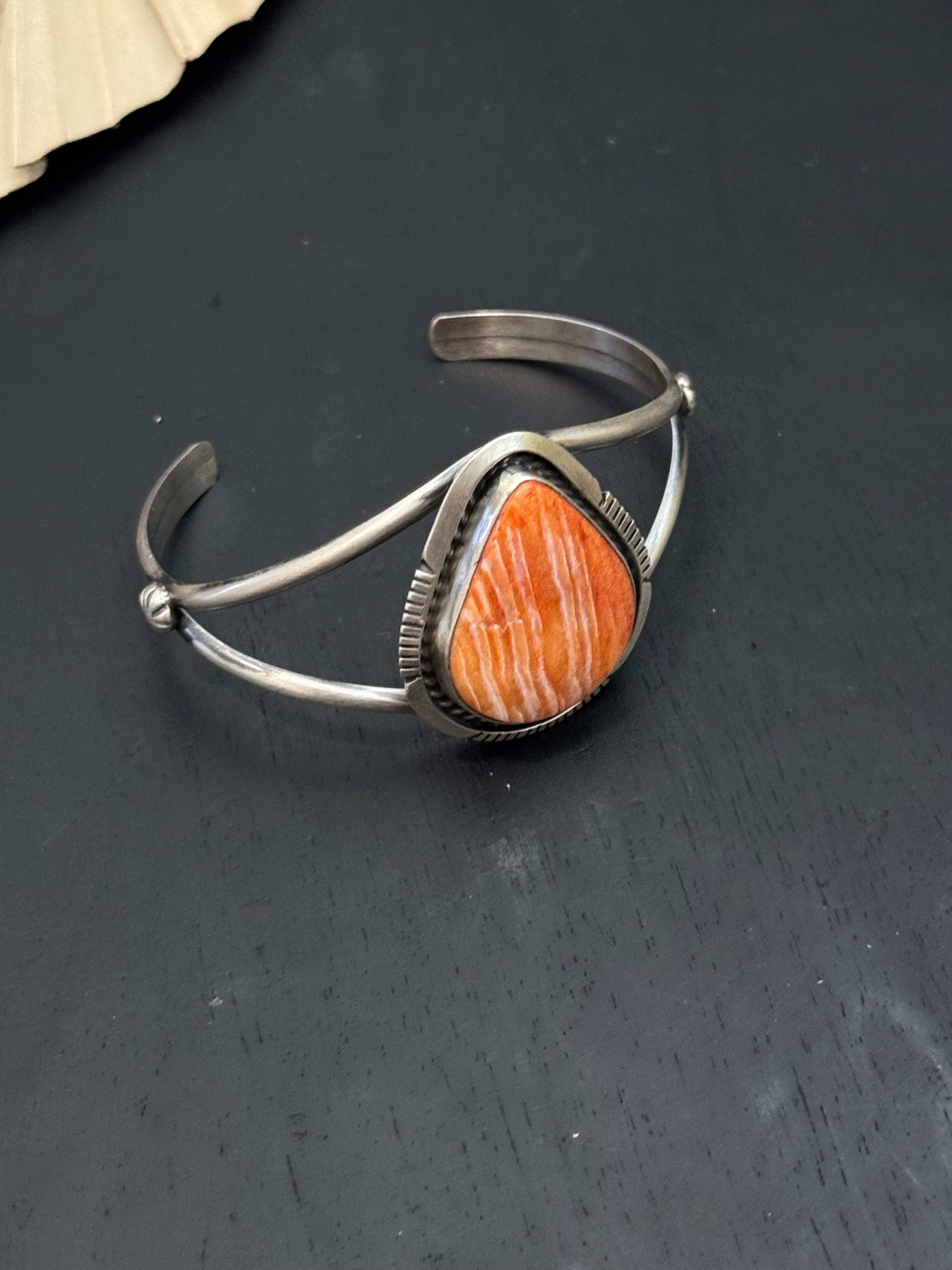 Alfred Martinez Spiny Oyster & Sterling Silver Cuff Bracelet. It measures 1 3/8 inches wide with an inside circumference of 5 3/8 inches and a gap 1 1/4 inches. stamped sterling silver.