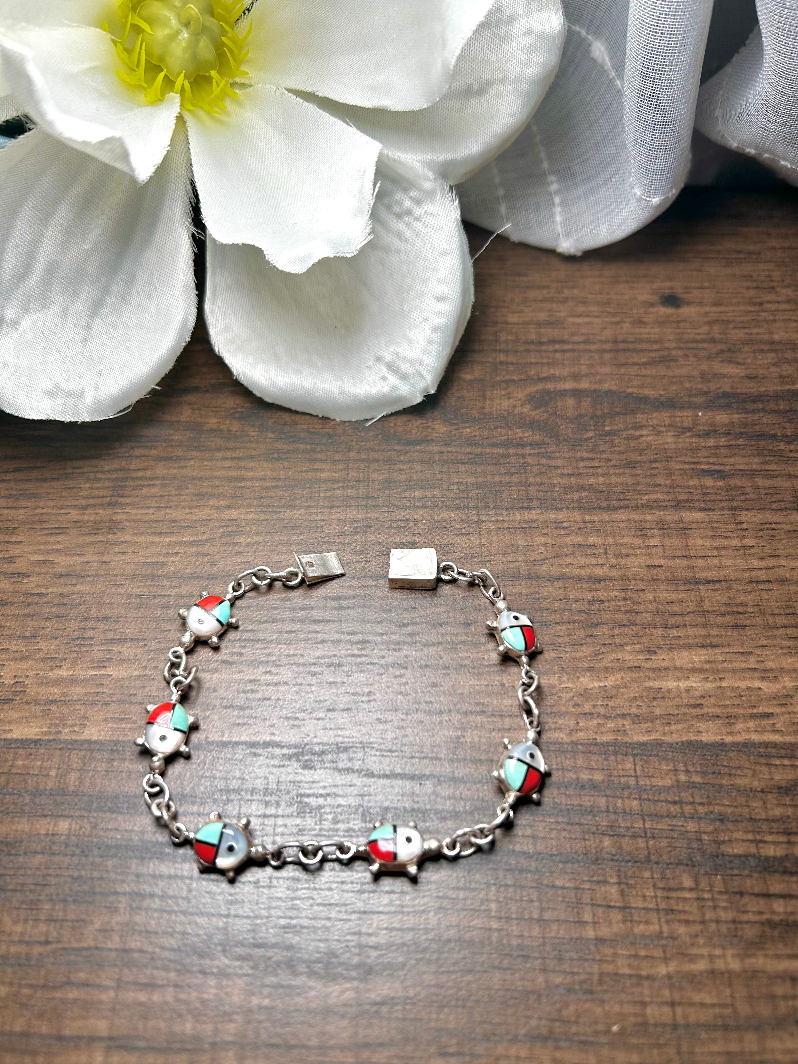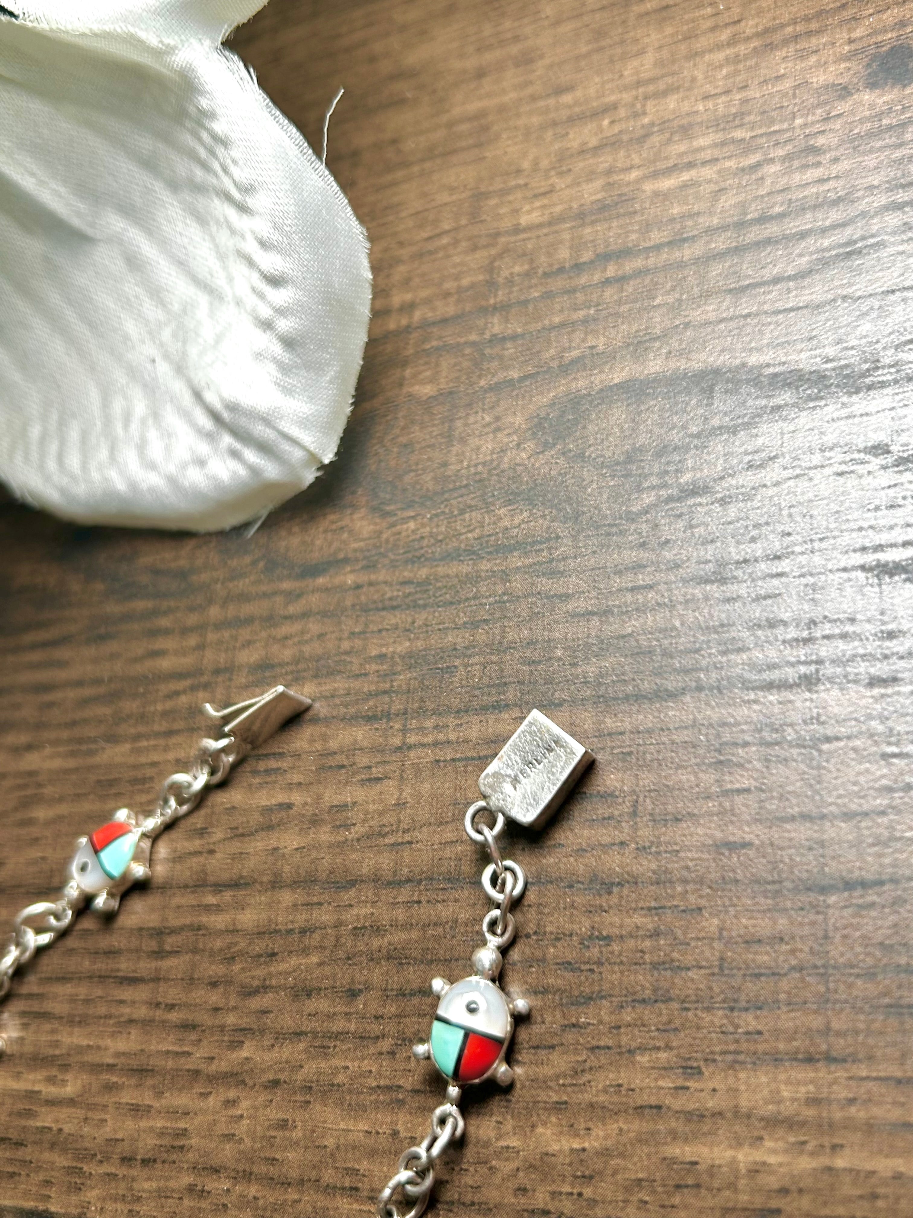Vintage Zuni Made Multi Stone & Sterling Silver Link Bracelet. They measure 7 3/8 inches long and 3/8 of an inch wide. Stamped sterling silver.