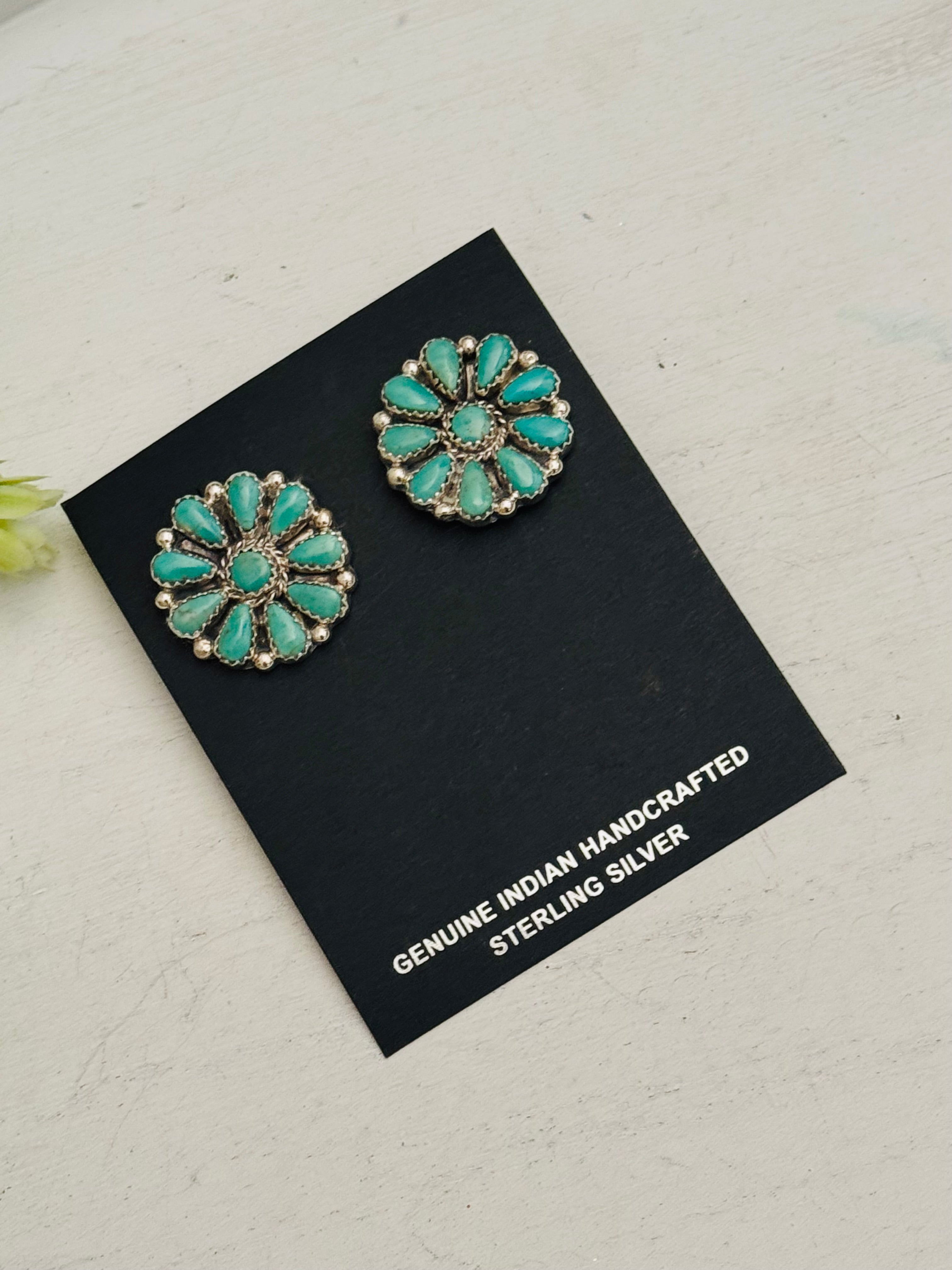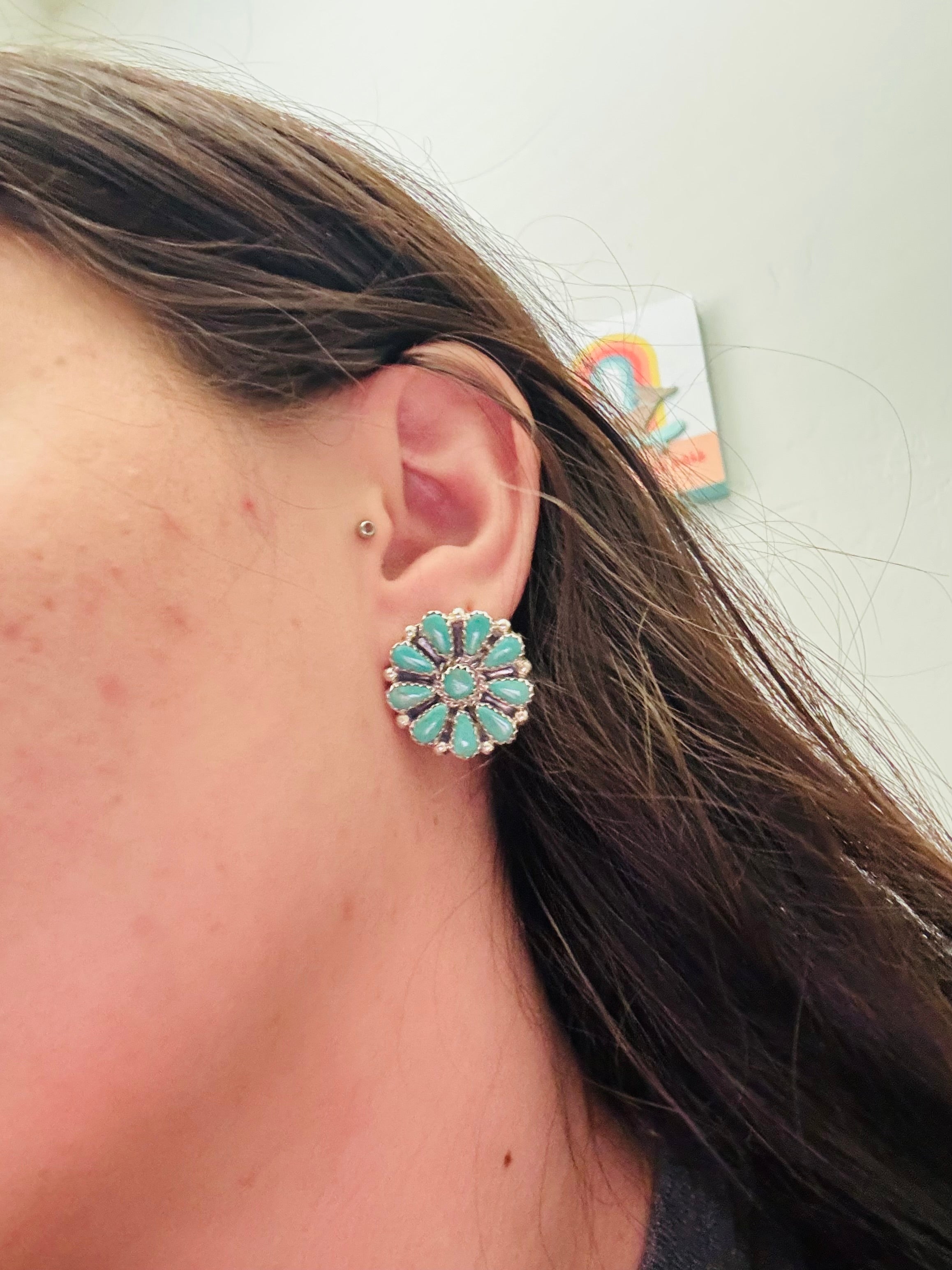 Beautiful lightweight Dangle Earrings. Alicia Wilson Kingman Turquoise & Sterling Silver Post Cluster Earrings. It measures 7/8 of an inch round. Stamped sterling silver. Stones will differ due to natural stones.