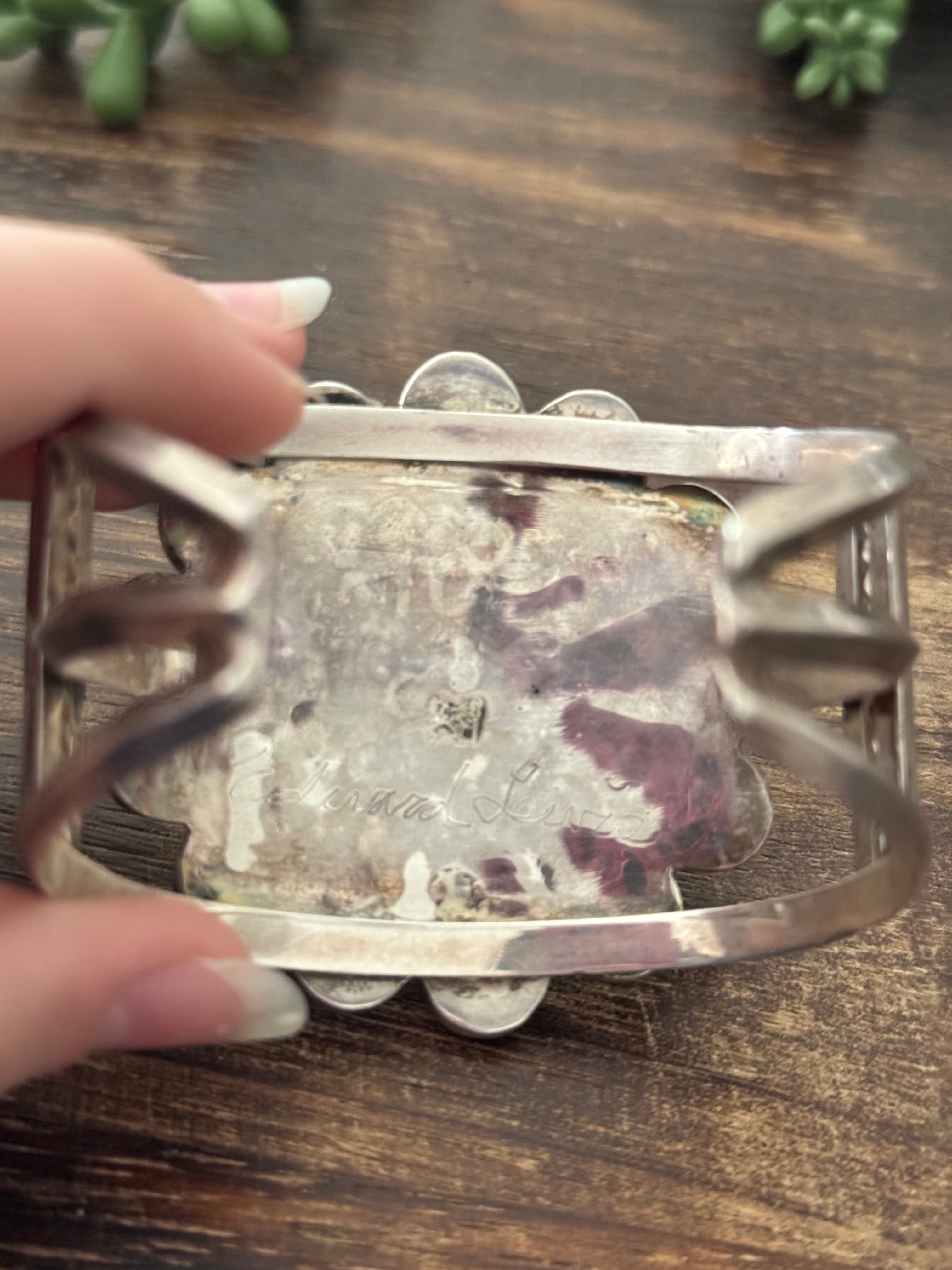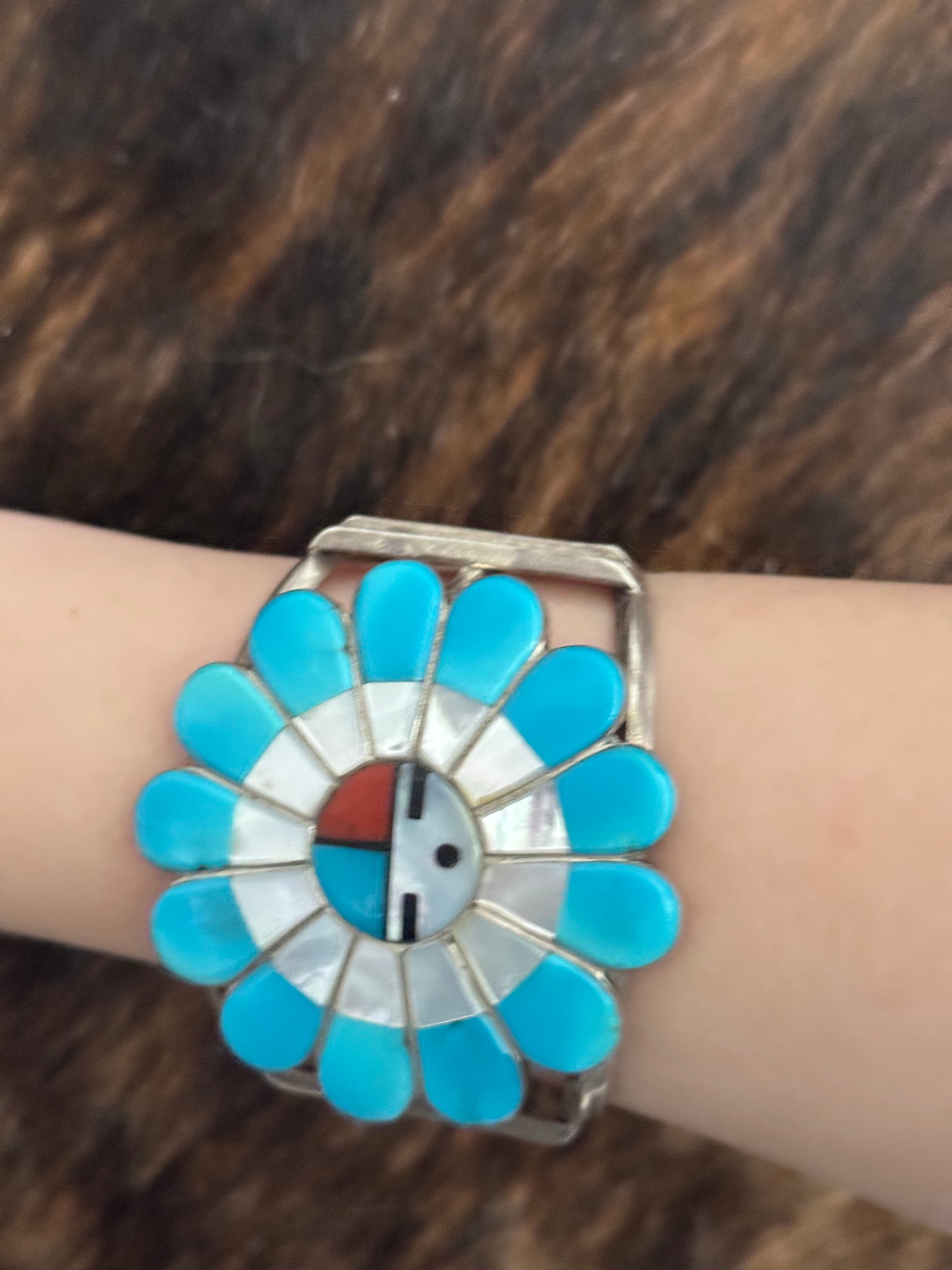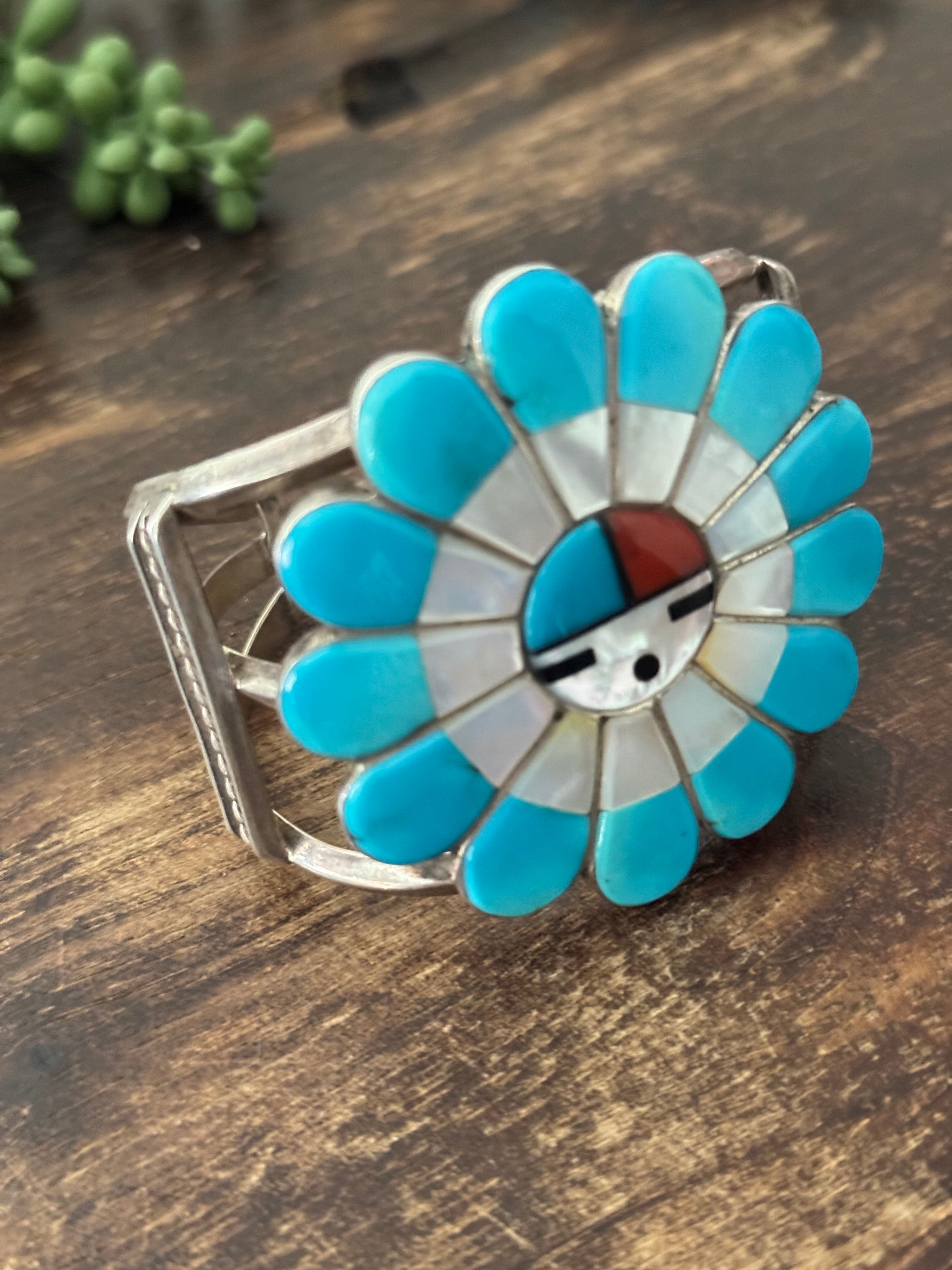 Vintage Edward Lewie Multi Stone & Sterling Silver Sunface Inlay Cuff Bracelet. It measures 2 inches wide with an inside circumference of 5 3/4 inches and a gap of 1 inches. Signed by the artist and stamped sterling silver.