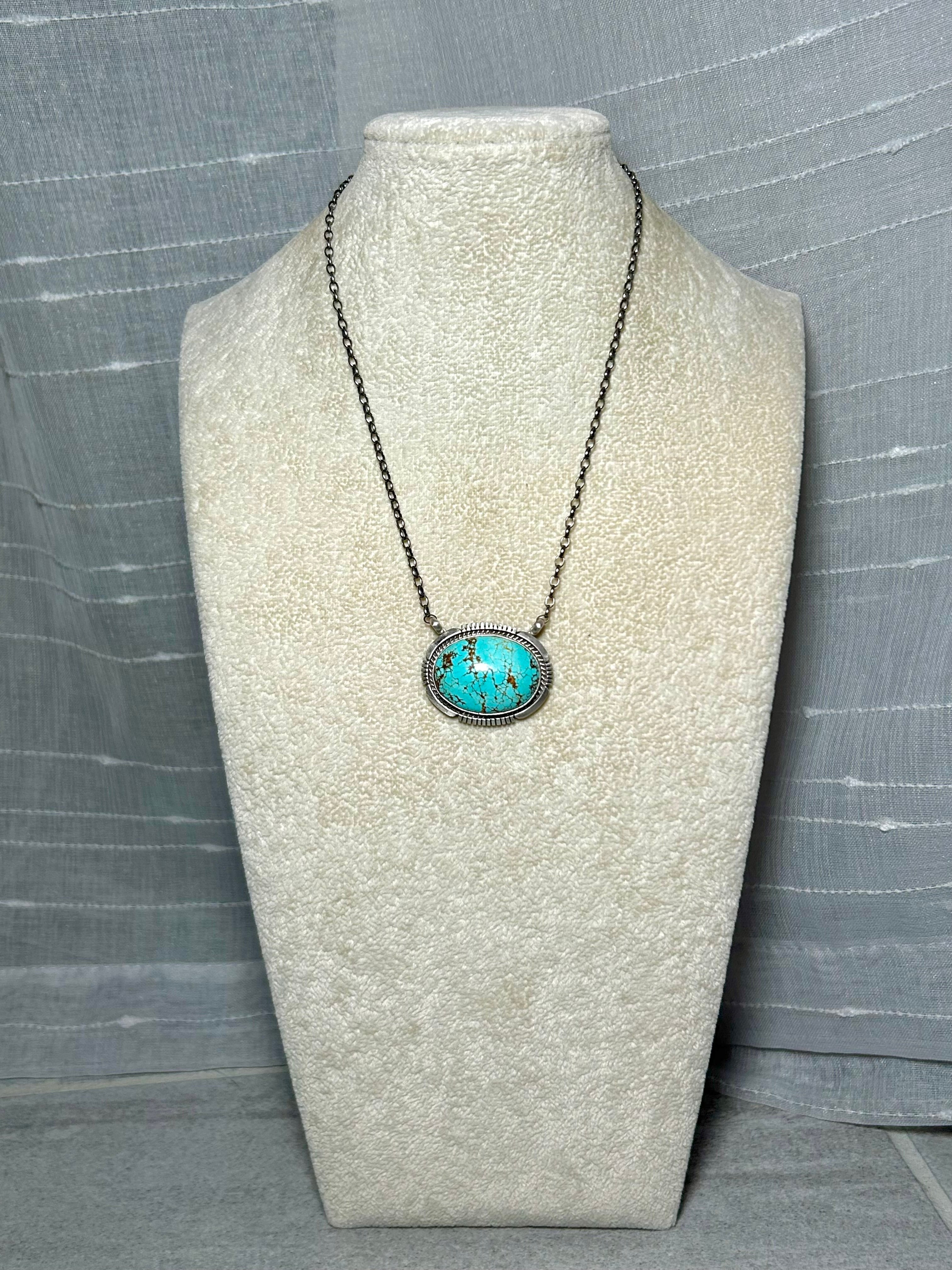 Alfred Martinez #8 Turquoise & Sterling Silver Necklace. It measures 18 inches long with hang while the chain measures 15 3/4 inches long. Signed by the artist and stamped sterling silver.