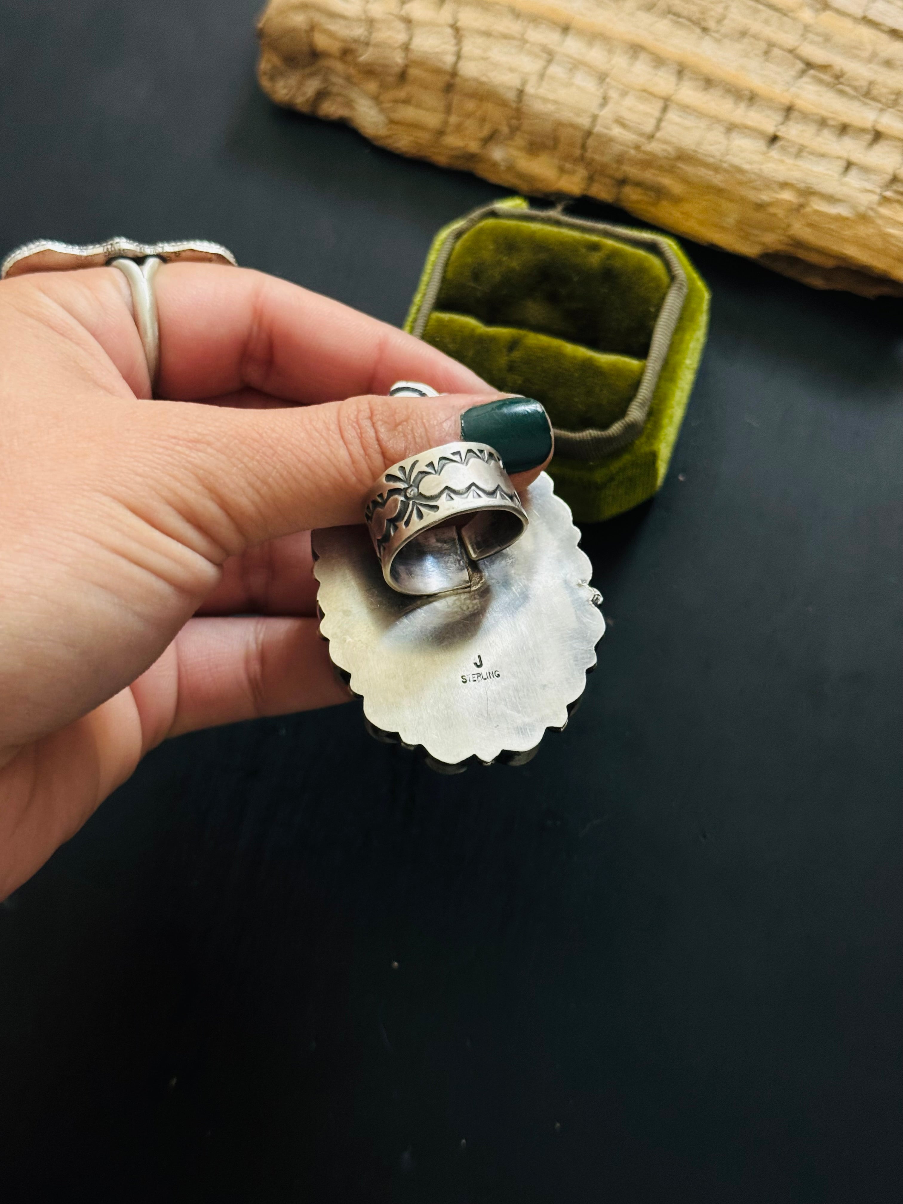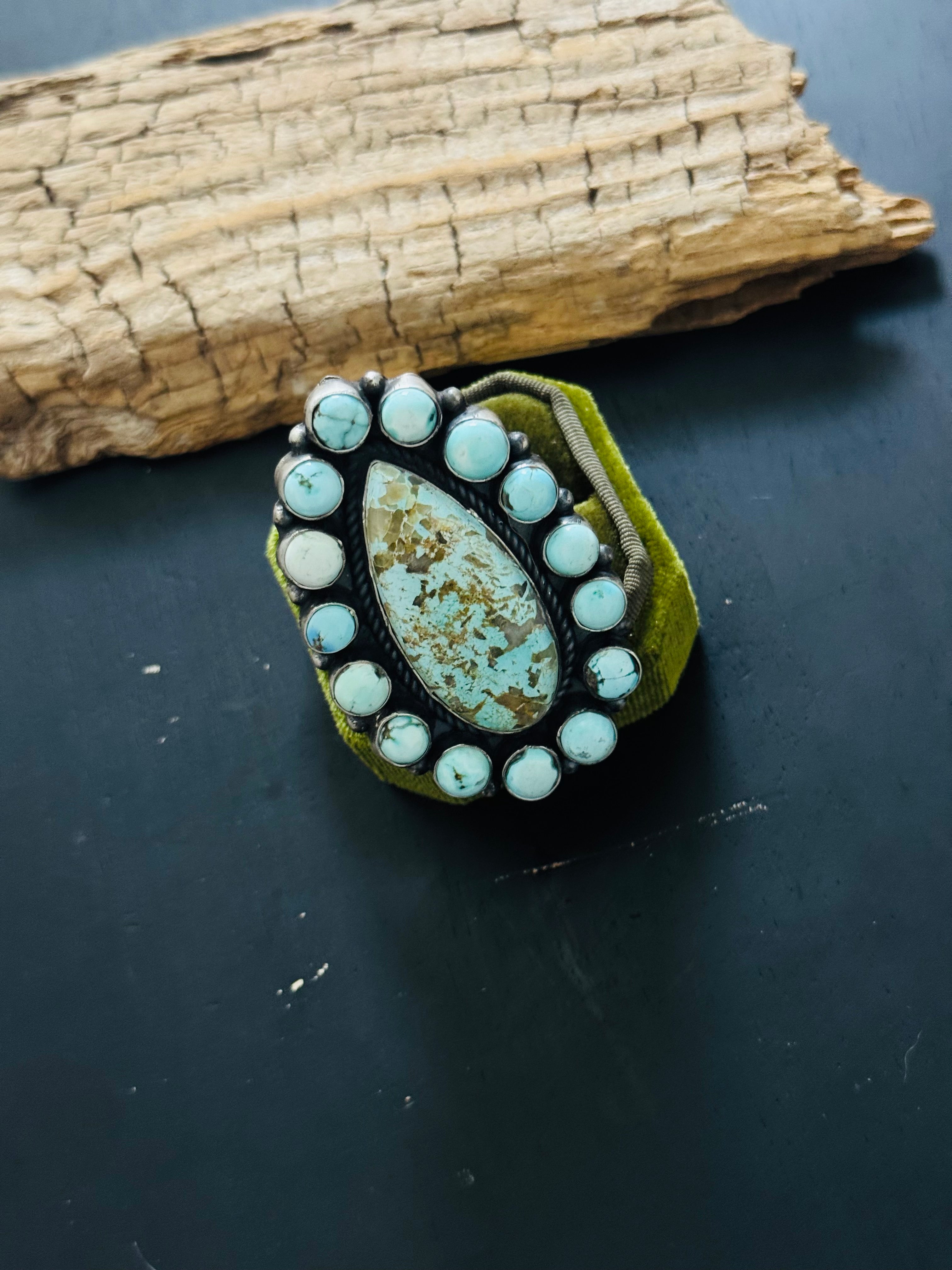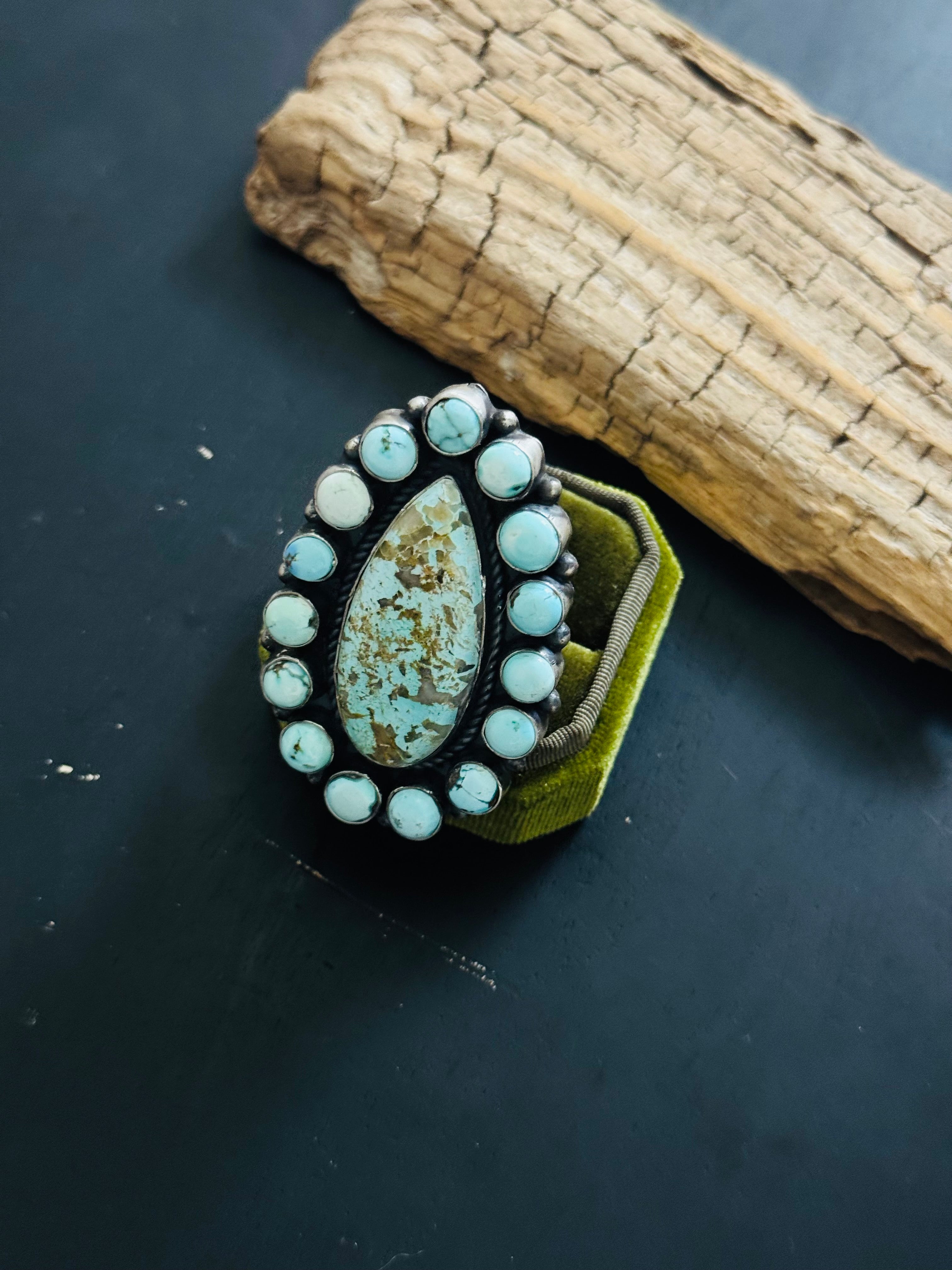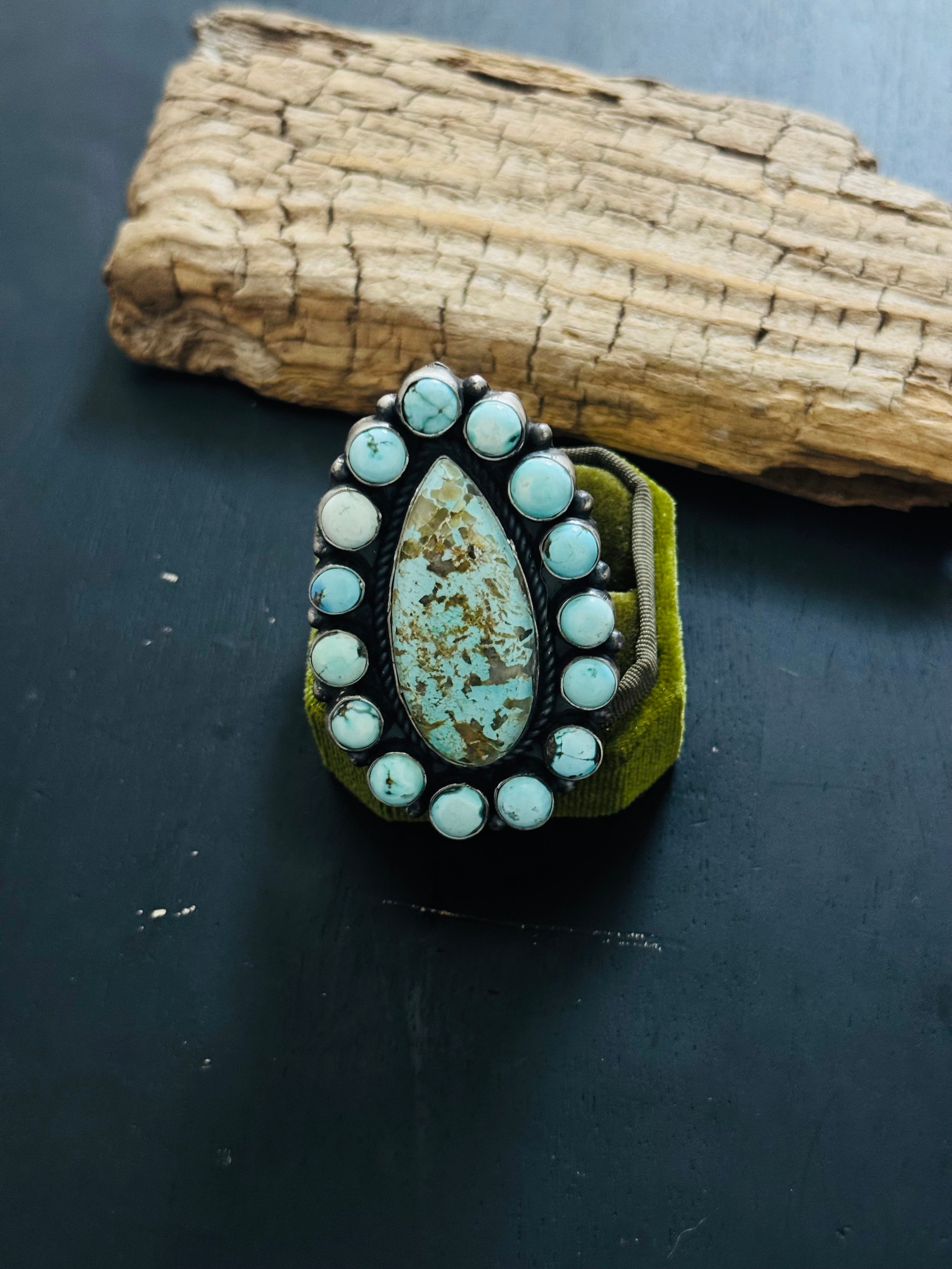 Amos Jake Mixed Turquoise & Sterling Silver Adjustable Cluster Ring. It measures 2 3/8 inches long and 1 5/8 inches wide. Signed by the artist and stamped sterling silver.