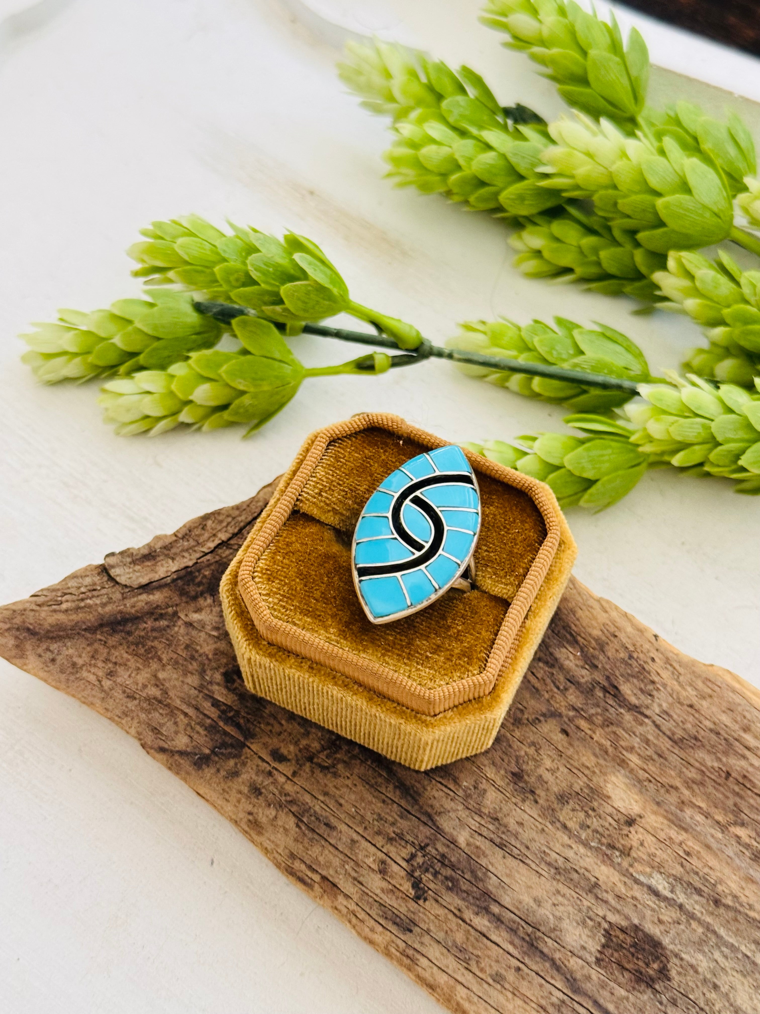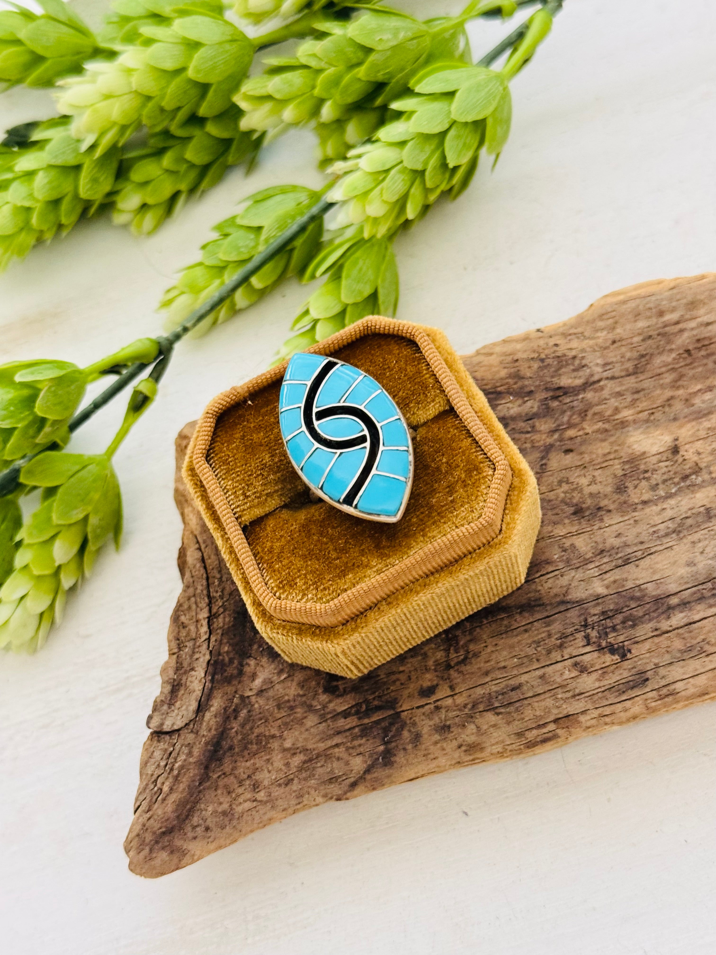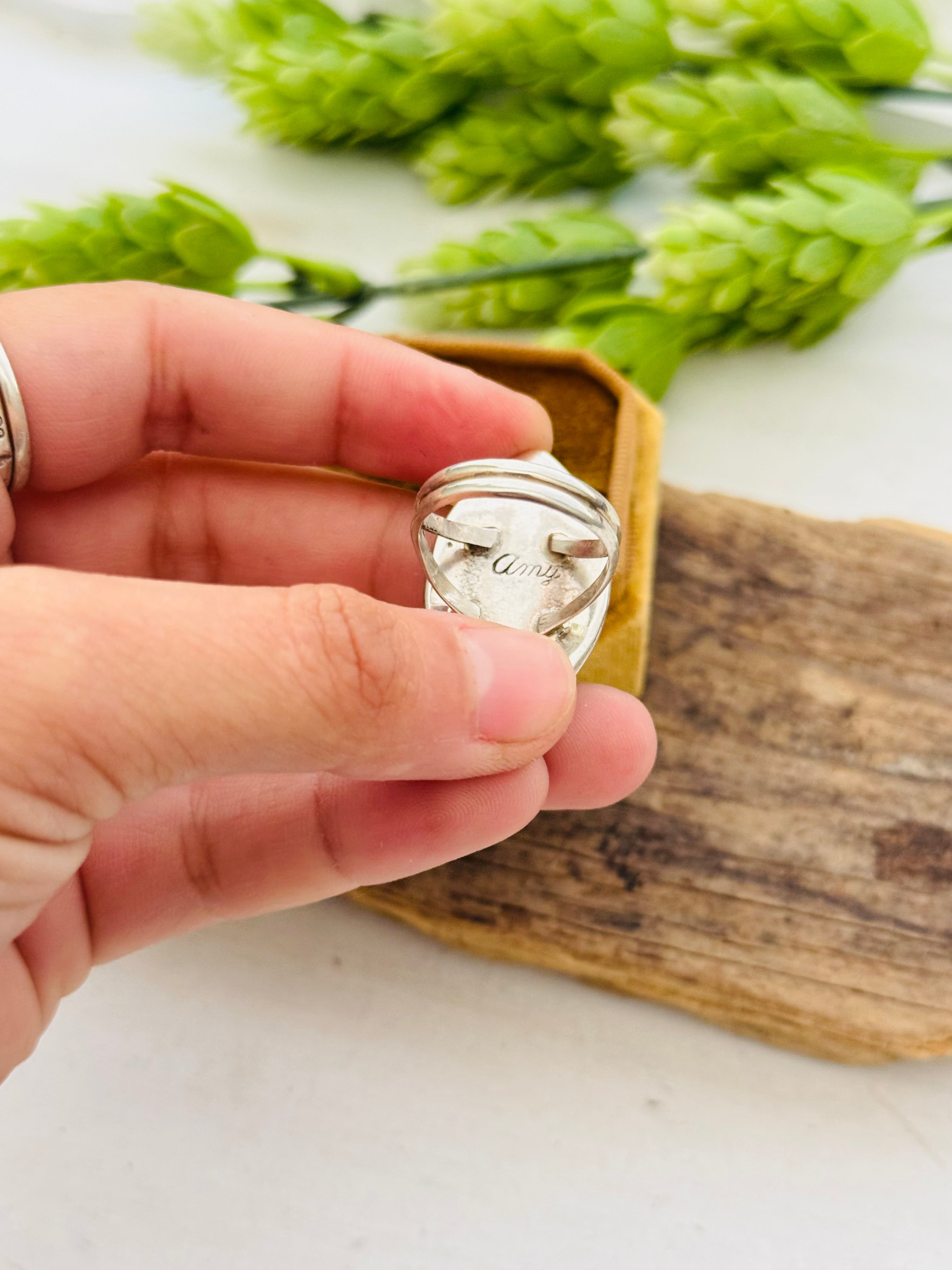 Amy Locaspino Multi Stone & Sterling Silver Inlay Ring Size 8. It measures 1 3/8 inches long and 3/4 of an inch wide. Signed by the artist and stamped sterling silver.