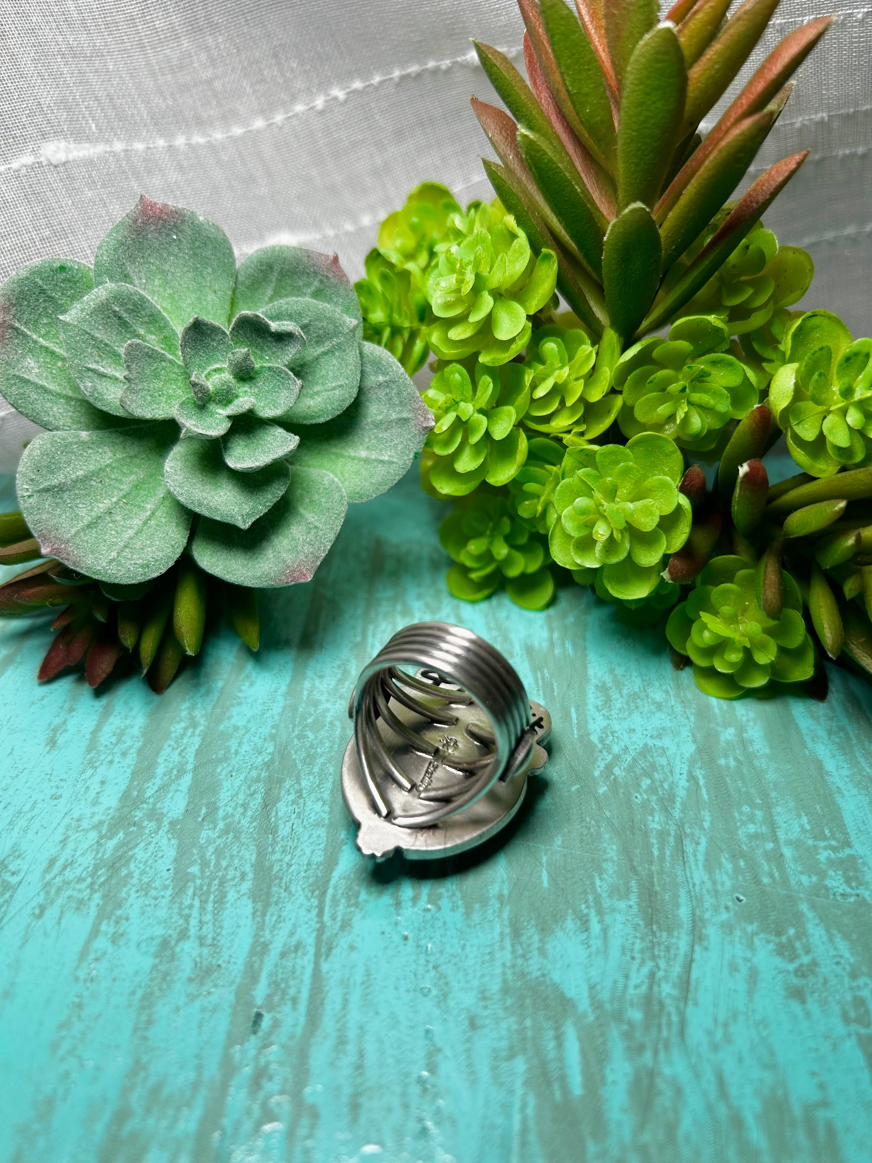 Randy Boyd Royston Turquoise & Sterling Sliver Ring Size 7.5. It measures 1 1/2 inches long and 1 inch wide. Signed by the artist and stamped sterling silver.