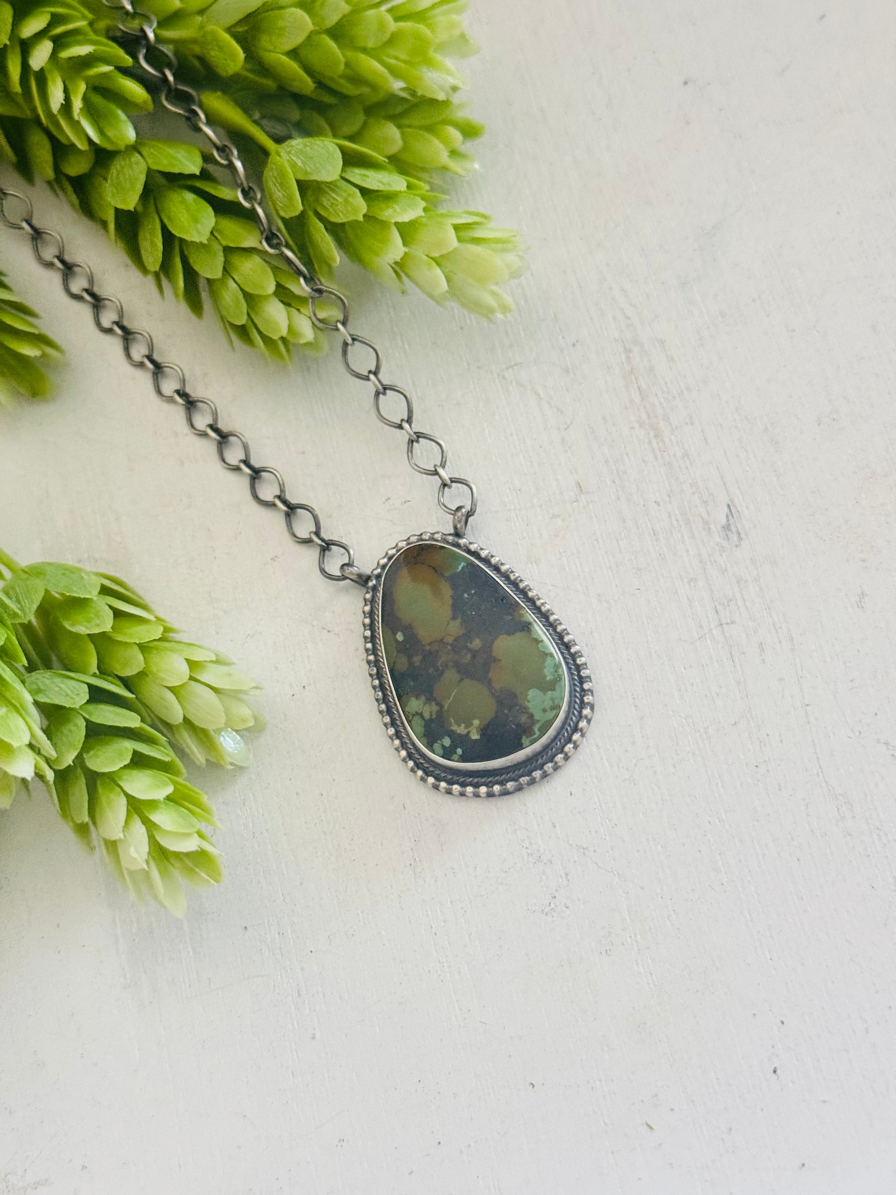 Mathilda Bennally Black Jack Turquoise & Sterling Silver Necklace. It measures 21 inches long with hang while the chain by itself measures 18 inches . Signed by the artist and stamped sterling silver.