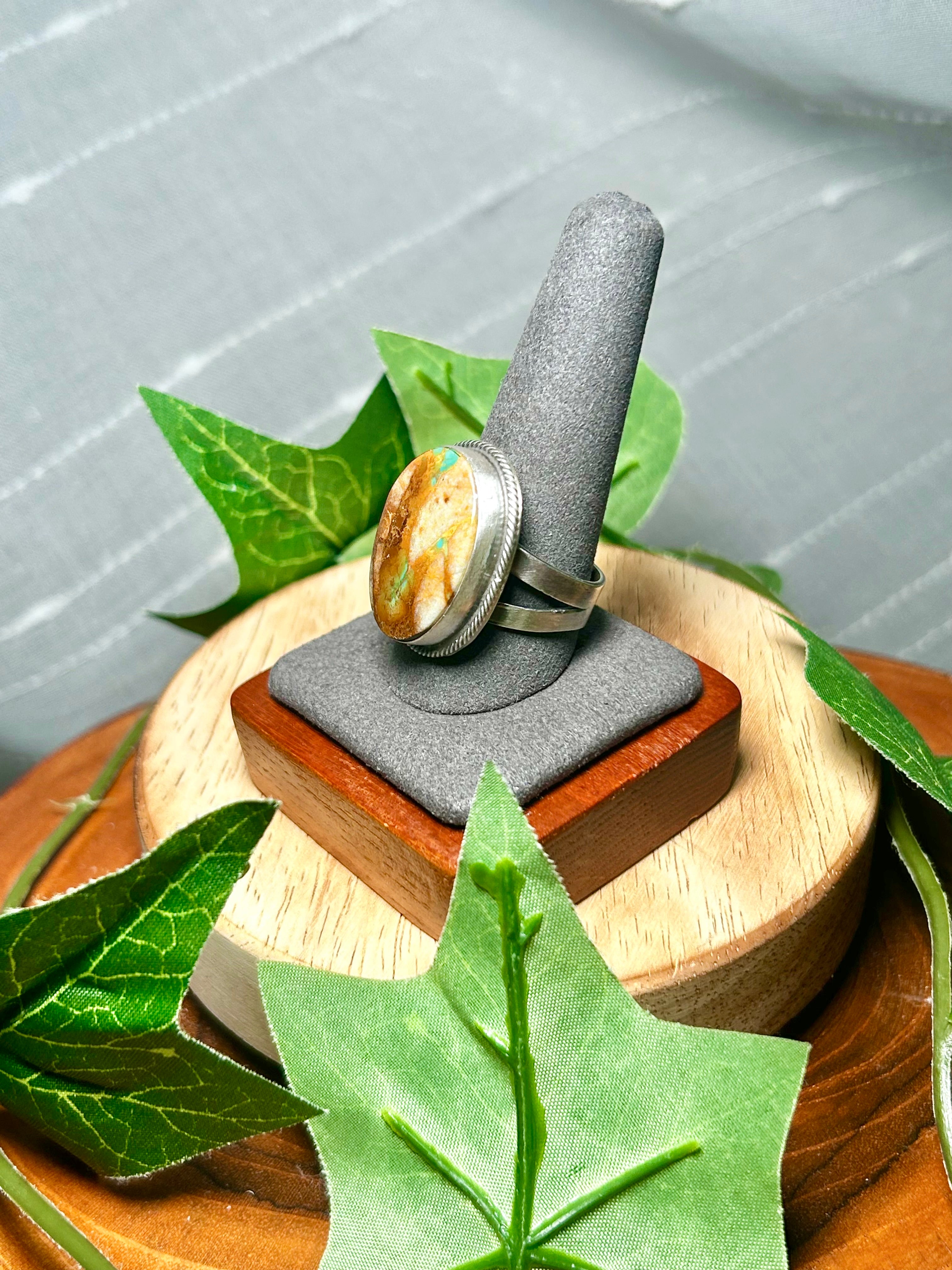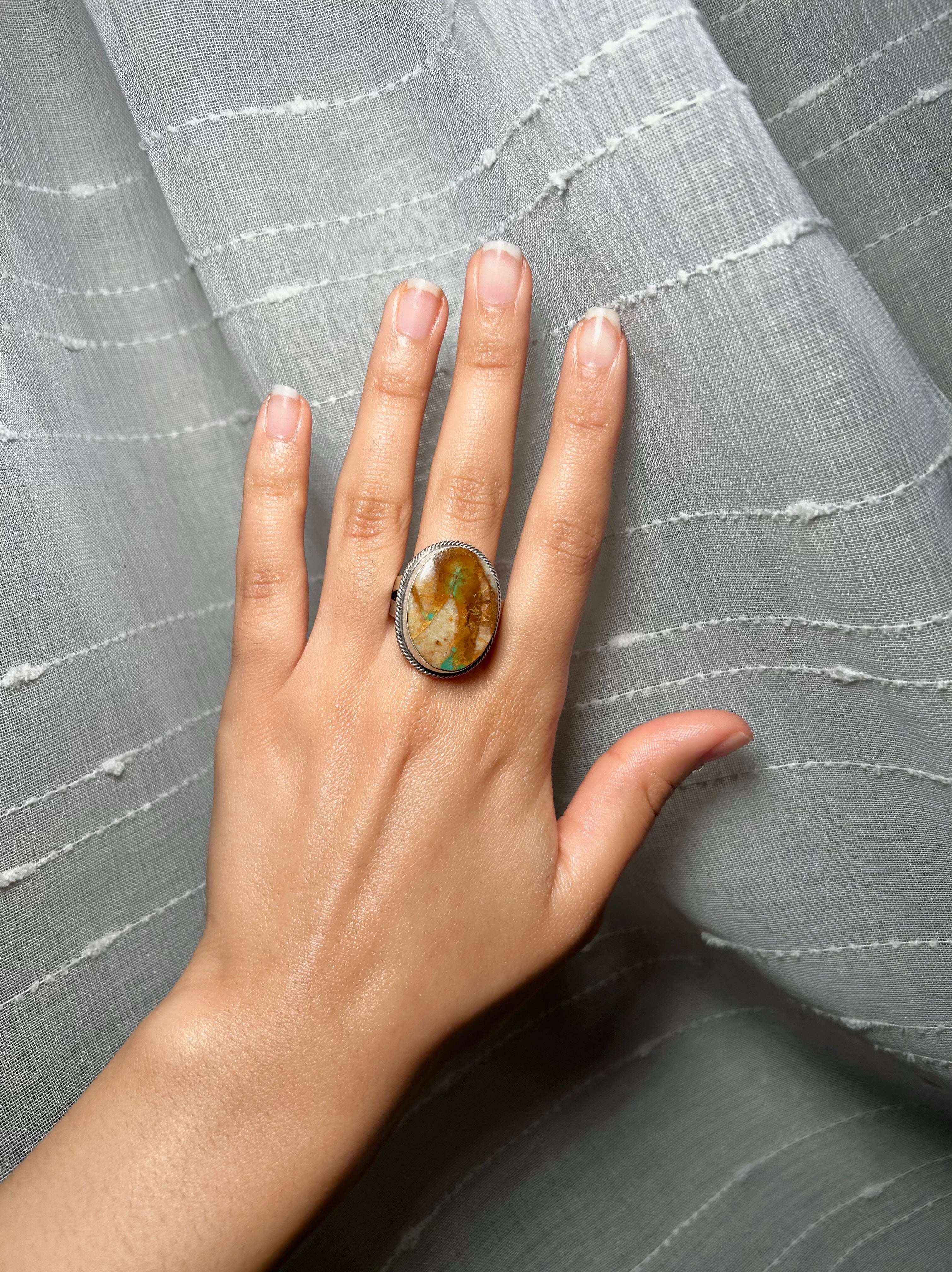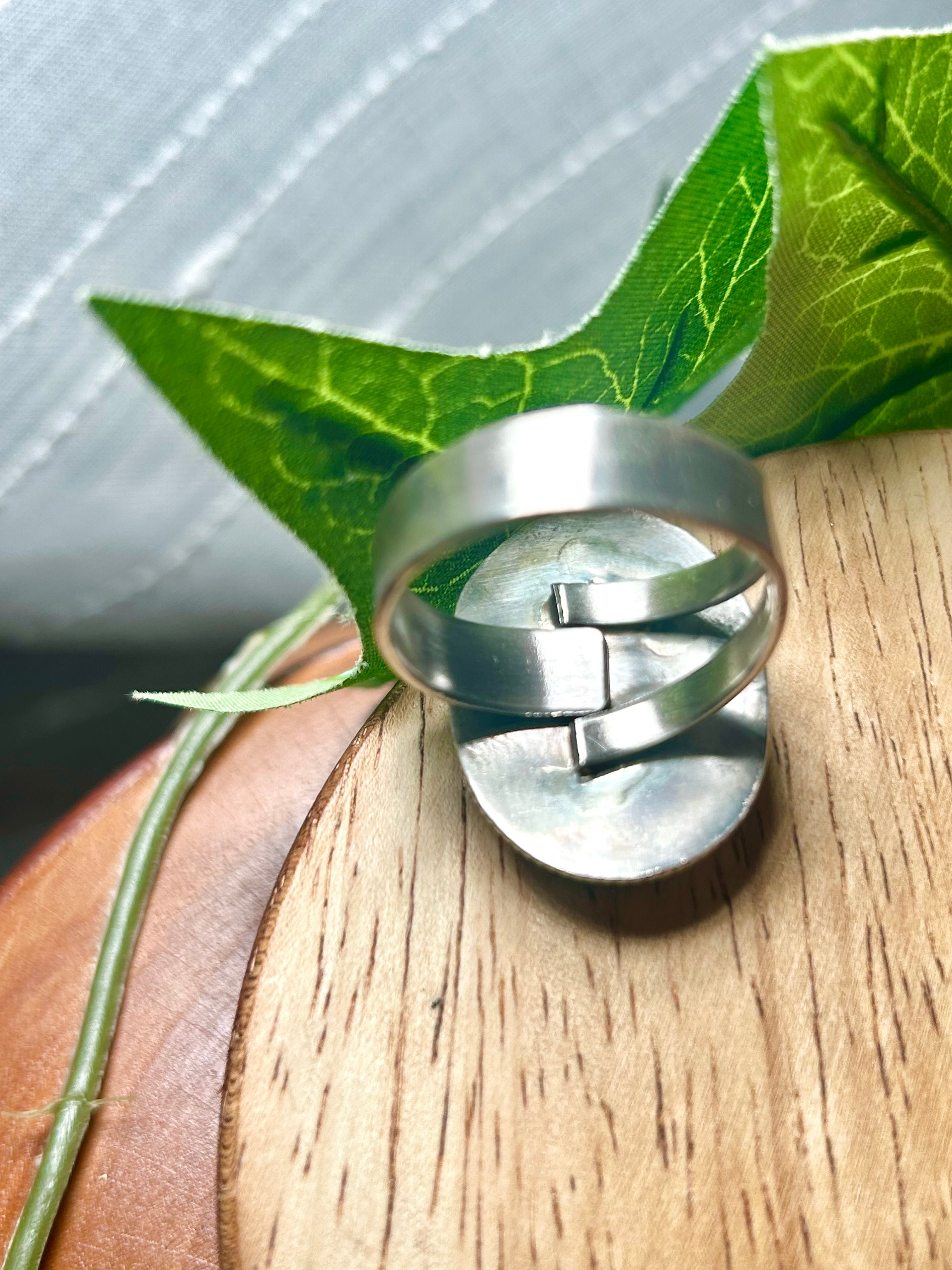 Antionette Martinez Boulder Turquoise & Sterling Silver Adjustable Ring. It measures 1 1/8 inches long and 7/8 of an inch wide. Signed by the artist and stamped sterling silver.