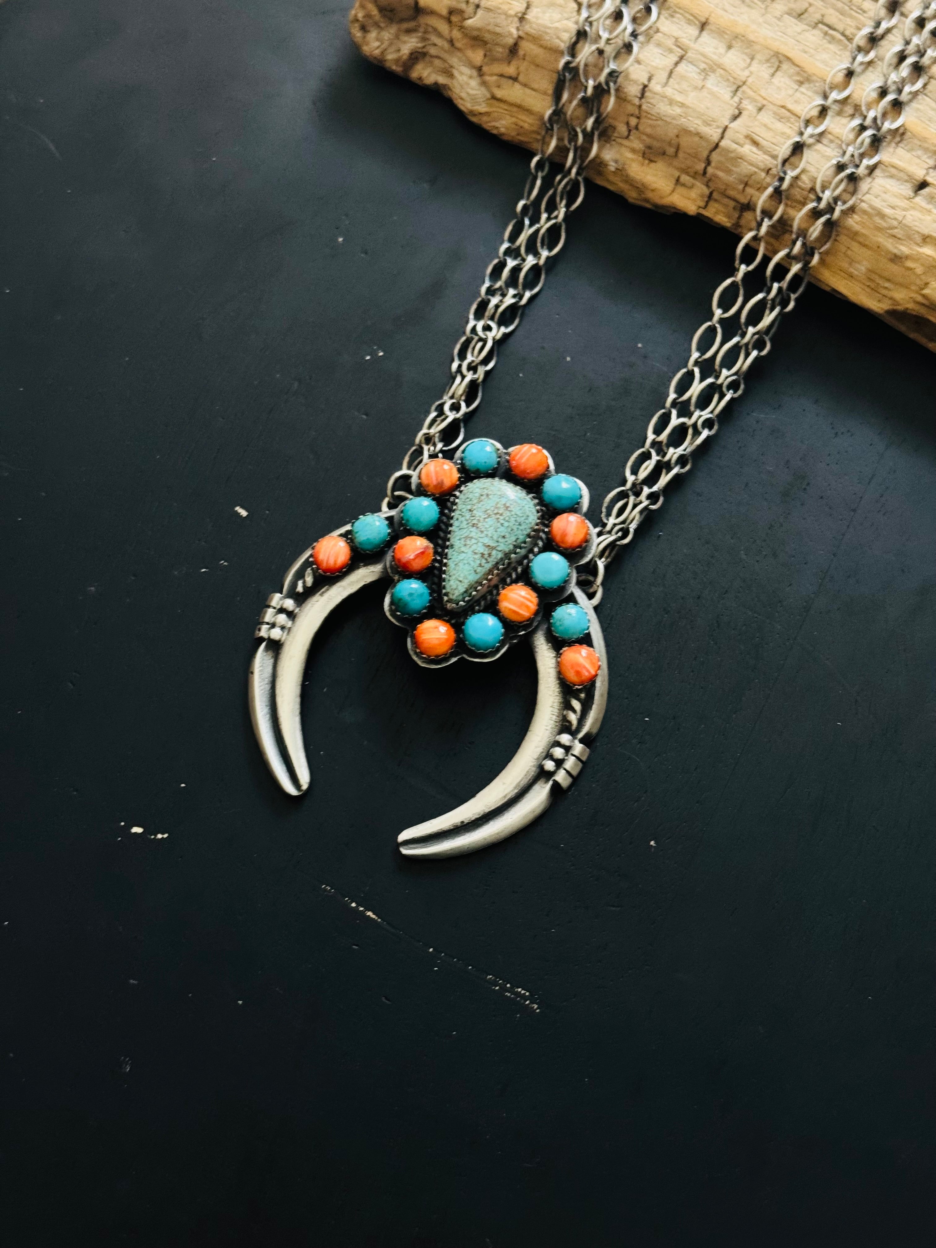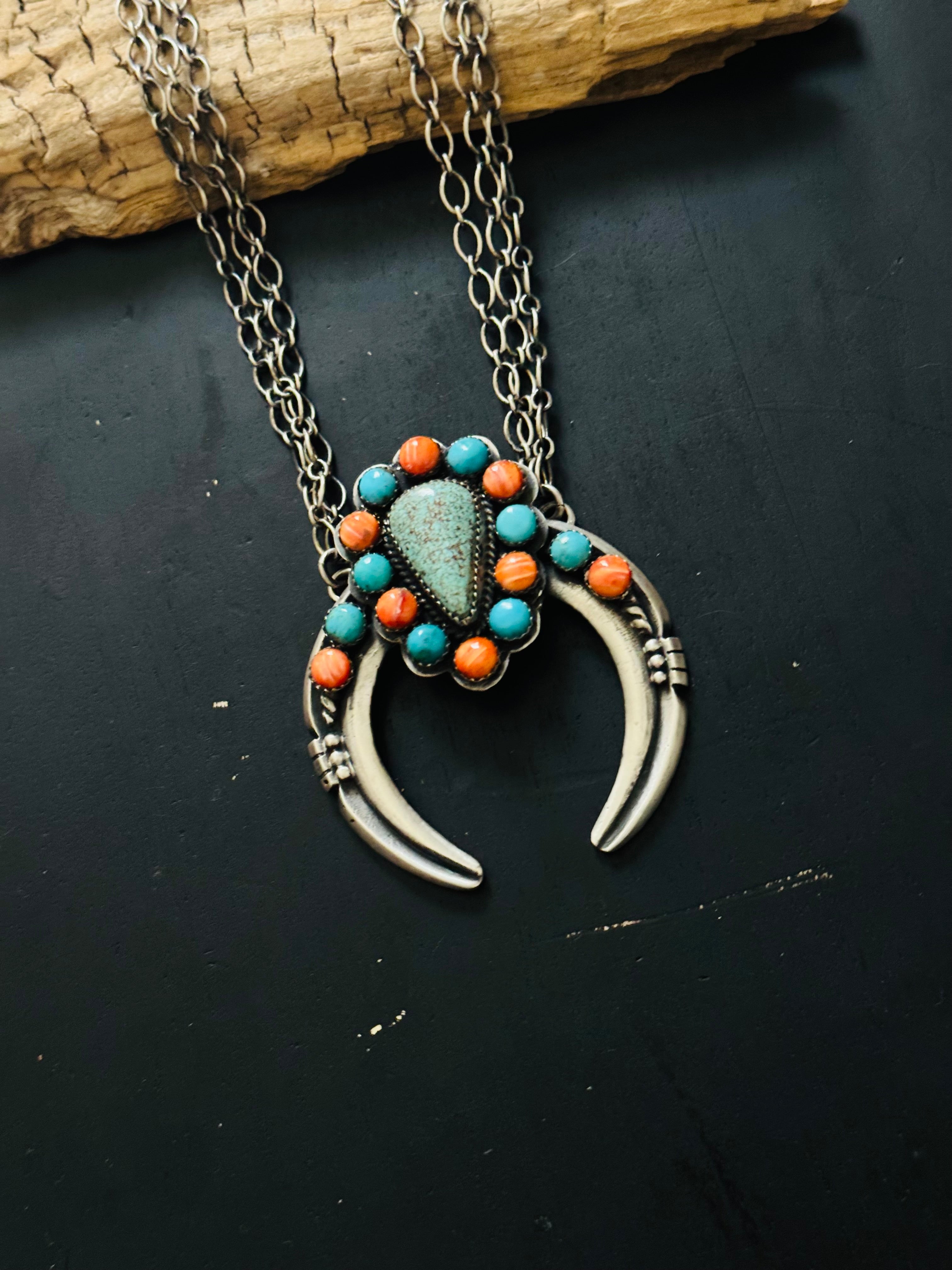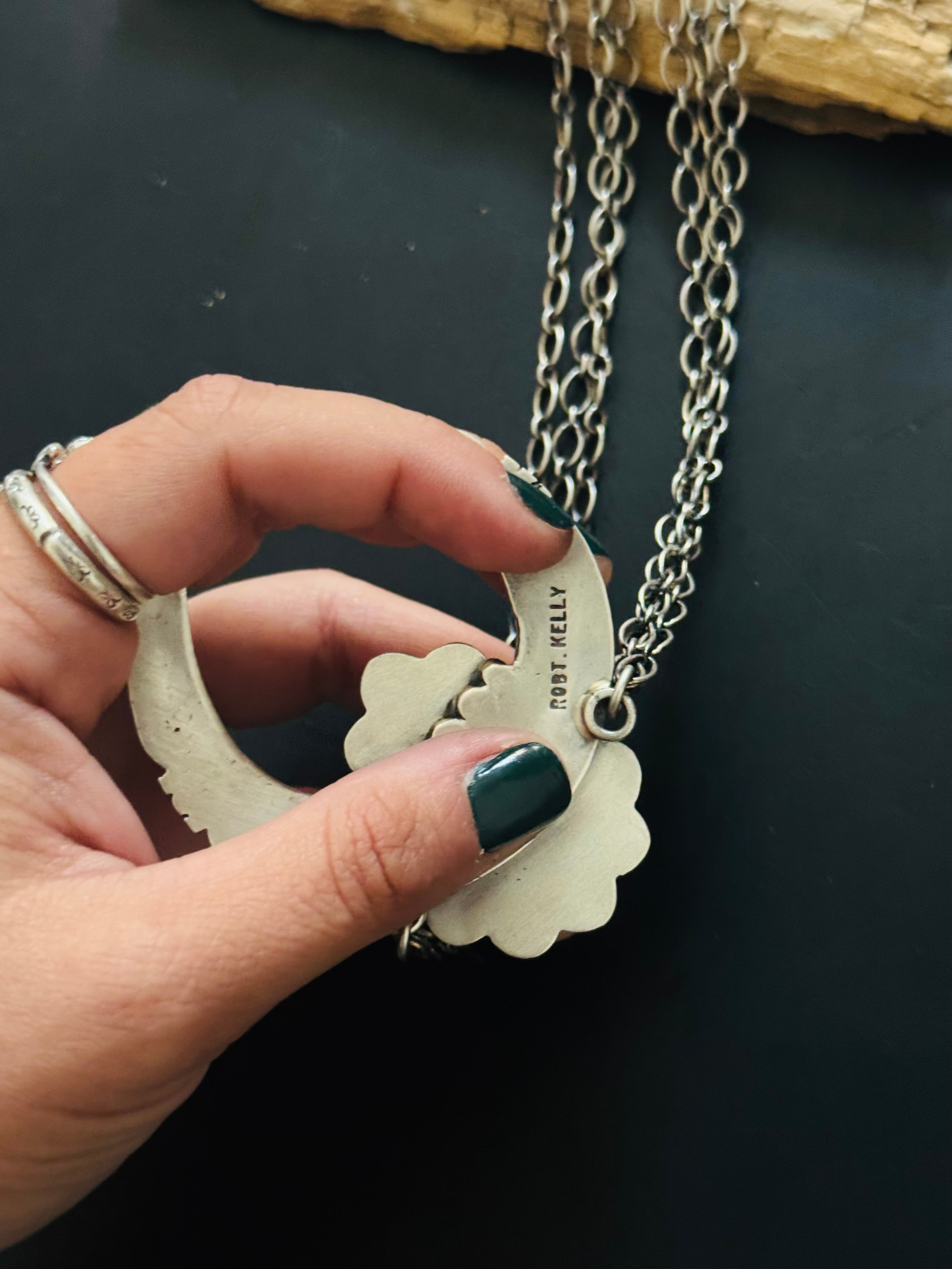 Robert Kelly Multi Stone & Sterling Silver Naja Cluster Necklace. It measures 25 inches long with hang while the chain measures 21 inches long. Signed by the artist and stamped sterling silver.