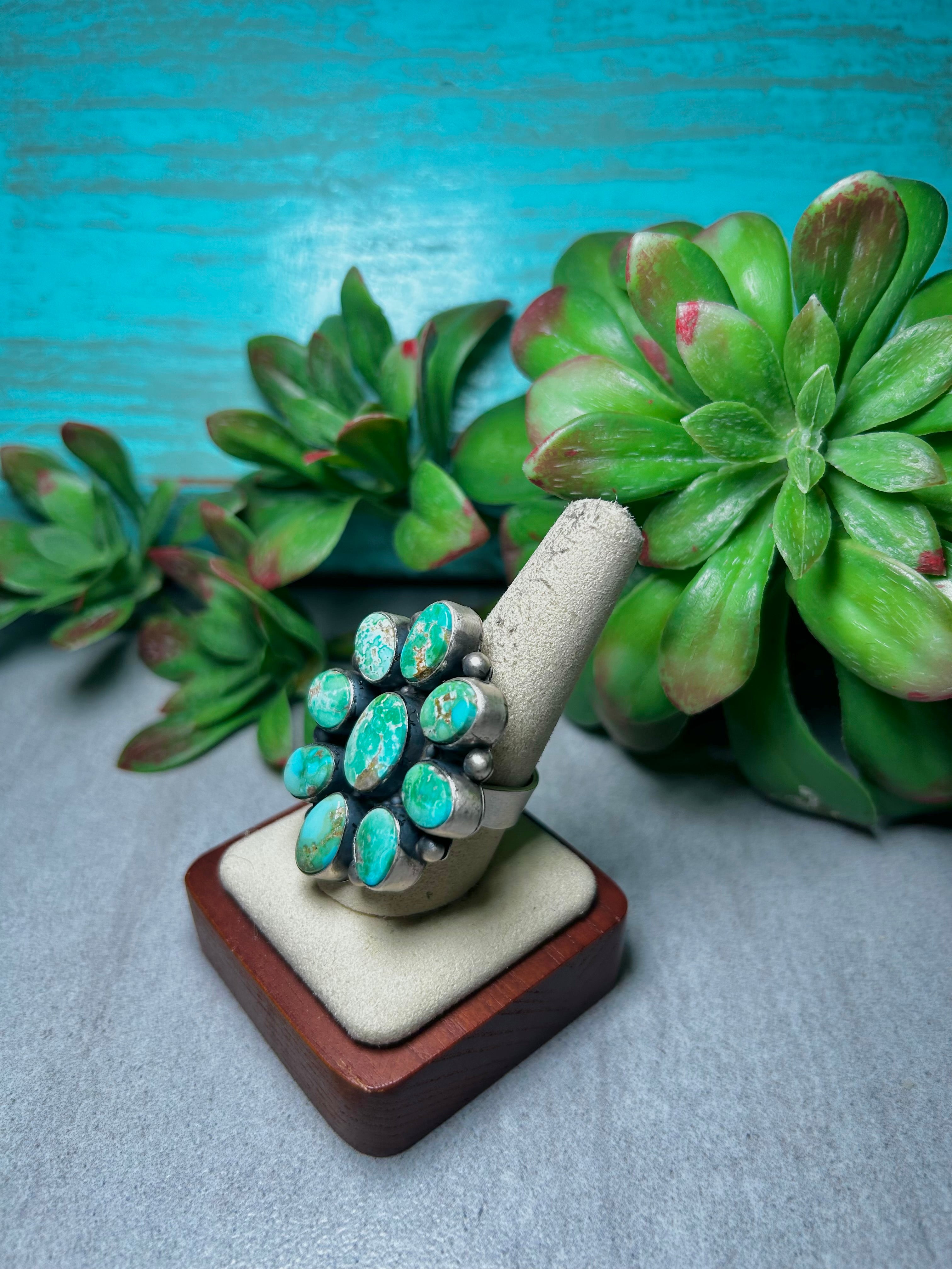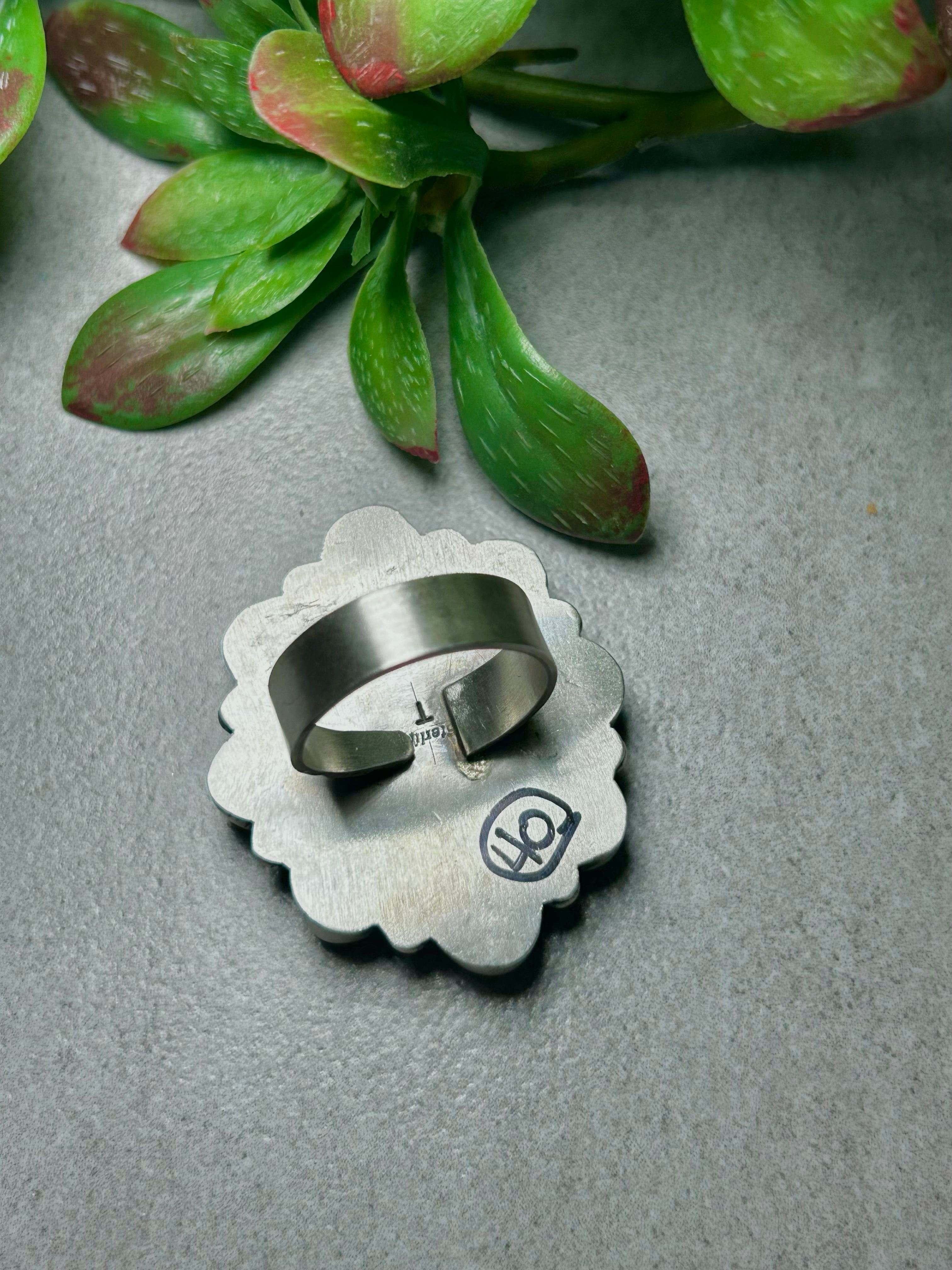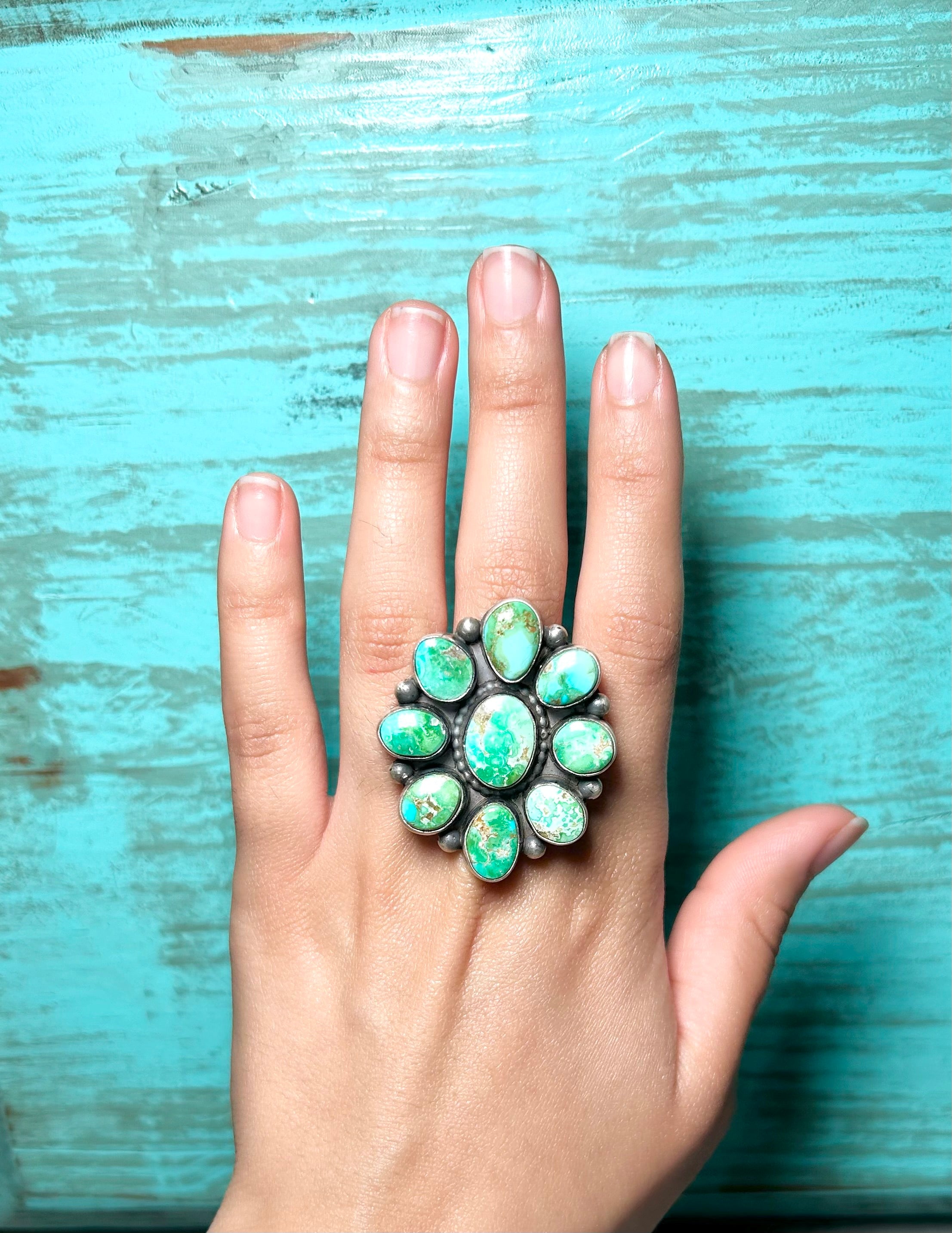 Timothy Yazzie Sonoran Mountain Turquoise & Sterling Silver Cluster Adjustable Ring. It measures 1 5/8 inches long and 1 3/8 inches wide. Signed by the artist and stamped sterling silver.