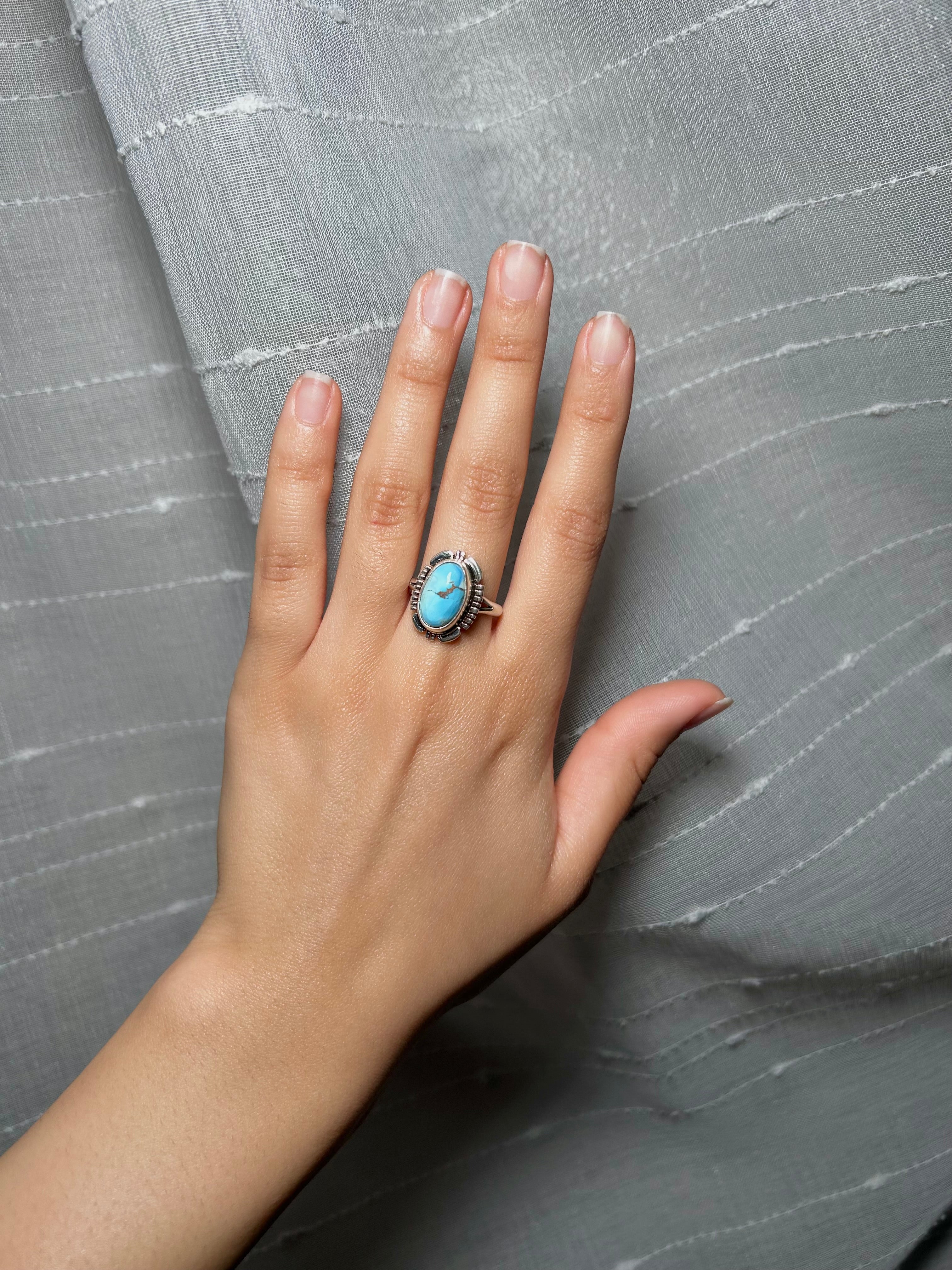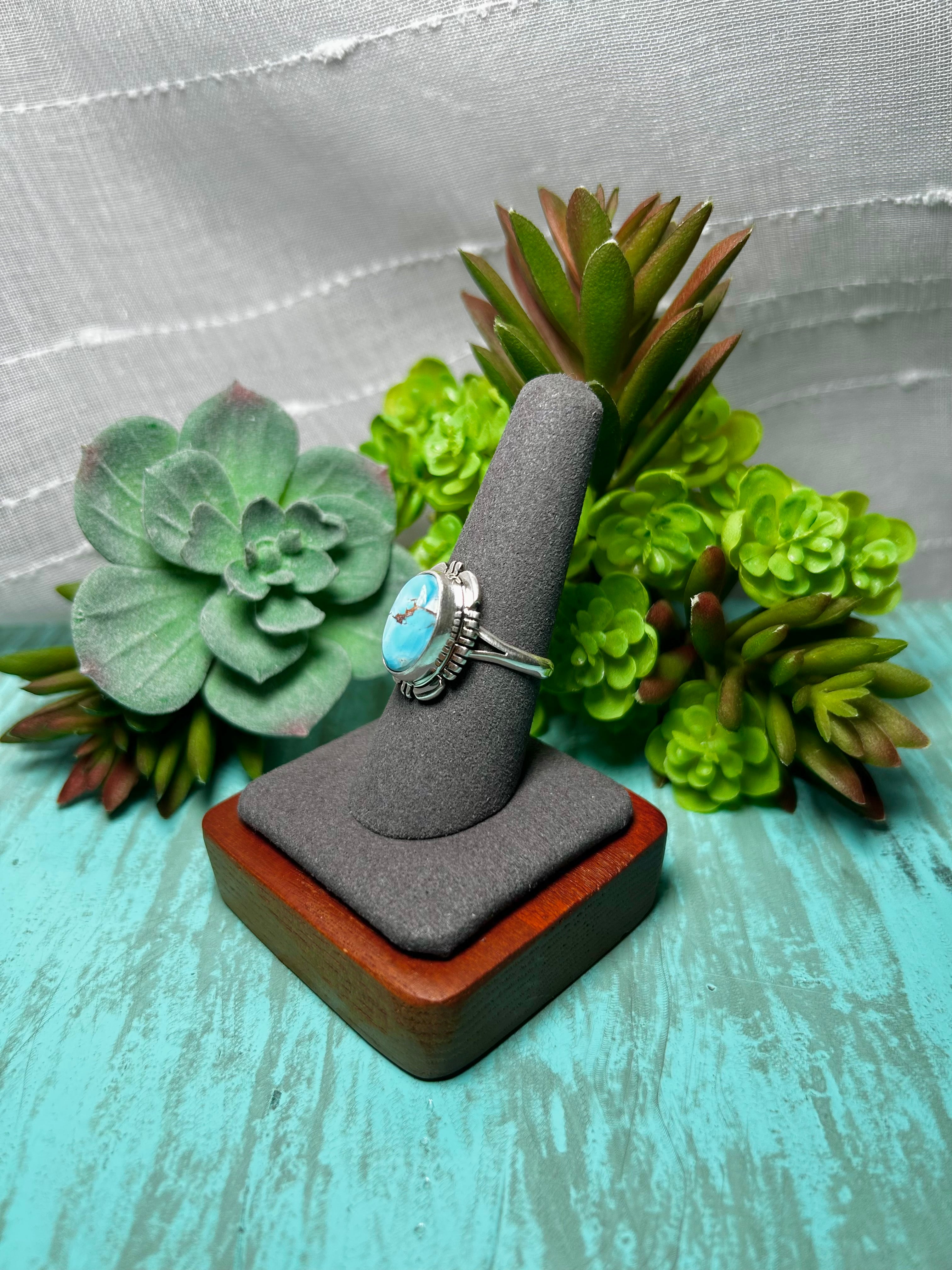 Arlene Yazzie Golden Hill Turquoise & Sterling Sliver Ring Size 8.5. It measures 7/8 of an inch long and 3/4 of an inch wide. Signed by the artist and stamped sterling silver.