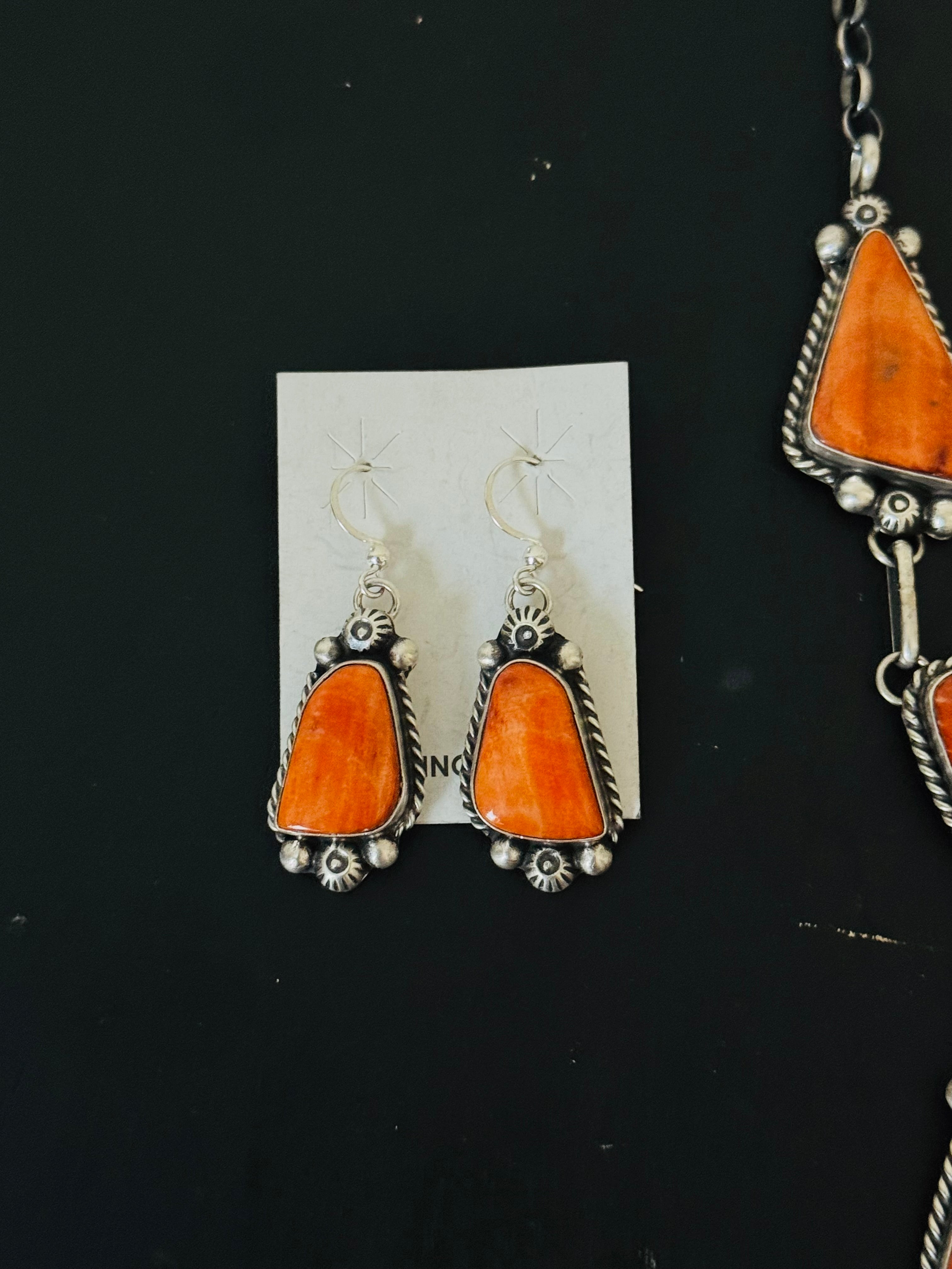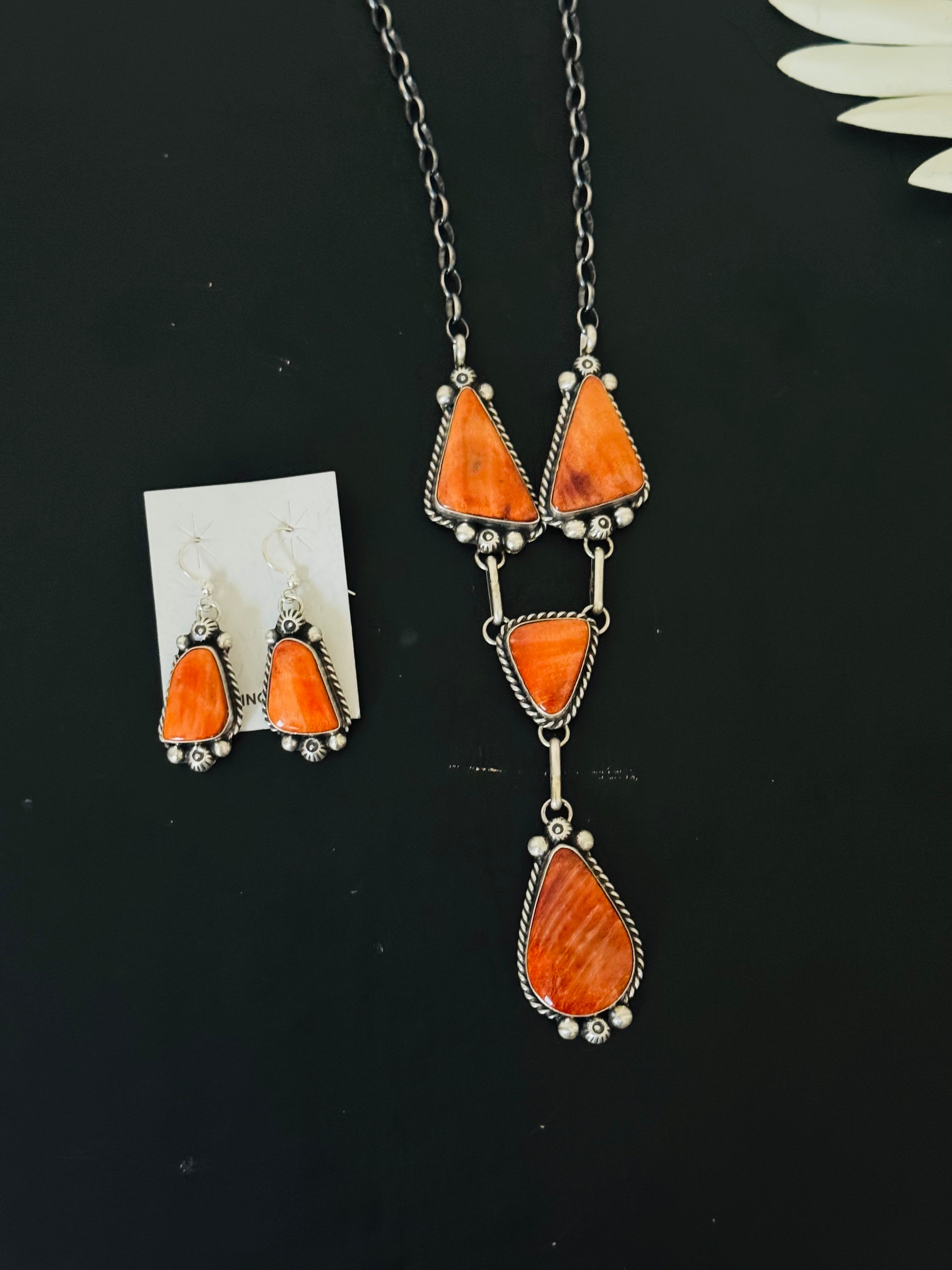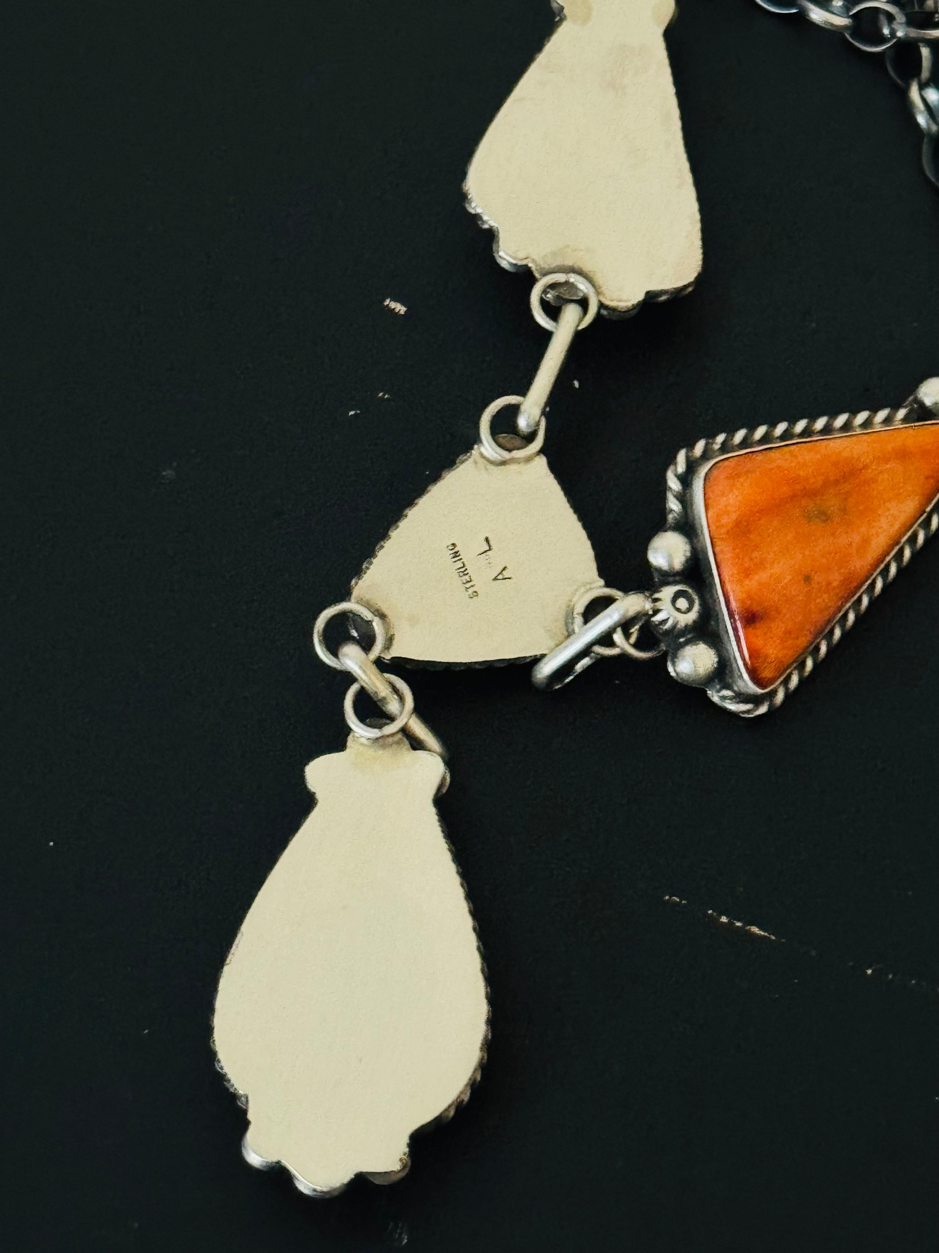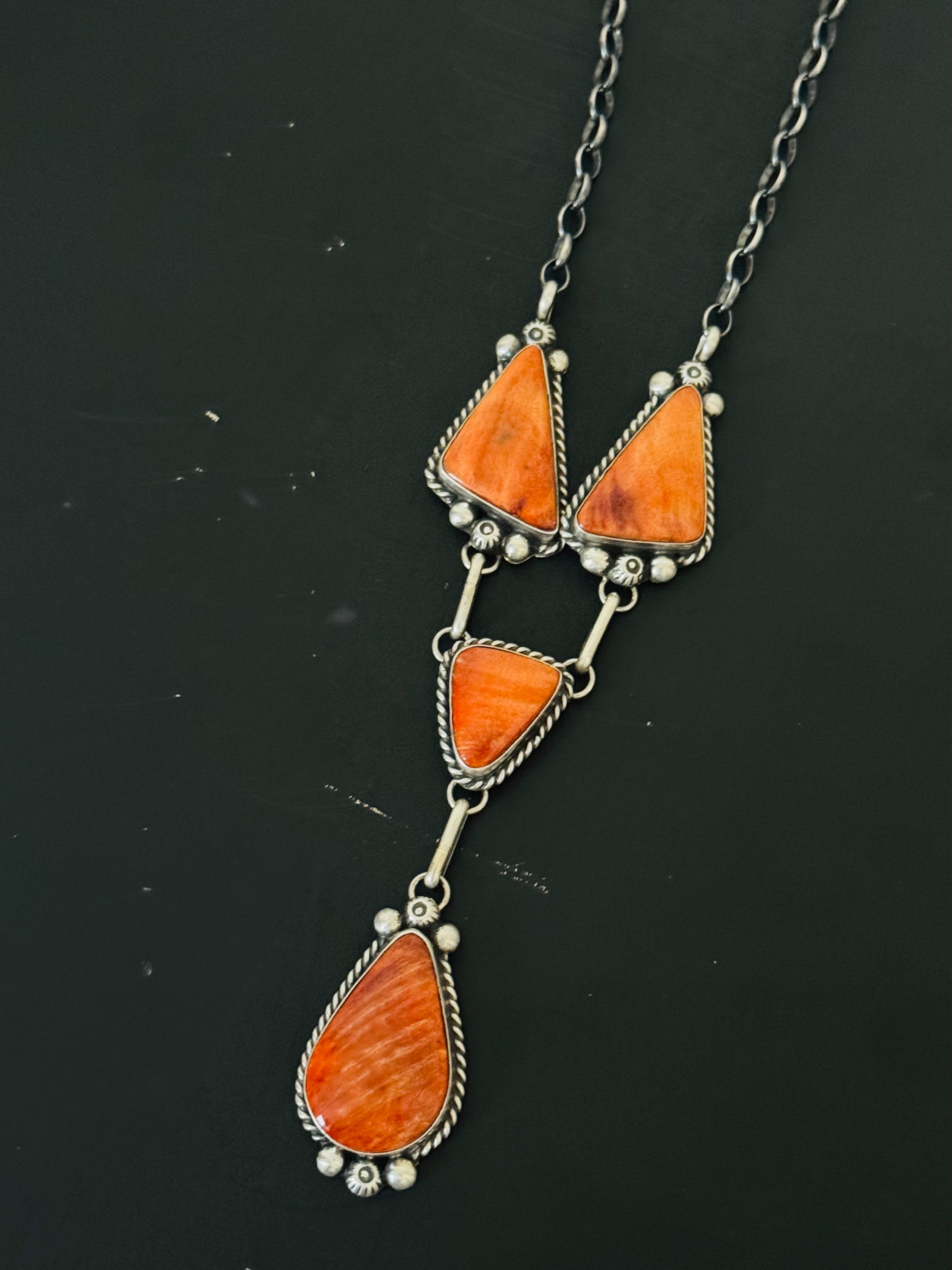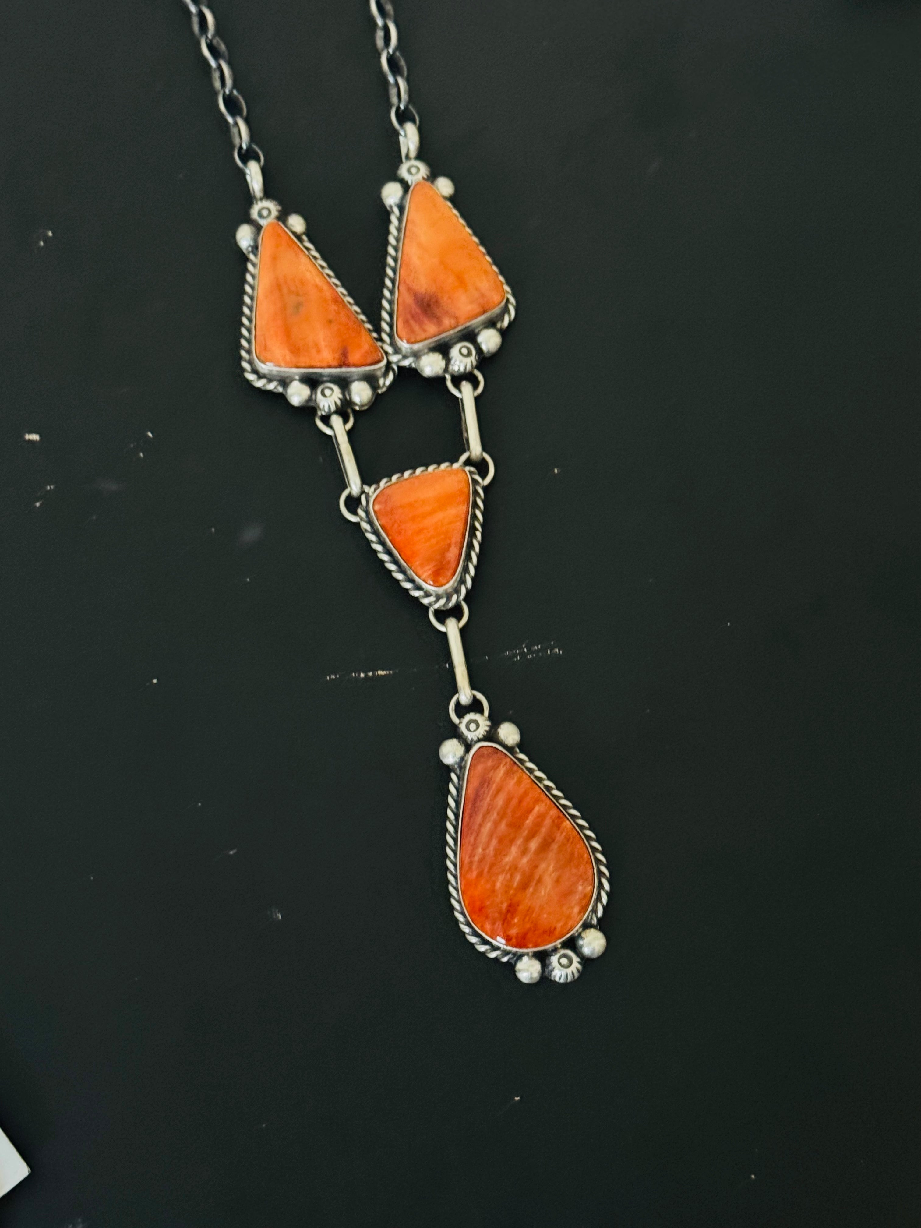 Augustine Largo Spiny Oyster & Sterling Silver Lariat Necklace. It measures 20 inches long with hang while the chain by itself measures 27 inches long. Signed by the artist and stamped sterling silver.