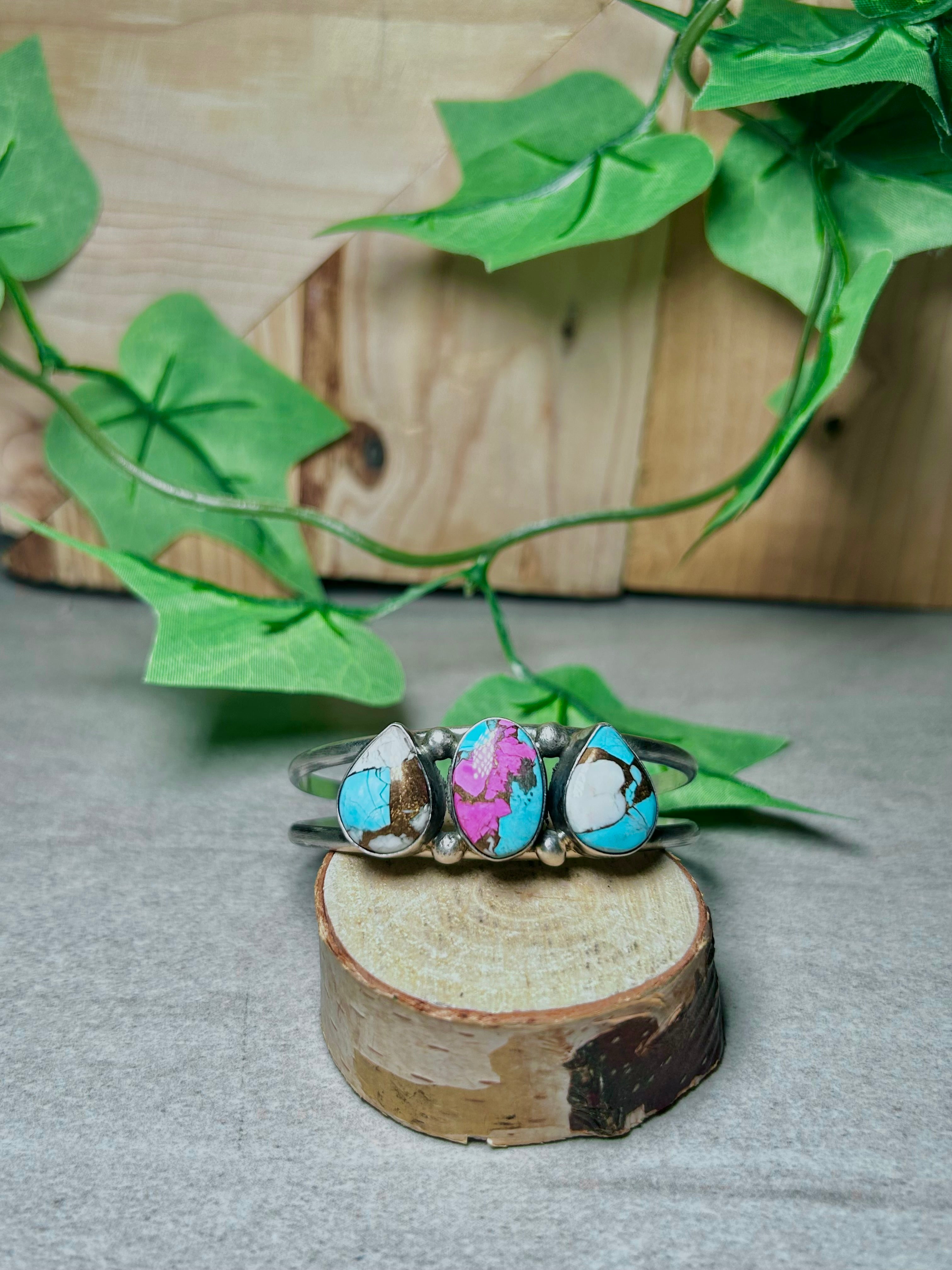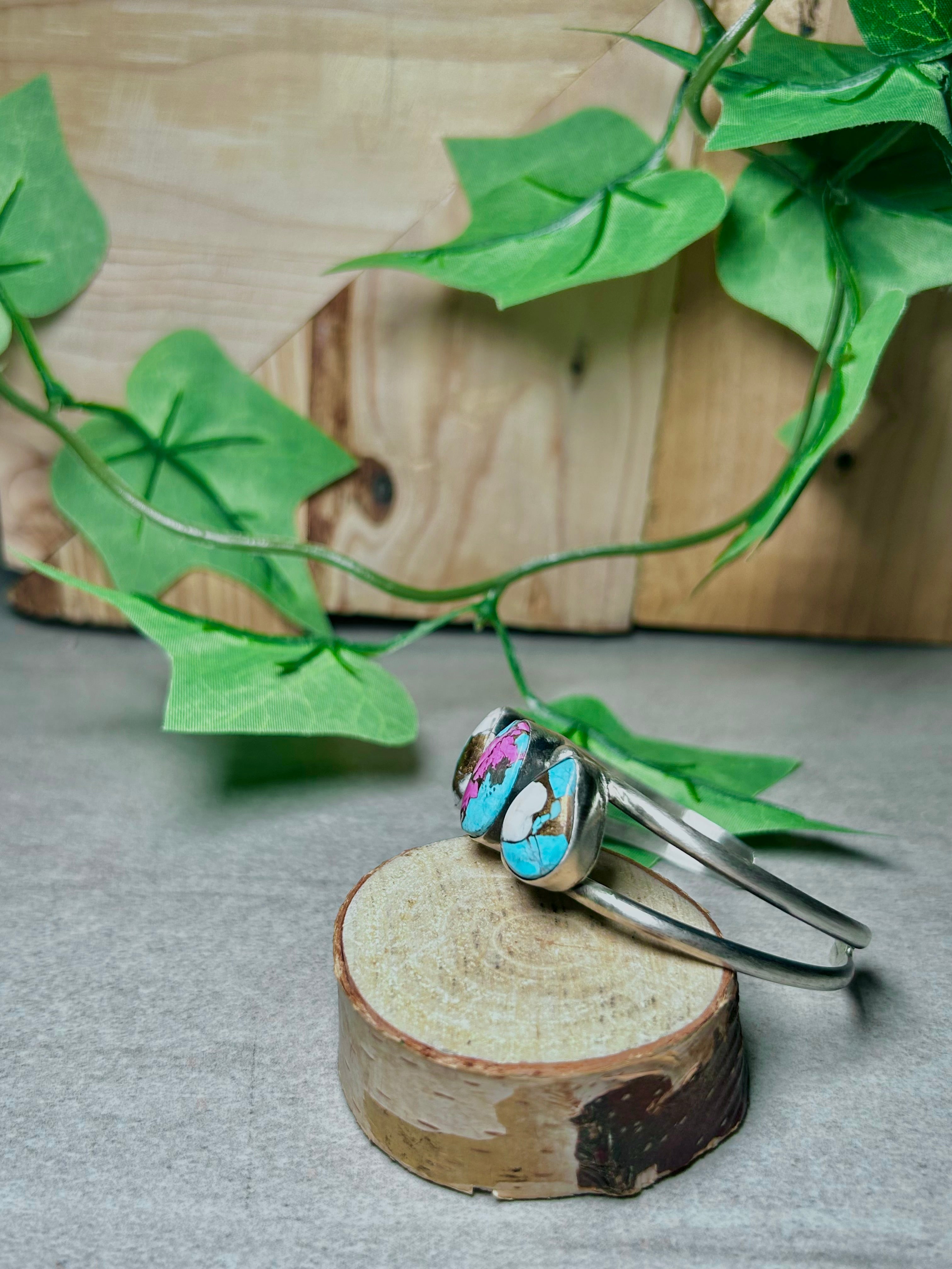 Augustine Largo Cotton Dahlia & Sterling Silver Cuff Bracelet. It measures 1 3/4 inches wide with an inside circumference of 5 1/2 inches and a gap of 1 inch Signed by the artist and stamped sterling silver.