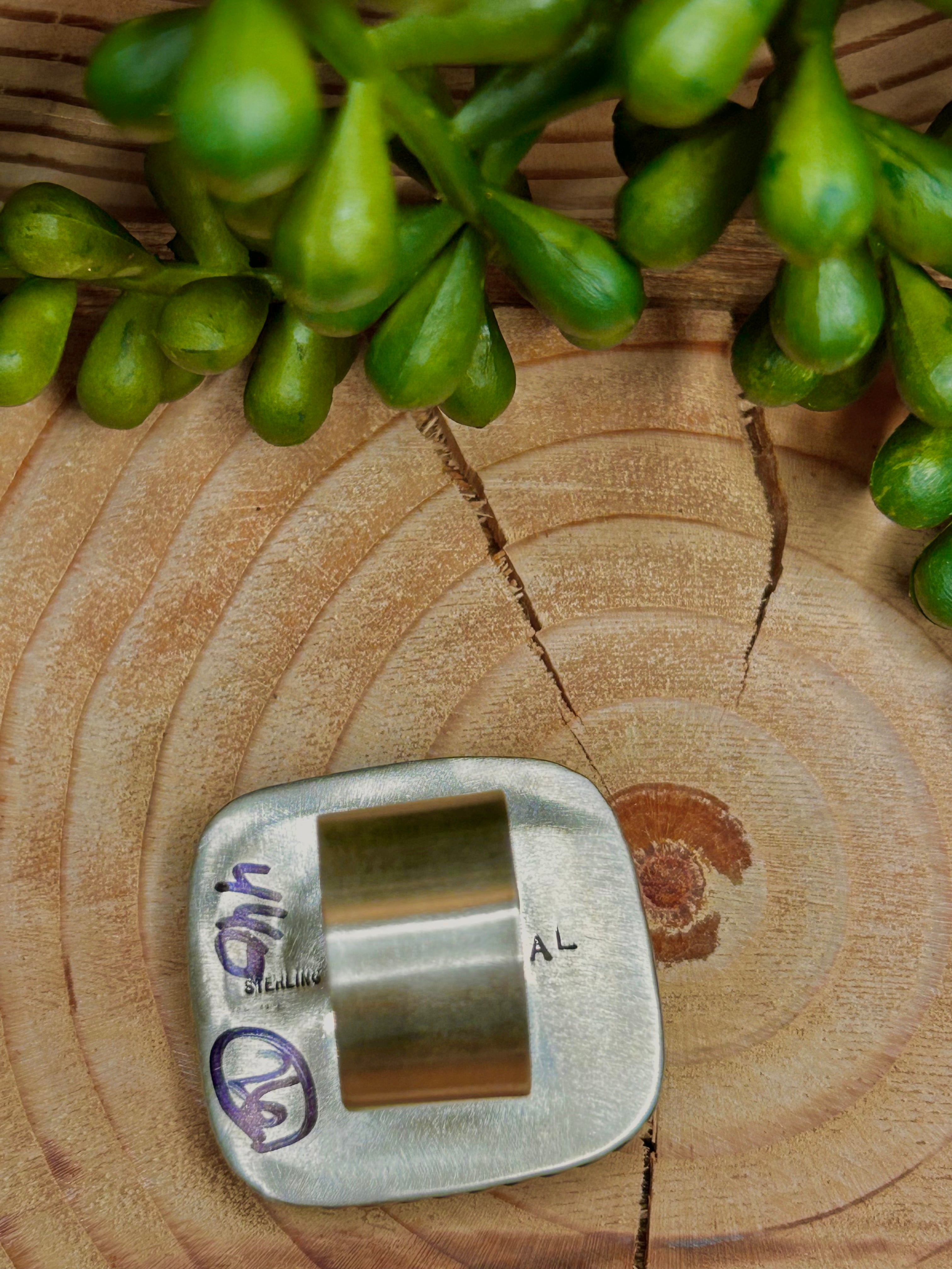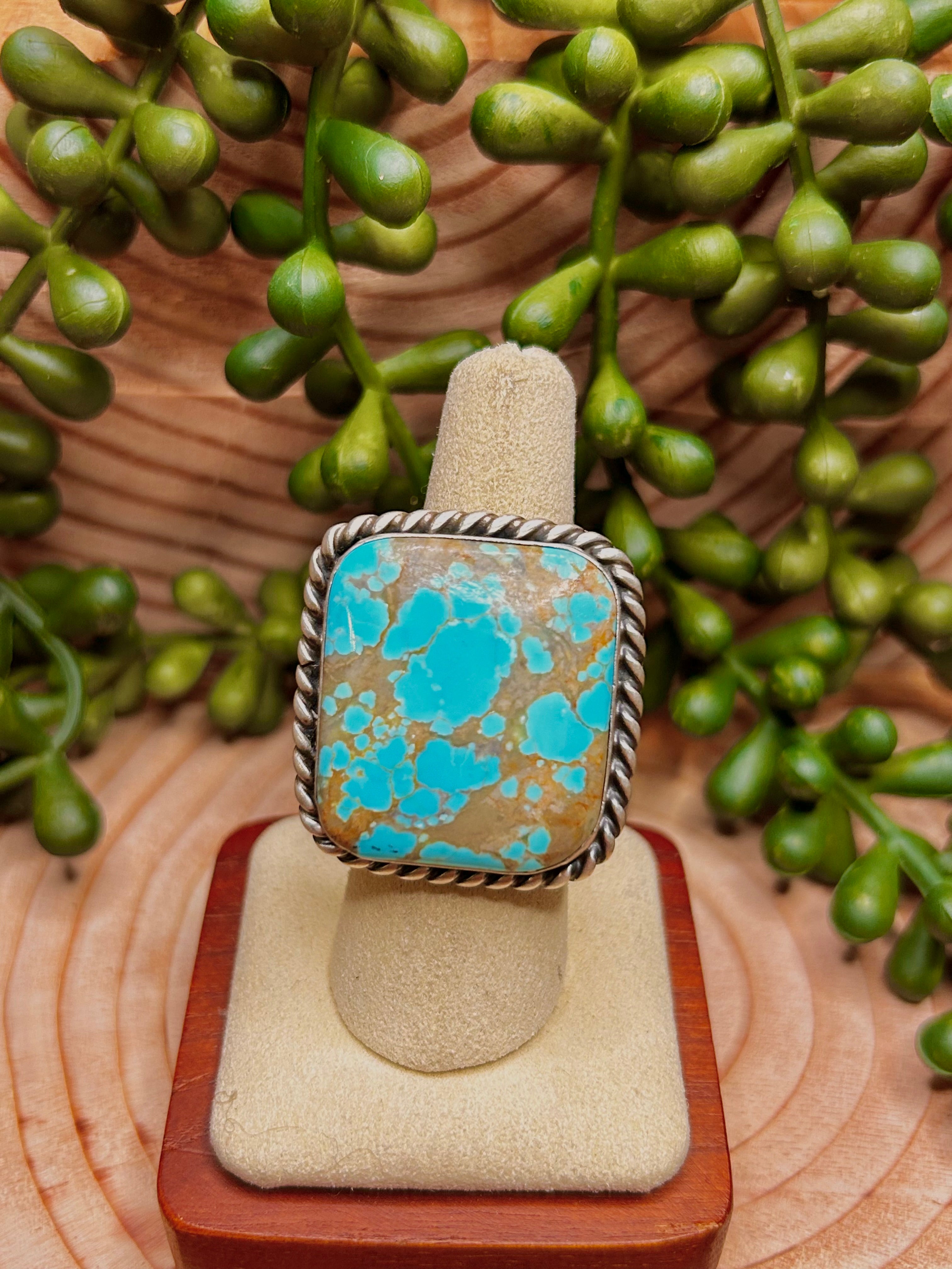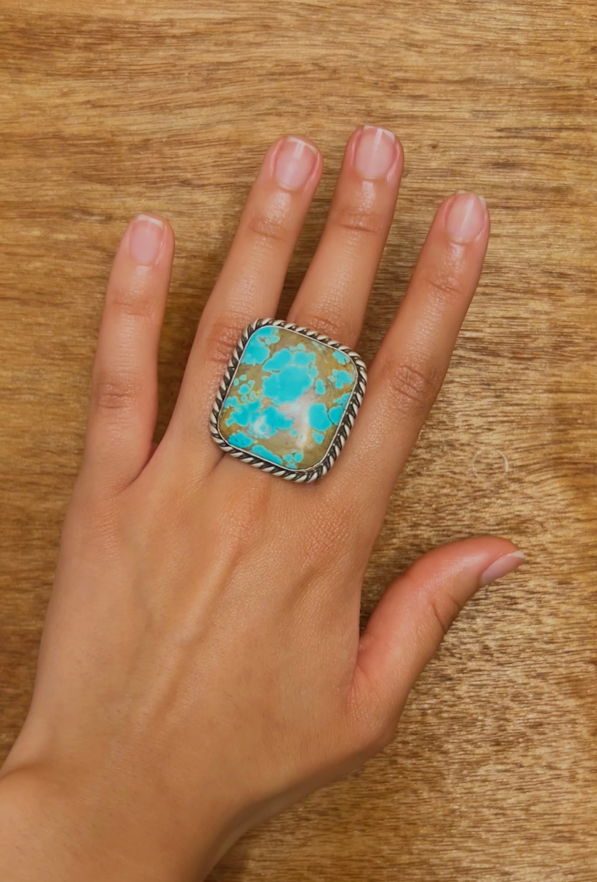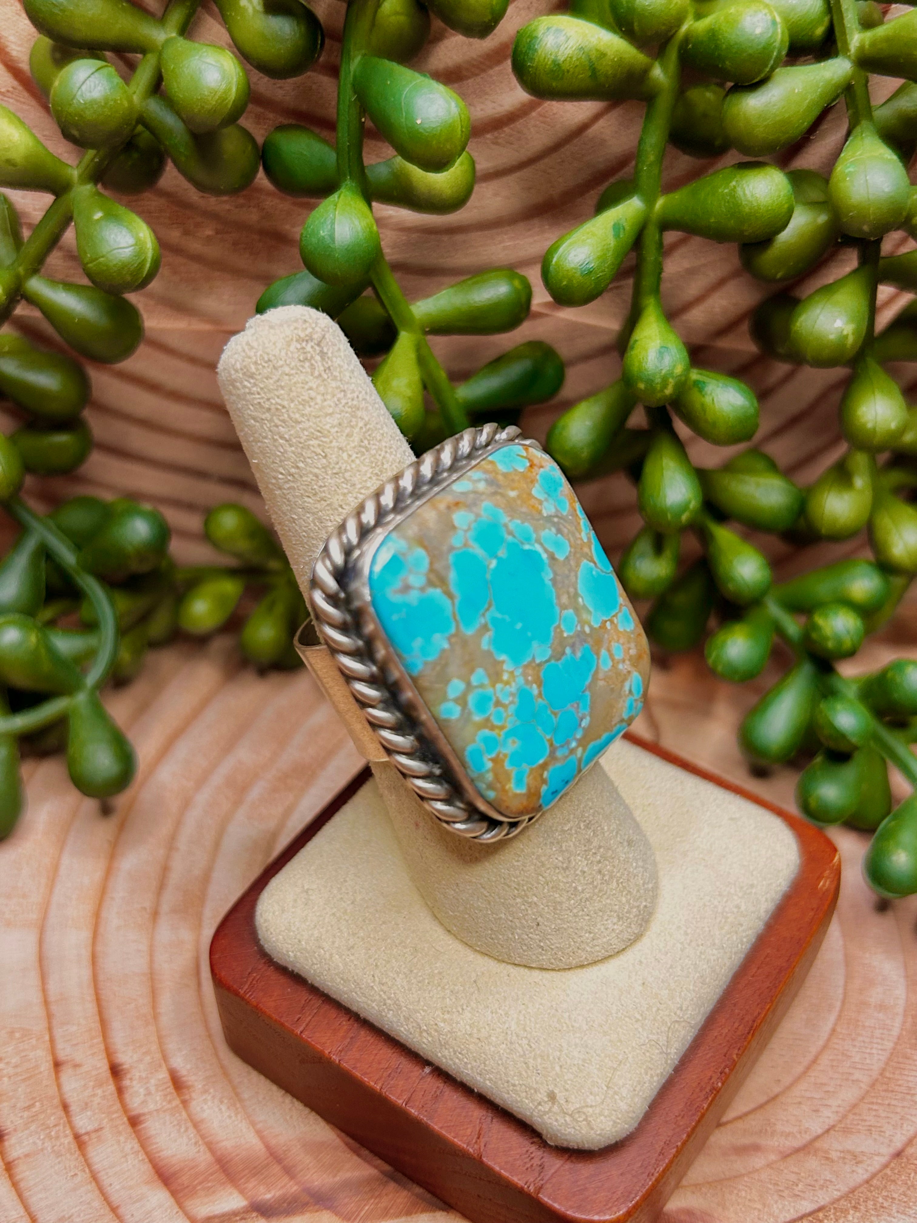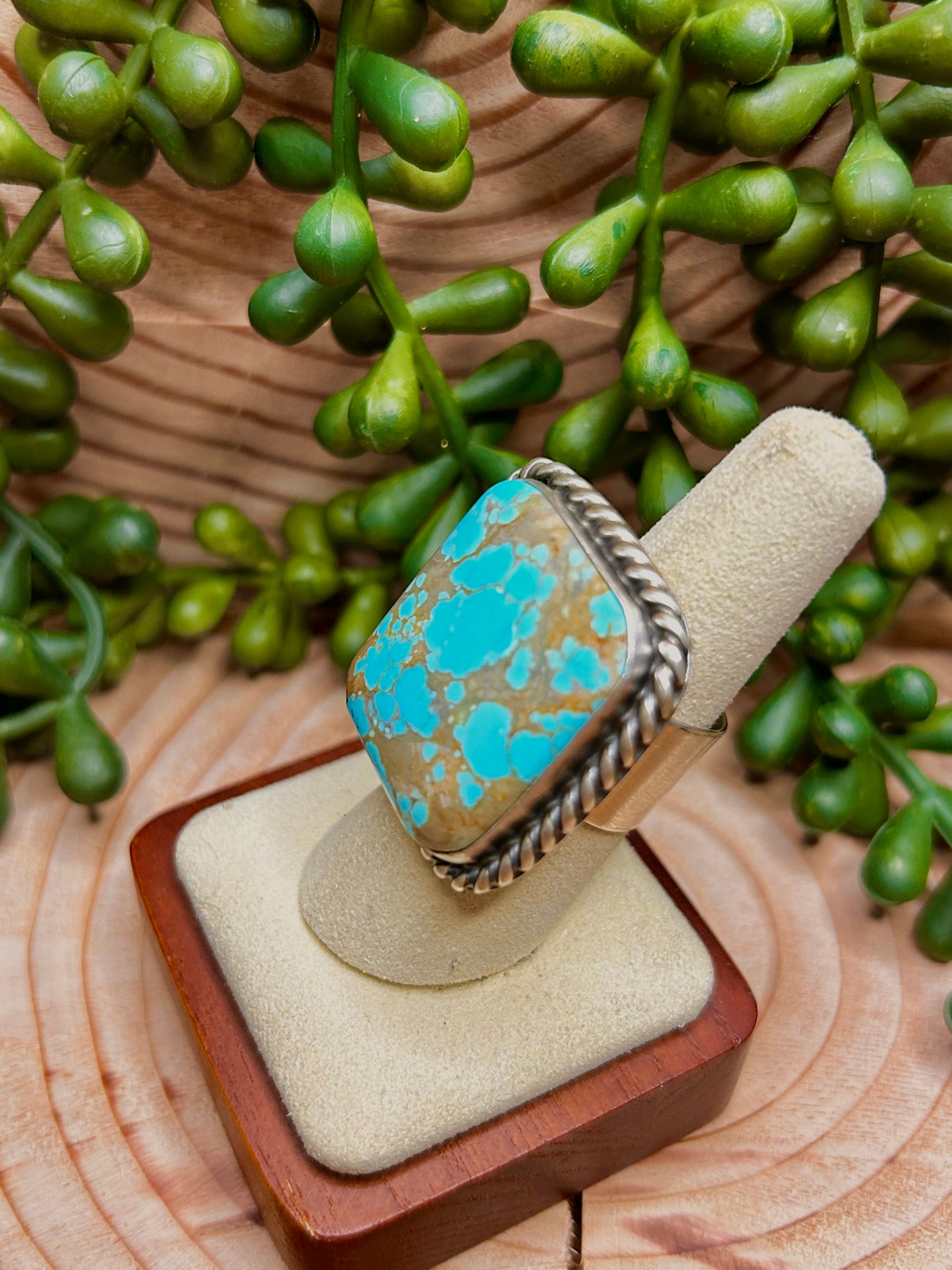Augustine Largo #8 Turquoise & Sterling Silver Adjustable Ring. It measures 1 3/8 inches long and 1 1/4 inches wide and Signed by the artist and stamped sterling silver.