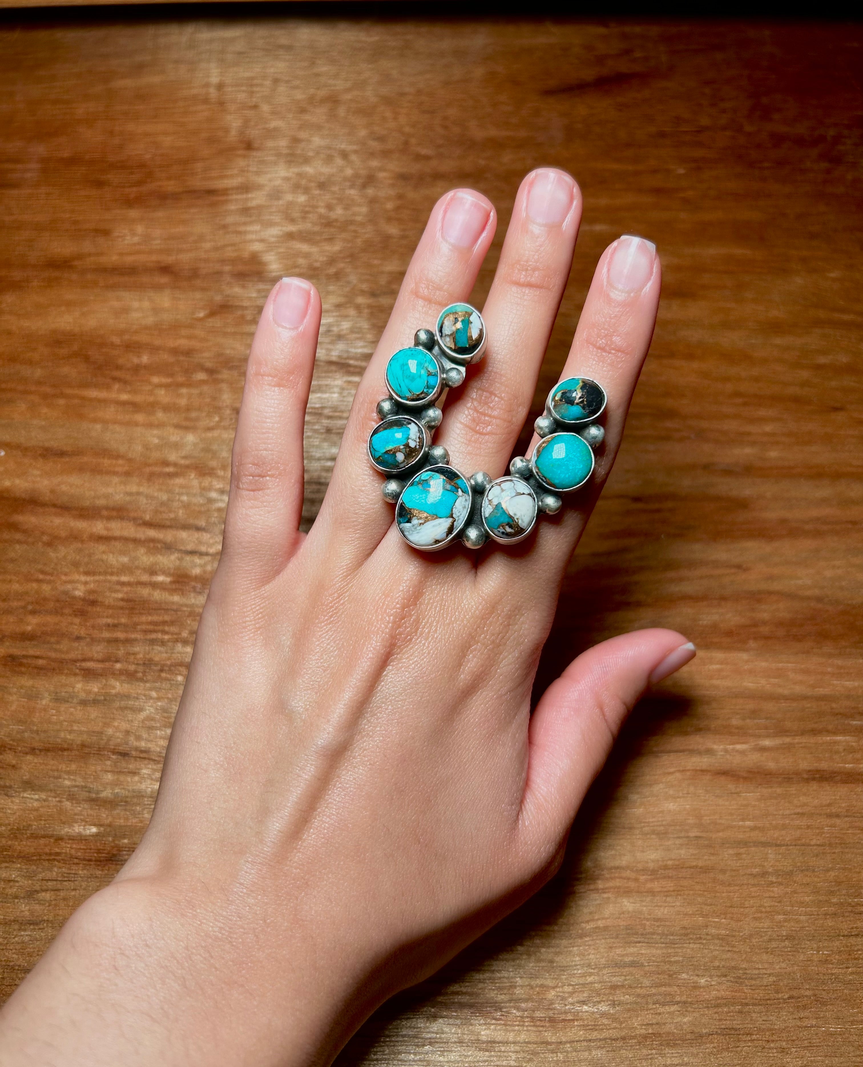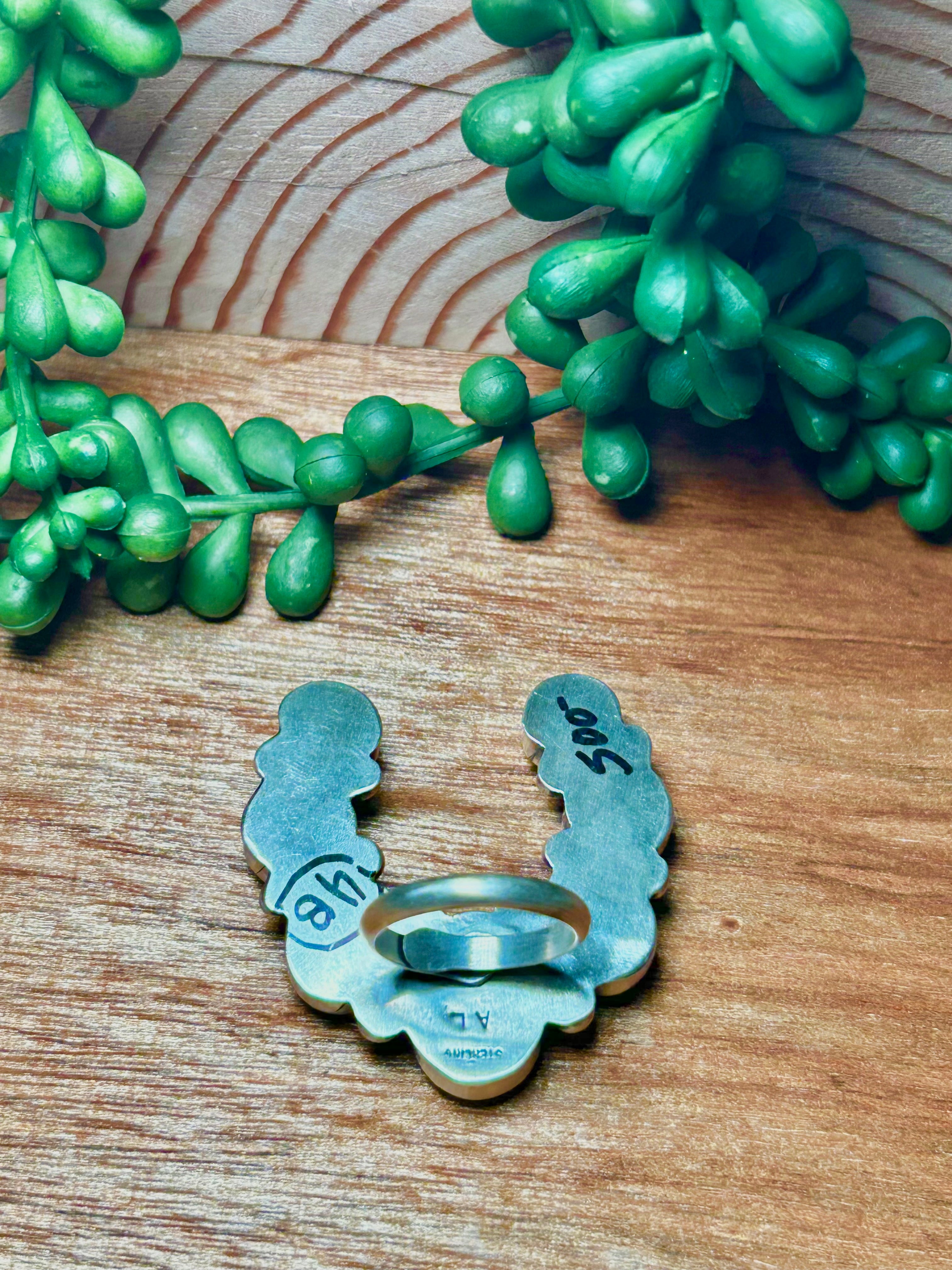 Augustine Largo Made Mohave Turquoise & Sterling Silver Adjustable Ring. It measures 1 7/8 inches long and 1 3/4 inches wide. Signed by the artist and stamped sterling silver.