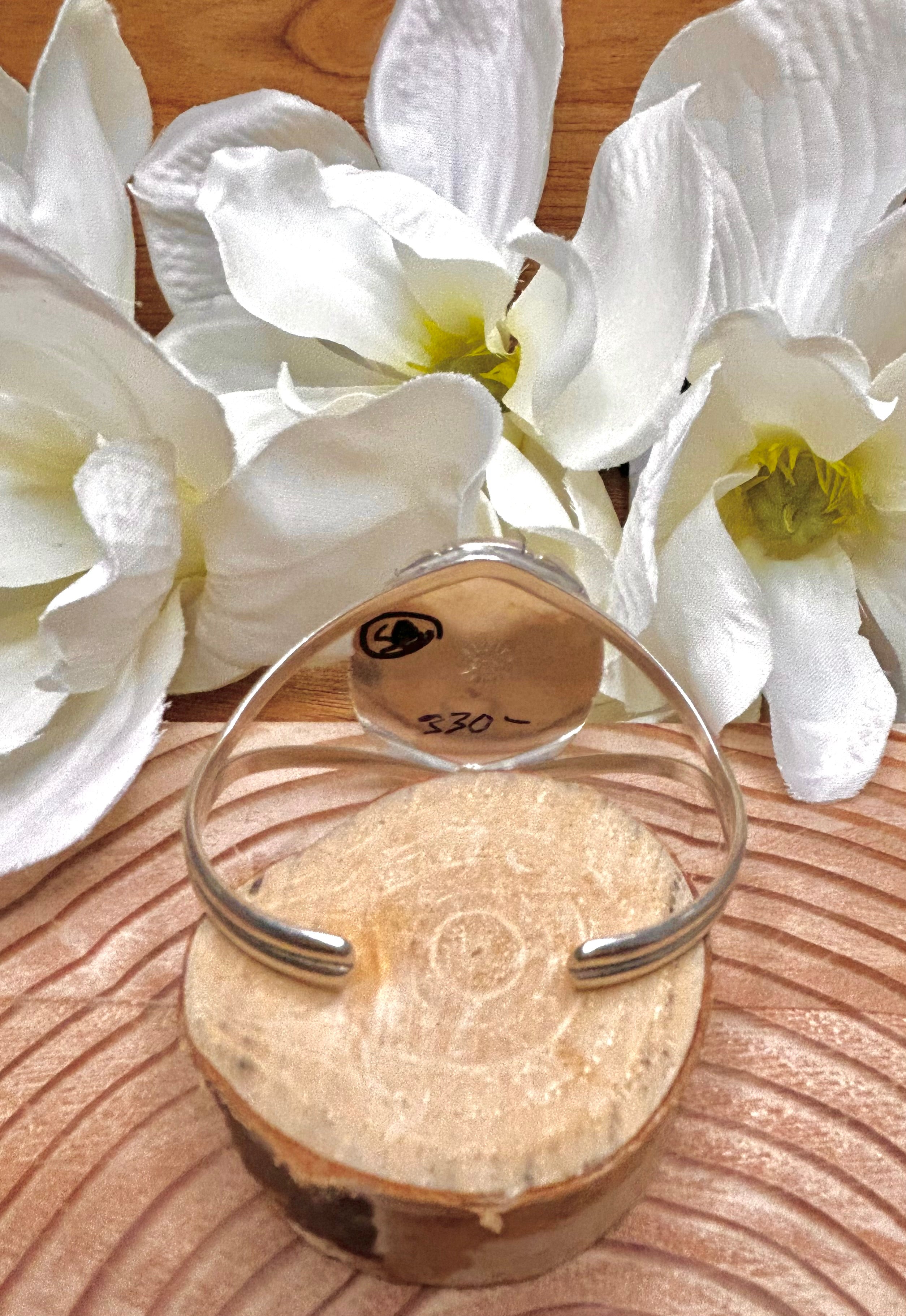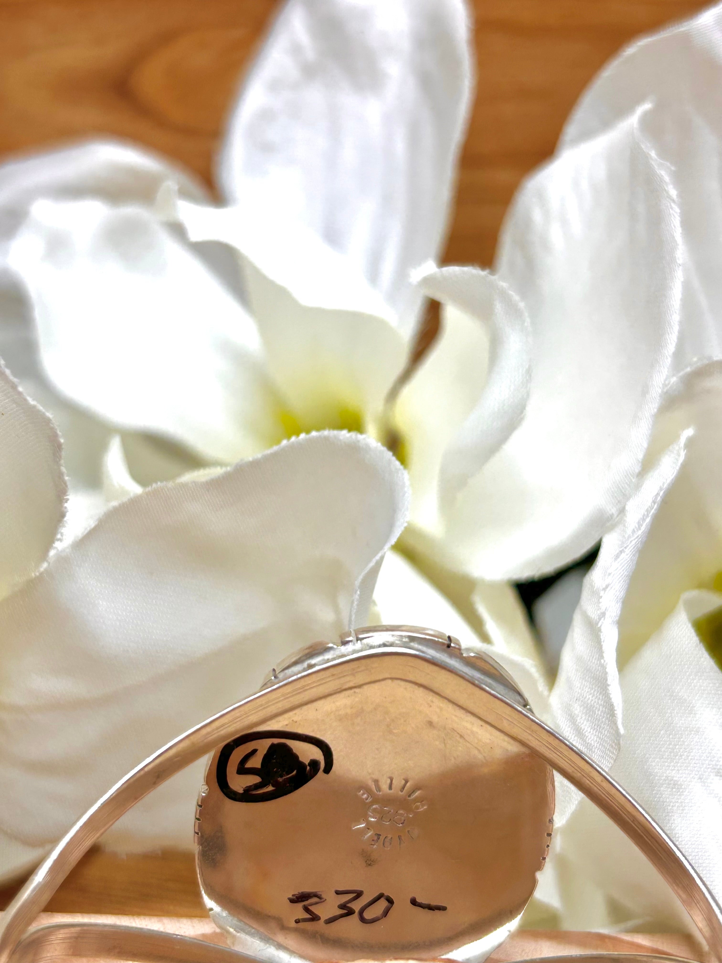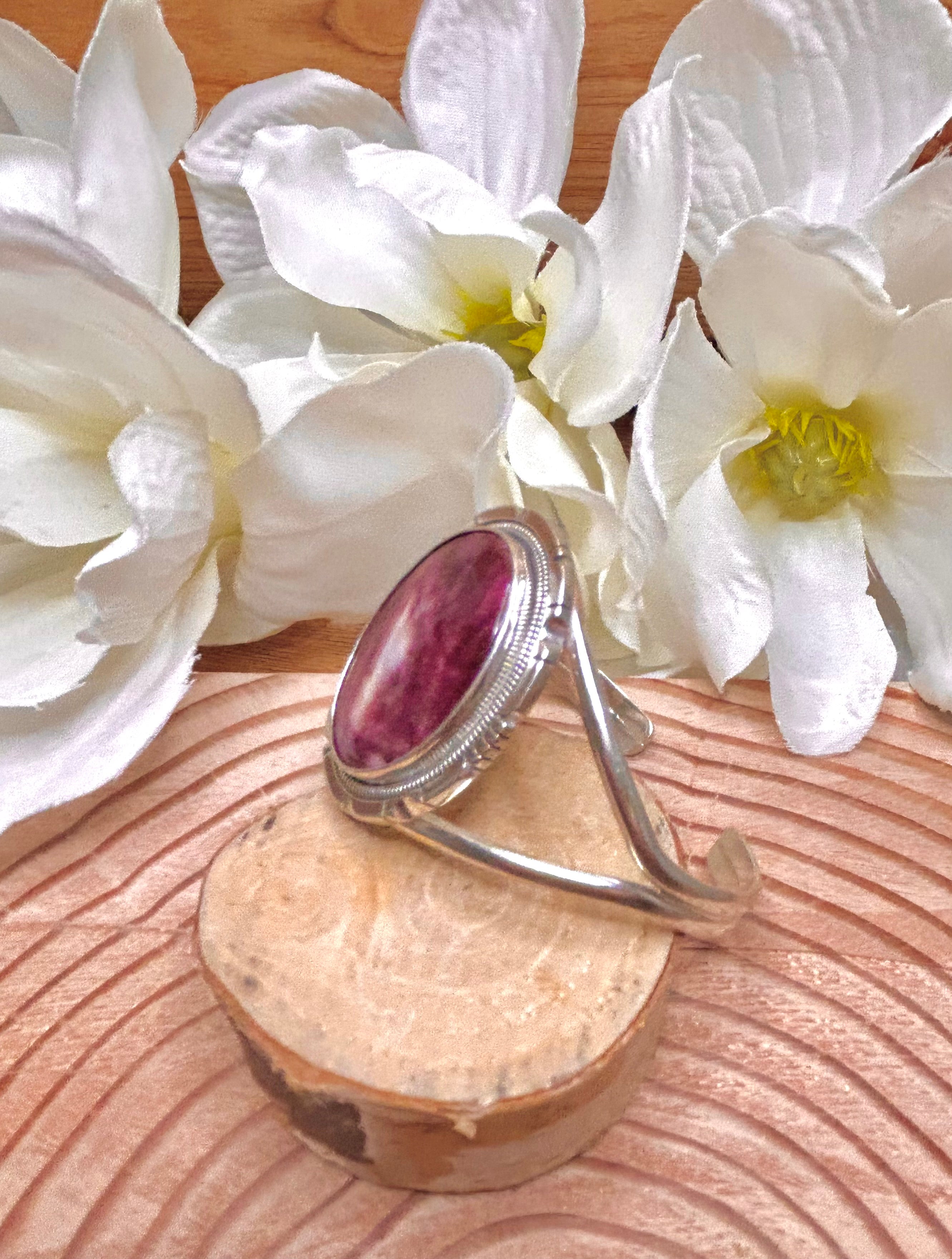 Wydell Billie Purple Spiny Oyster & Sterling Silver Cuff Bracelet. It measures 1 1/2 inches wide with an inside circumference of 5 inches and a gap of 1 inch. Signed by the artist and stamped sterling silver.