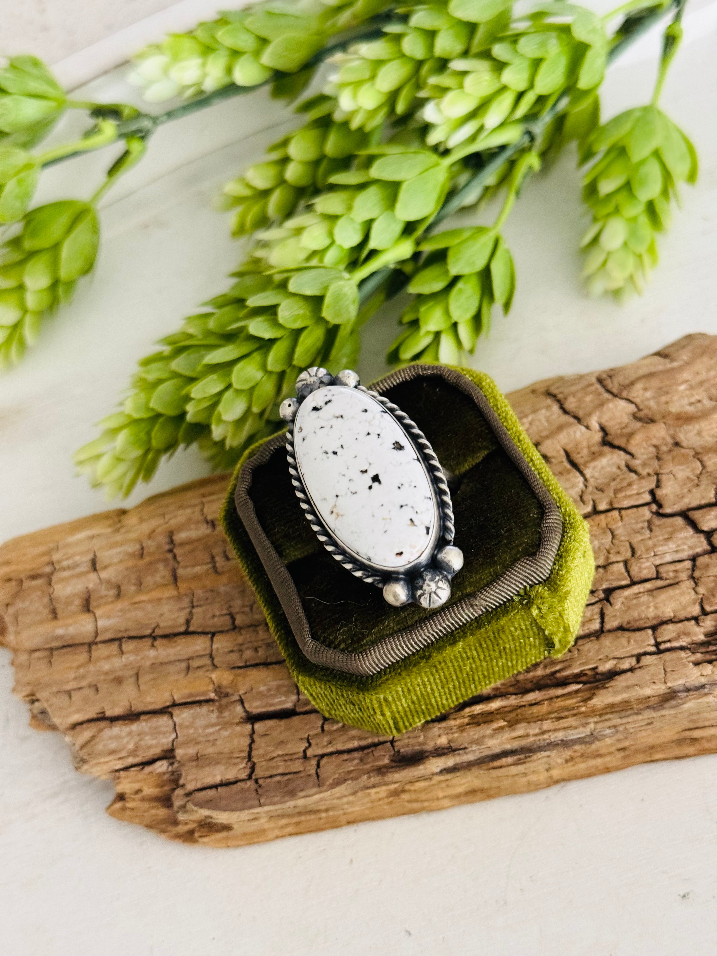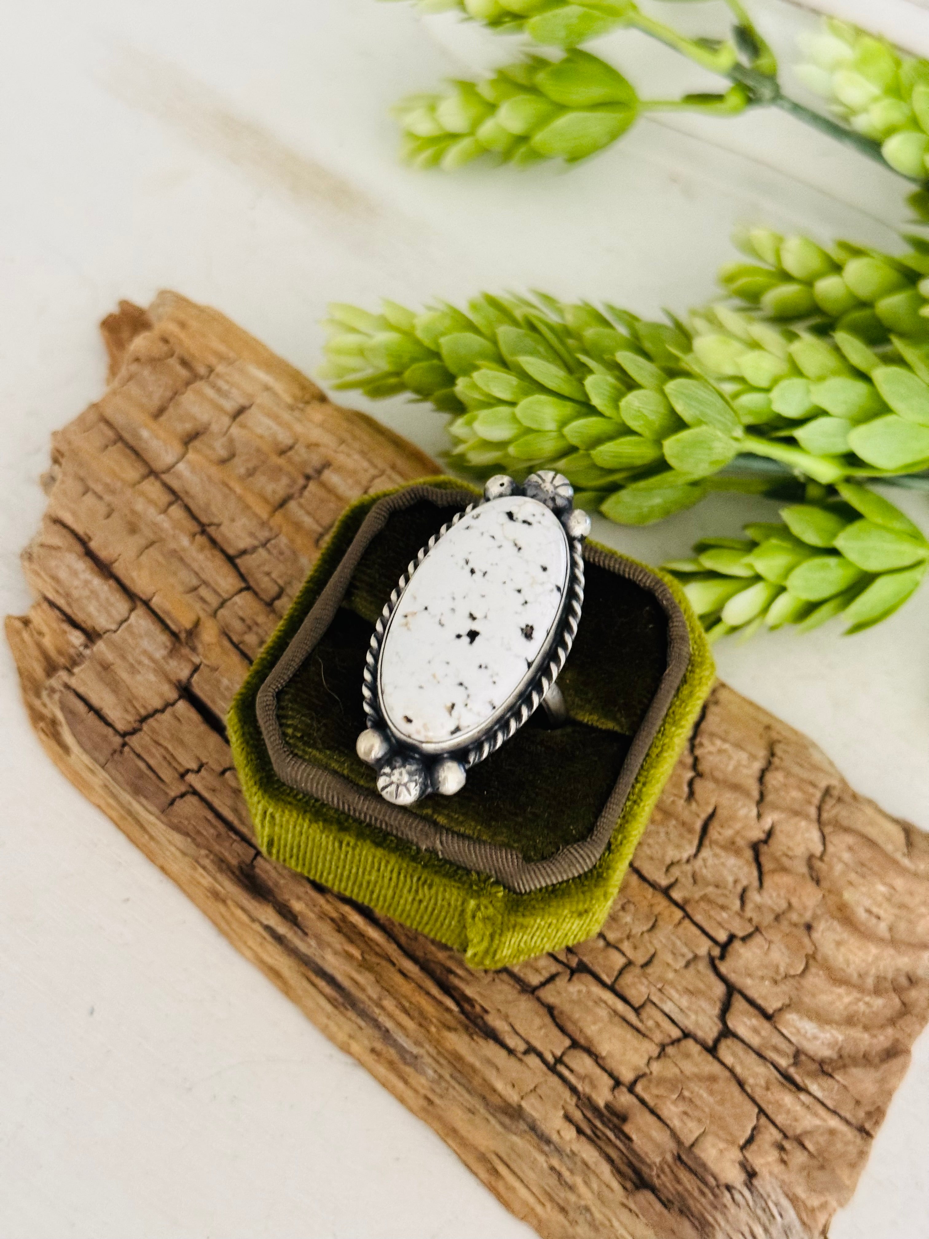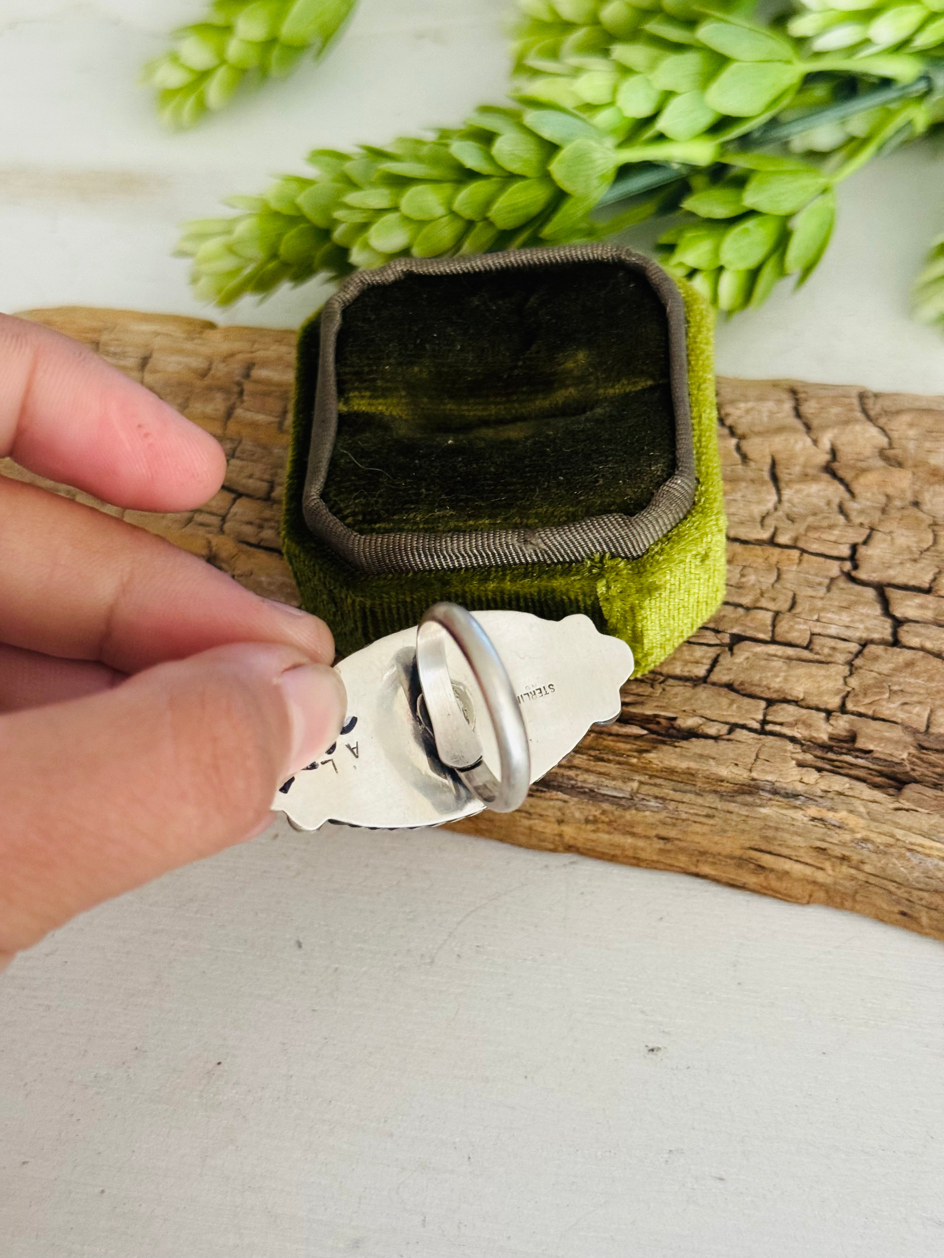 Augustine Largo White Buffalo & Sterling Silver Adjustable Ring. It measures 1 3/4 inches long and 3/4 of an inch wide. Signed by artist and stamped sterling silver.