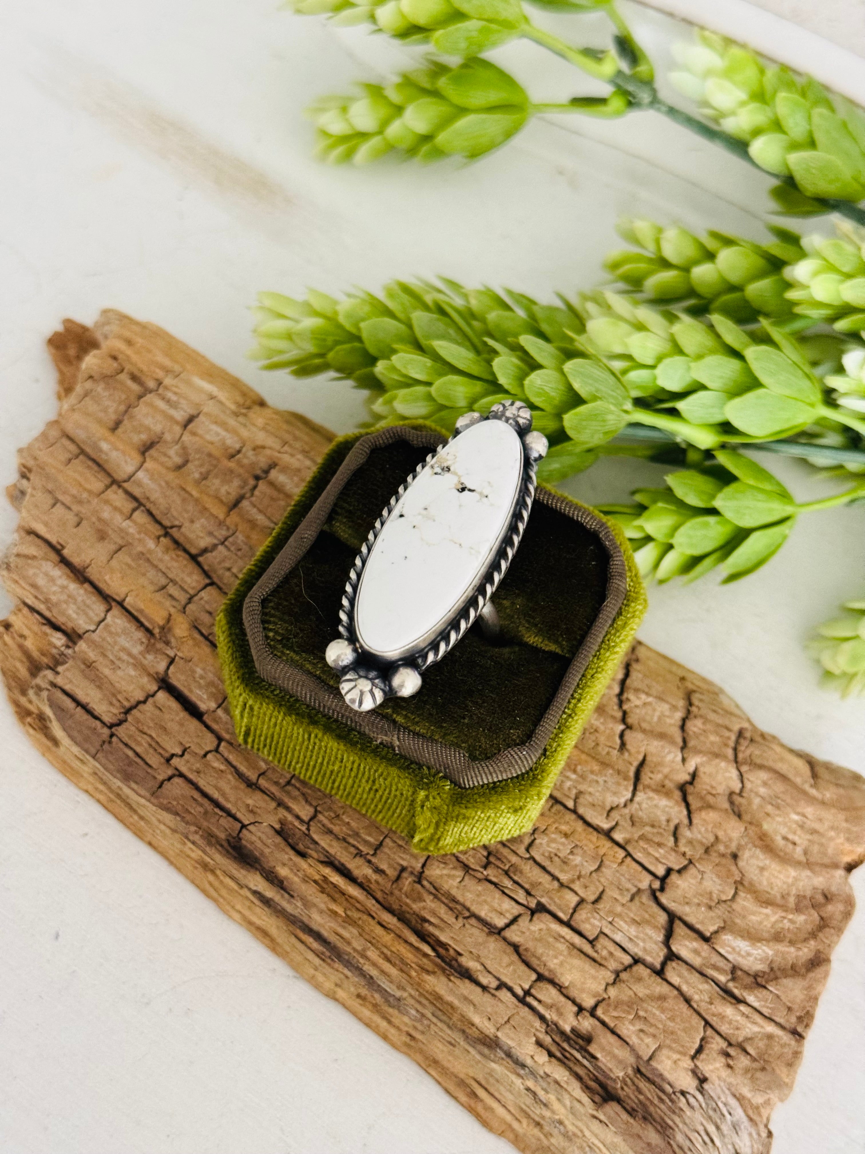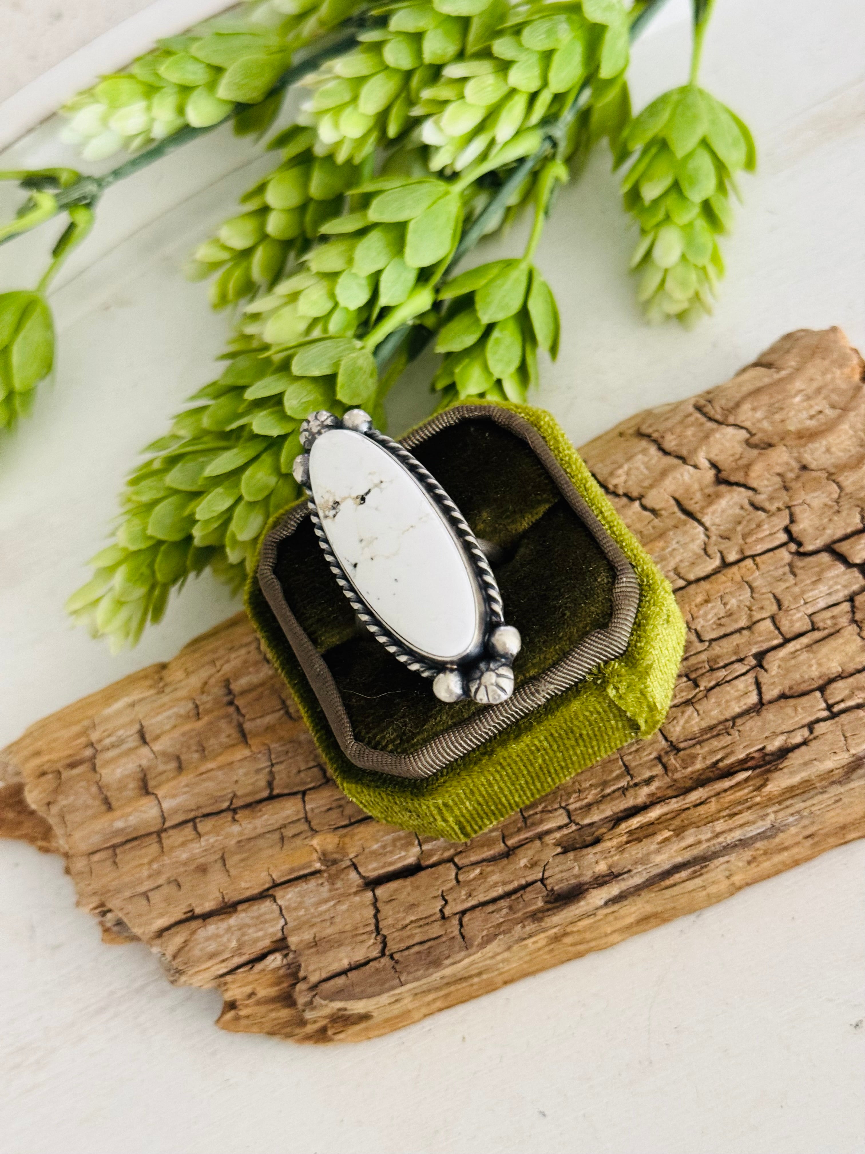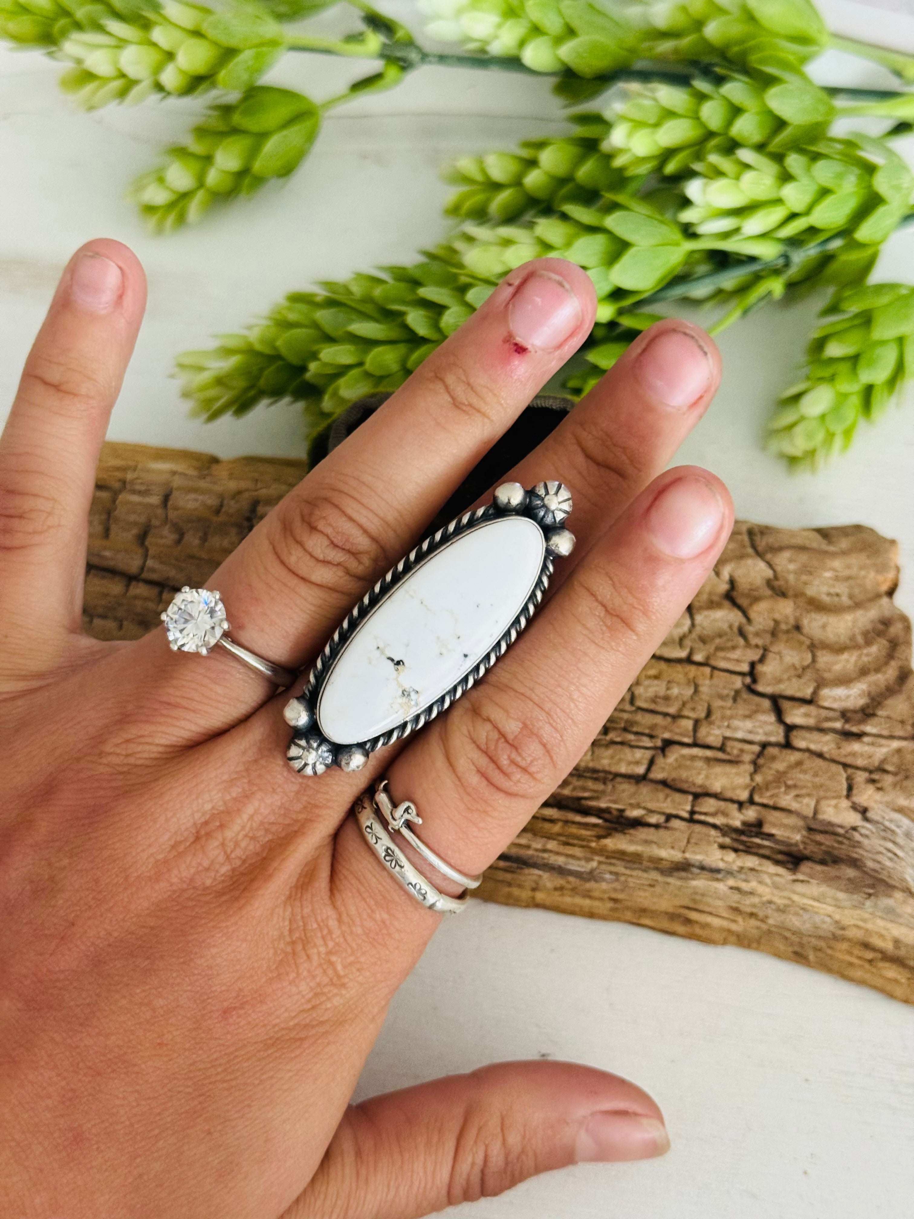 Augustine Largo White Buffalo & Sterling Silver Adjustable Ring. It measures 2 inches long and 3/4 of an inch wide. Signed by artist and stamped sterling silver.