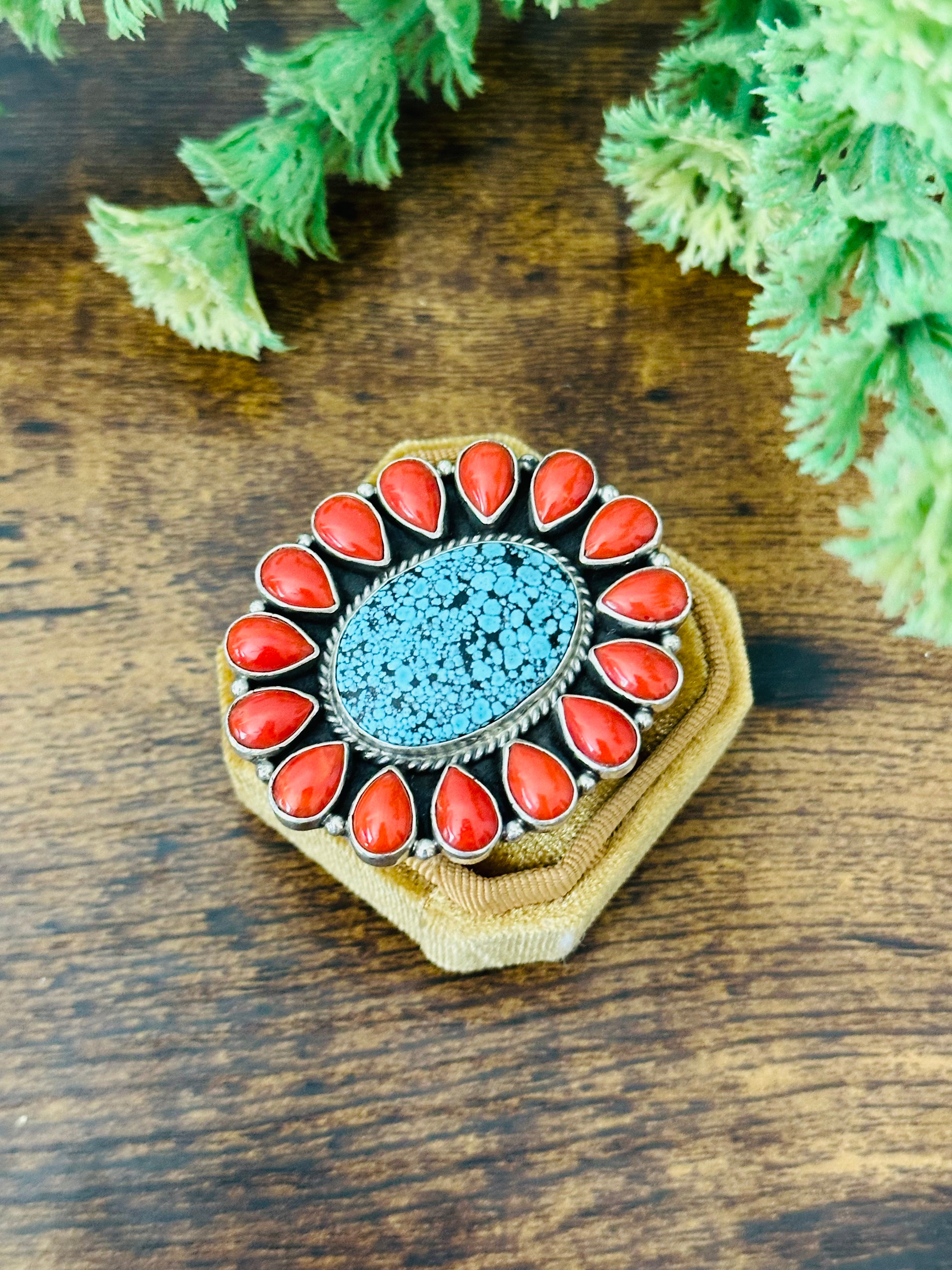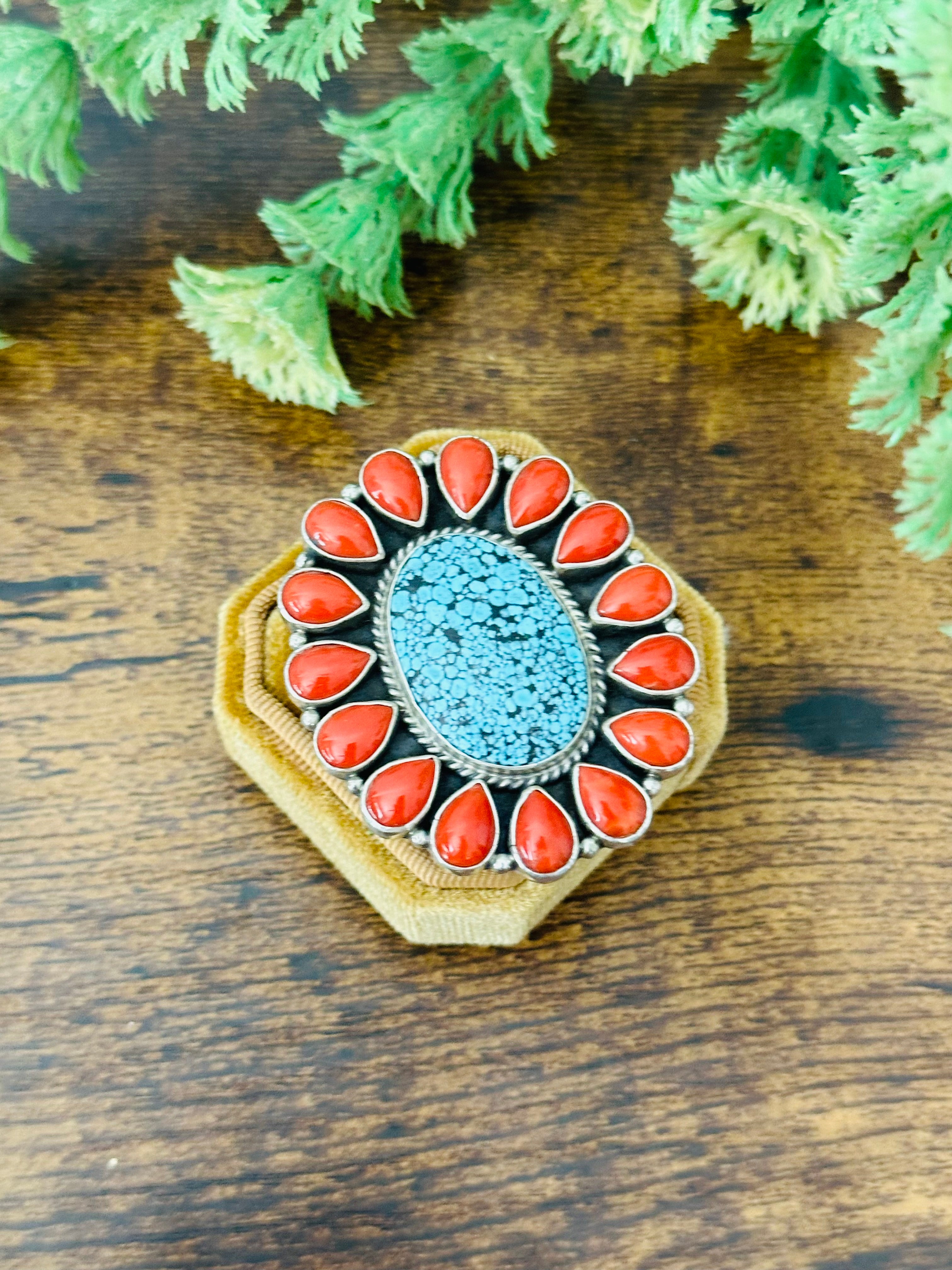 This is an awesome ring. B Begay Multi Stone & Sterling Silver Adjustable Ring. It measures 2 inches long and 1 3/4 inches wide. Signed by the artist and stamped sterling silver.
