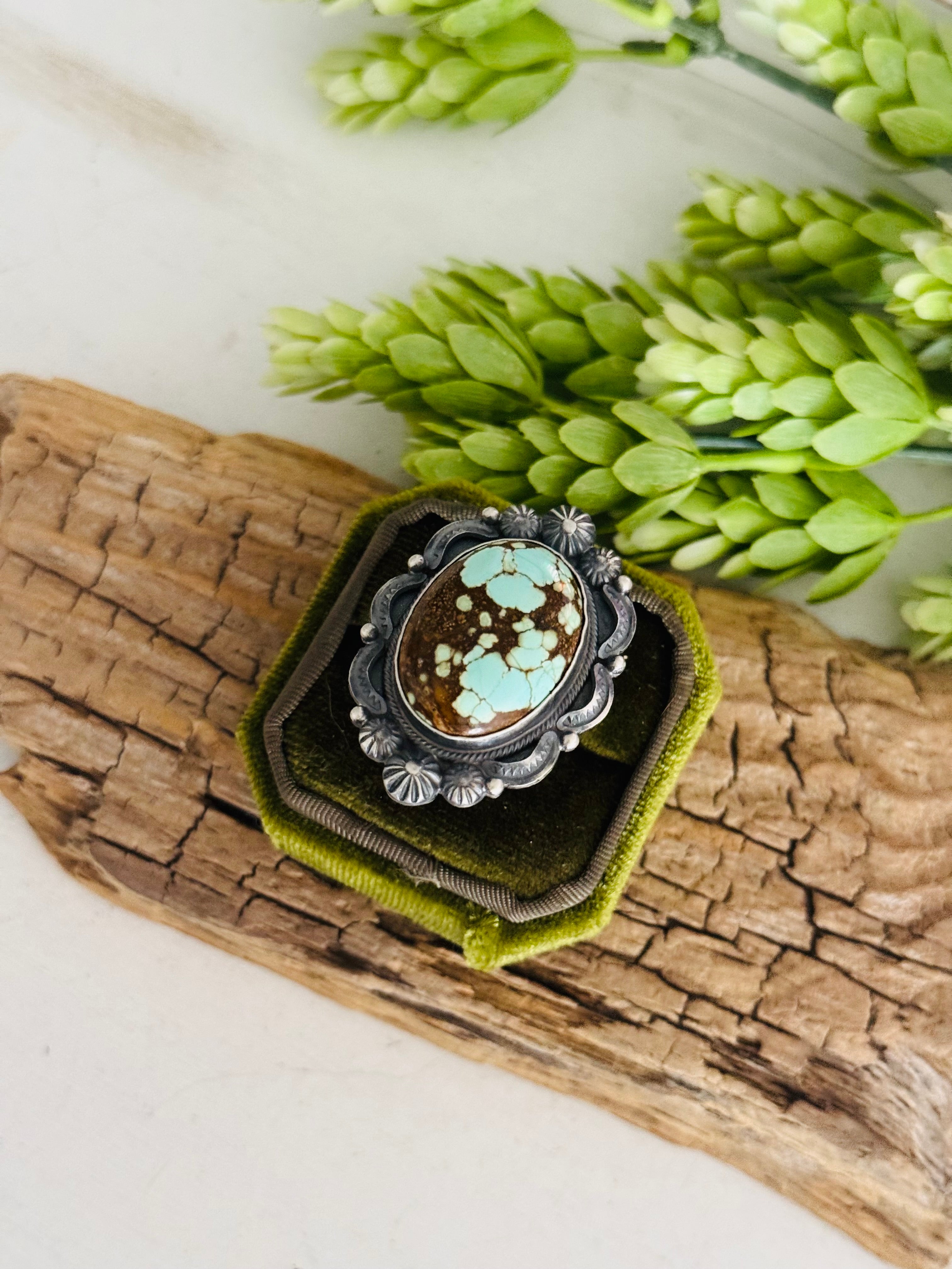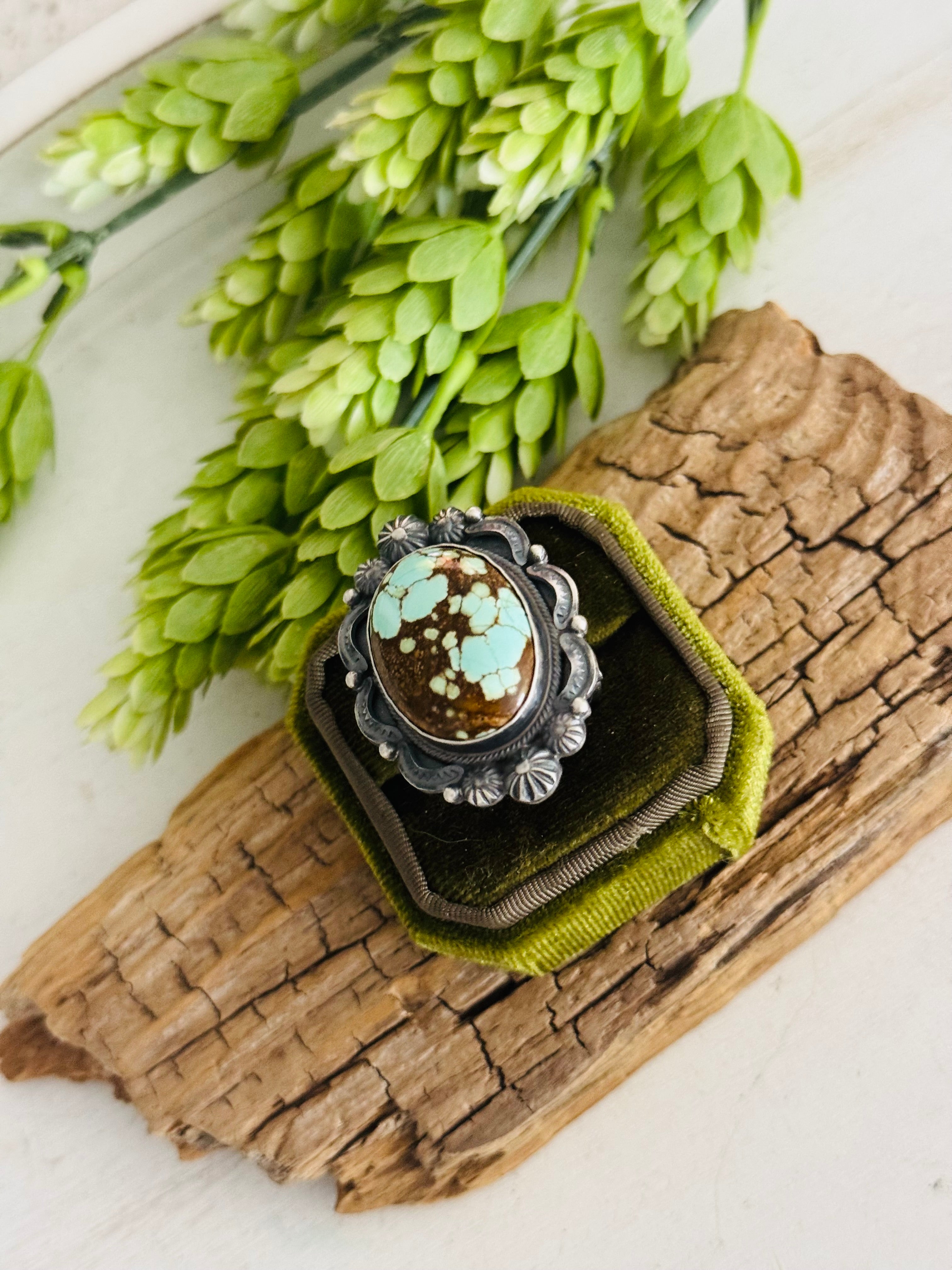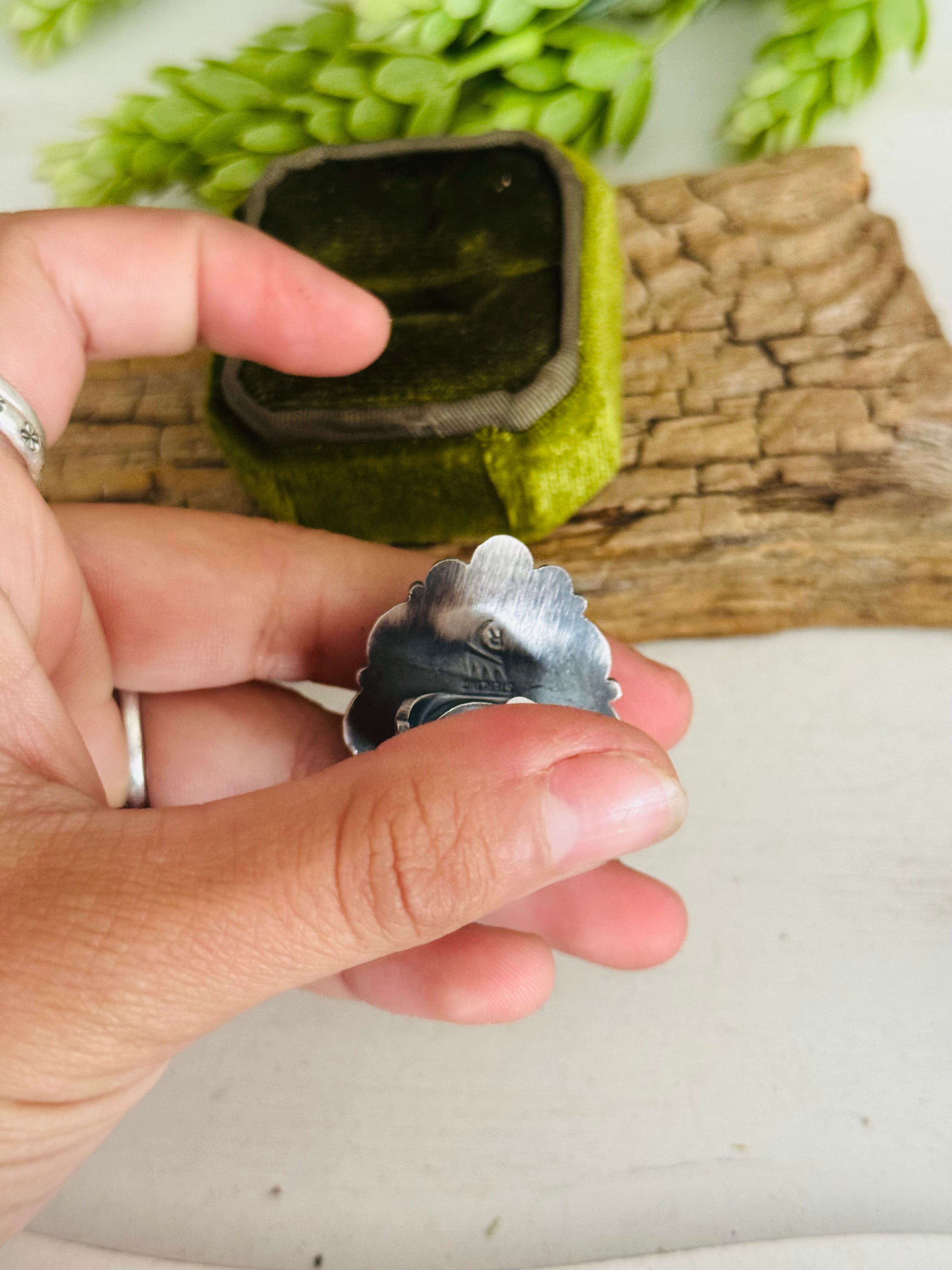 Bennie Ramone #8 Turquoise & Sterling Sliver Adjustable Ring. It measures 1 3/4 inches long and 1 1/4 inches wide. Signed by the artist and stamped sterling silver.