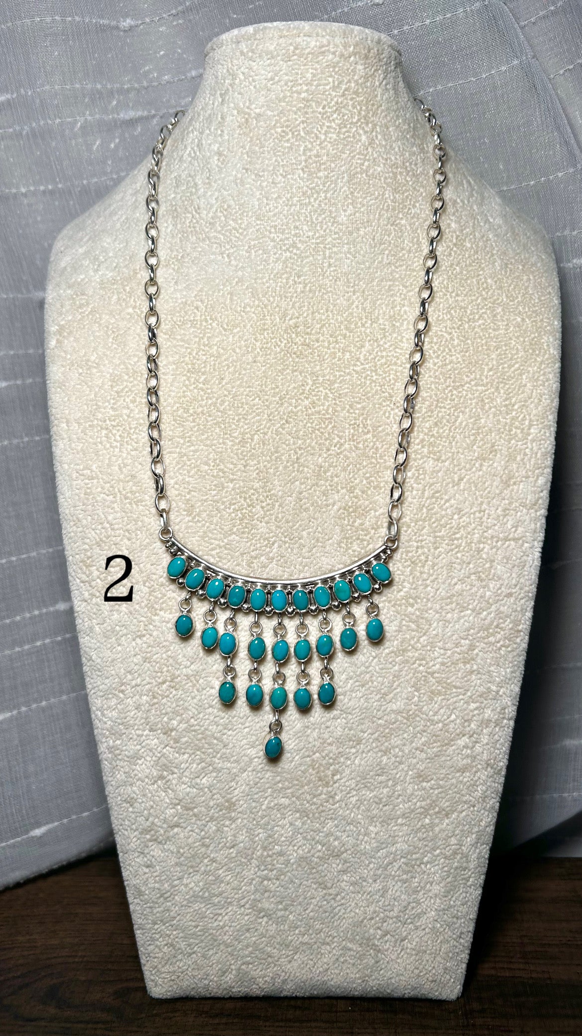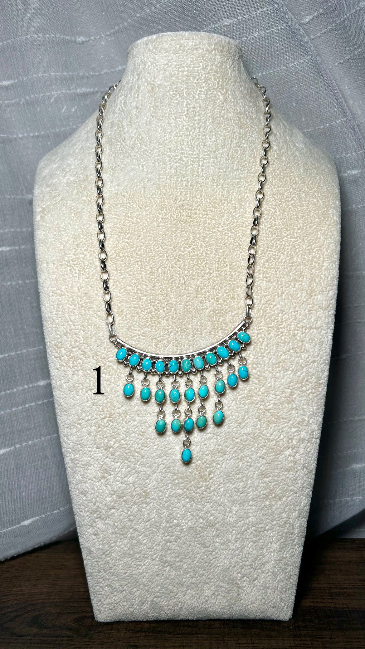 Pearline Spencer Kingman Turquoise & Sterling Silver Necklace. It measures 23 inches long with hang while the chain by itself measures 18 inches long. Signed by the artist and stamped sterling silver.