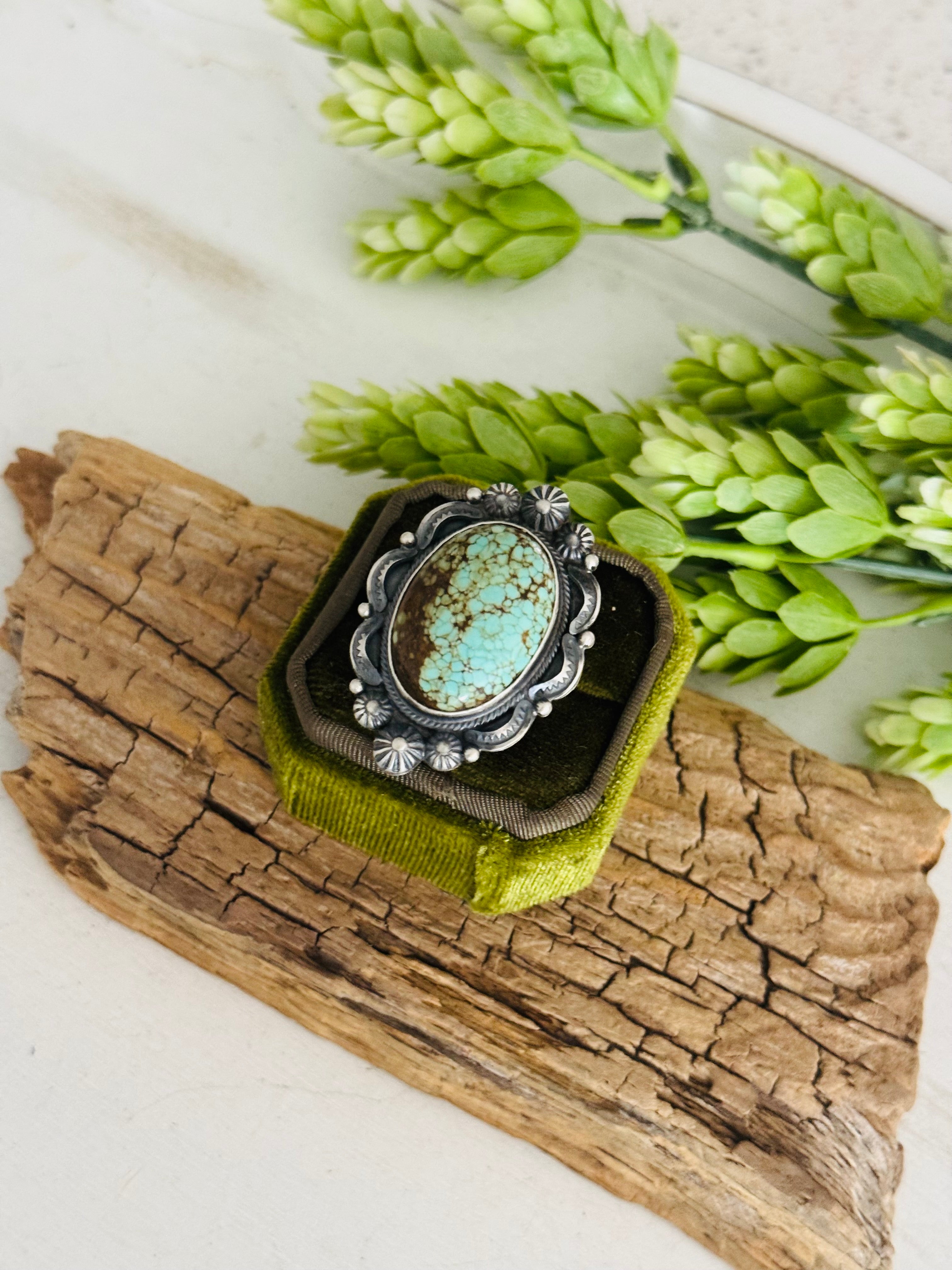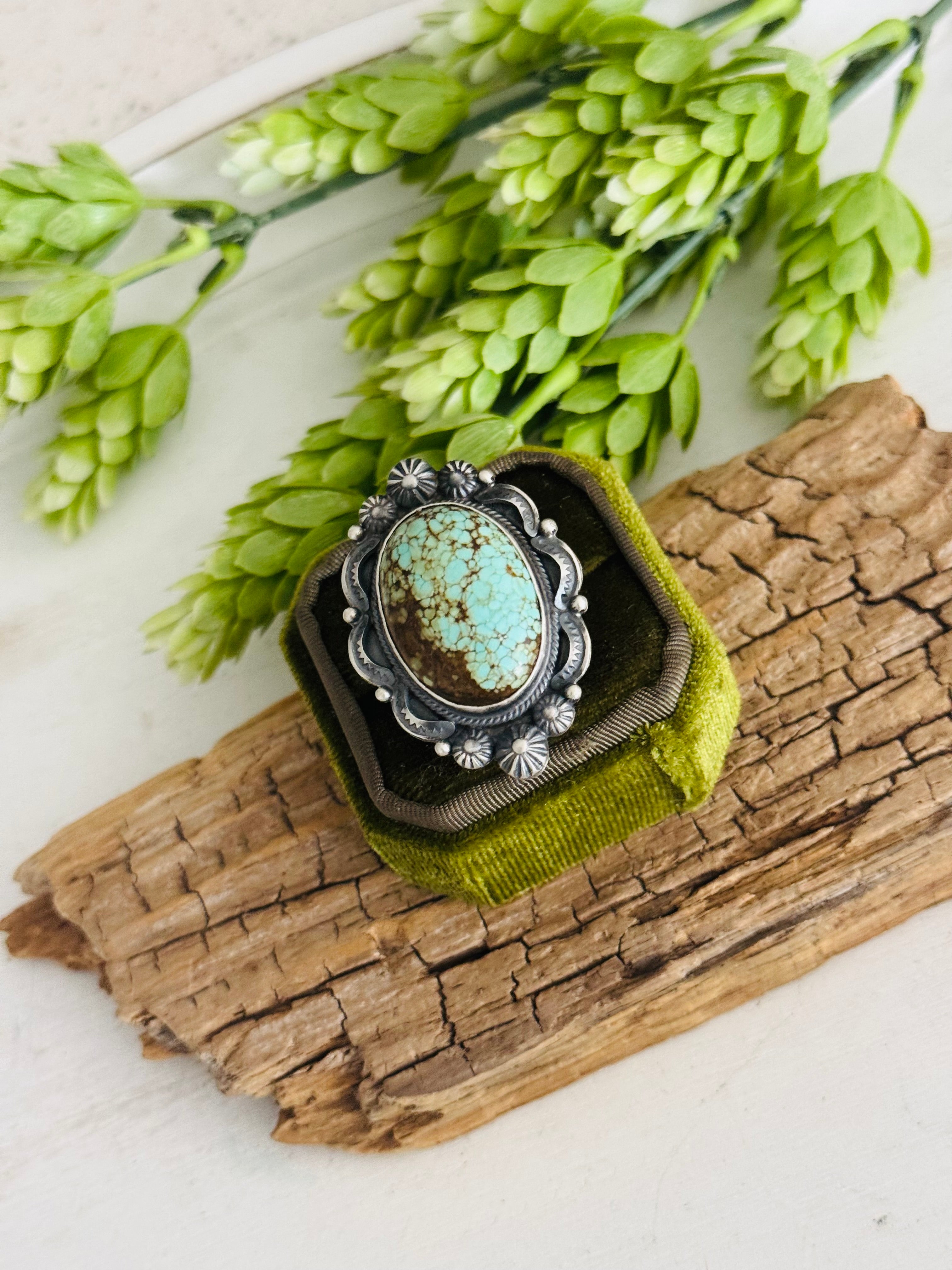 Bennie Ramone #8 Turquoise & Sterling Sliver Adjustable Ring. It measures 1 3/4 inches long and 1 1/4 inches wide. Signed by the artist and stamped sterling silver.