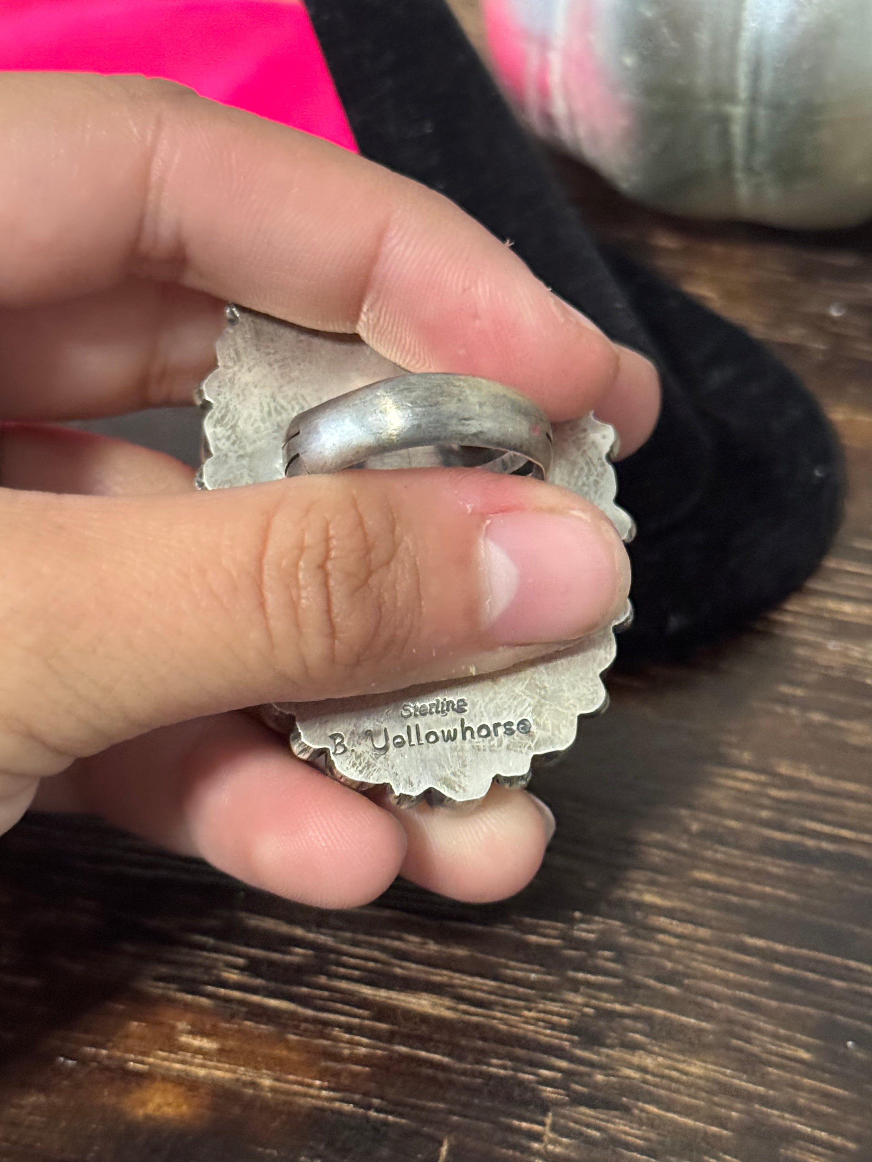 Beautiful ring. Blaine Yellowhorse Kingman Turquoise & Sterling Silver Ring Size 7.25. It measures 2 1/8 inches long and 1 1/2 inches wide. Stamped sterling silver and signed by artist.