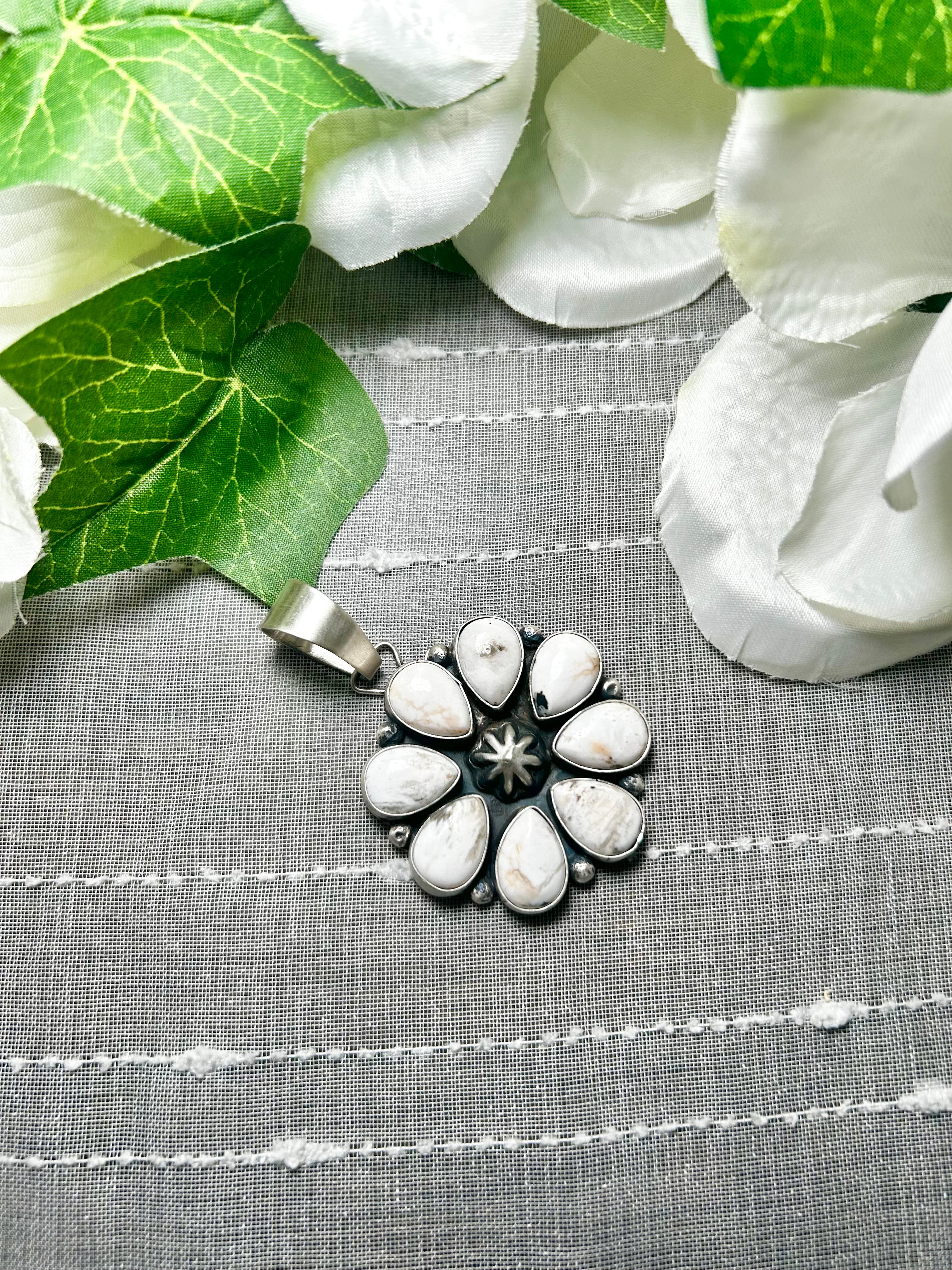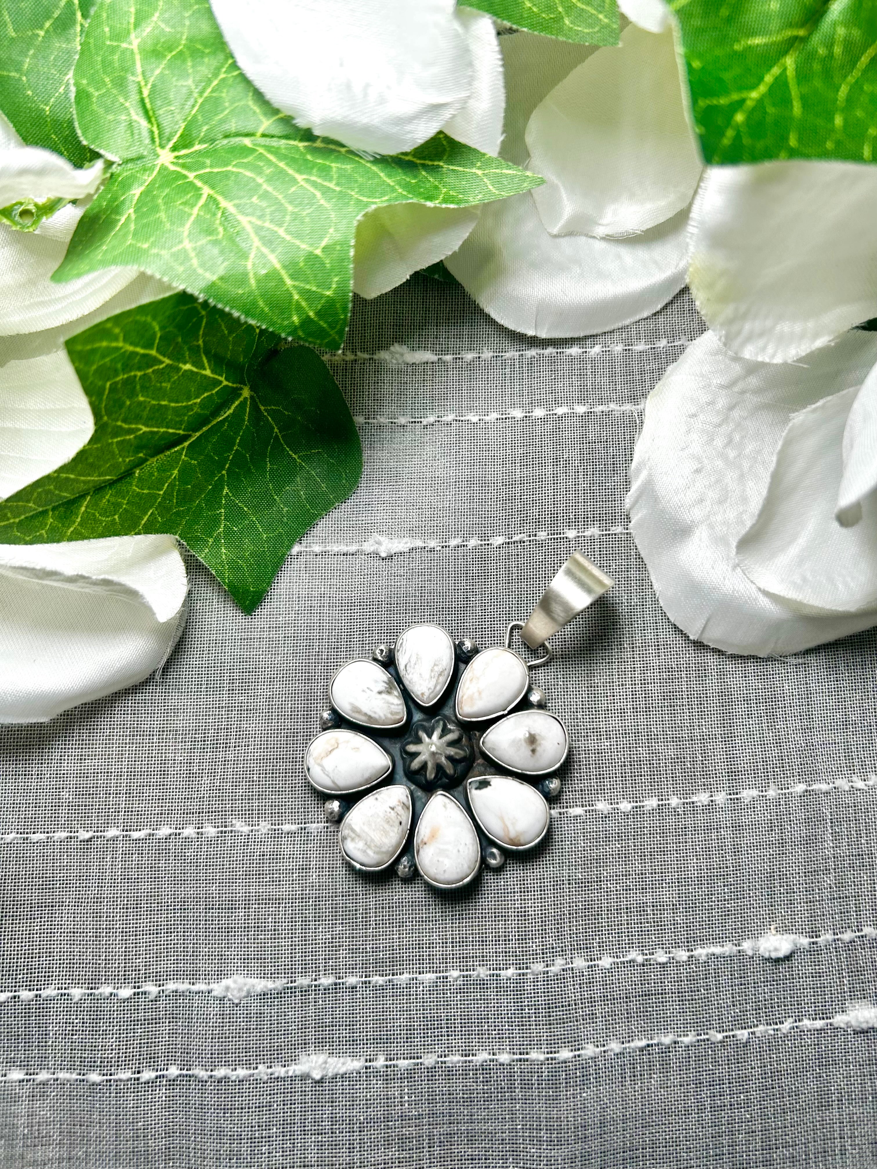 Rena Shelly White Buffalo & Sterling Silver Pendant. It measures 2 5/8 inches long and 1 3/4 inches wide. Pendant Only! Signed by the artist and stamped sterling silver.
