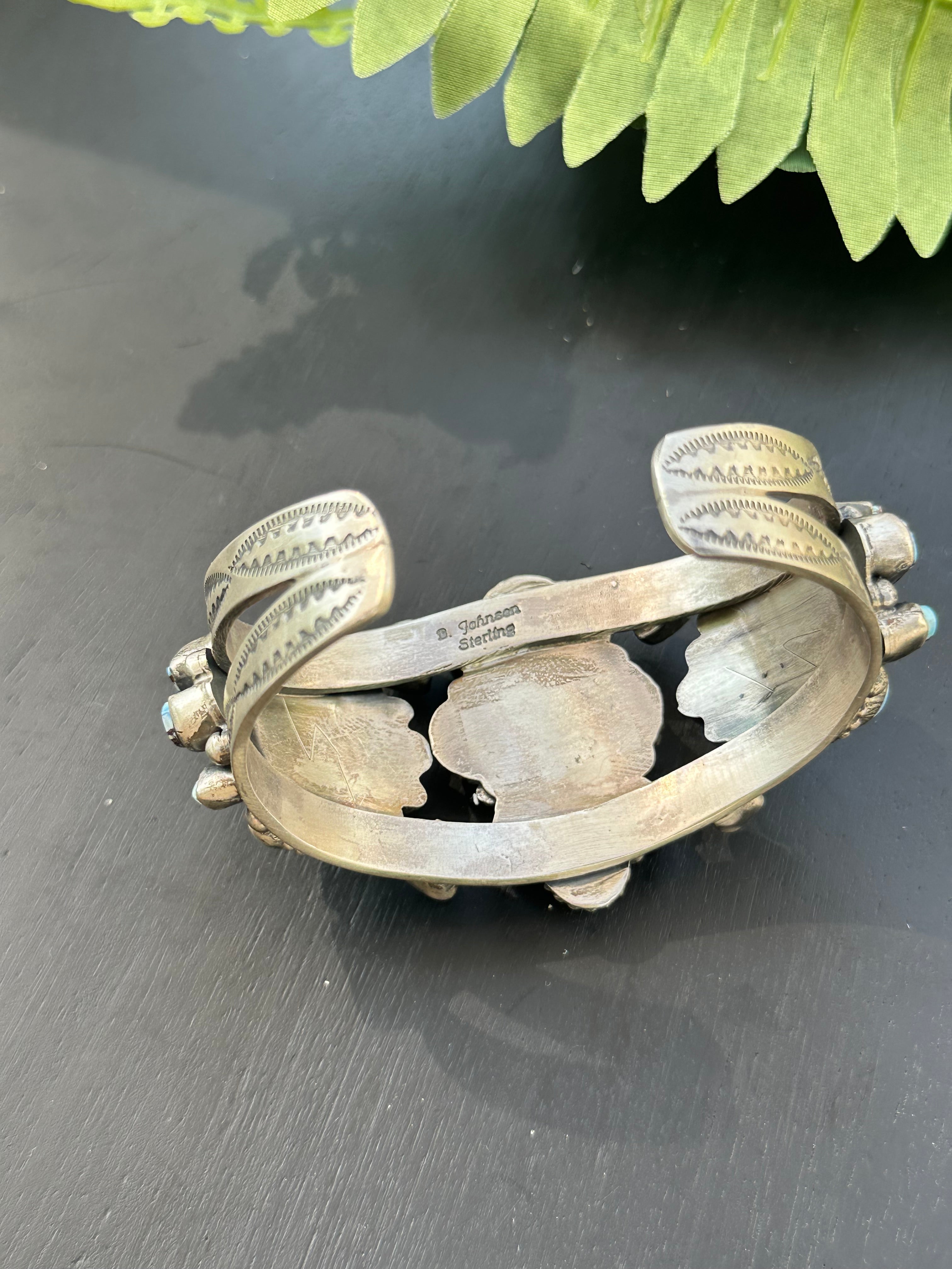 Bobby Johnson Golden Hills Turquoise & Sterling Silver Cuff Bracelet. It measures 1 5/8 inches wide with an inside circumference of 5 3/4 inches and a gap 1 inch. Signed by the artist and stamped sterling silver.