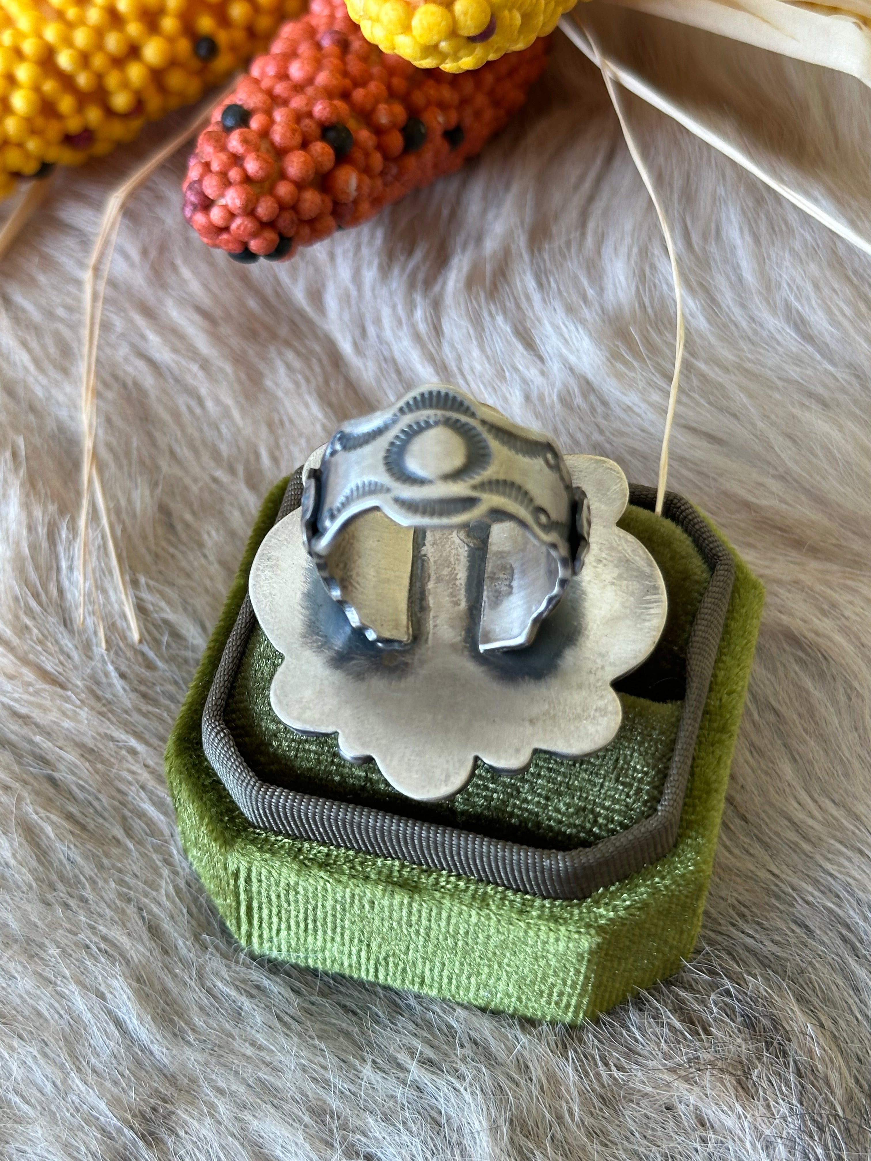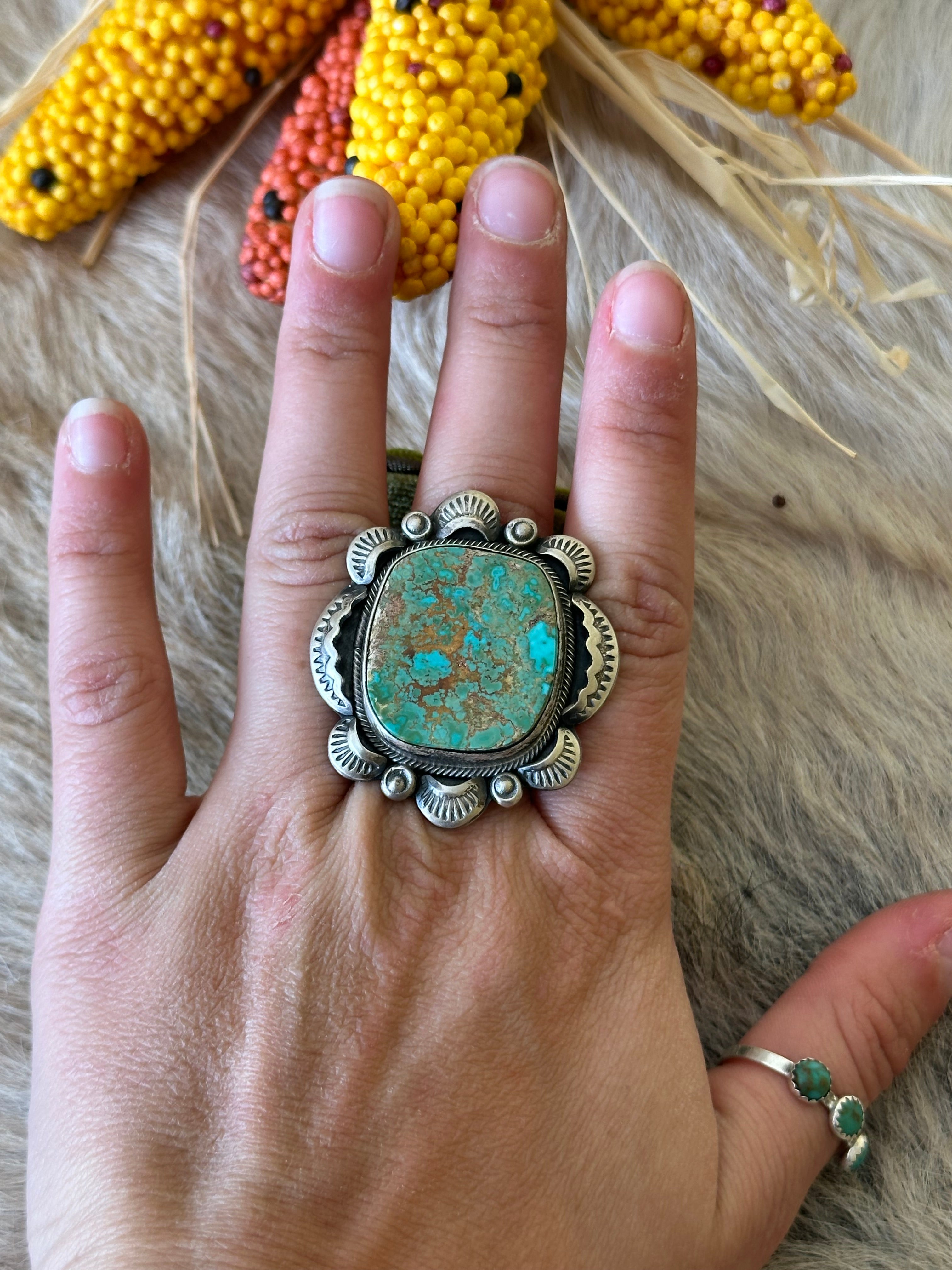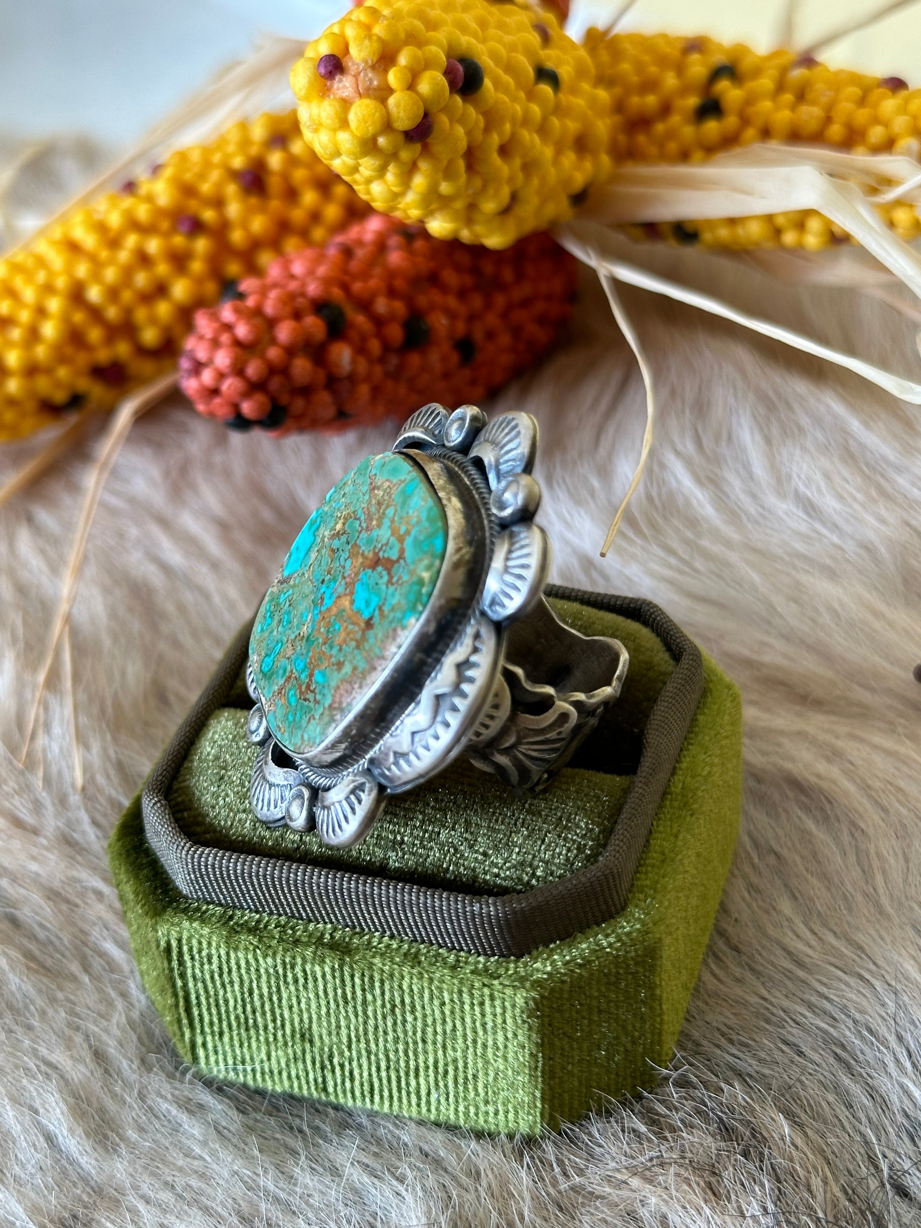 Beautiful ring. Gilbert Tom Royston Turquoise & Sterling Silver Ring Size 8.5. It measures 1 5/8 inches long and 1 1/2 inches wide. Stamped sterling silver and signed by artist.