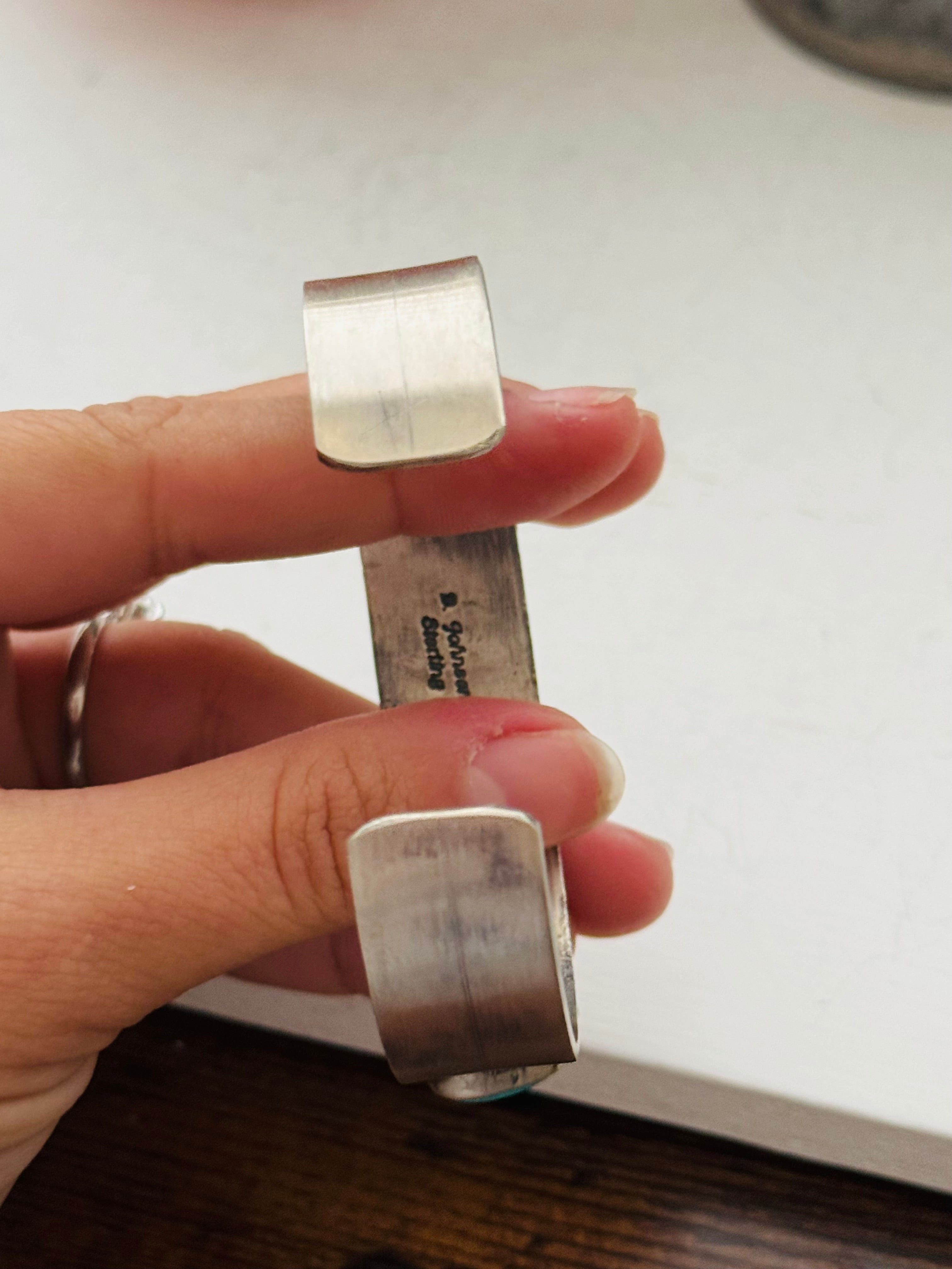 Bobby Johnson Kingman Turquoise & Sterling Silver Cuff Bracelet. It measures 1/2 of an inch wide with an inside circumference of 5 5/8 inches and a gap of 1 inch. Signed by the artist and stamped sterling silver.