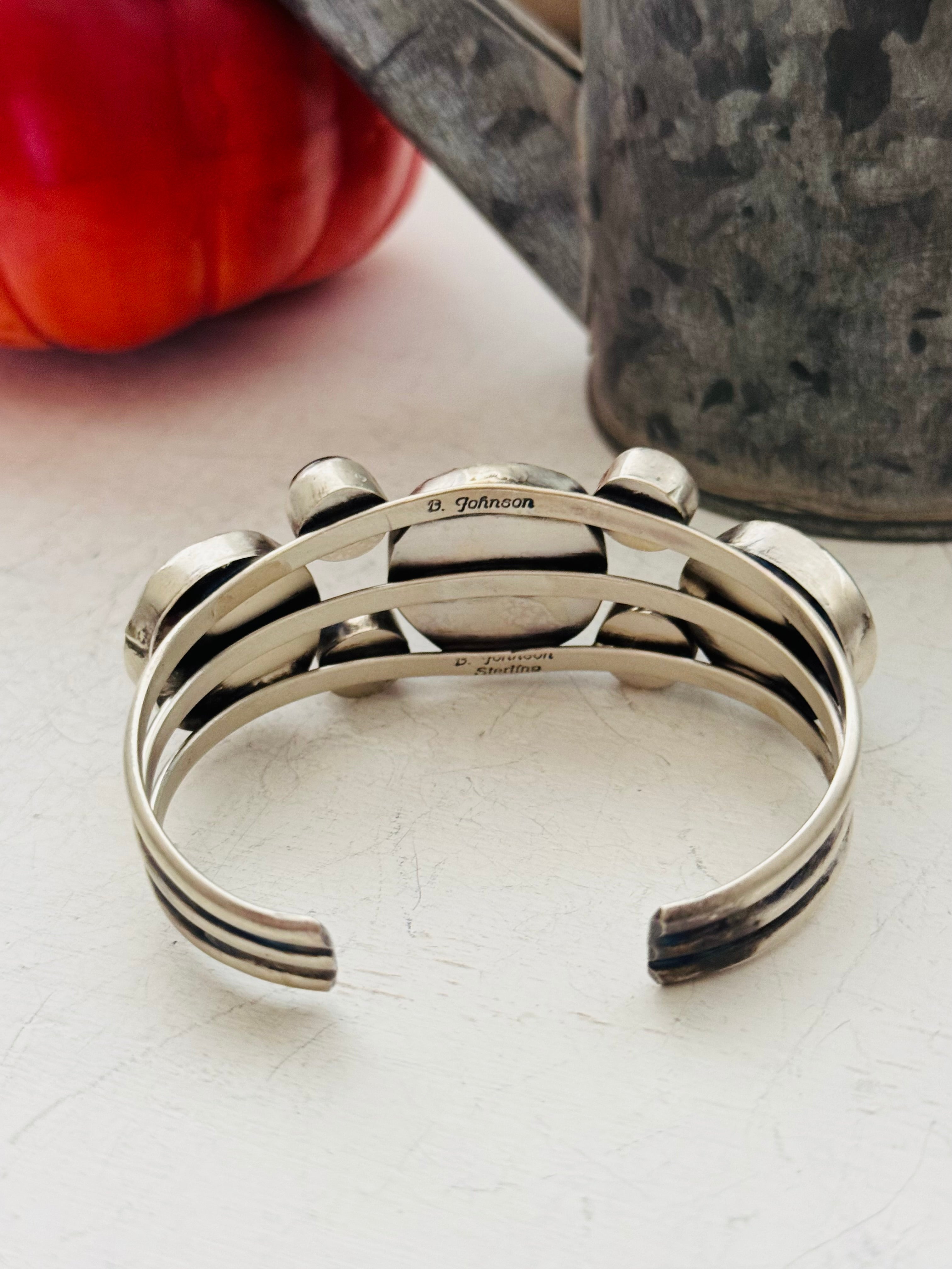 Bobby Johnson Blue Moon Turquoise & Sterling Silver Cluster Cuff Bracelet. It measures 1 inch wide with an inside circumference of 5 3/4 inches and a gap of 1 inch. Signed by the artist and stamped sterling silver.