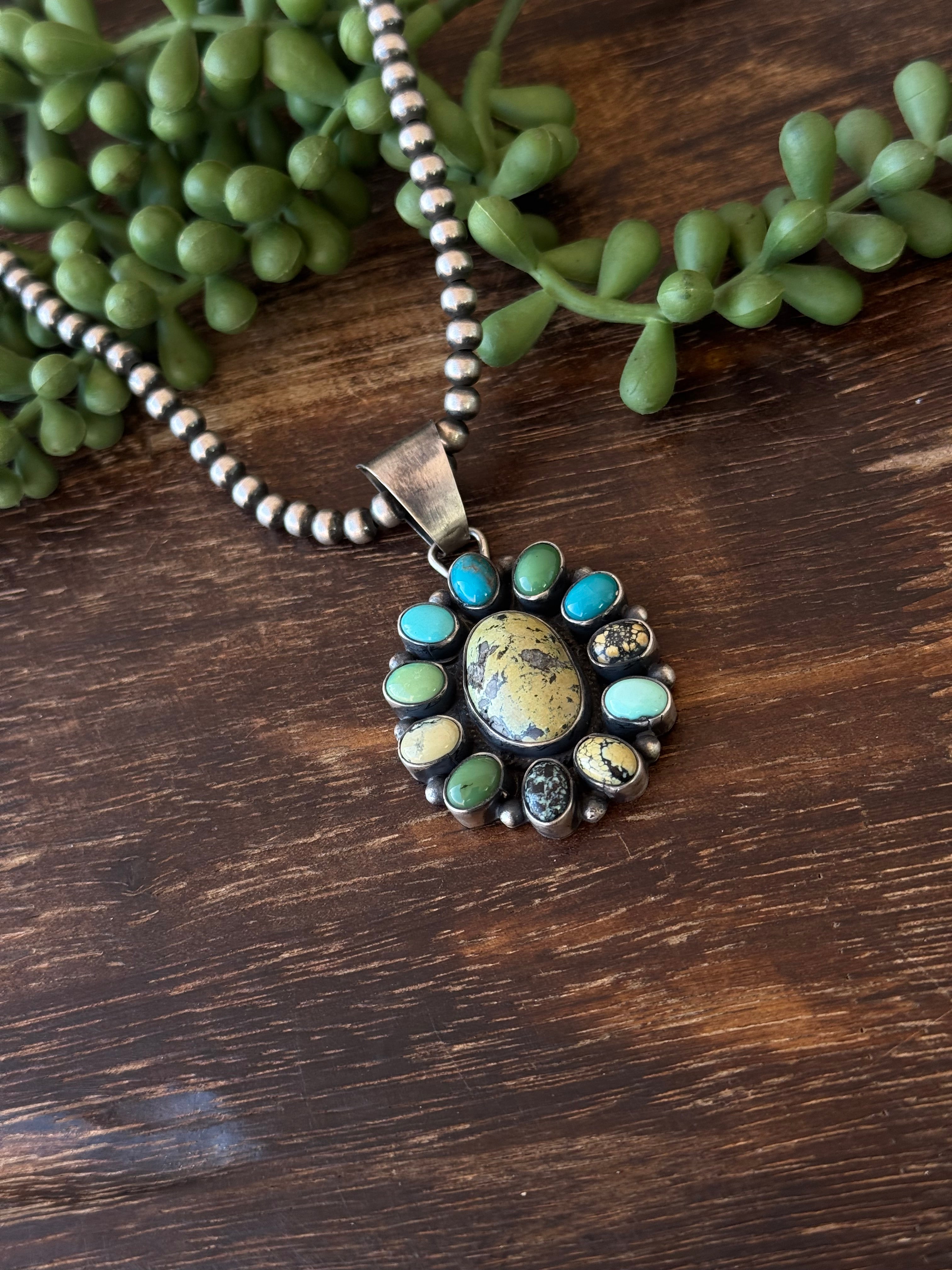 Travis Jim Mixed Turquoise & Sterling Silver Cluster Pendant. It measures 2 1/2 inches long and 1 3/8 inches wide. Pendant Only! Signed by the artist and stamped sterling silver.