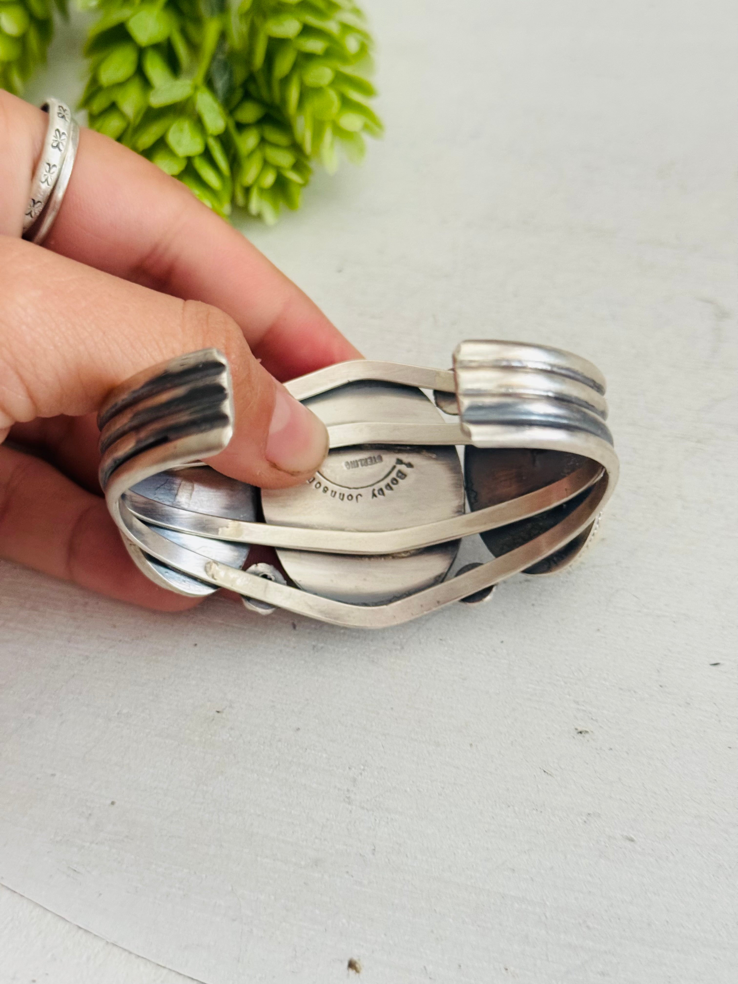Bobby Johnson #8 Turquoise & Sterling Silver Cuff Bracelet. It measures 1 5/8 inches wide with an inside circumference of 5 5/8 inches and a gap of 1 inch. Signed by the artist and stamped sterling silver.
