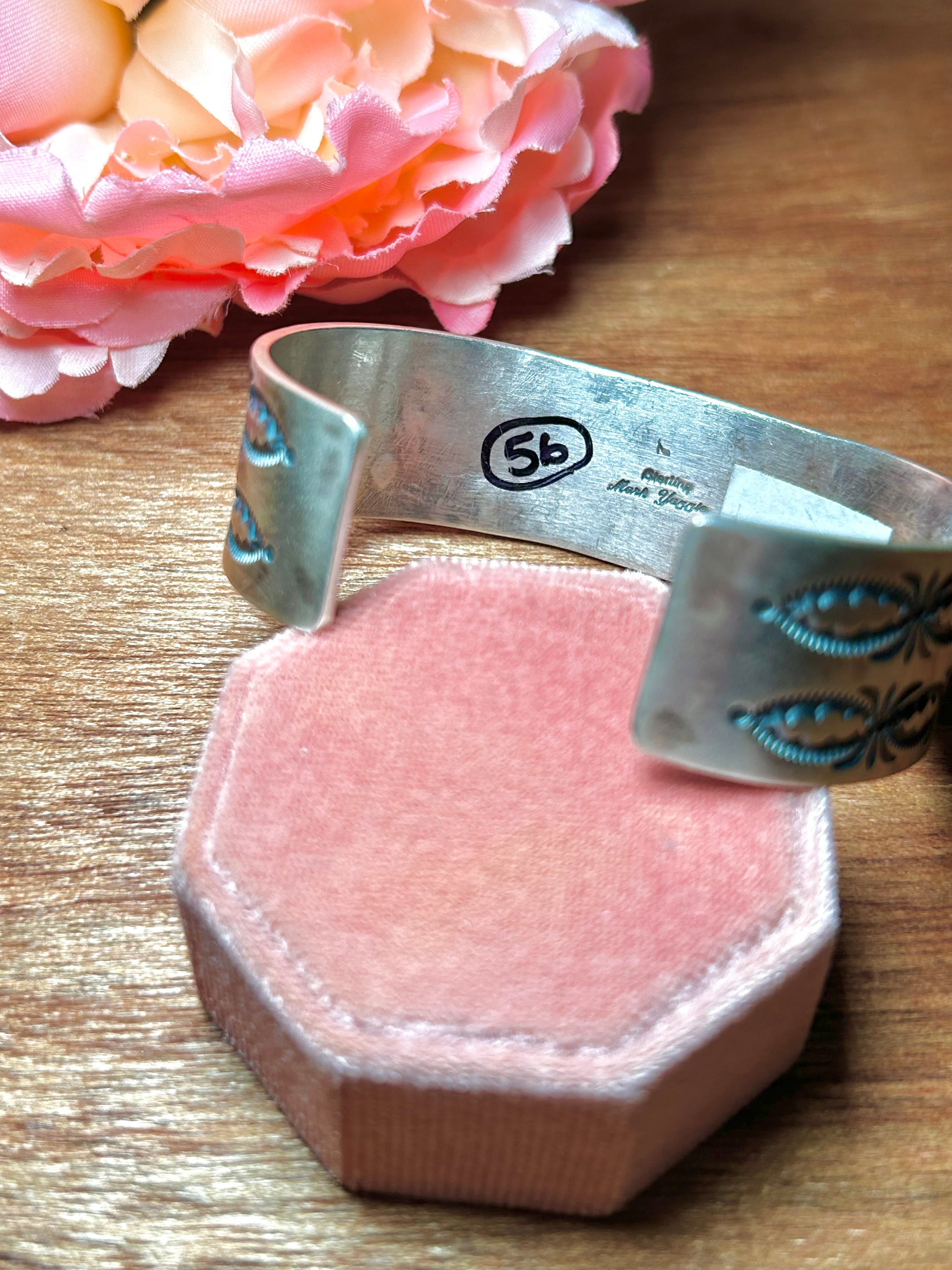 Leroy James Blue Ridge Turquoise & Sterling Silver Cuff Bracelet. It measures 3/4 of an inch wide with an inside circumference of 5 3/4 inches and a gap of 1 inch. Signed by the artist and stamped sterling silver. Stones will vary due to natural stones