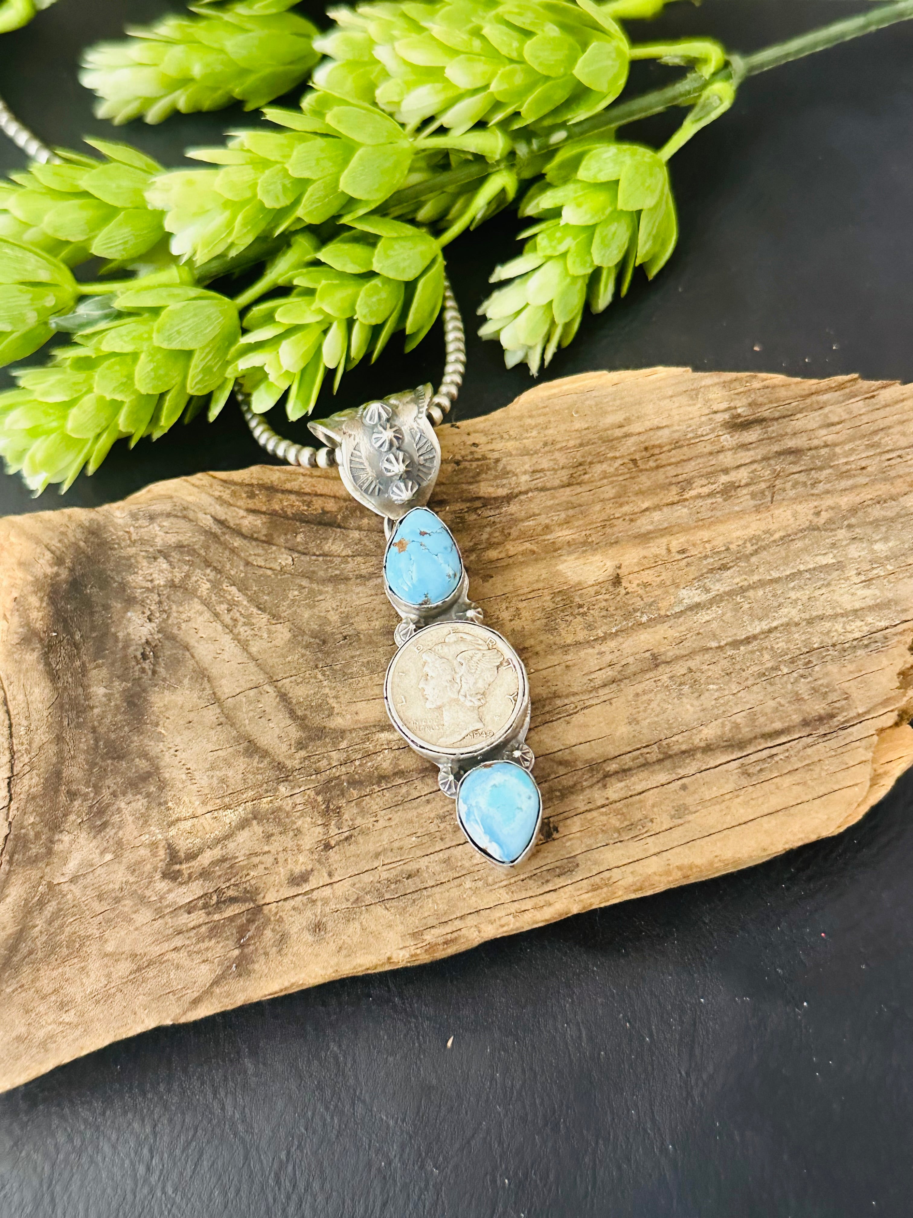 Boyd Ashley Golden Hills Turquoise & Sterling Silver Pendant. It measures 2 5/8 inches long and 3/4 of an inch wide. Pendant Only!! Signed by the artist and stamped sterling silver.