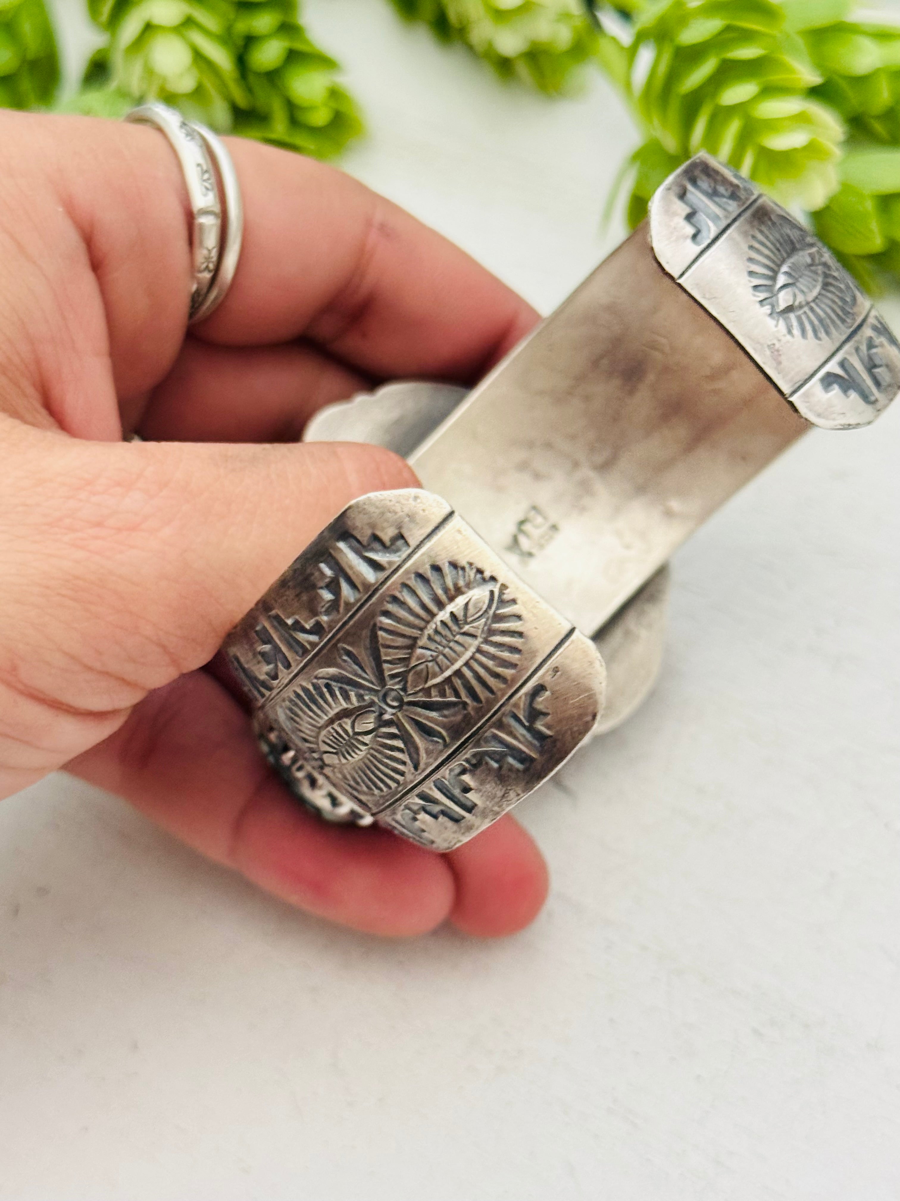 Boyd Ashley Multi Stone & Sterling Silver Cuff Bracelet. It measures 1 7/8 inches wide with an inside circumference 6 inches and a gap of 1 1/8 inches. Signed by artist and stamped sterling silver. Cuff has flex to it.