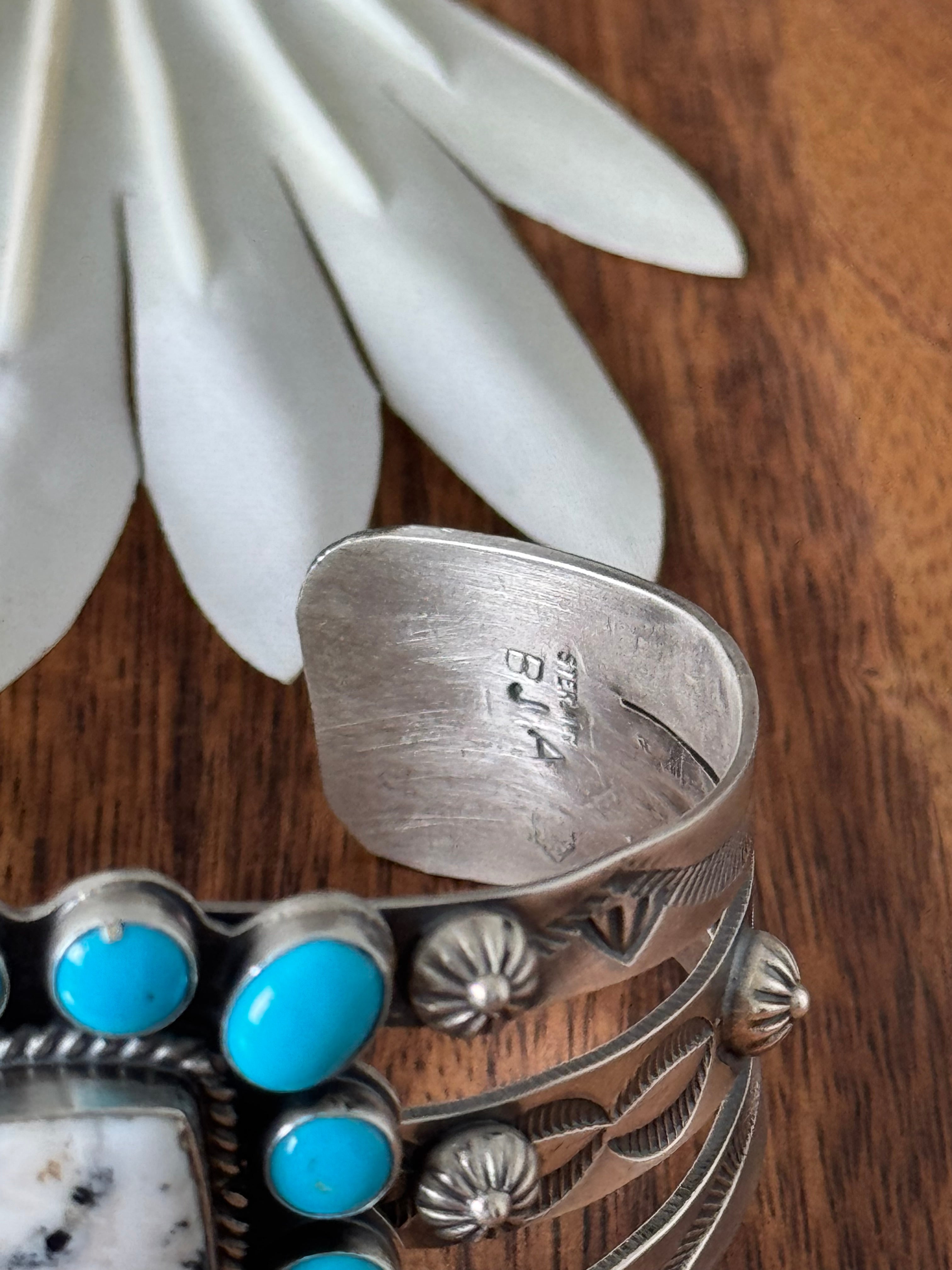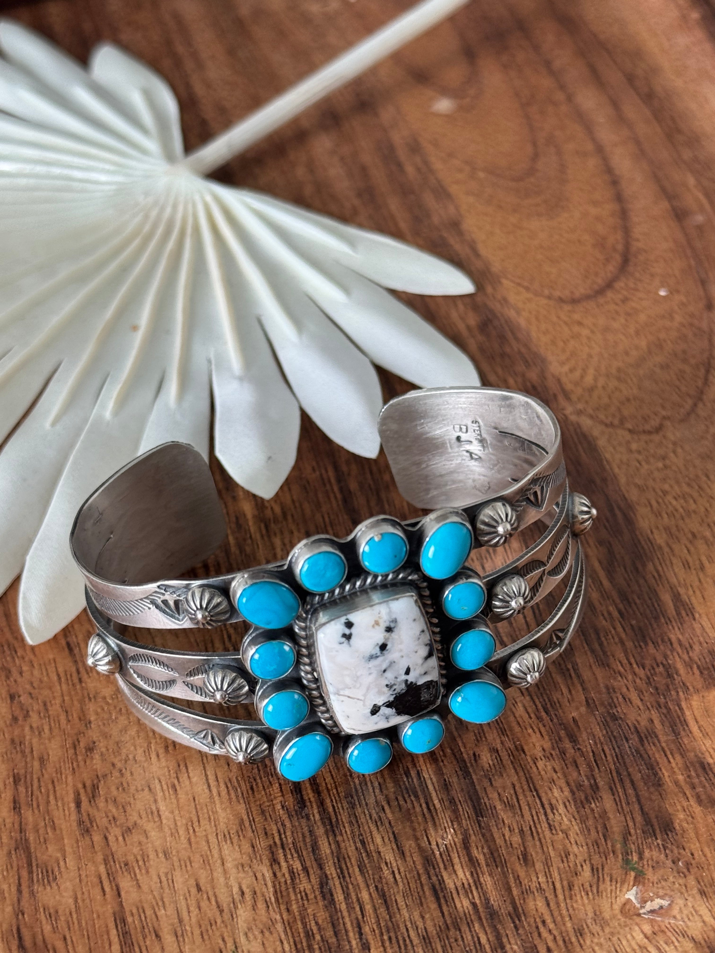 Boyd J Ashley Multi Stone & Sterling Silver Cuff Bracelet. It measures 1 1/2 inches wide with an inside circumference of 6 inches and a gap of 1 inch. Signed by artist and stamped sterling silver.