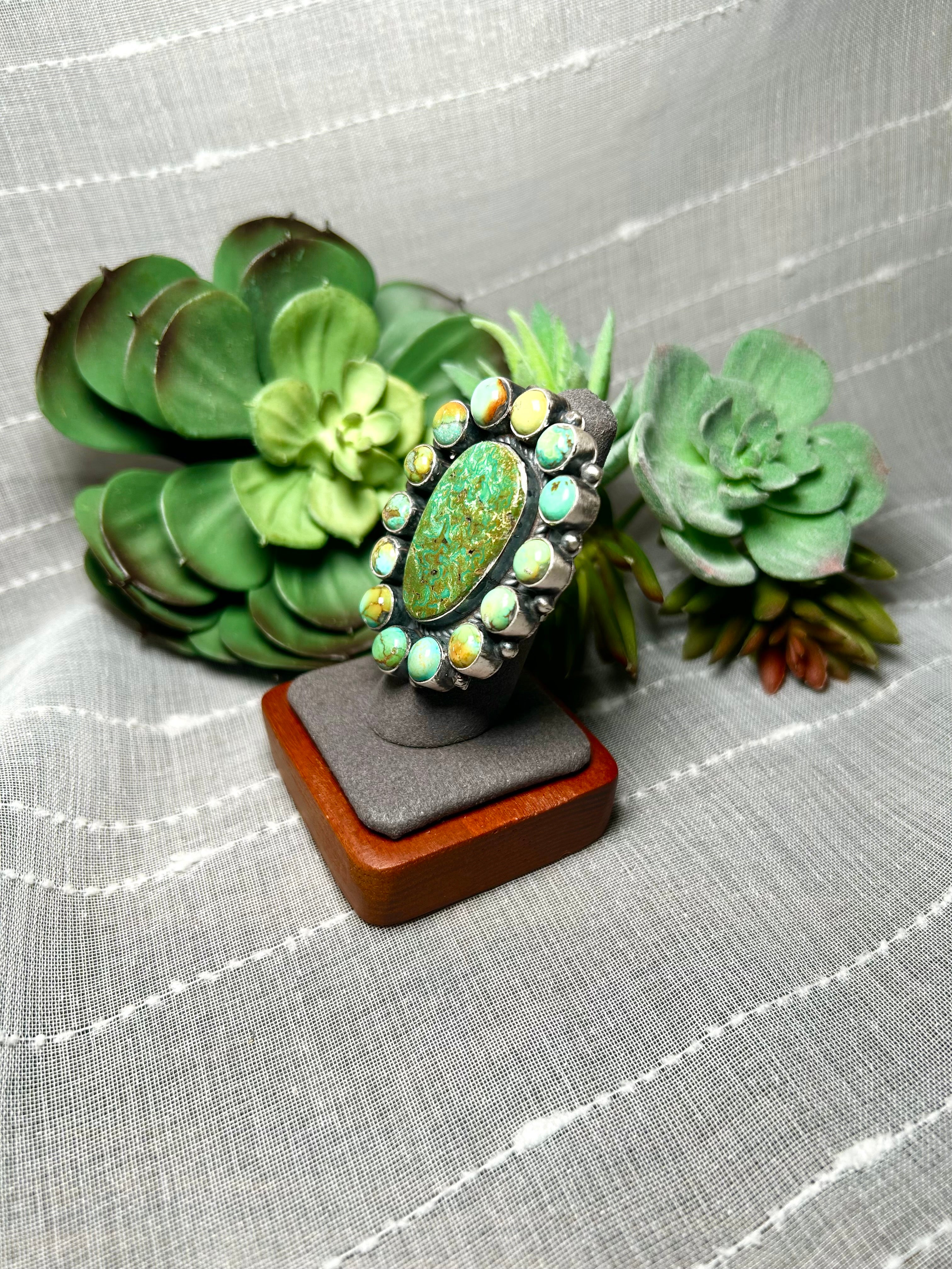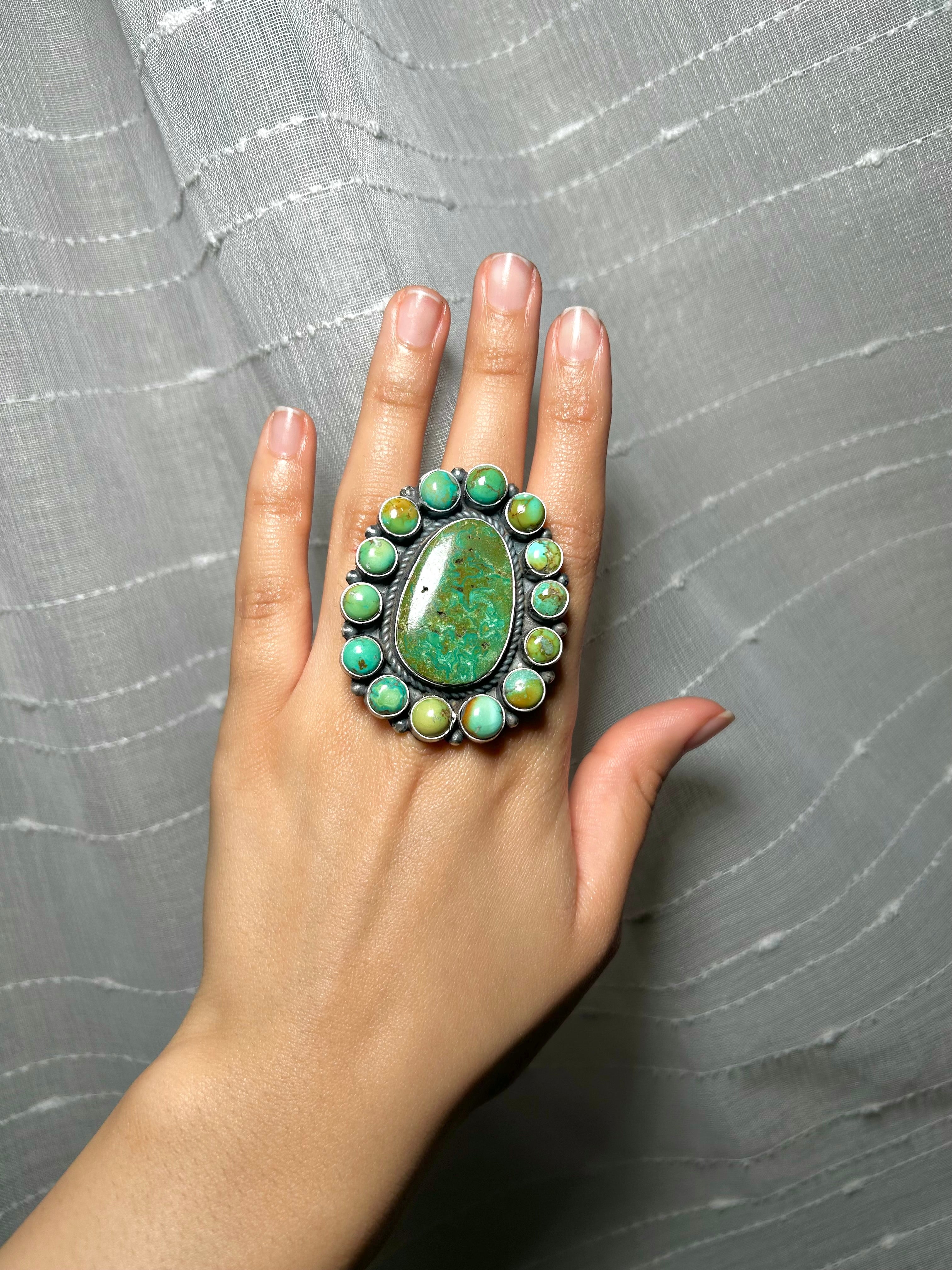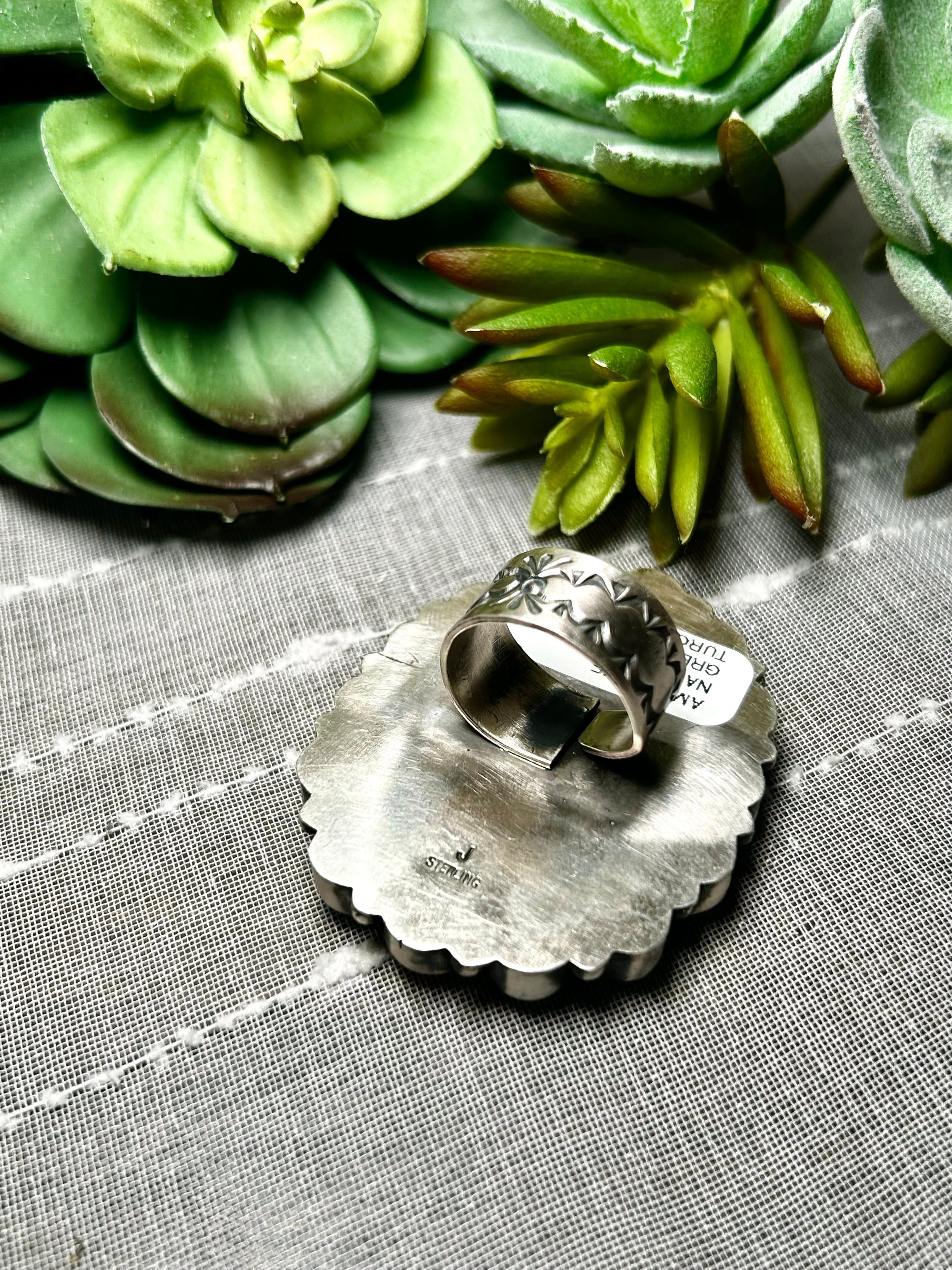 Amos Jake Nevada Turquoise & Sterling Silver Adjustable Ring. It measures 2 inches long and 1 3/4 inches wide. Signed by the artist and stamped sterling silver.