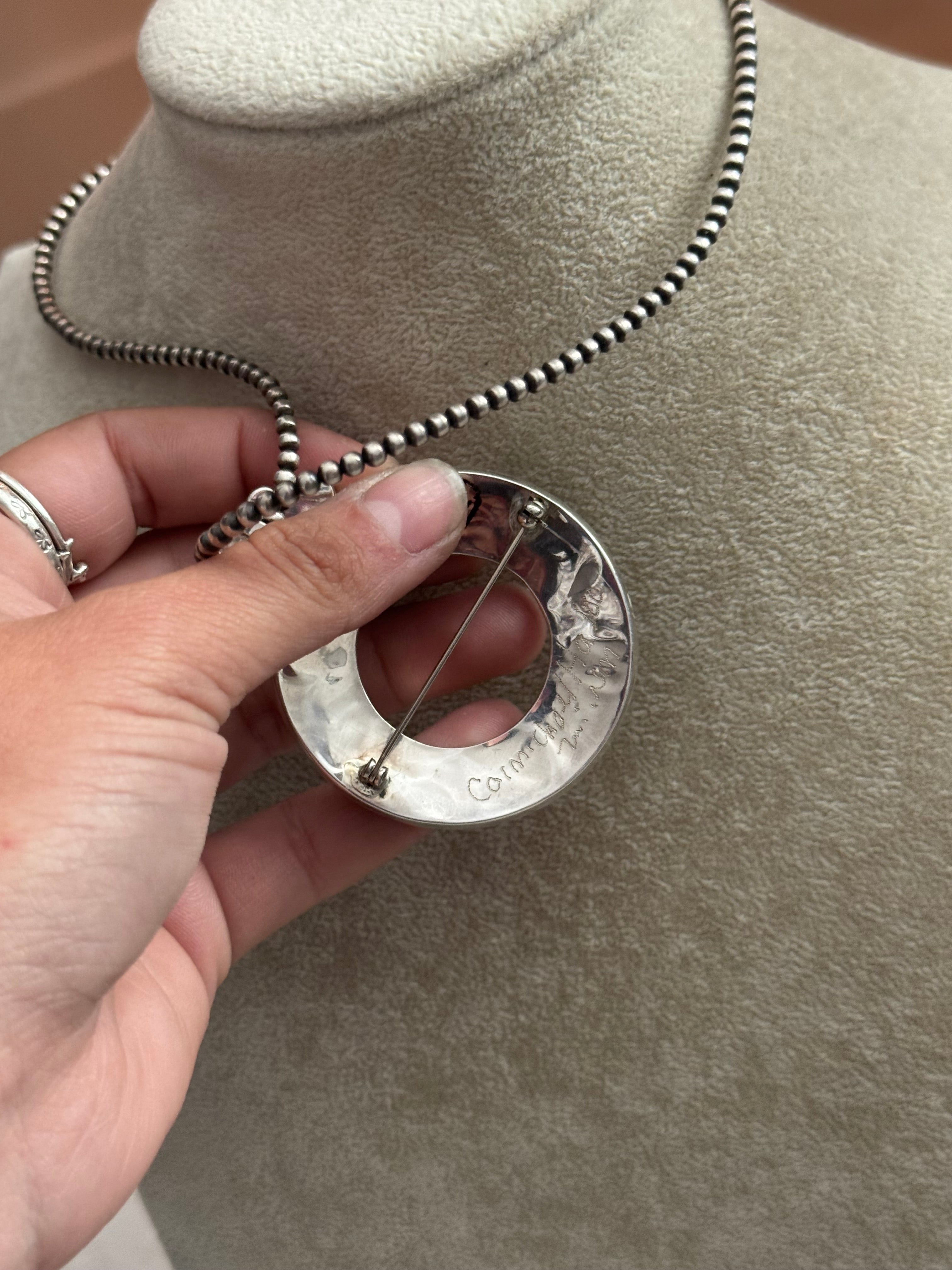 Carmichael Haloo Multi Stone & Sterling Silver Inlay Pendant/Pin. It measures 2 3/8 inches long and 2 inches wide. Pendant Only. Signed by the artist and stamped sterling silver.