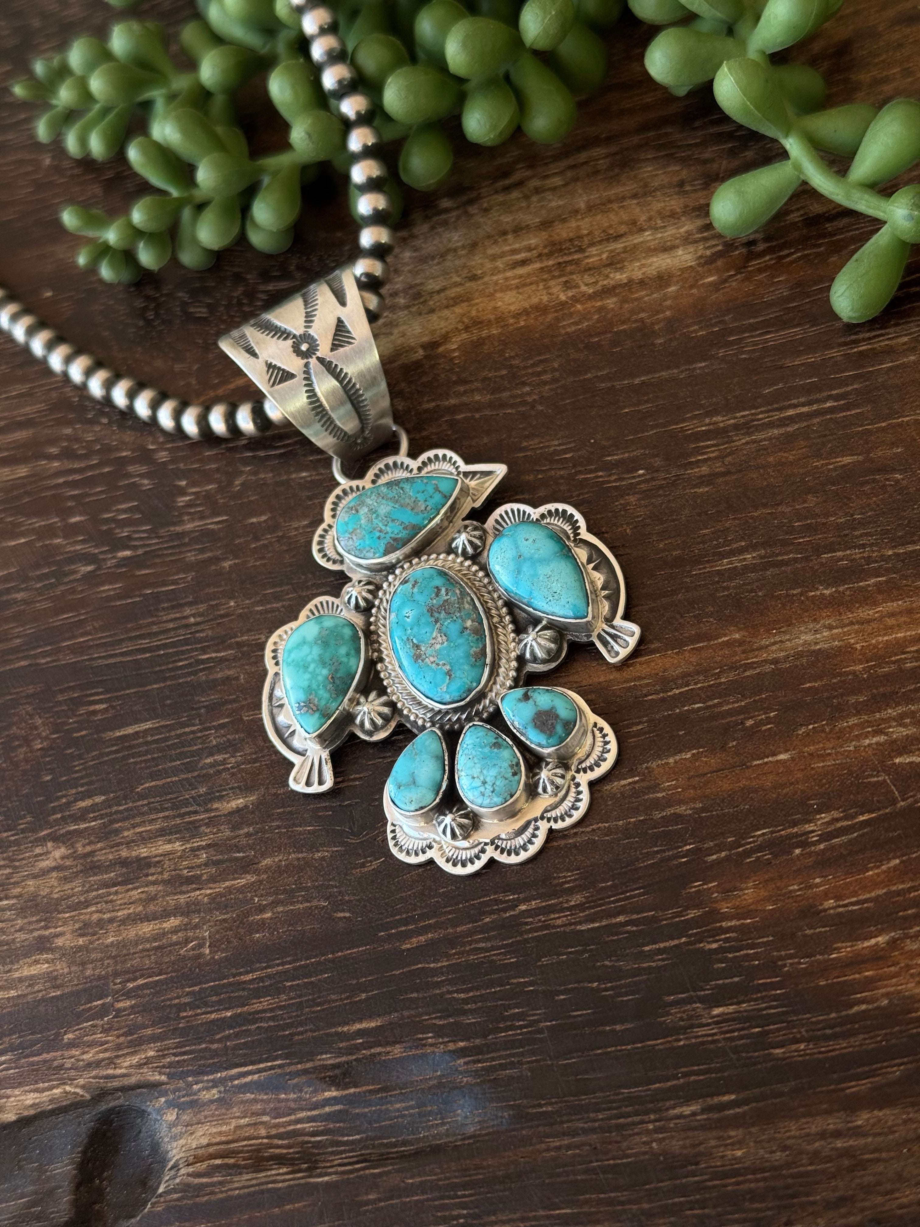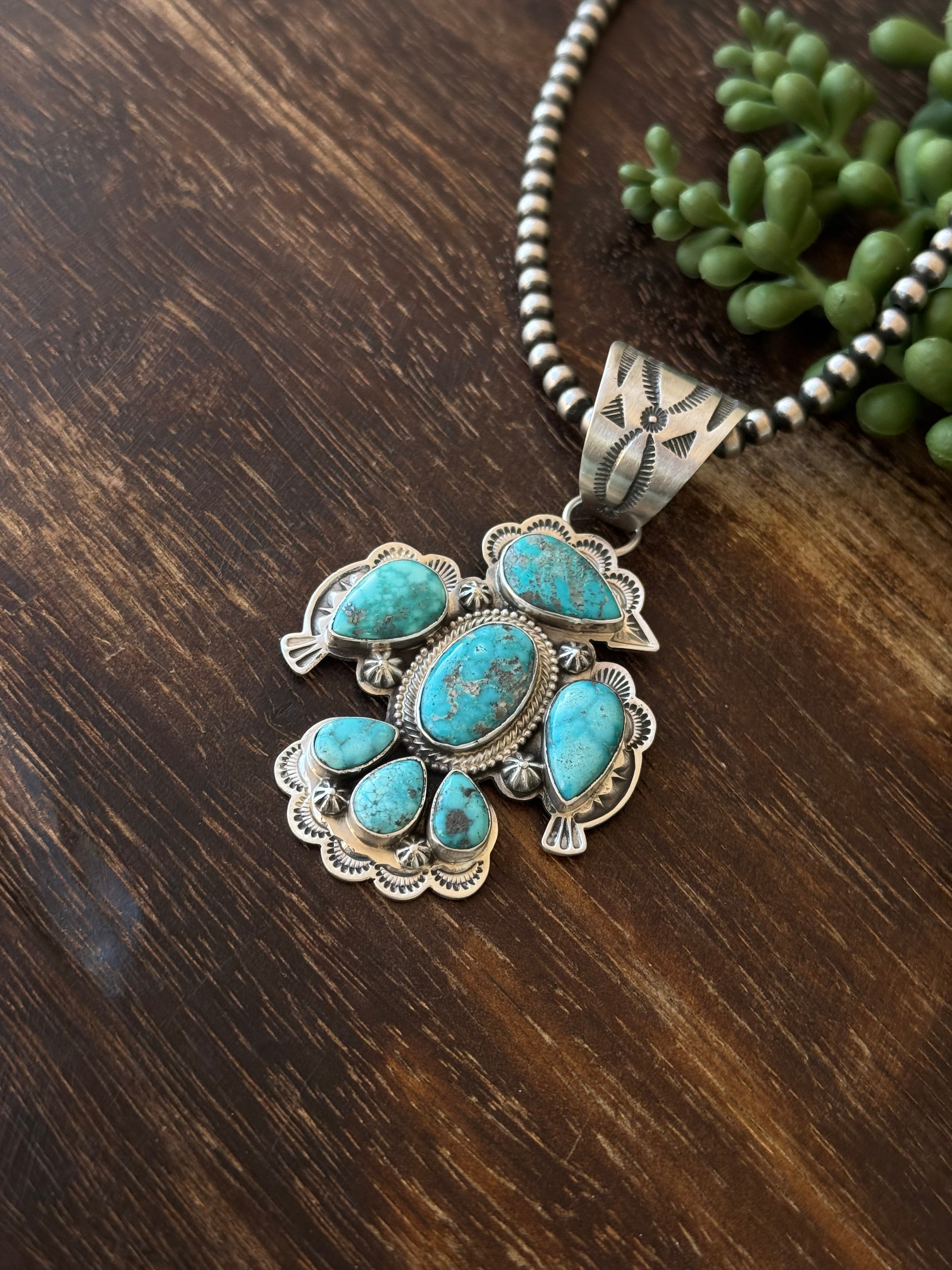 Charles Johnson Mixed Turquoise & Sterling Silver Thunderbird Cluster Pendant. It measures 3 1/2 inches long and 2 inches wide. Pendant Only. Signed by the artist and stamped sterling silver.