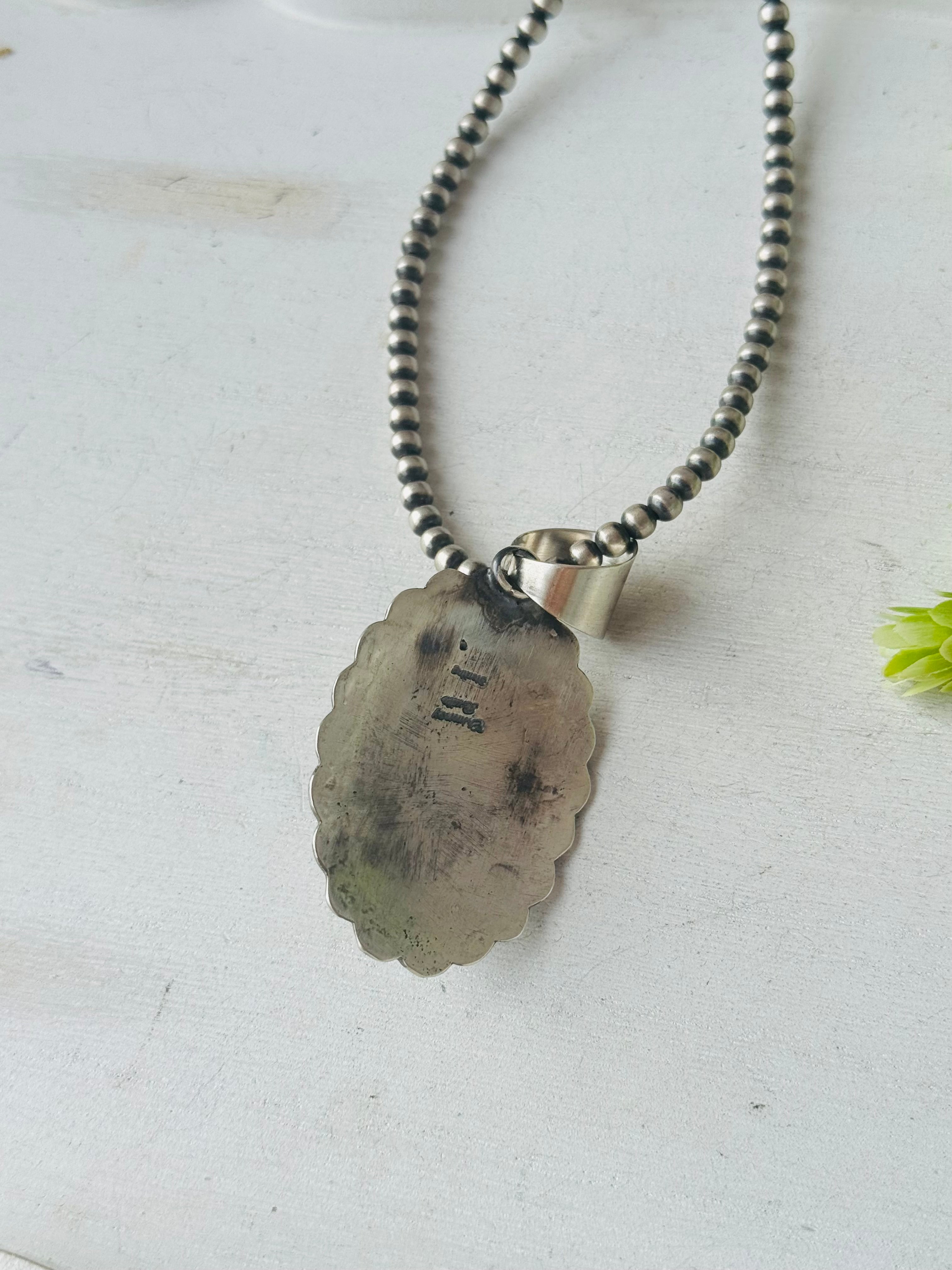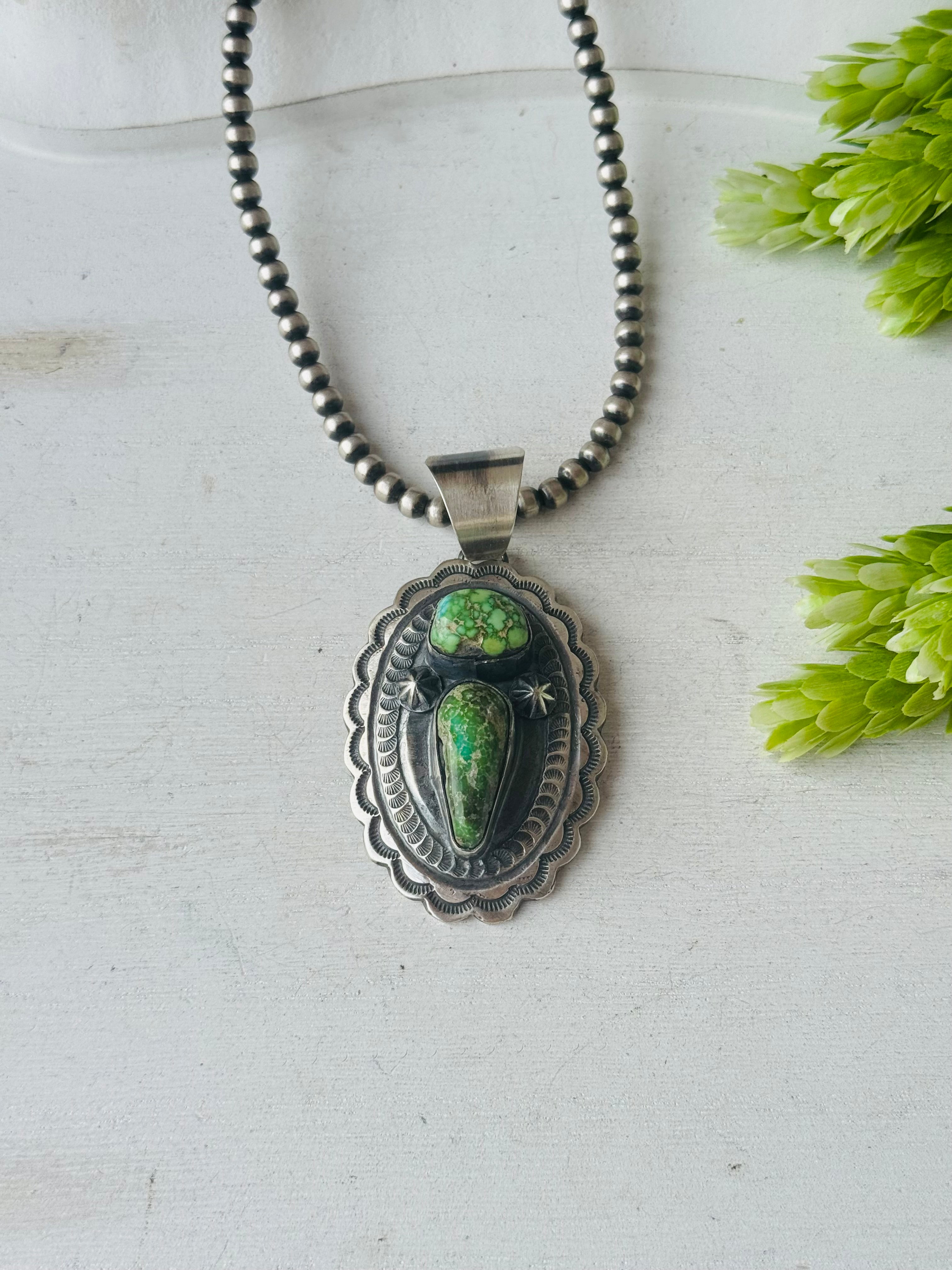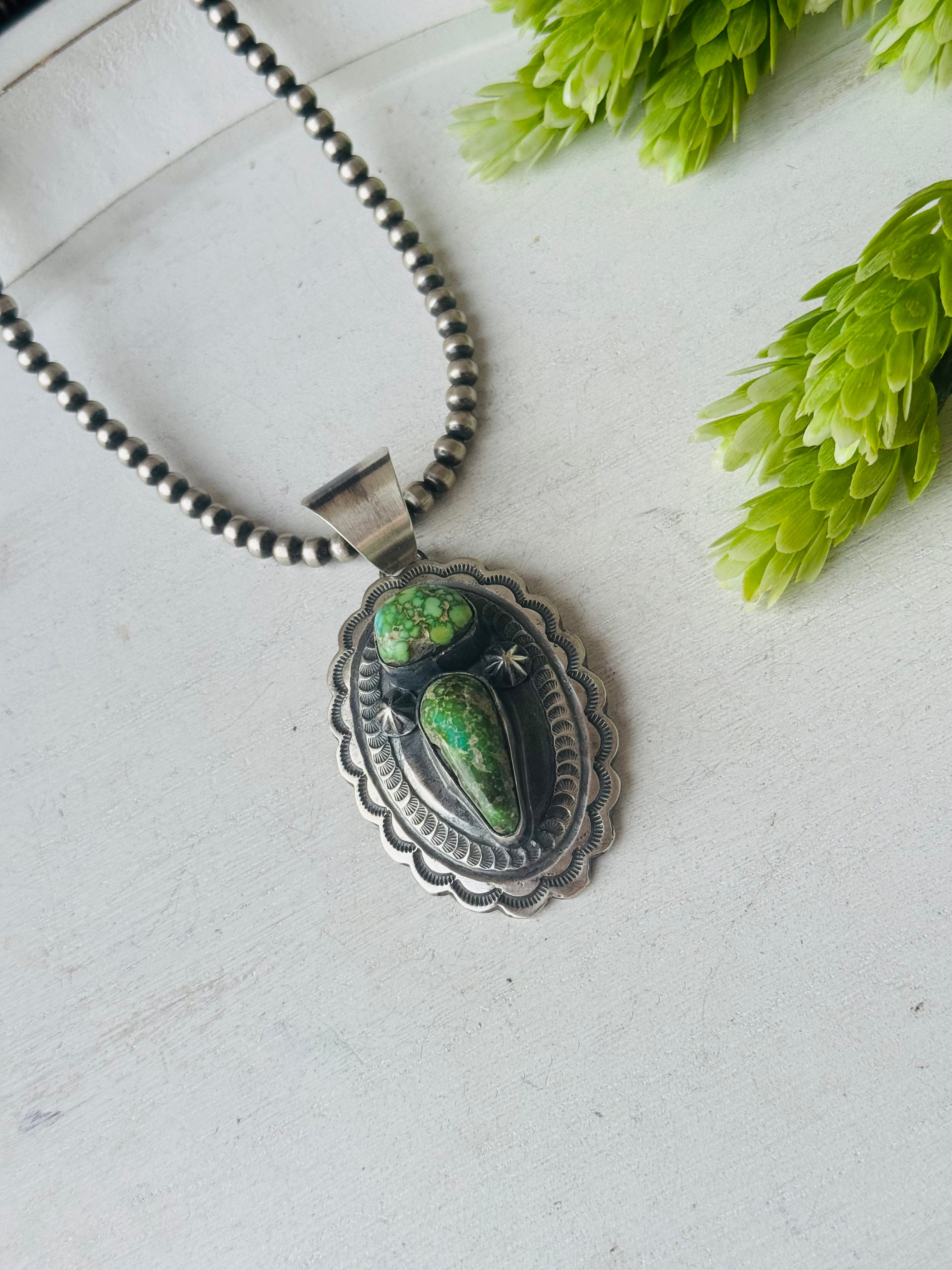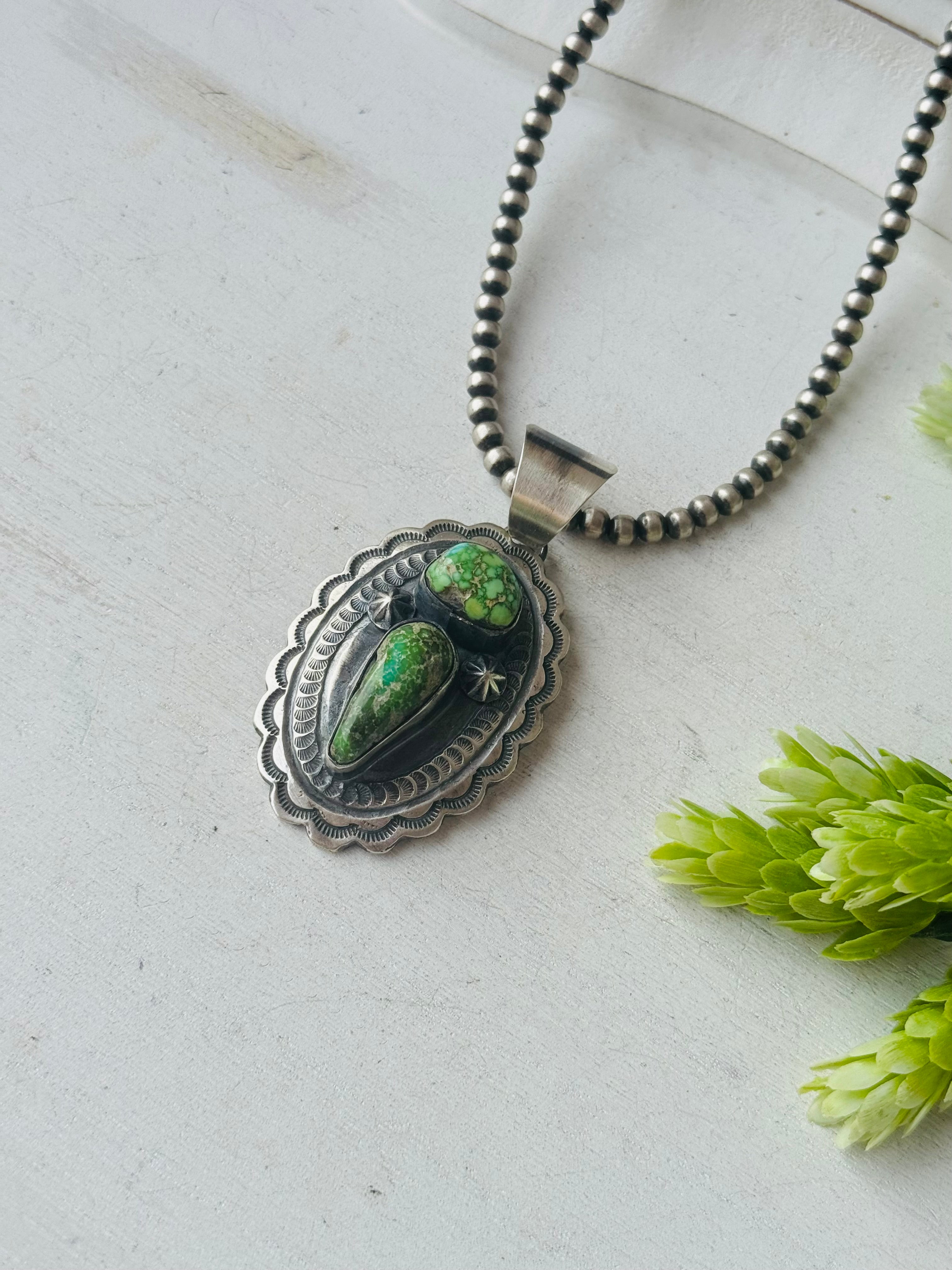 Chimney Butte Sonoran Gold Turquoise & Sterling Silver Concho Pendant. It measures 3 inches long and 1 5/8 inches wide. Pendant Only. Signed by the artist and stamped sterling silver.