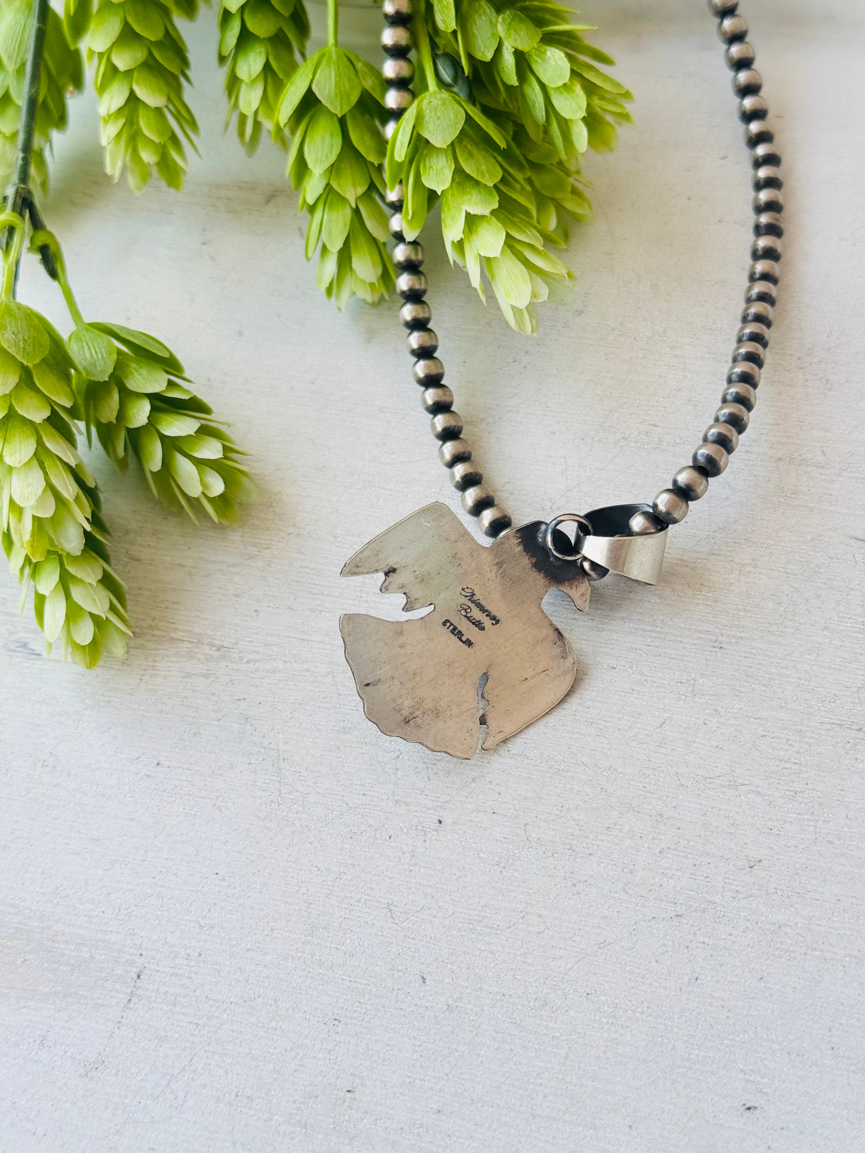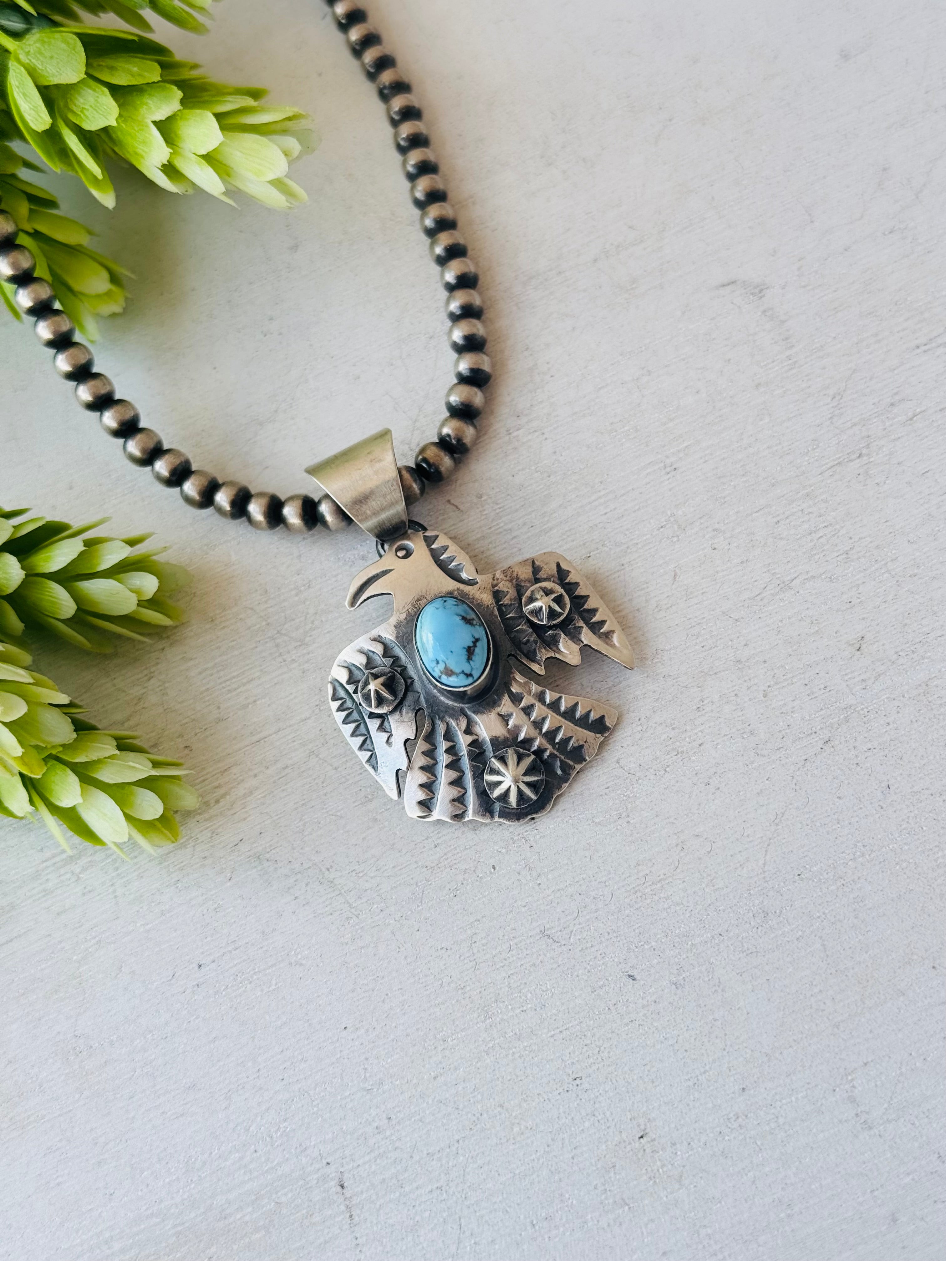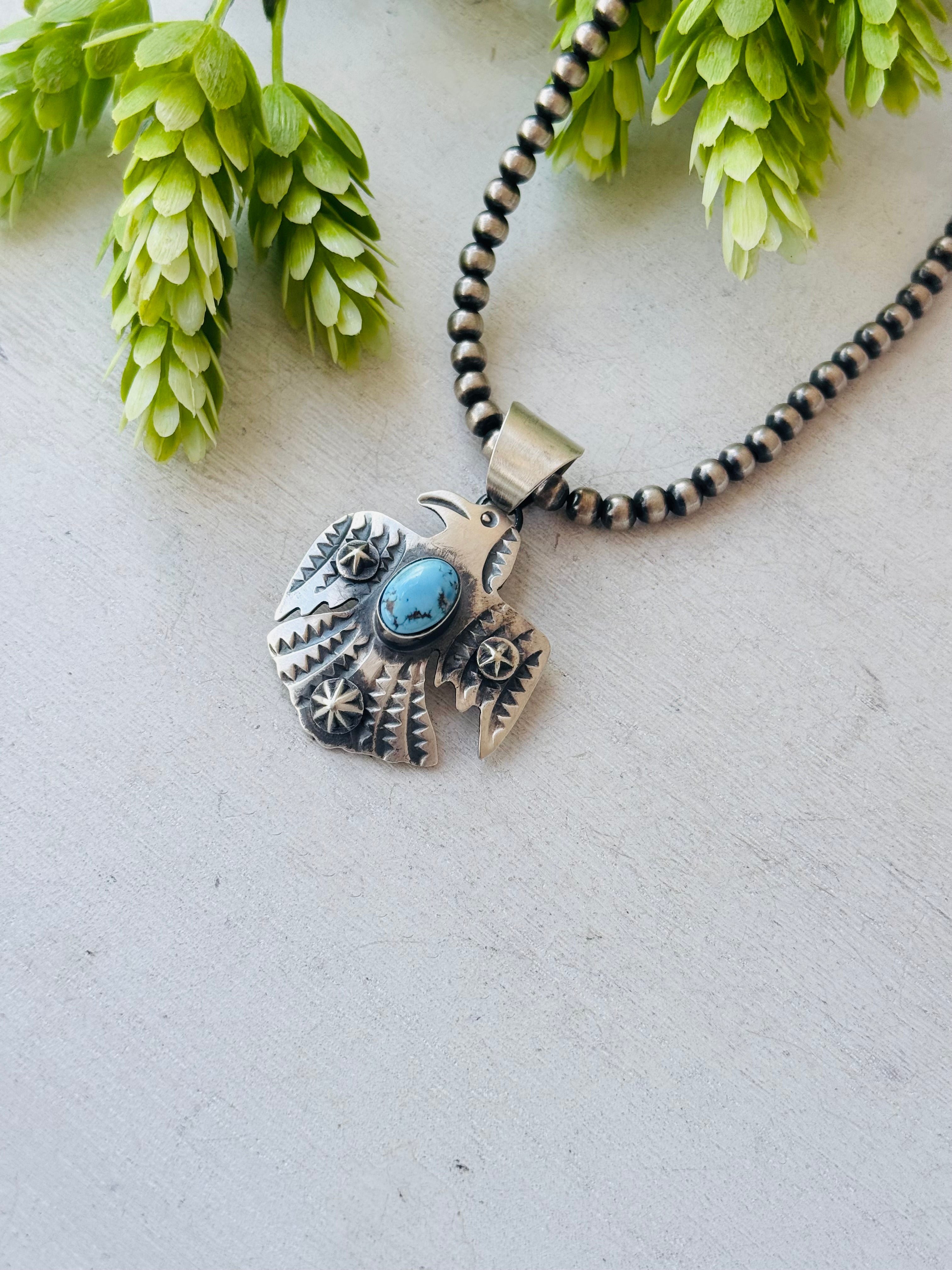 Chimney Butte Golden Hills Turquoise & Sterling Silver Thunderbird Pendant. It measures 2 1/8 inches long and 1 1/4 inches wide. Pendant Only. Signed by the artist and stamped sterling silver.