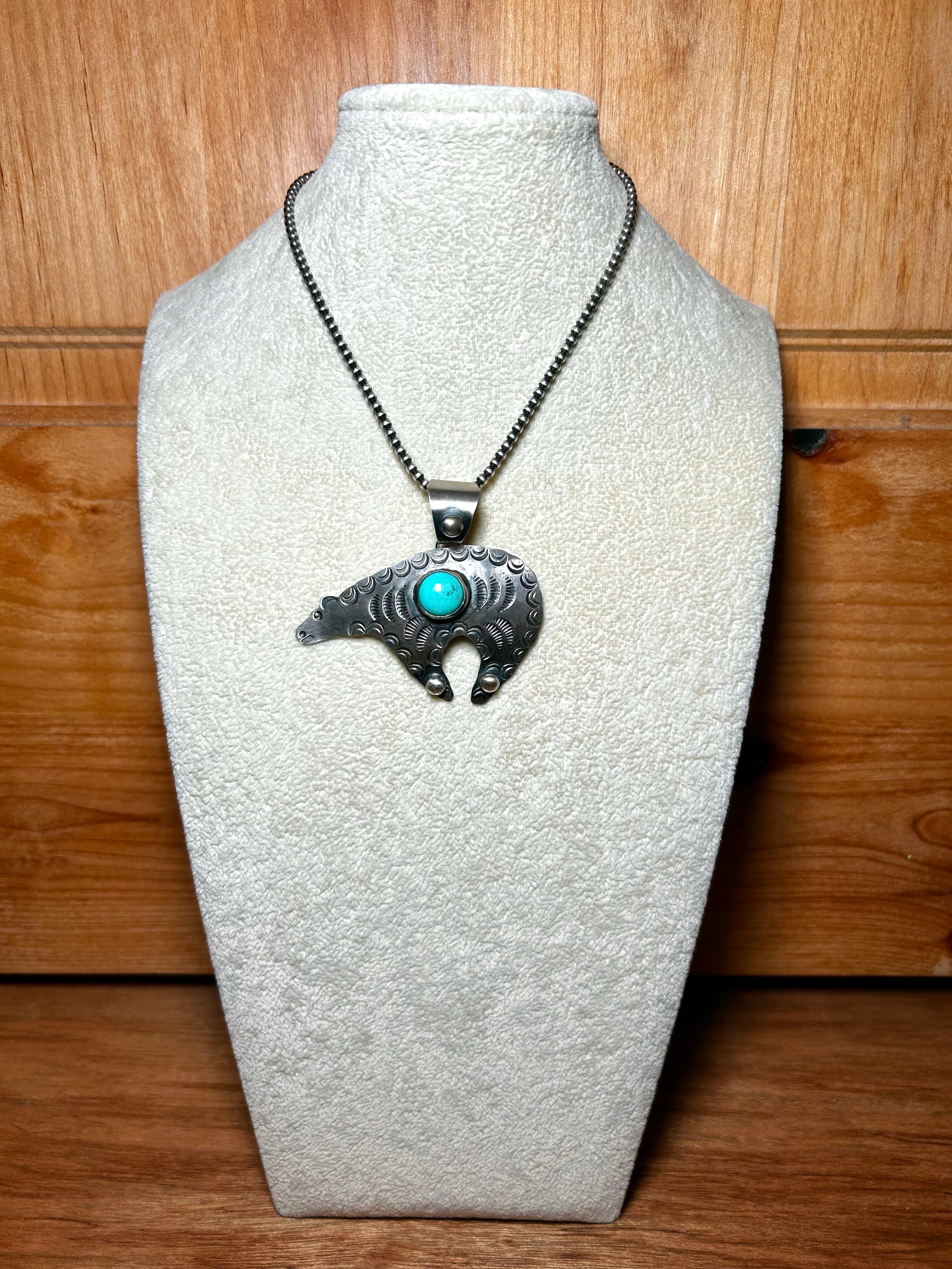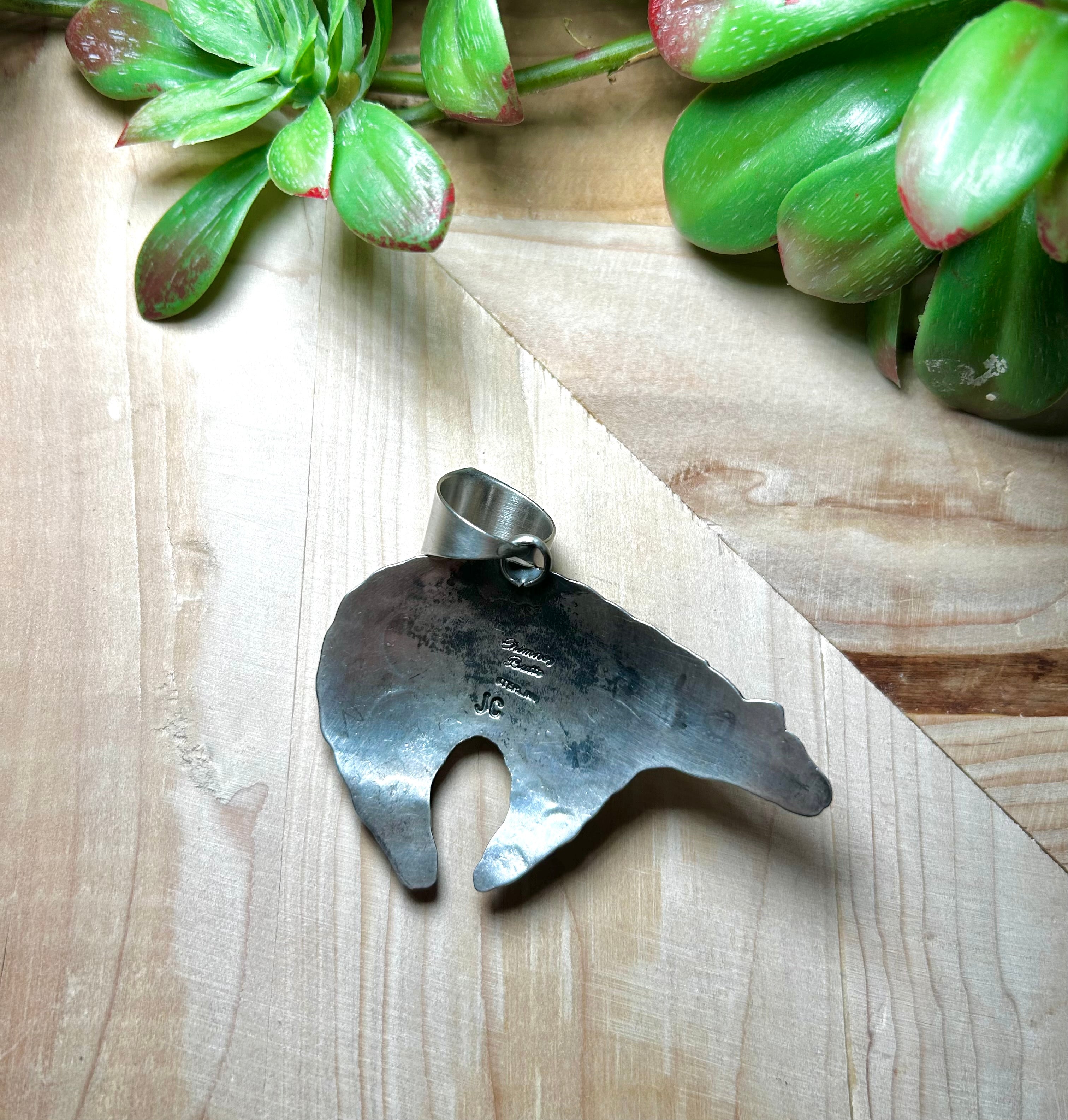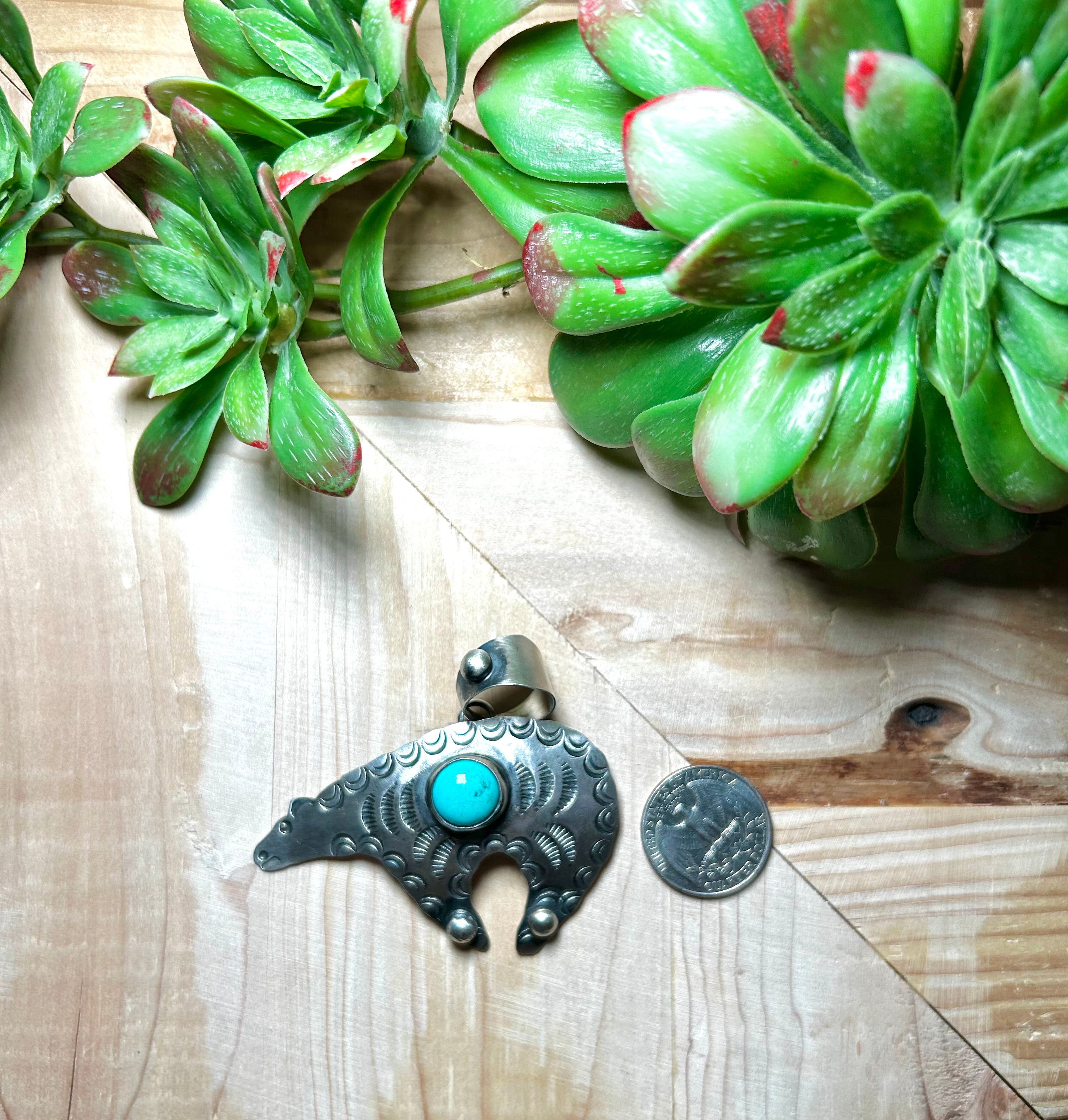Chimney Butte Sterling Kingman Turquoise & Silver Pendant. It measures 2 1/2 inches long and 2 5/8 inches wide. Pendant Only!! Signed by the artist and stamped sterling silver.