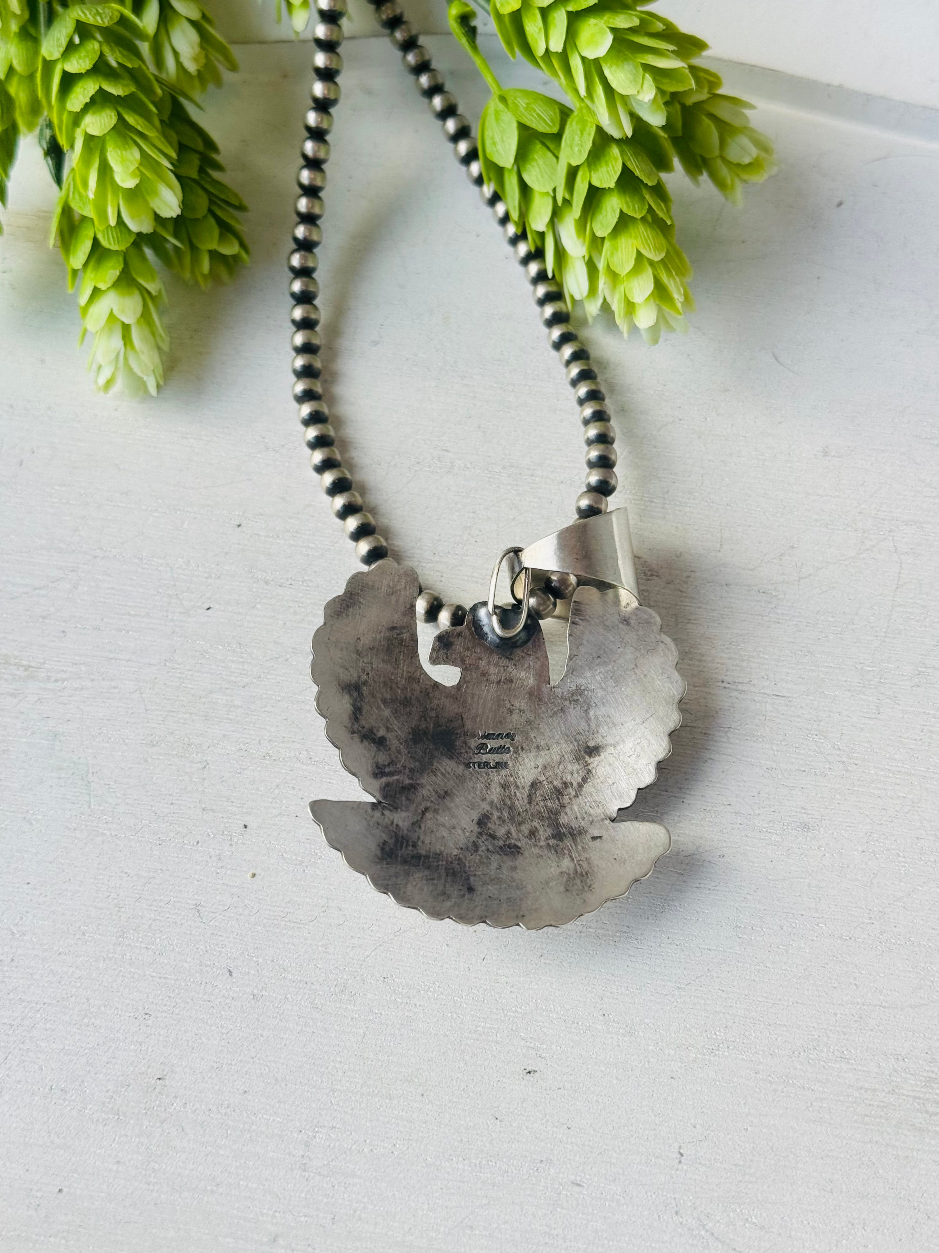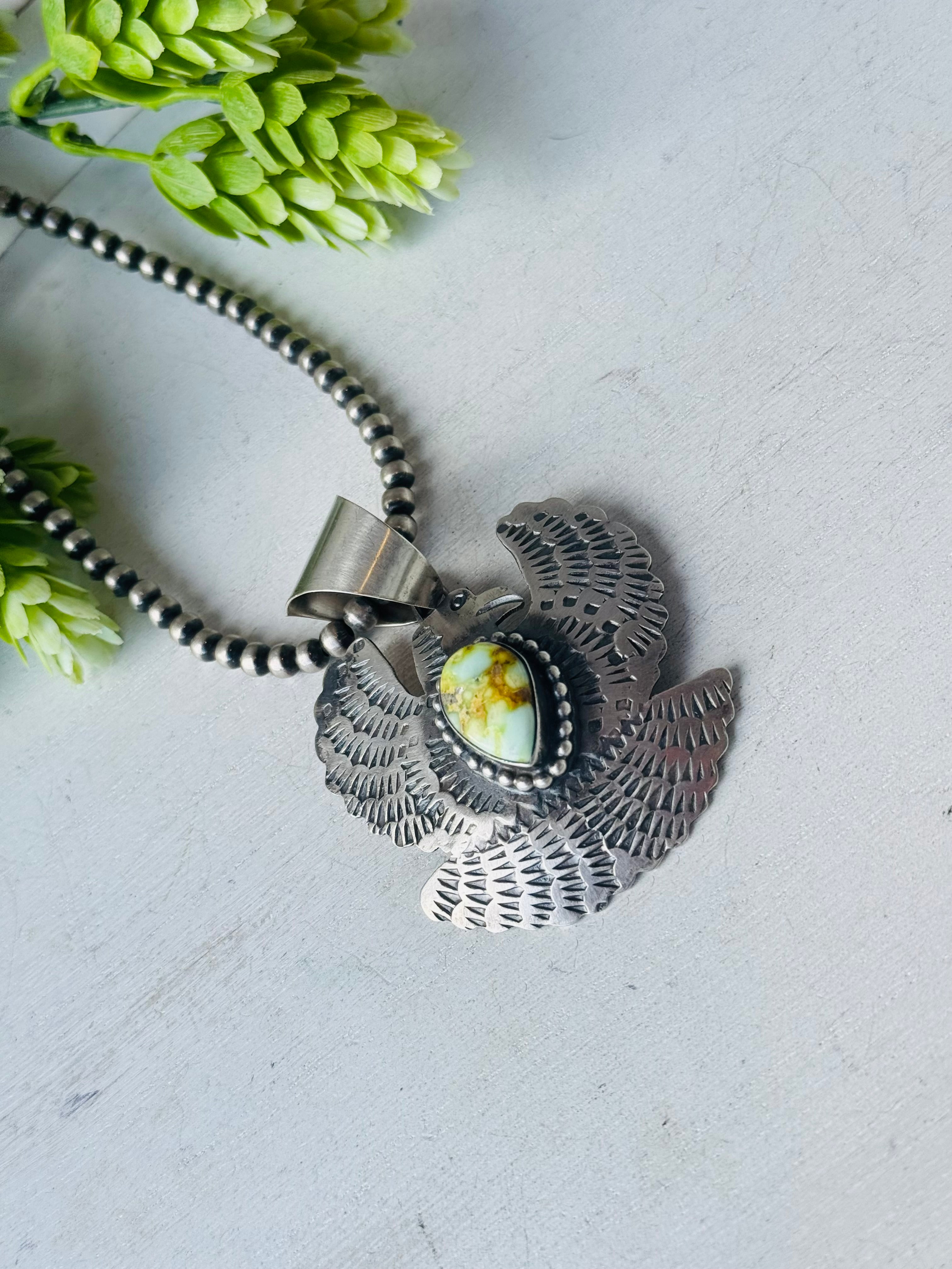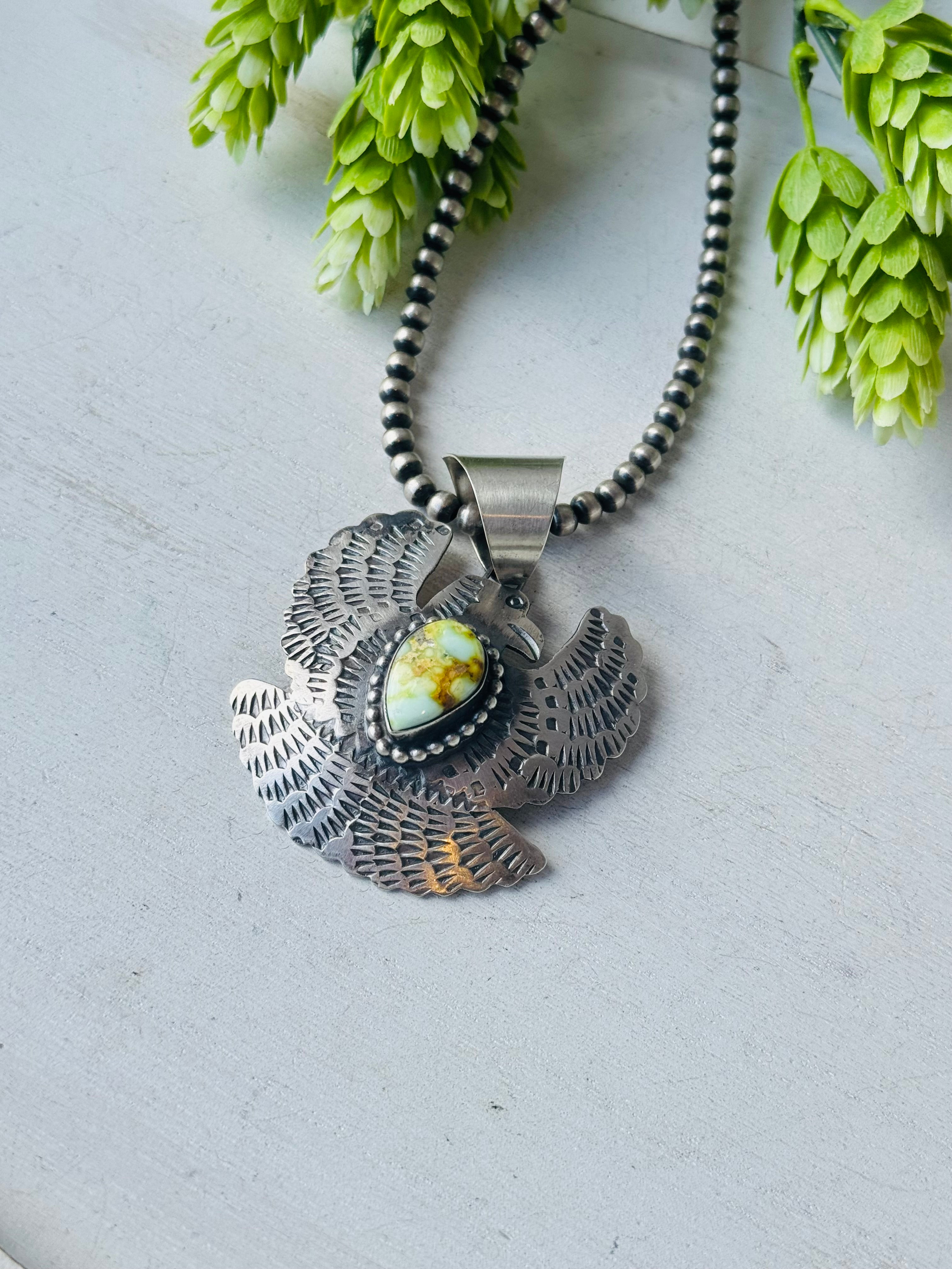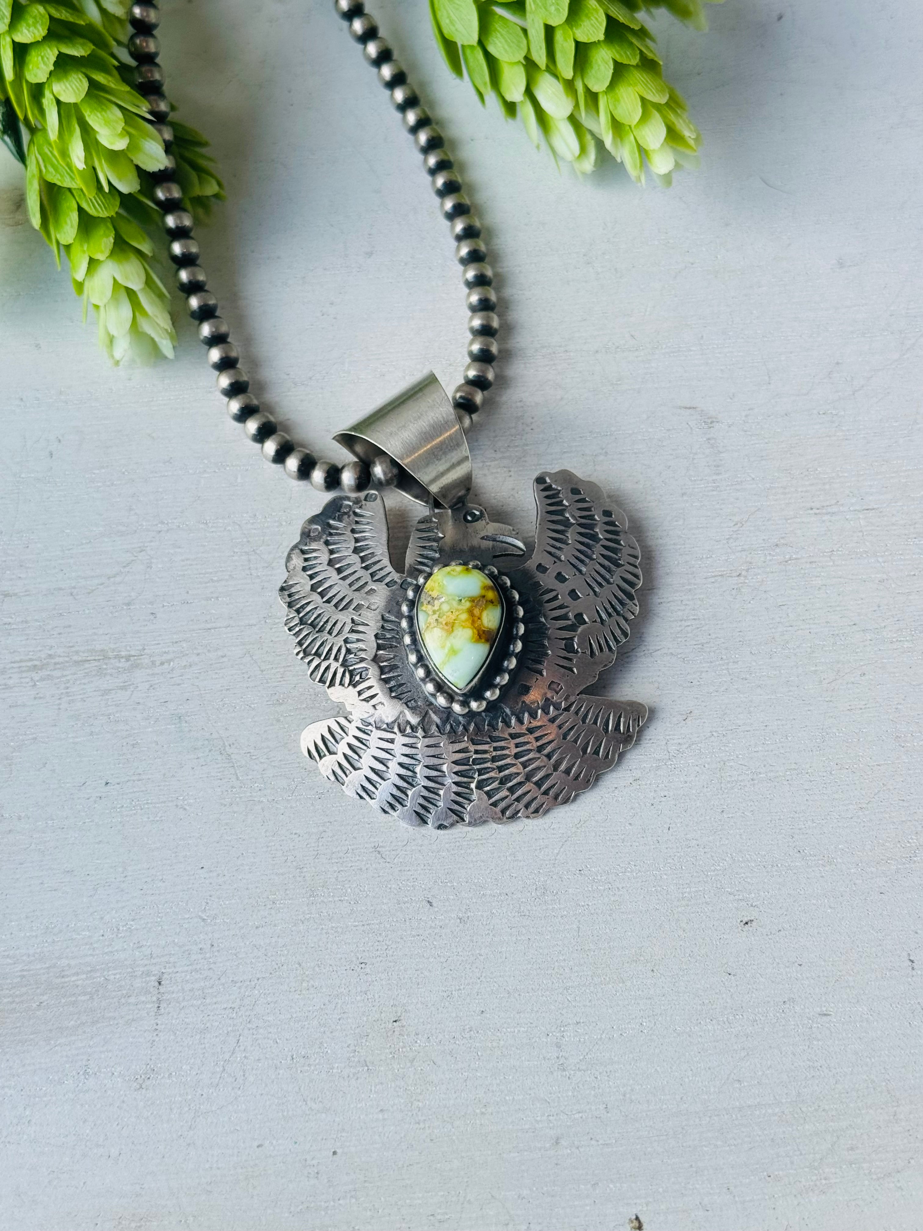 Chimney Butte Palomino Variscite & Sterling Silver Thunderbird Pendant. It measures 2 3/4 inches long and 2 1/8 inches wide. Pendant Only. Signed by the artist and stamped sterling silver.