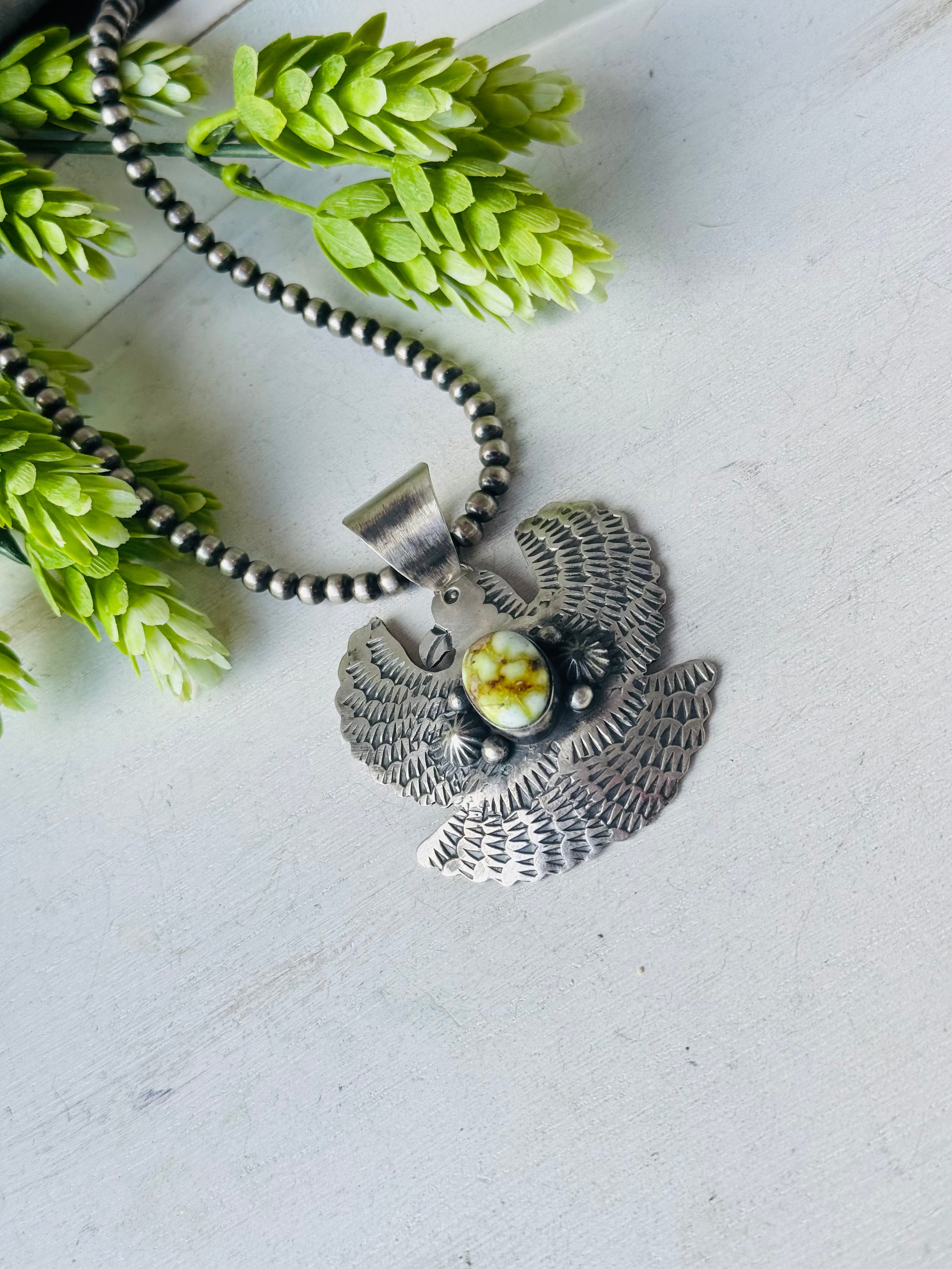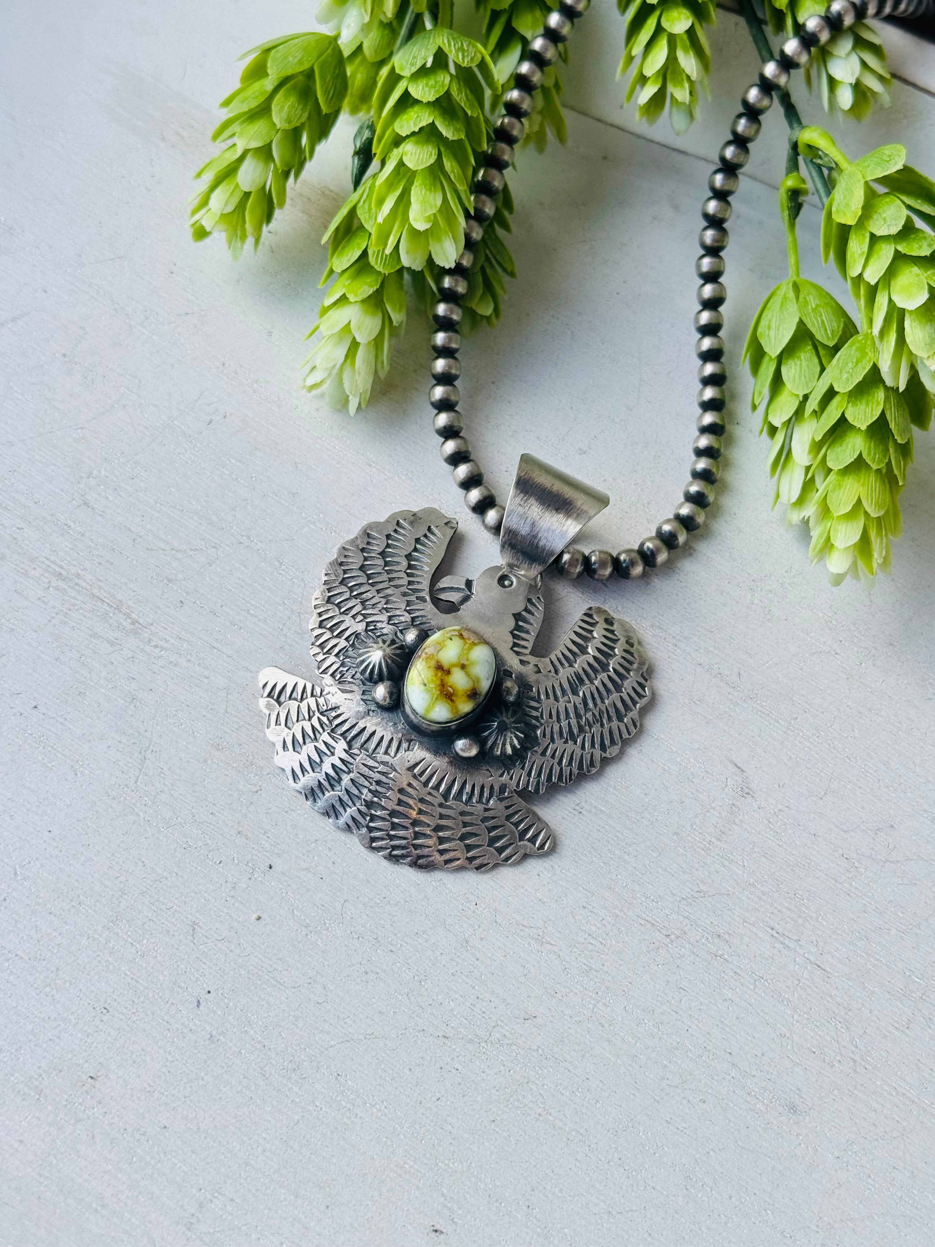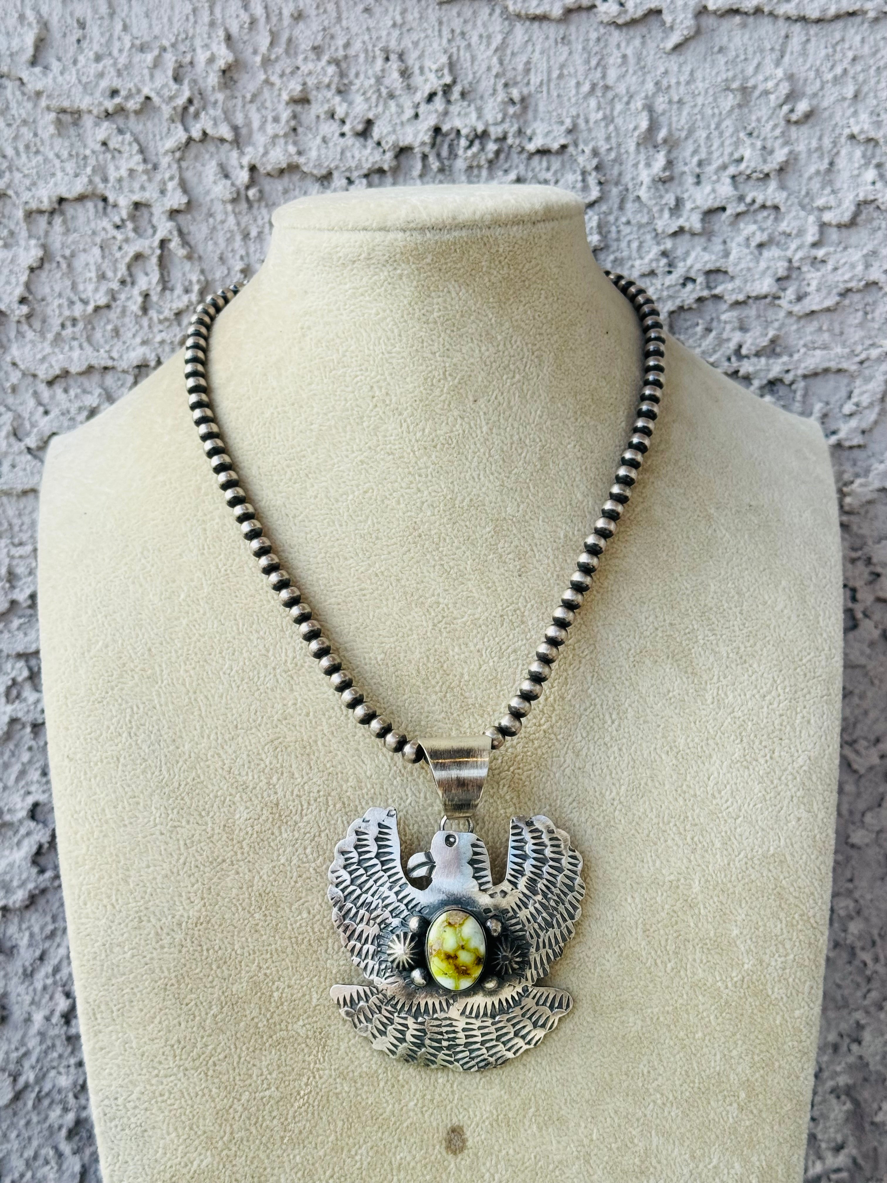 Chimney Butte Palomino Variscite & Sterling Silver Thunderbird Pendant. It measures 2 3/4 inches long and 2 1/8 inches wide. Pendant Only. Signed by the artist and stamped sterling silver.