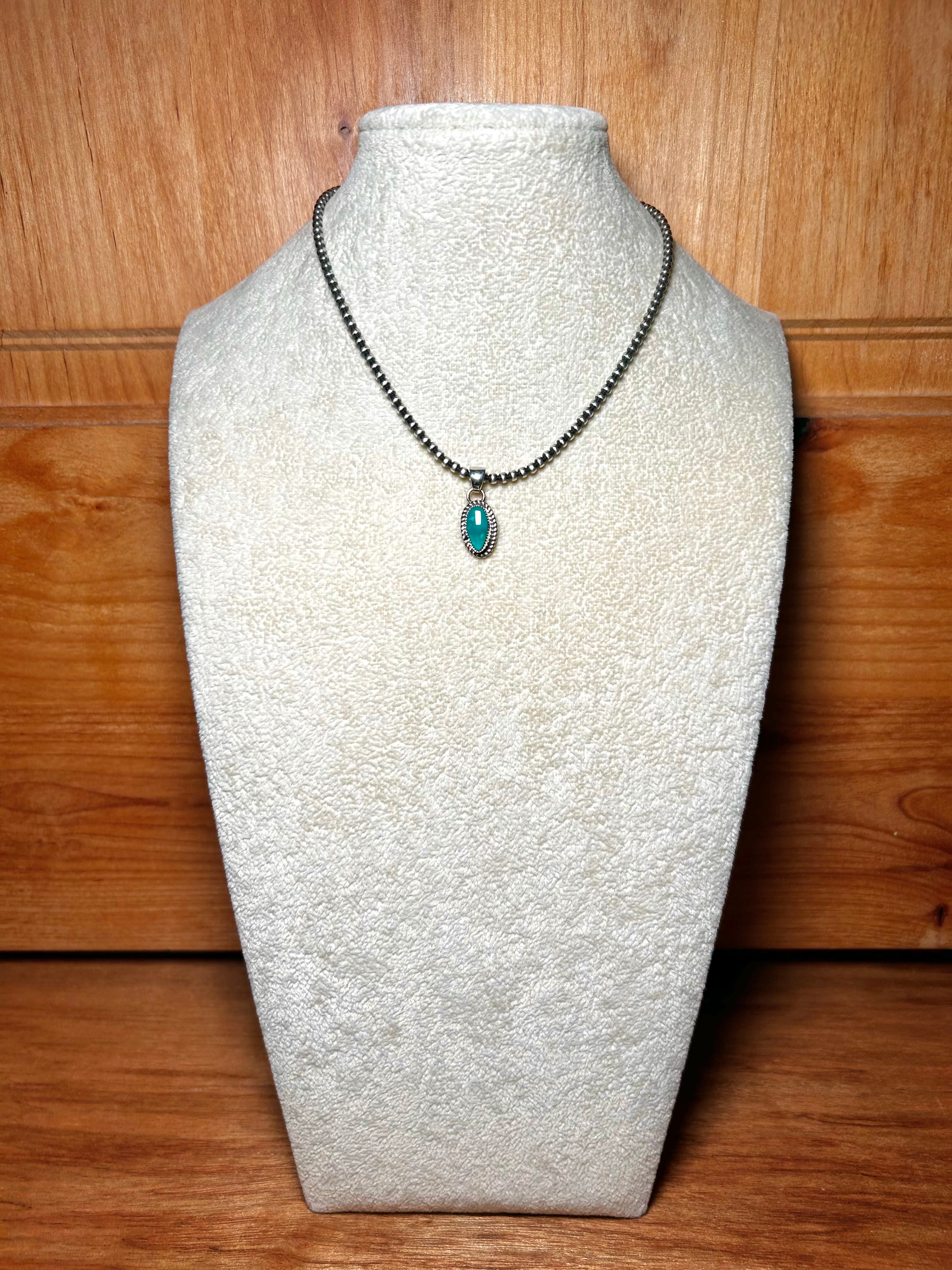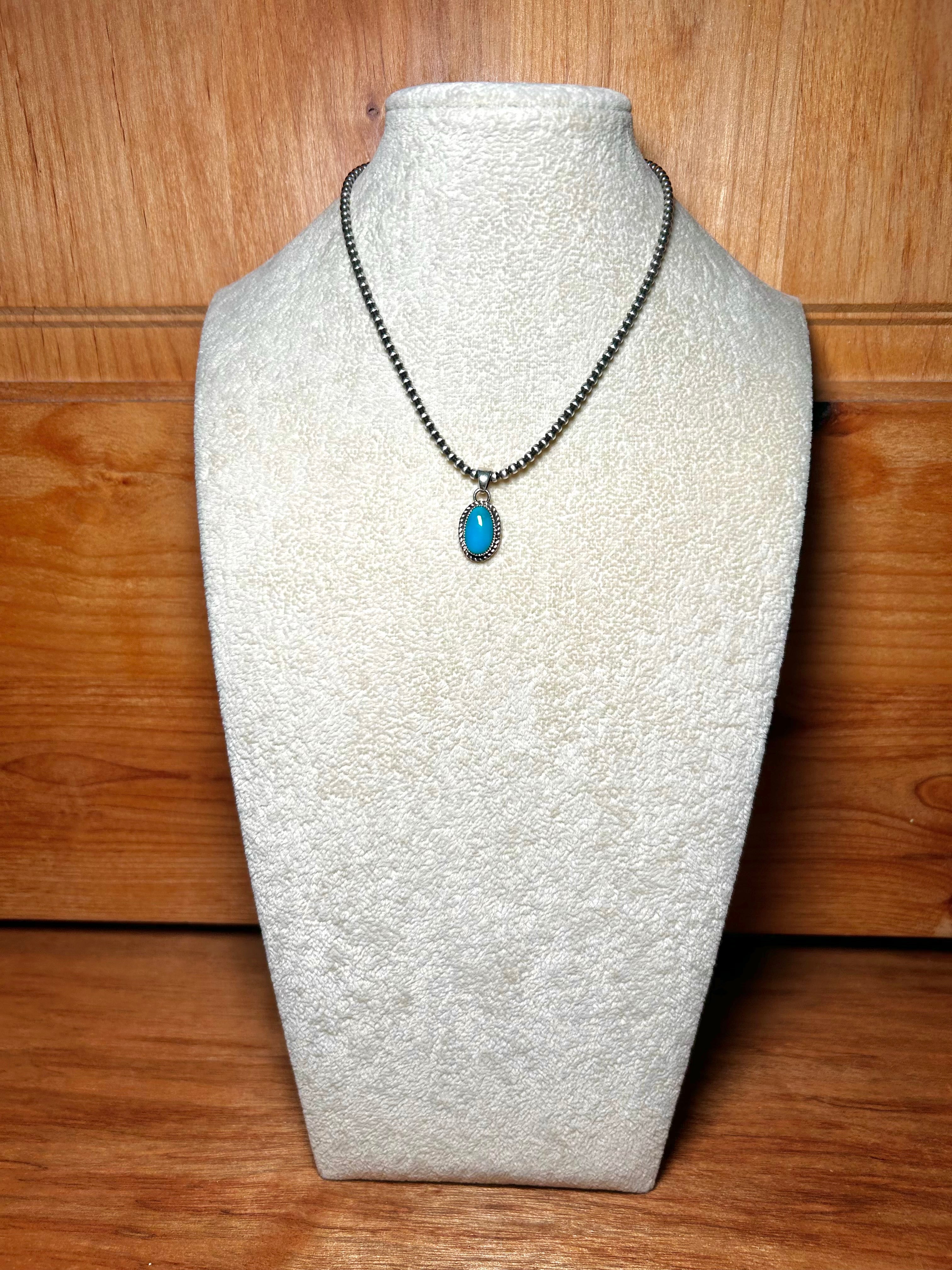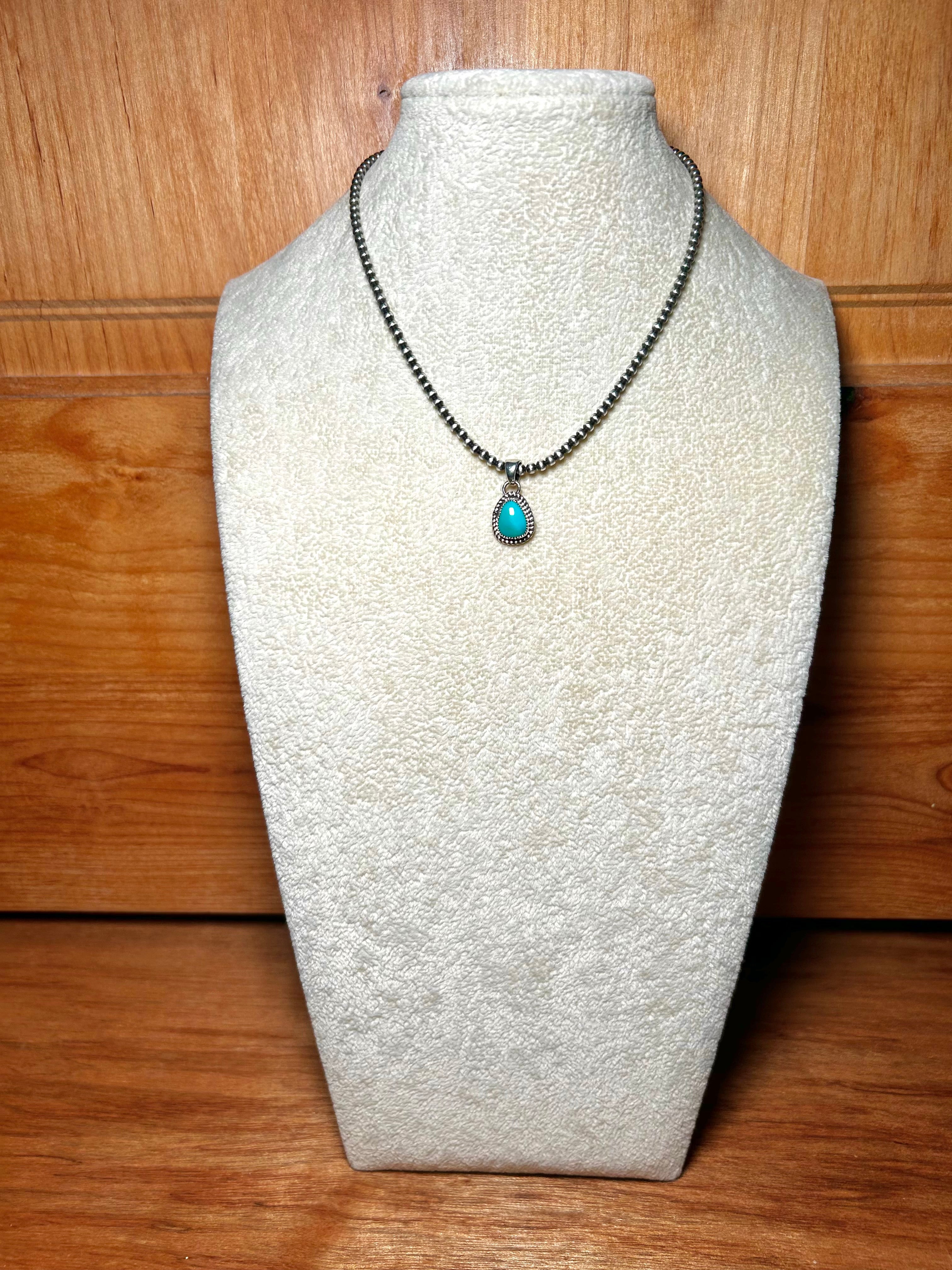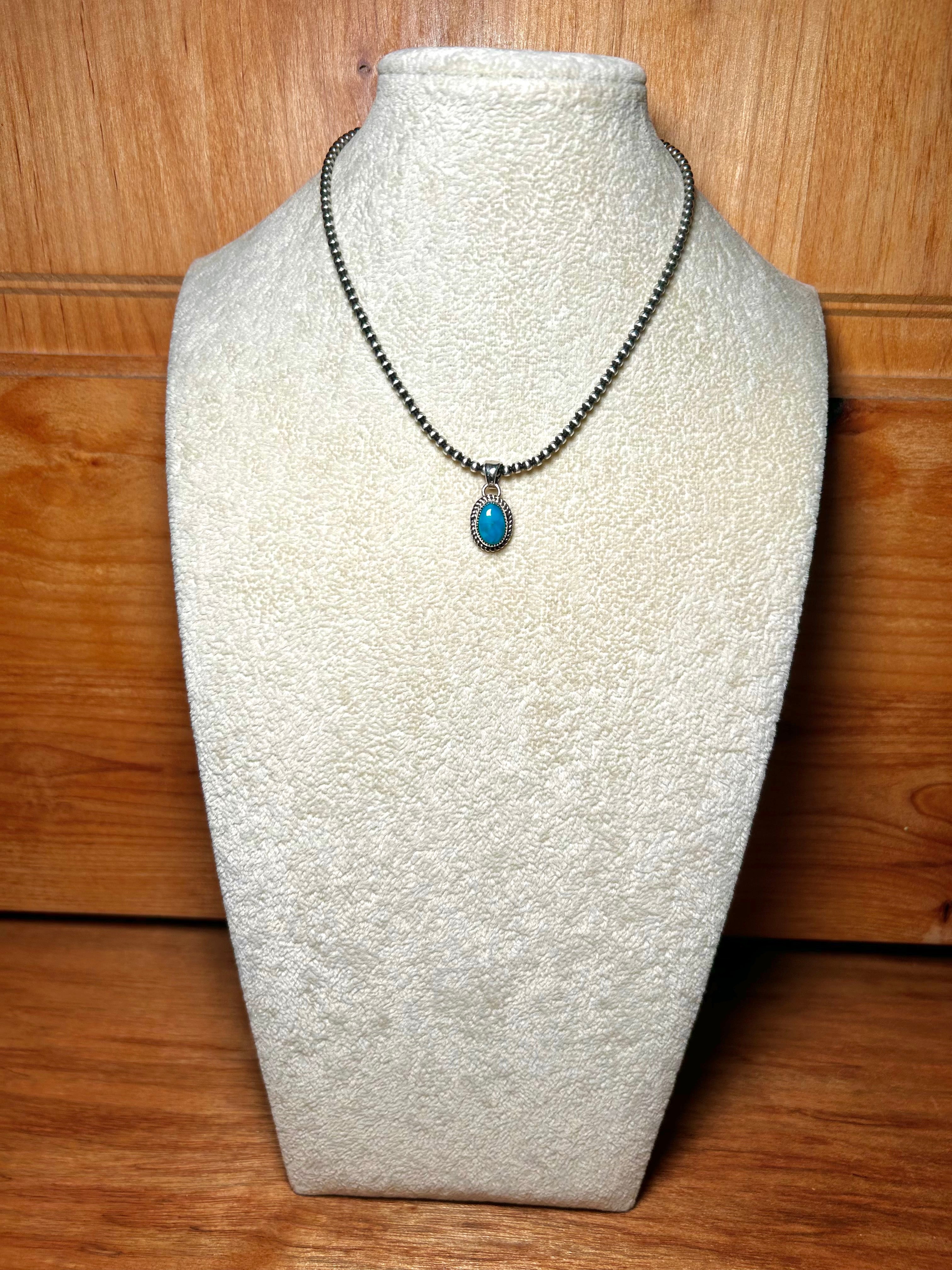 Navajo Made Kingman Turquoise & Sterling Silver Pendant. It measures 1 inch long and 1/2 of an inch wide. Pendant Only. Signed by the artist and stamped sterling silver.